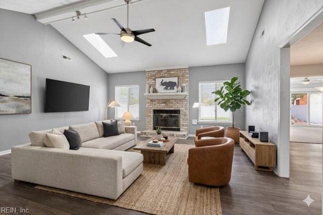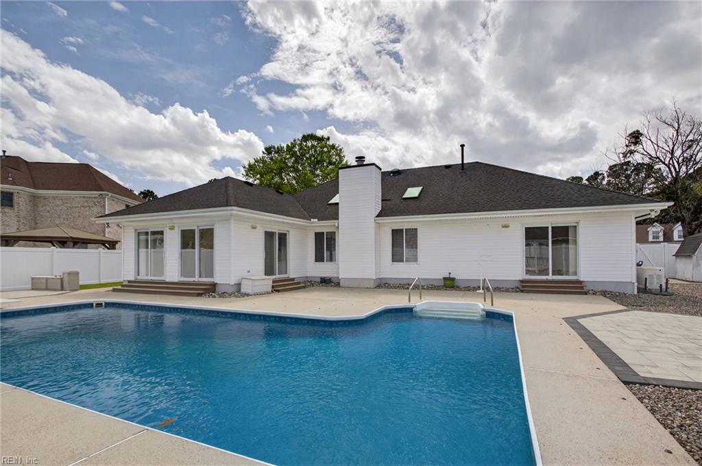 Welcome to this meticulously maintained, pride-of-ownership ranch-style home! Featuring 3 bedrooms and 2.5 baths, this open-concept layout seamlessly connects the living and dining areas to a gorgeous kitchen with granite countertops, center island, and ideal space for entertaining. Vaulted ceilings, a cozy fireplace, and beautiful hardwood flooring enhance the home's warmth and charm. Enjoy a spacious sunroom with serene views of the backyard oasis - perfect for relaxing year-round. Both the primary and secondary bathrooms have been fully remodeled with stunning tile and quartz countertops. Step outside to an impeccably landscaped backyard oasis with turf, an oversized in-ground pool, and a tranquil waterfall feature. Conveniently located near beaches, shopping, and military installations - this is a dream home you won't want to miss! Many home features updated: water heater (2025), garage door (2024), dishwasher (2023), pool liner (2022), whole house generator & fence (2021).