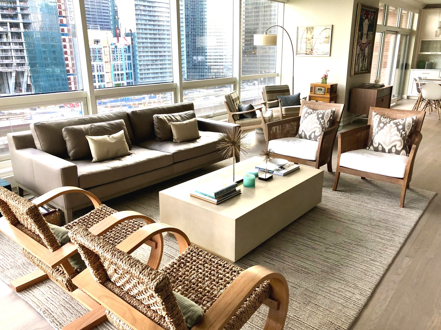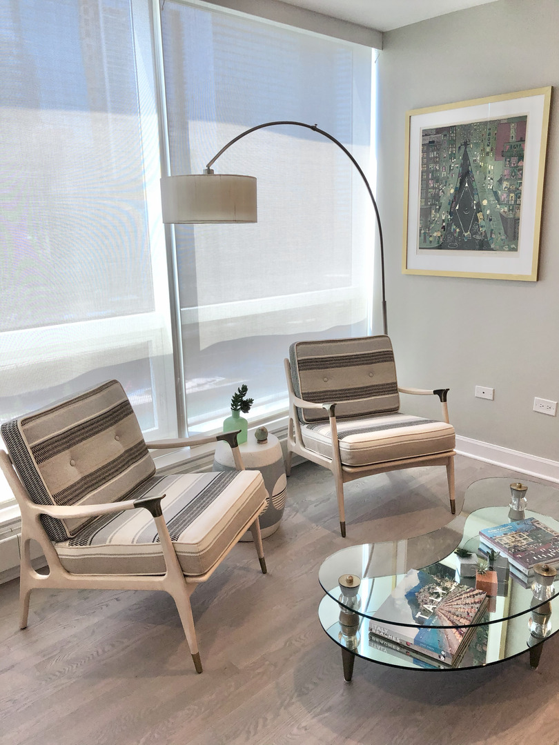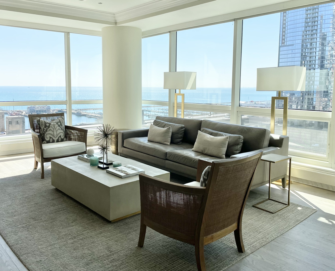 This designer-inspired riverfront corner residence has been expertly renovated for the most discerning buyer. Offering over 2,000 square feet, this expansive home is wrapped in more than 36 feet of glass, showcasing breathtaking lake and river views while flooding the living and dining areas with natural light. A beautiful stone fireplace anchors the main living space, flanked by custom built-in shelving, creating a warm yet sophisticated focal point. The pristine white chef's kitchen features a large Island, Bosch appliances, Caesarstone countertops, a separate pantry, and custom built-in cabinetry that seamlessly extends into a buffet area with beverage refrigerator, perfect for entertaining. Real whitewashed oak floors run throughout, enhancing the home's inviting, elevated aesthetic. The thoughtfully designed layout flows effortlessly into the private bedroom wing. The primary suite offers a fully organized walk-in closet plus an additional wall of closets, and a stunning stone bath complete with heated floors, furniture quality dual vanity, a soaking tub, and a separate walk-in shower. The second bedroom is an ideal flex space-perfect as a guest room, office, or den-featuring a wall of windows and a generous walk-in closet. Electronic shades throughout provide ultimate convenience and comfort. A separate laundry room with side-by-side washer and dryer and additional storage cabinetry adds everyday functionality. Enjoy relaxing on the riverfront 11-foot balcony, watching boats pass by in a serene setting. Riverview Condominiums is tucked along a quiet, tree-lined street, offering a sense of privacy while being just steps from shopping, dining, and the Northwestern Medical campus. This full-amenity, professionally managed building features 24-hour door staff, a fitness center with sauna, an indoor atrium-style pool, and a beautifully updated outdoor sundeck-perfect for summer relaxation. Deeded parking included with access from the same elevators as your condo. The condo is currently leased until August 31,2026