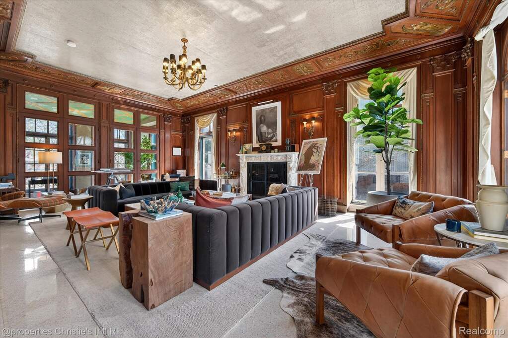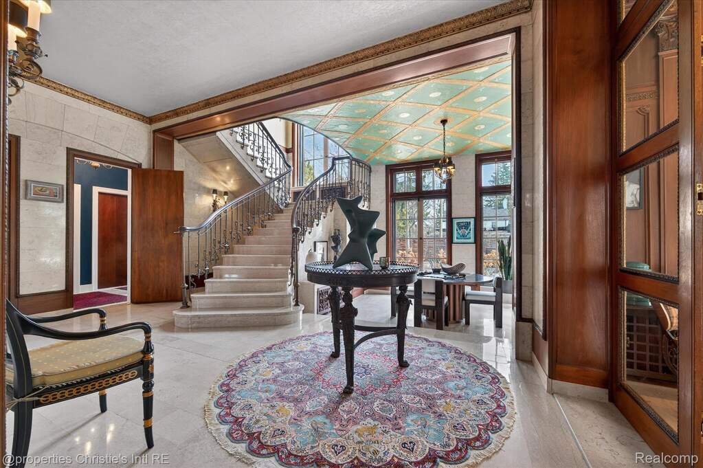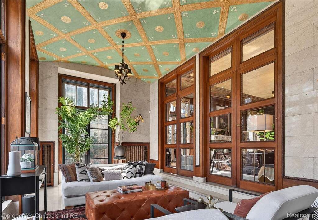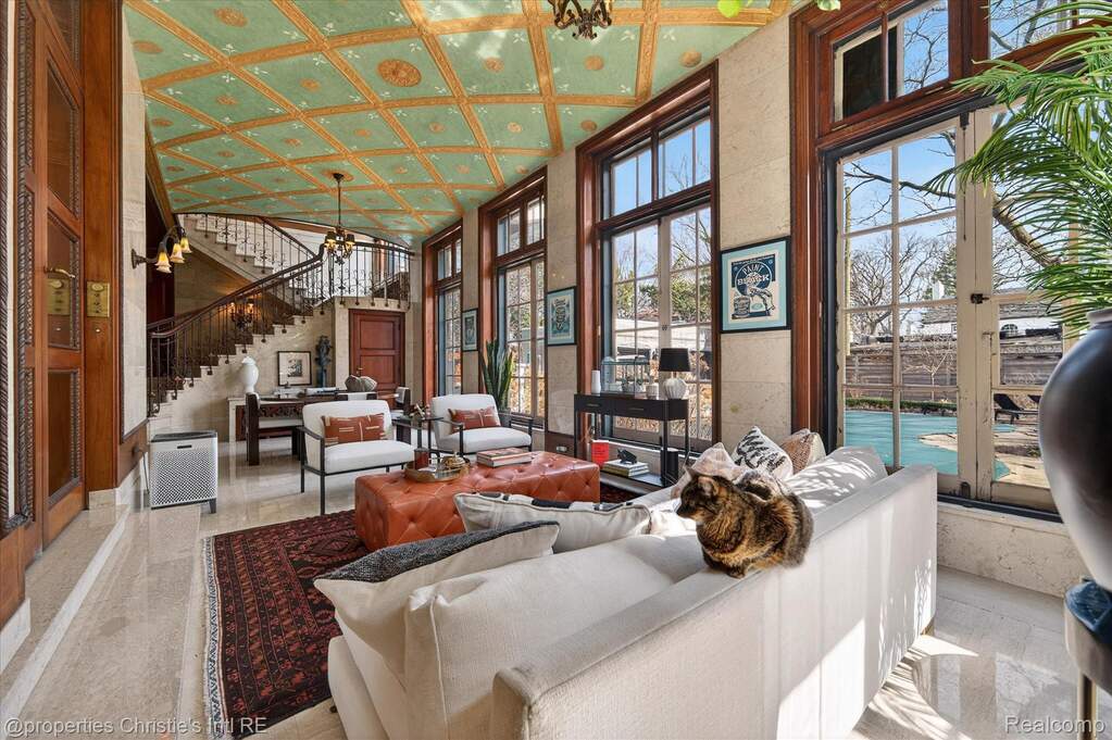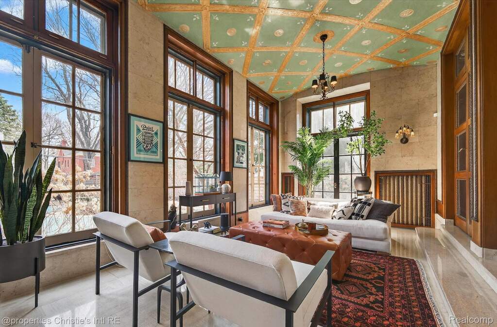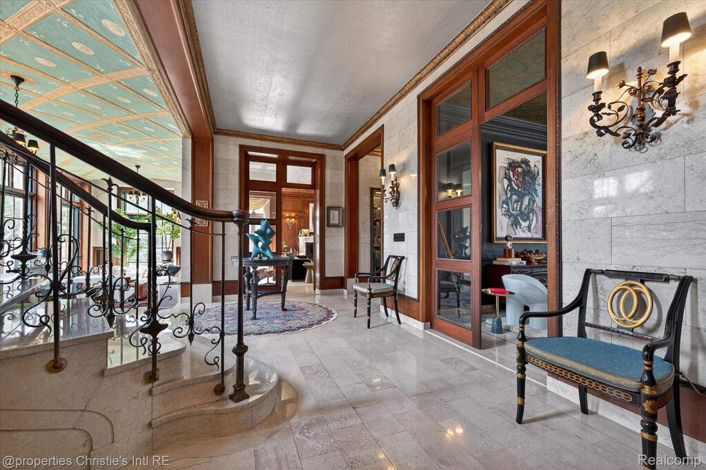 The personal residence of legendary architect Louis Kamper, designed and built between 1915 and 1917. One of Detroit's most significant private homes. Over 7,000 square feet of Neo-Renaissance architecture constructed with steel, limestone, and concrete. Inside, Kamper's artistry is on full display: mint-green Zodiac ceilings, a dramatic marble grand staircase, hand-carved walnut paneling, and a triple-layer entry of wrought iron, bronze-framed glass, and Chinese rosewood. The estate has received $866,000 in capital improvements since 2020, preserving every original detail while adding modern performance. The reimagined third floor features a refined library, office, and bourbon lounge with custom millwork, the ultimate private retreat. Additional highlights include full restoration of all windows and doors, 95% efficient Lochinvar boiler, high-efficiency central air and heat pump, whole-house generator, new copper gutters, roof restoration, EV charger, Viking appliances, Culligan water filtration, custom power driveway gate, and new garage doors. Outside, formal rose gardens and a private in-ground pool sit on nearly half an acre with new privacy fencing, outdoor lighting, and landscaping throughout.