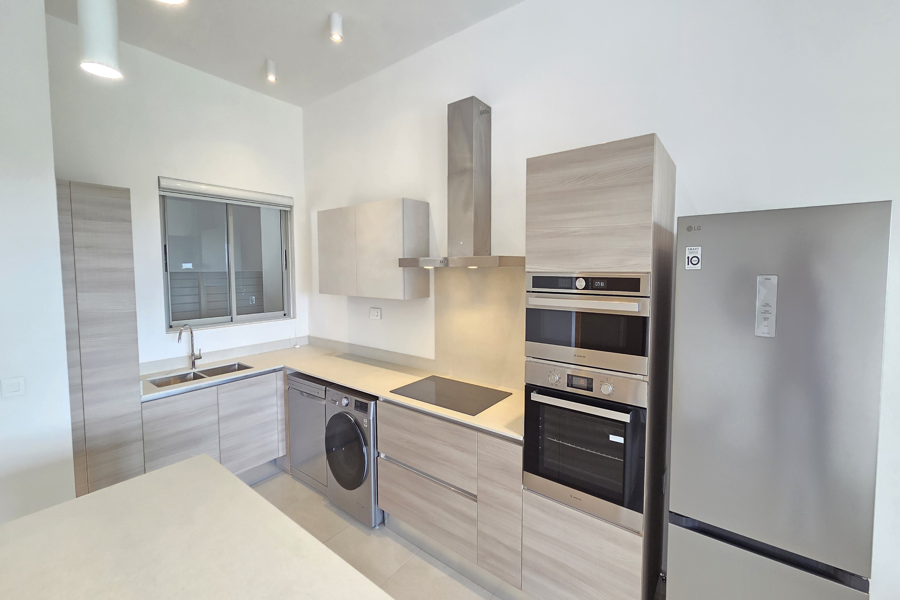 The interior features a bright living and dining area that opens onto the balcony, providing a comfortable space for everyday living. The equipped kitchen features high-end appliances that blend modern design with practicality.