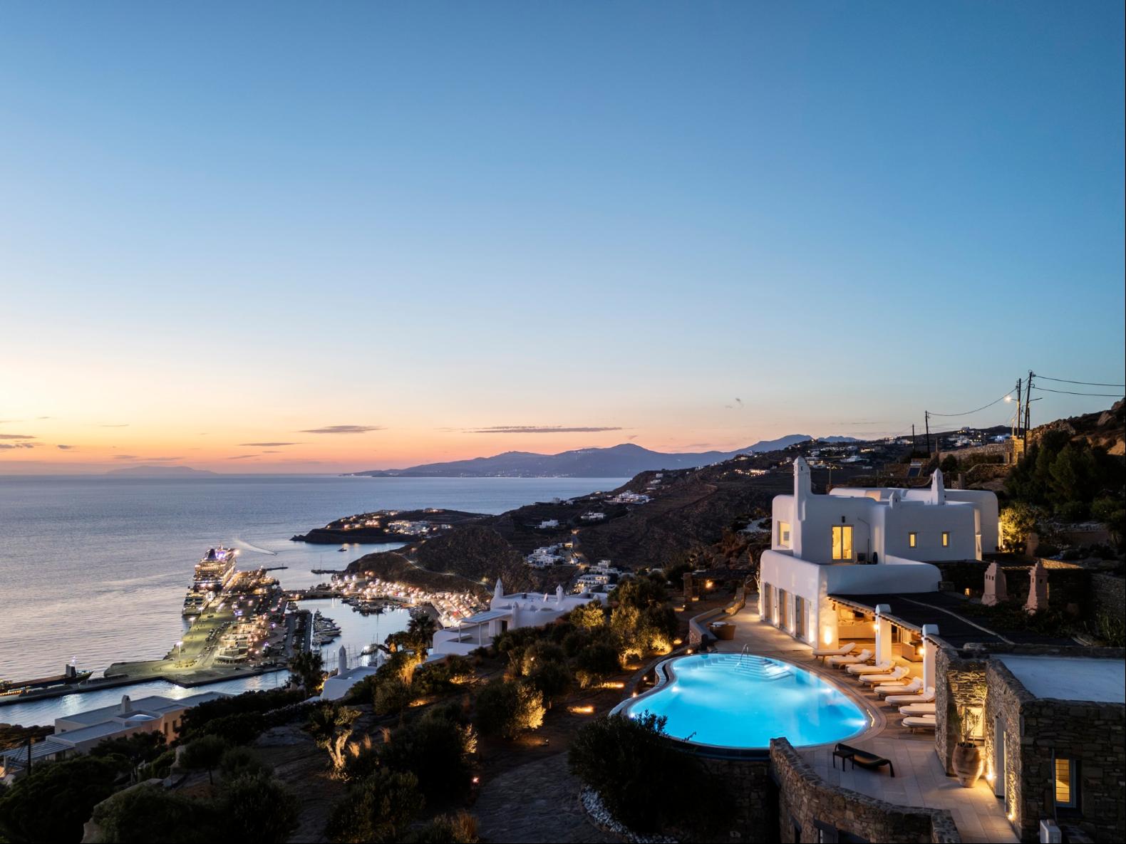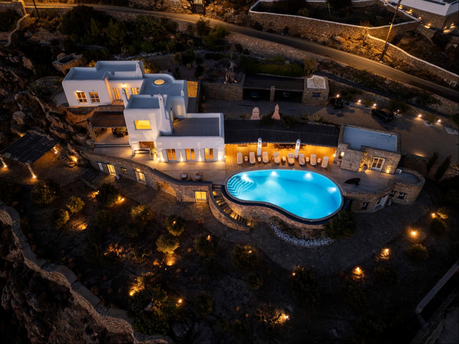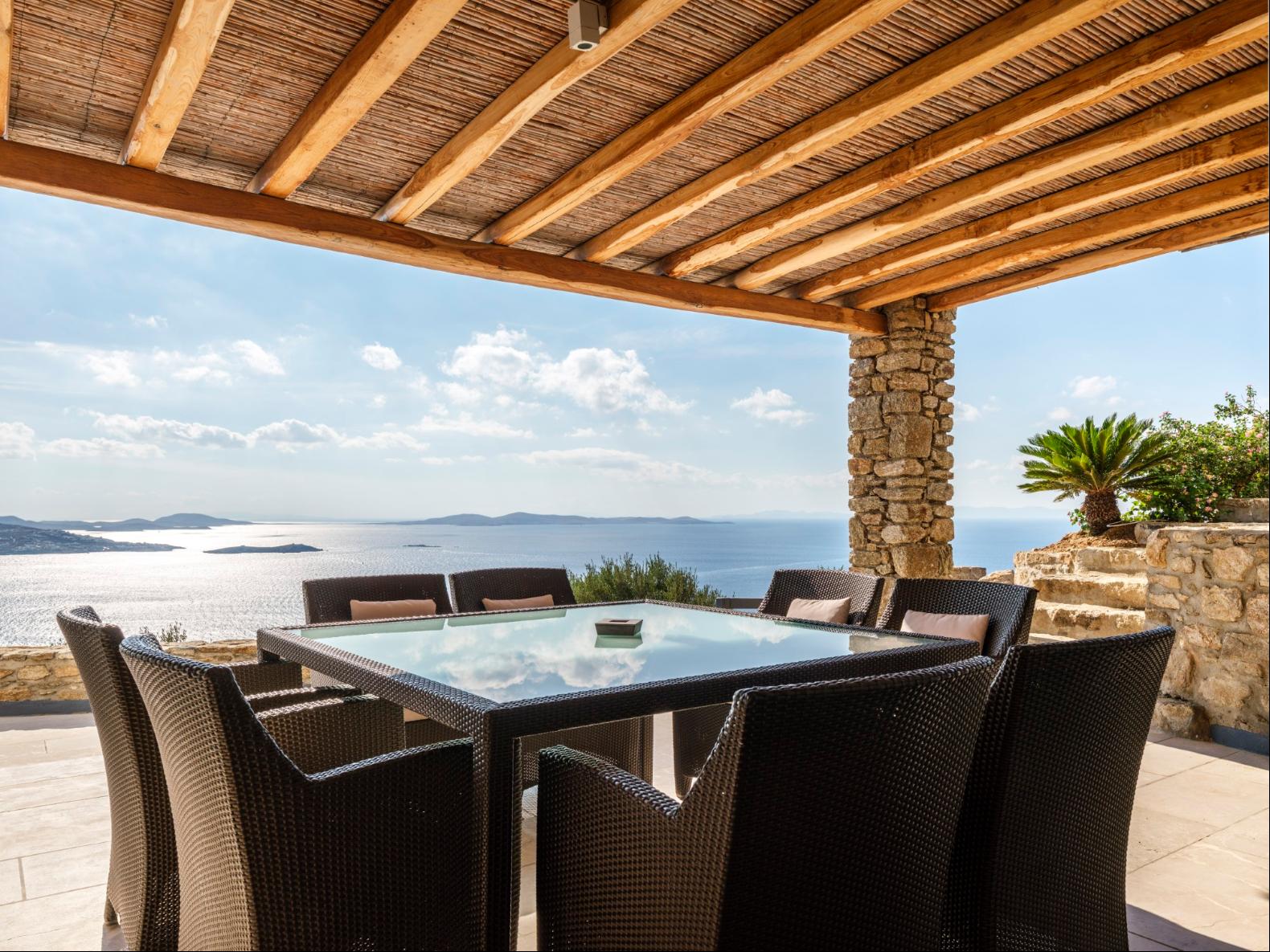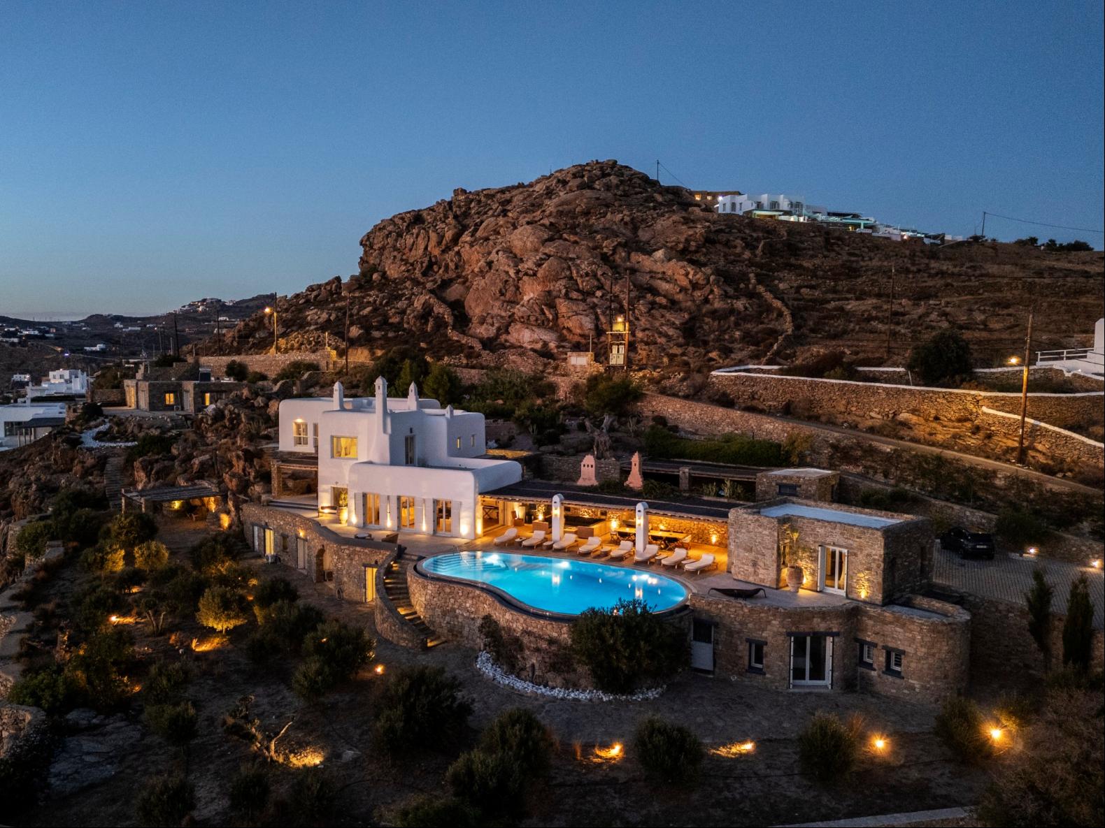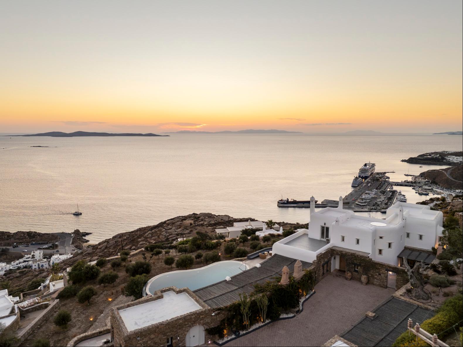 Exhale stress and soak in panoramic views from one of the ten luxurious bedrooms in this exceptional hillside residence. Nestled just minutes from Mykonos Town, this top-tier property features a huge infinity pool, perfect for moments of leisure and relaxation. Unwind while watching boats sail across the Aegean at sunset, all within the complete privacy this exclusive retreat provides, with the convenience of being close to Mykonos Town. The villa can comfortably accommodate 20 guests and includes the Main Villa and the Guest House. It features 7 Double Bedrooms in the main structure, all featuring sea views and en-suite bathrooms. It also features a Guest House, with private independent entrance, offering 2 double bedrooms. You can enjoy breathtaking sunset views from the infinity pool and the multiple outdoors lounging areas of the villa. Take advantage of the multiple modern features of this truly unique property, like the private gym and the home cinema and make your holidays memorable!