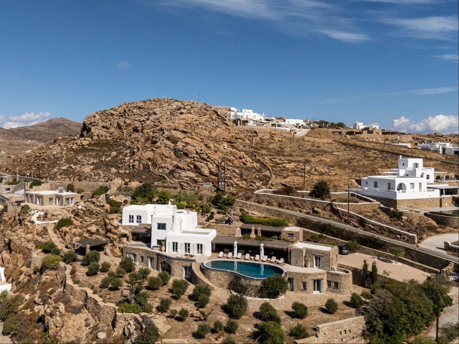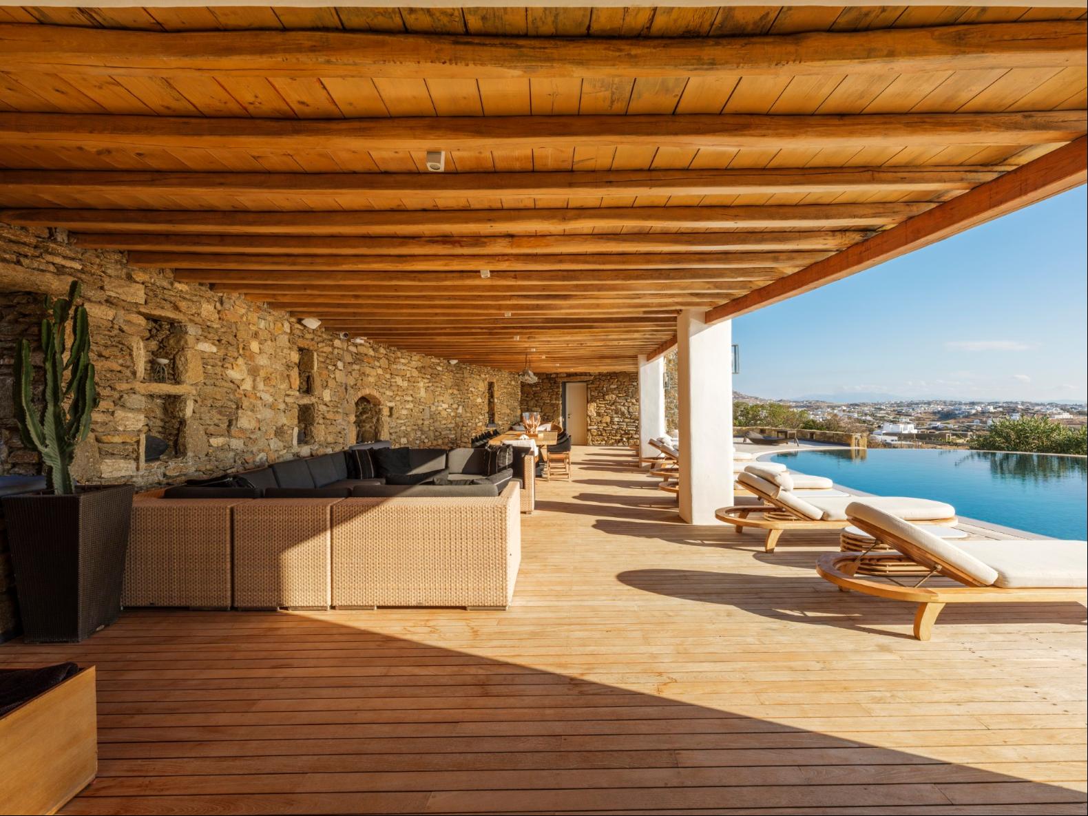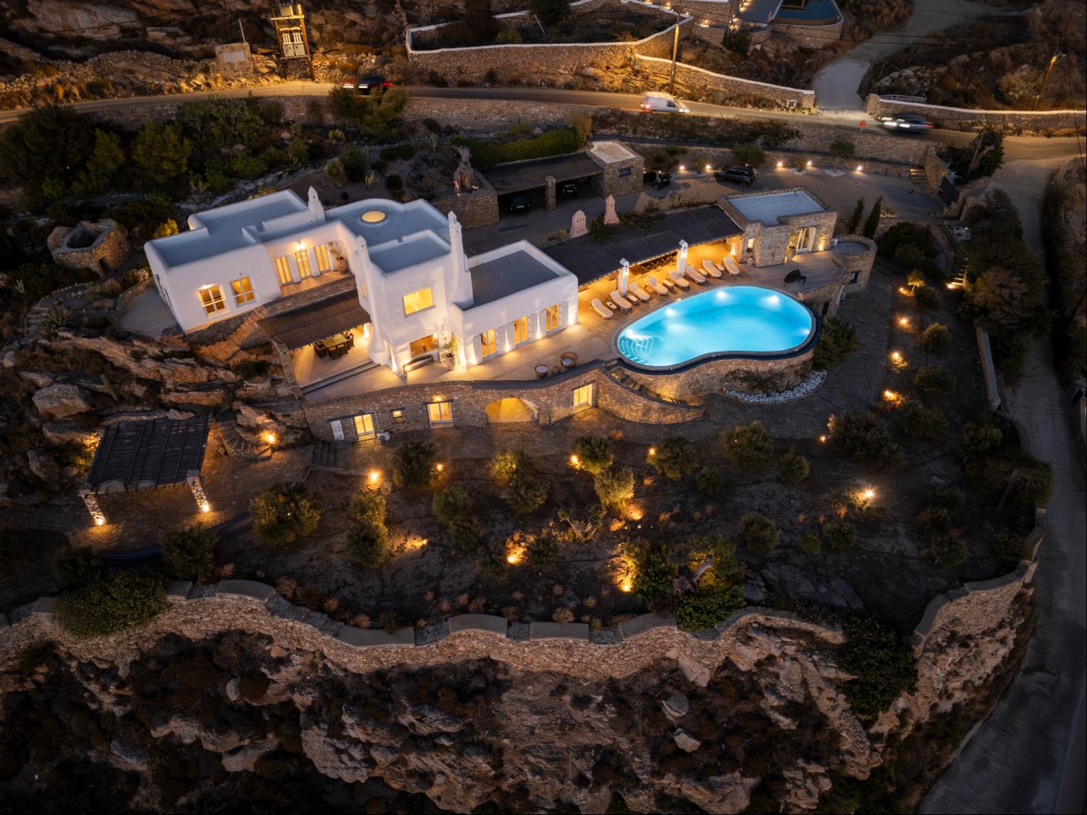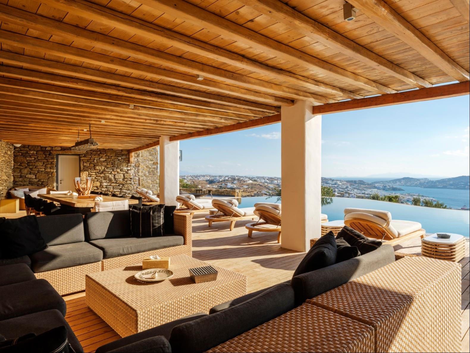Exhale stress and soak in panoramic views from one of the ten luxurious bedrooms in this exceptional hillside residence. Nestled just minutes from Mykonos Town, this top-tier property features a huge infinity pool, perfect for moments of leisure and relaxation. Unwind while watching boats sail across the Aegean at sunset, all within the complete privacy this exclusive retreat provides, with the convenience of being close to Mykonos Town. The villa can comfortably accommodate 20 guests and includes the Main Villa and the Guest House. It features 7 Double Bedrooms in the main structure, all featuring sea views and en-suite bathrooms. It also features a Guest House, with private independent entrance, offering 2 double bedrooms. You can enjoy breathtaking sunset views from the infinity pool and the multiple outdoors lounging areas of the villa. Take advantage of the multiple modern features of this truly unique property, like the private gym and the home cinema and make your holidays memorable!