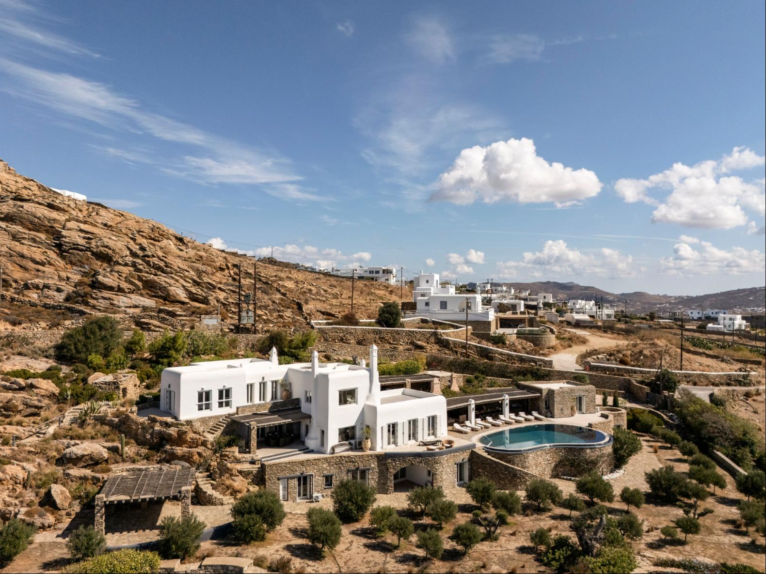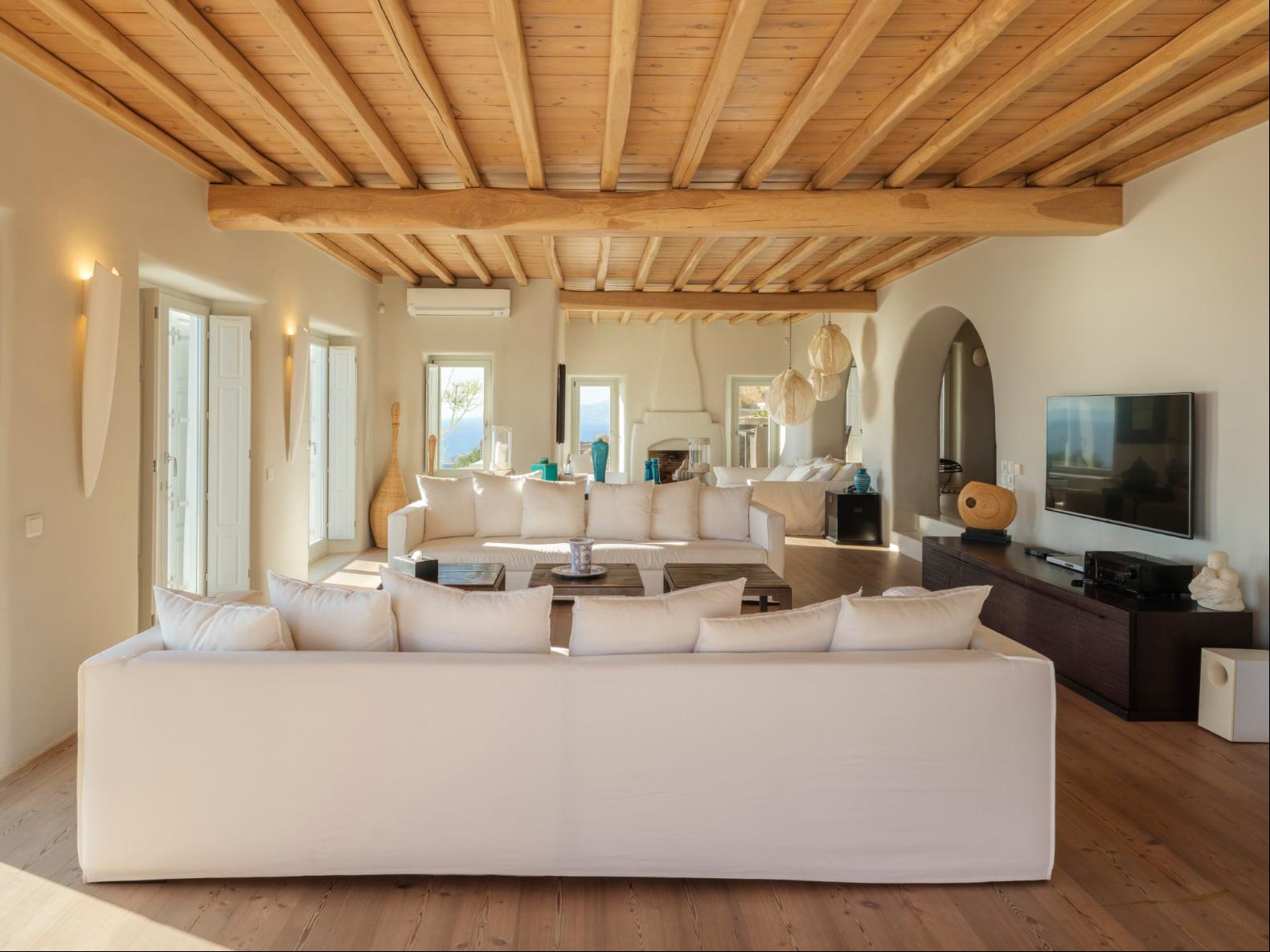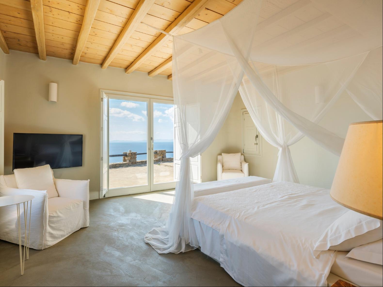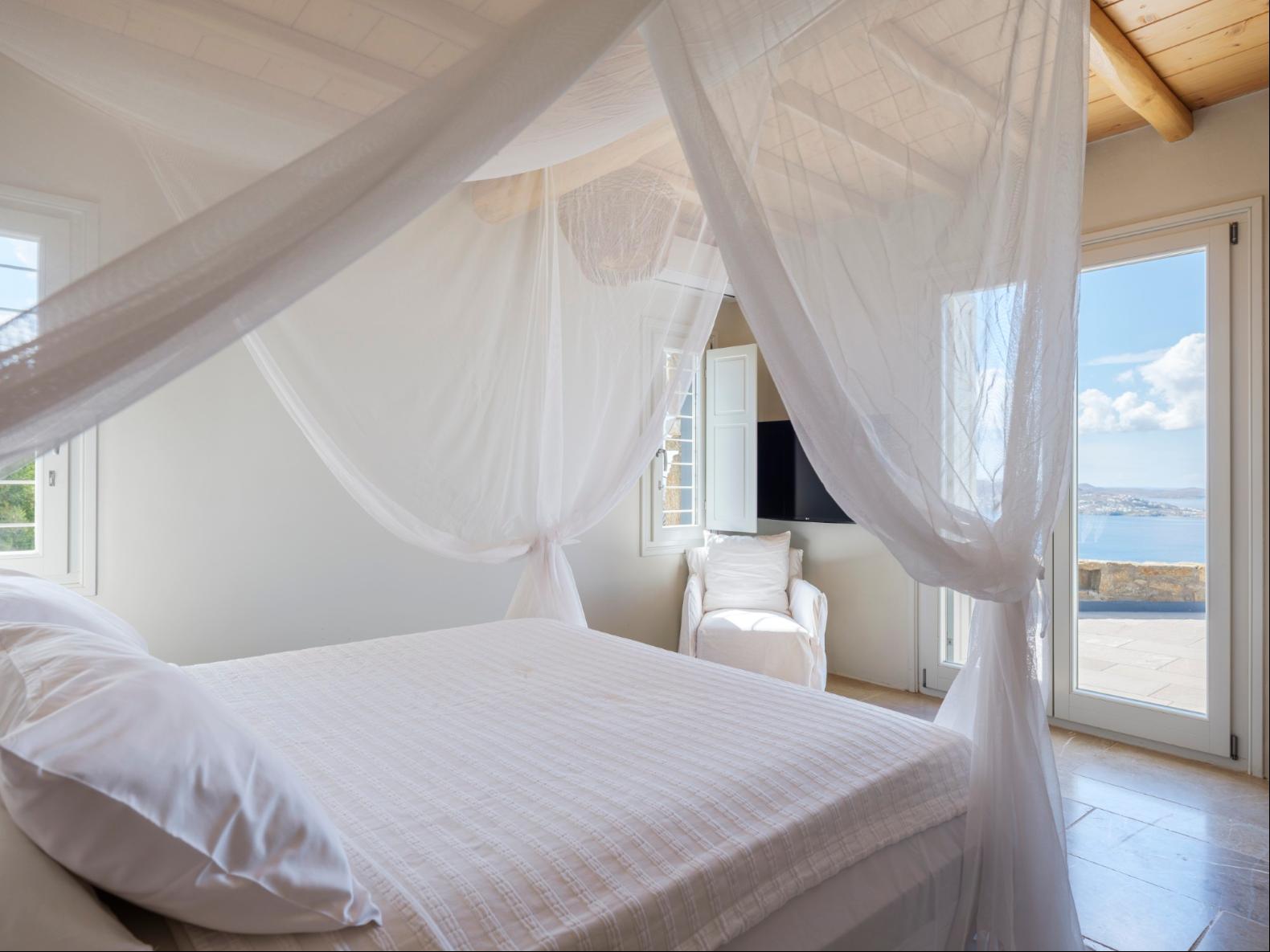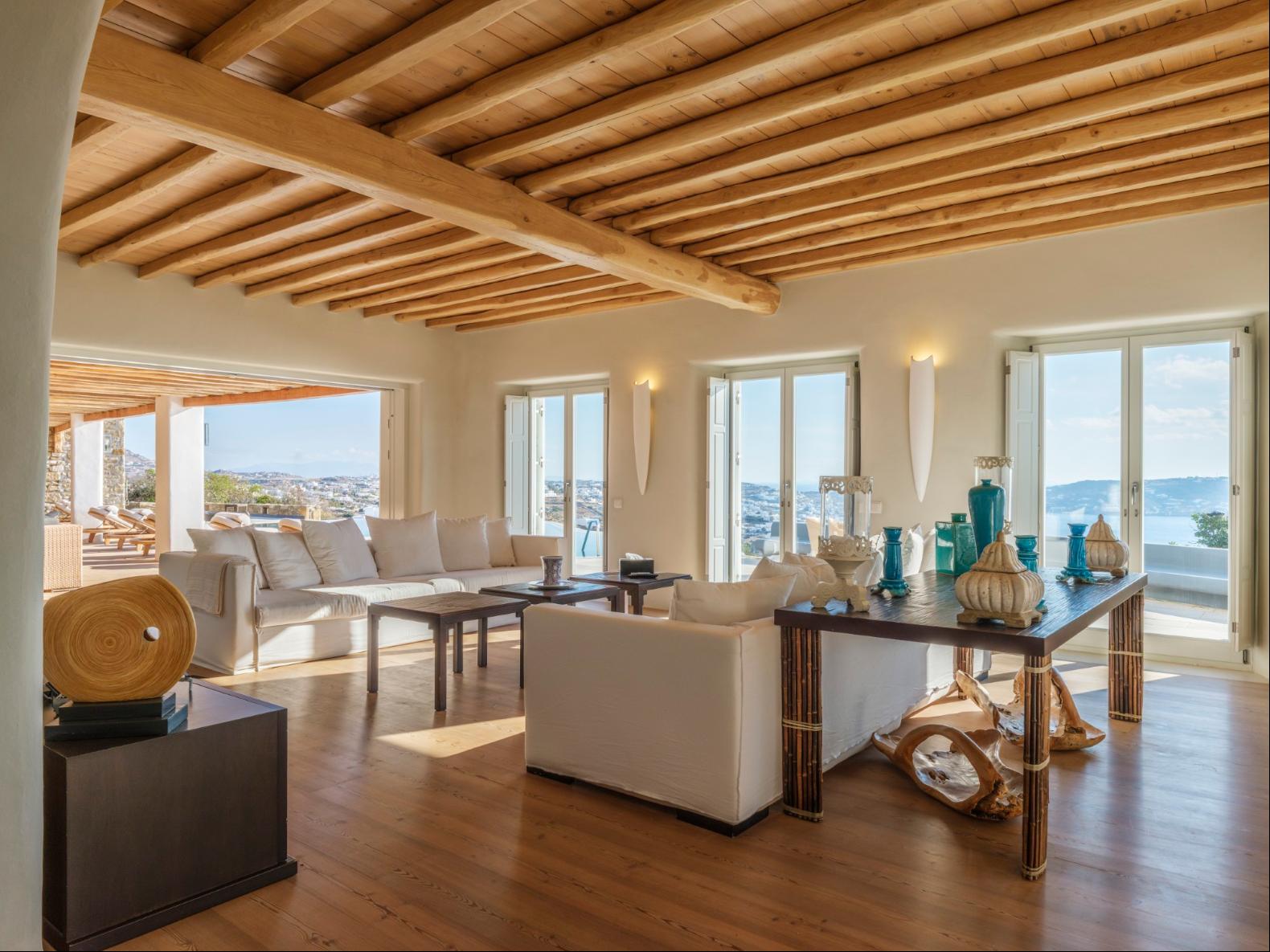 Exhale stress and soak in panoramic views from one of the ten luxurious bedrooms in this exceptional hillside residence. Nestled just minutes from Mykonos Town, this top-tier property features a huge infinity pool, perfect for moments of leisure and relaxation. Unwind while watching boats sail across the Aegean at sunset, all within the complete privacy this exclusive retreat provides, with the convenience of being close to Mykonos Town. The villa can comfortably accommodate 20 guests and includes the Main Villa and the Guest House. It features 7 Double Bedrooms in the main structure, all featuring sea views and en-suite bathrooms. It also features a Guest House, with private independent entrance, offering 2 double bedrooms. You can enjoy breathtaking sunset views from the infinity pool and the multiple outdoors lounging areas of the villa. Take advantage of the multiple modern features of this truly unique property, like the private gym and the home cinema and make your holidays memorable!