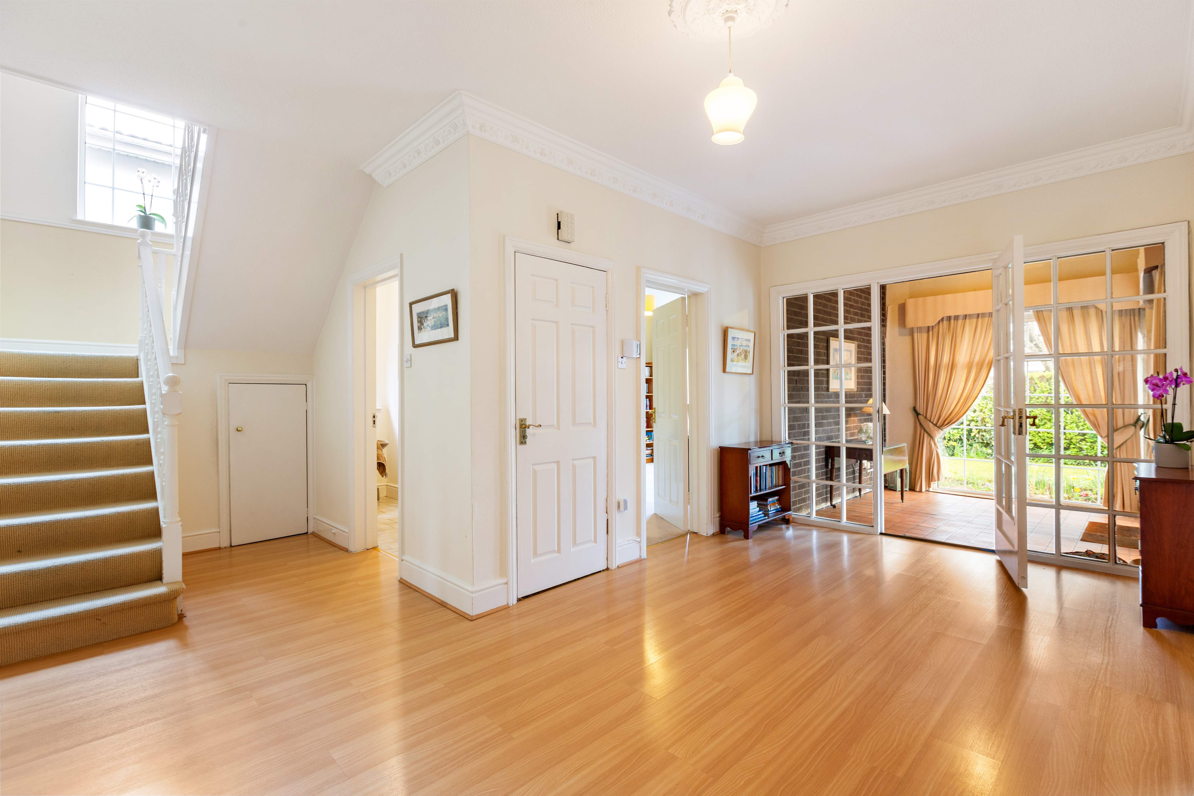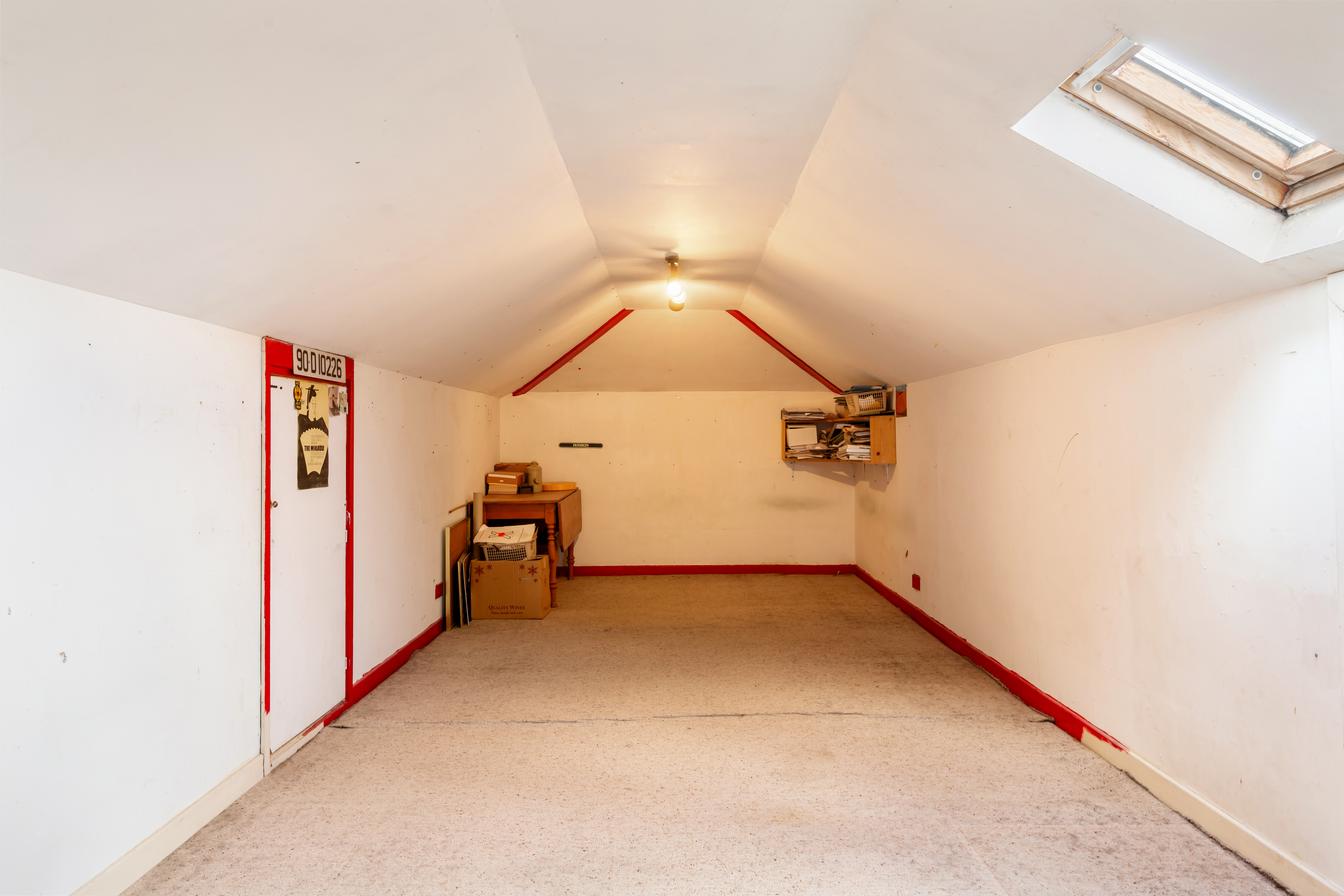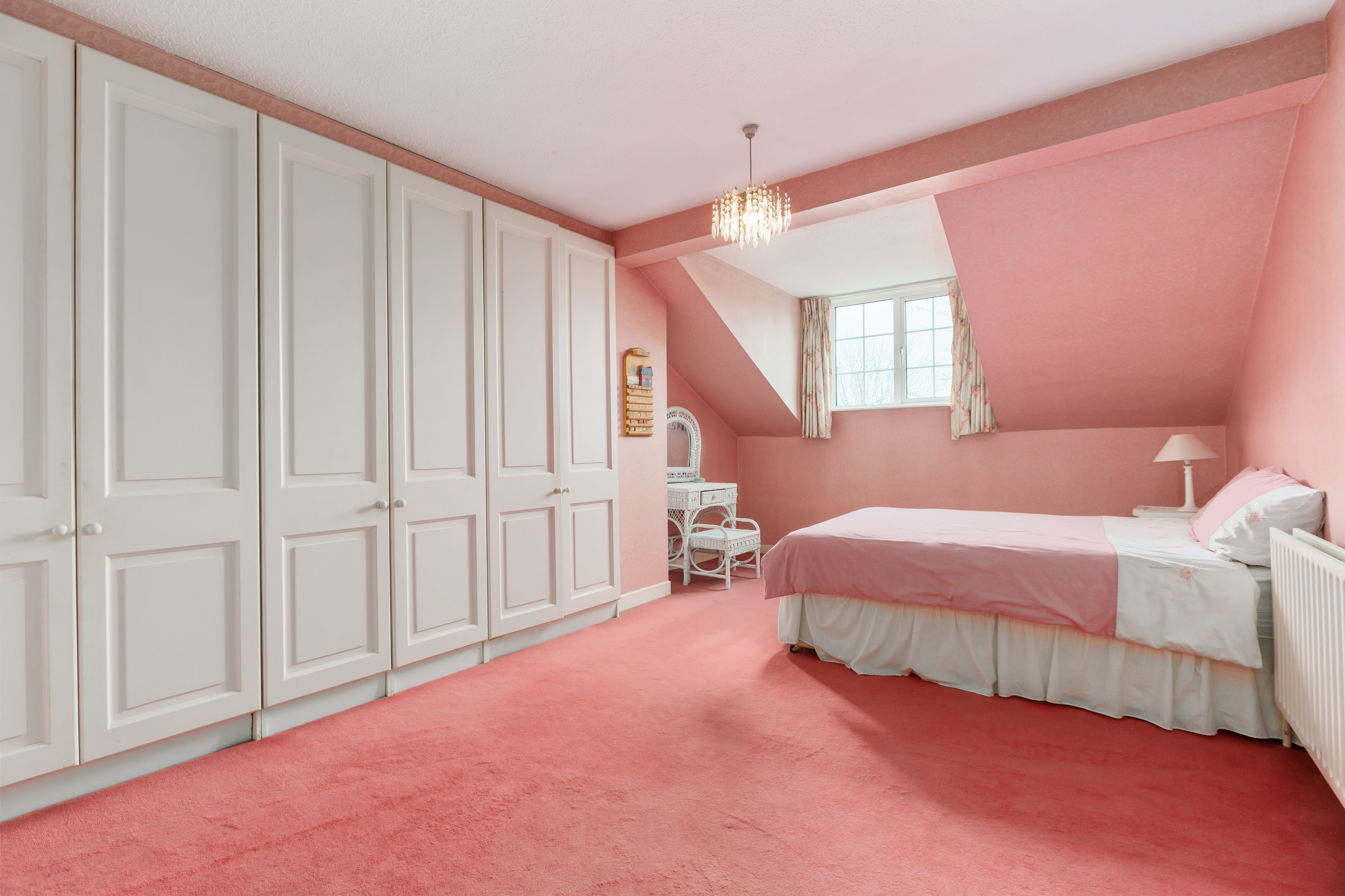 Upstairs, five well-appointed double bedrooms provide excellent family accommodation. The principal bedroom benefits from an en suite shower room, while a family bathroom serves the remaining bedrooms. From the spacious landing, a stairwell leads to a converted attic — ideal for storage — complemented by extensive under-eaves storage space.