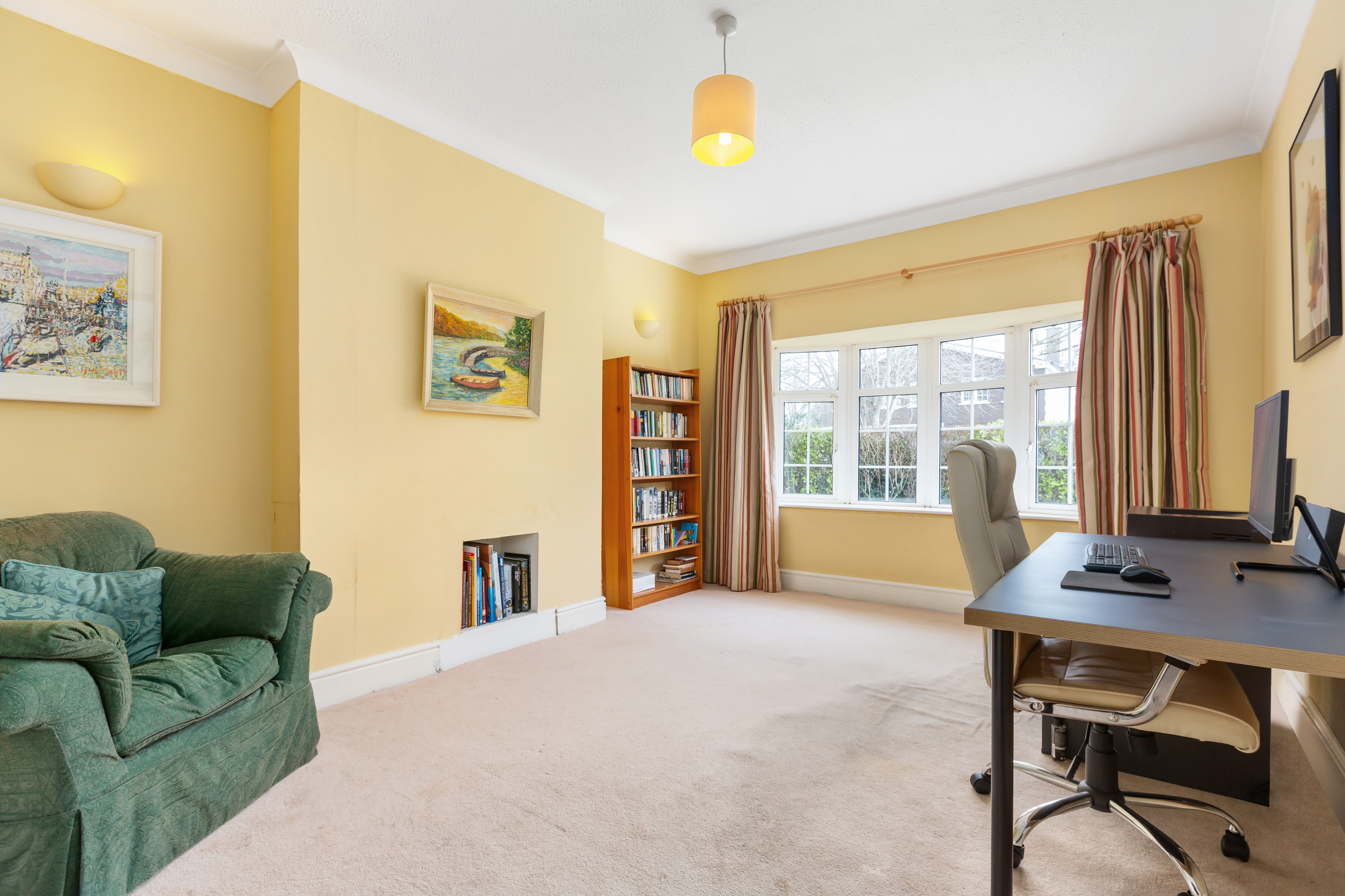 The property is approached via a large private driveway providing ample off-street parking for numerous cars. Vehicular side access leads to the expansive rear garden, a wonderfully private and sunny west-facing retreat — perfect for outdoor dining, family recreation, and gardening enthusiasts alike. An extensive purpose-built garden store is conveniently positioned to the side of the house. The overall site area extends in excess of a Fifth of an acre.