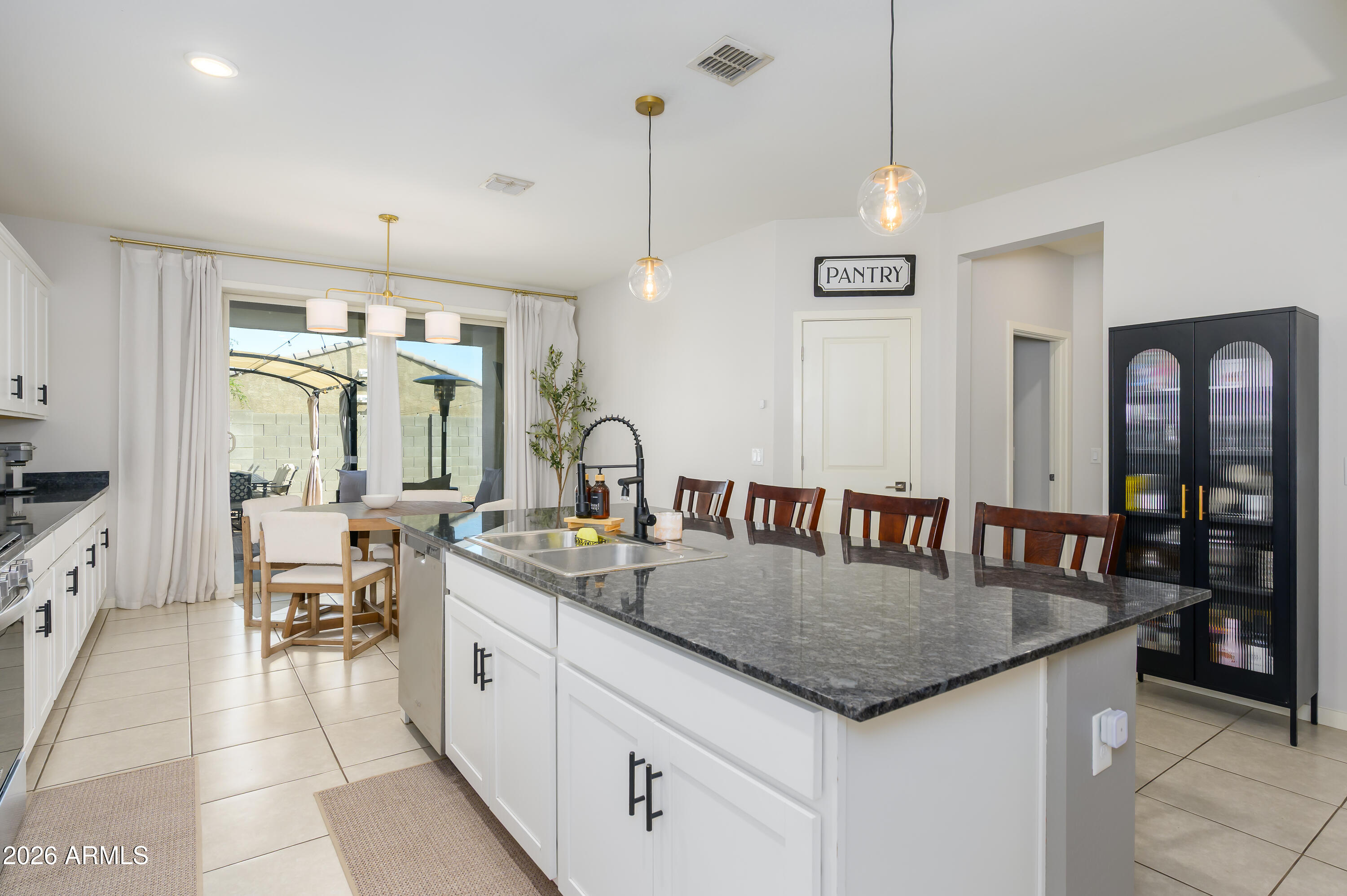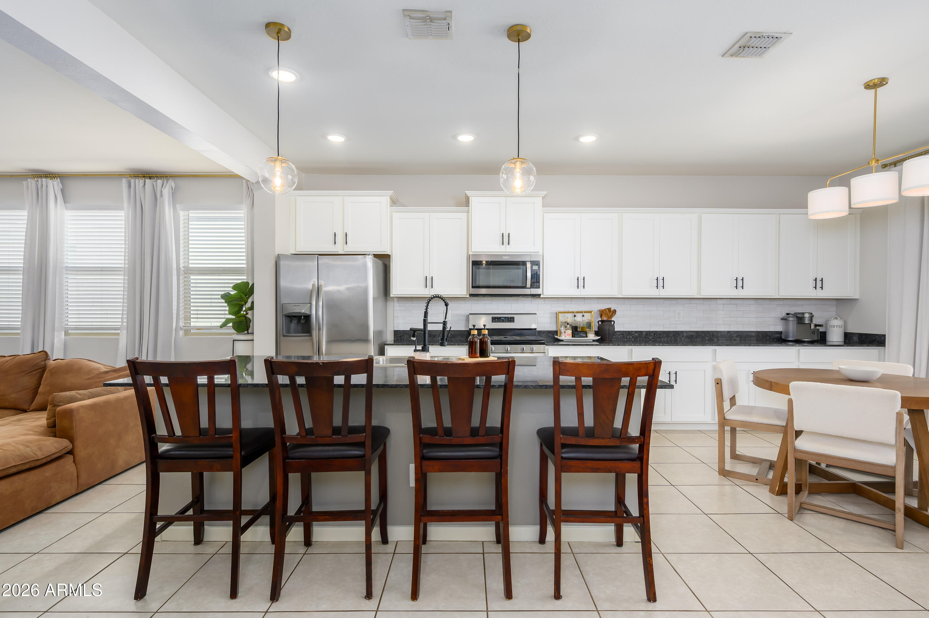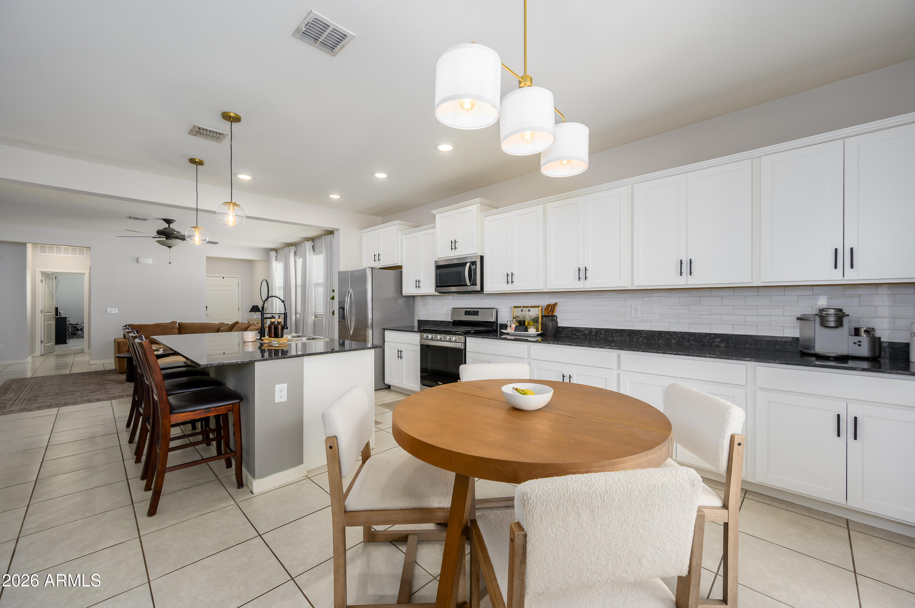 The heart of the home is the fantastic kitchen, featuring a large breakfast bar, sleek stainless steel appliances, stunning granite countertops, and crisp white cabinetry accented with custom hardware--perfect for both everyday living and hosting gatherings.