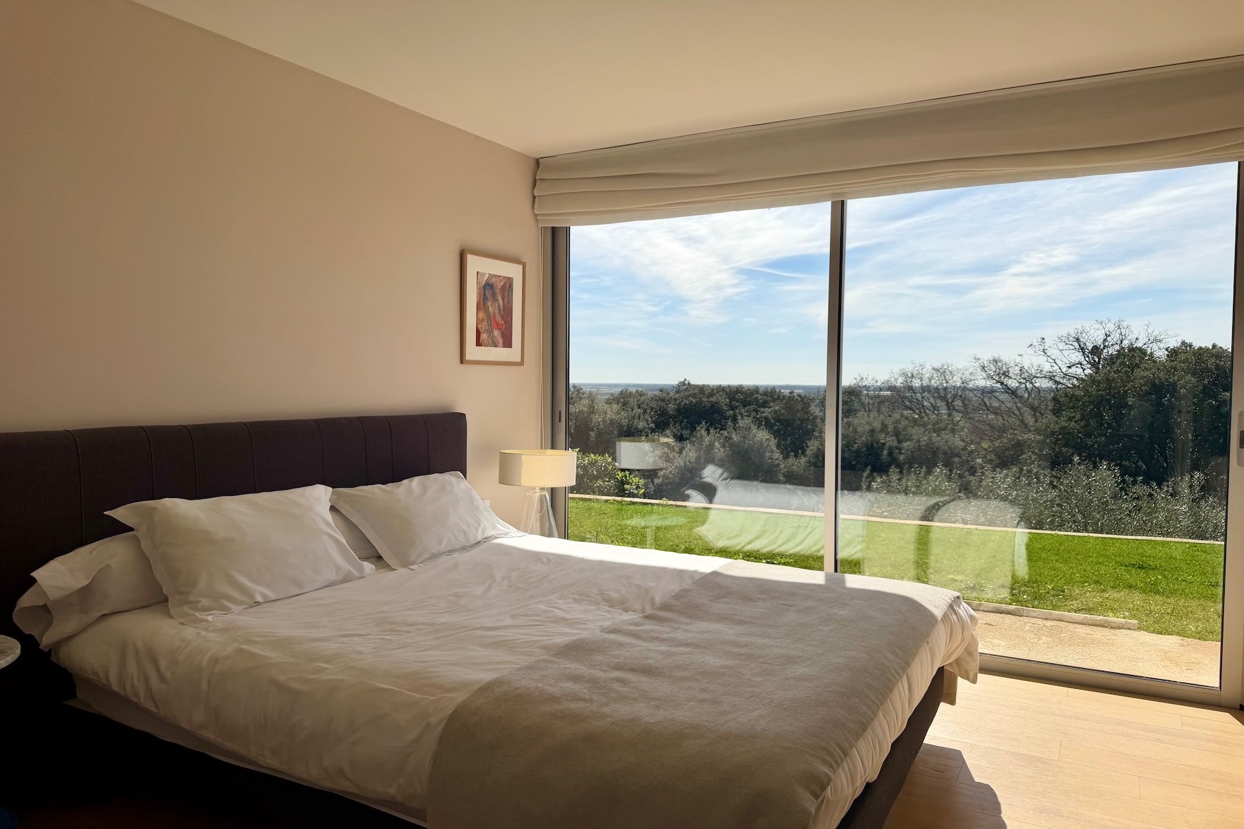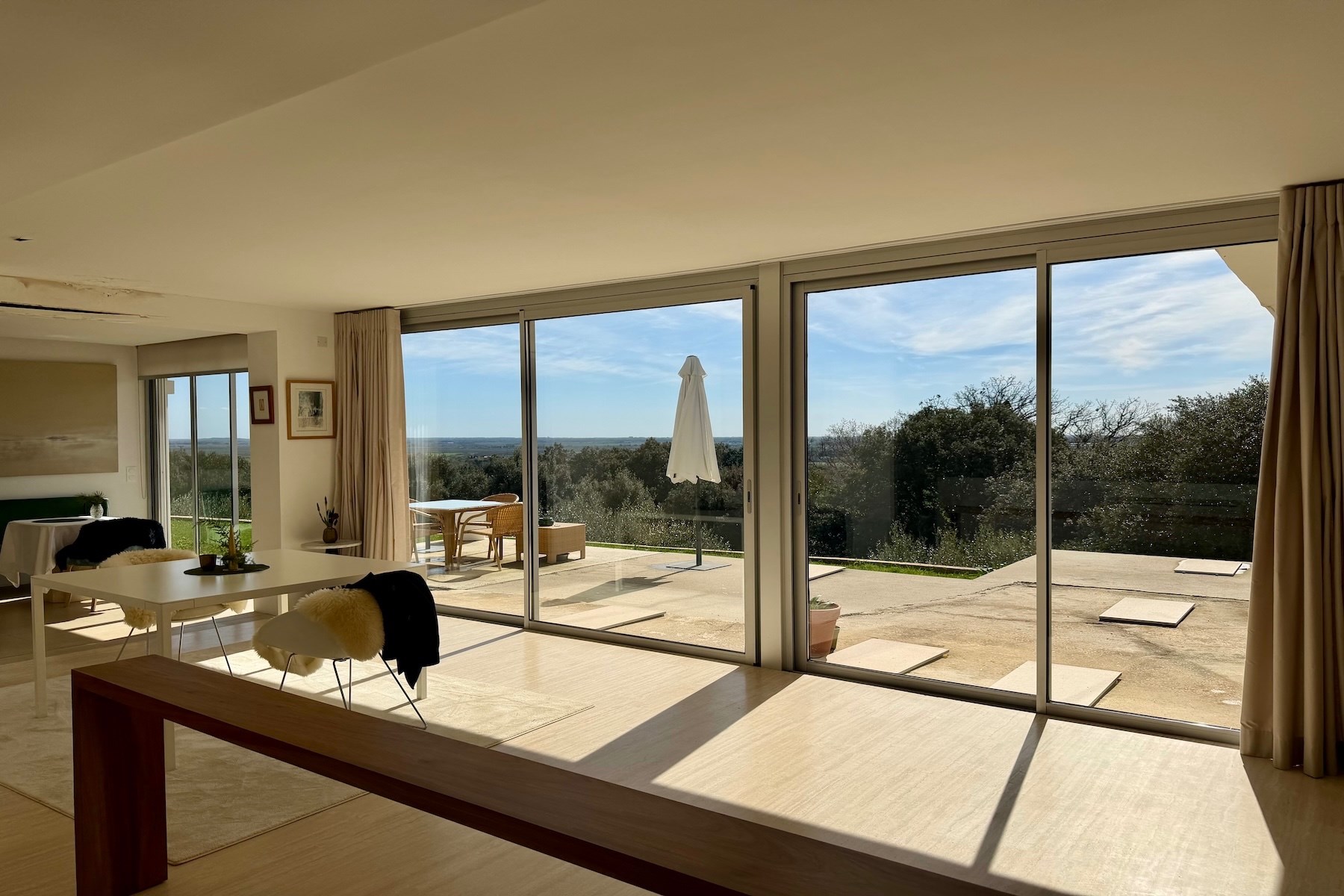 Situated in a privileged environment, close to Nîmes and at the gateway to the Camargue, this remarkable architect-designed villa by Armand Pellier offers a rare lifestyle, combining nature and convenience. Built in a dominant position, the property enjoys a full दक्षिण-facing exposure and boasts exceptional panoramic views over the Alpilles, offering a stunning landscape throughout the seasons. Set on a beautifully landscaped plot of 2,513 sqm, the villa offers approximately 133 sqm of living space and opens onto a superb 100 sqm terrace, seamlessly extending the living areas. From the moment you enter, you will be captivated by the generous volumes and natural light. The living area, fully open onto the terrace, features a welcoming lounge and dining space, enhanced by an elegant custom-made artisanal fireplace. The open-plan kitchen, with its contemporary design, has been crafted using high-end materials (Dekton – EBA Interiors) and is equipped with a full range of integrated Miele appliances (double induction hob, teppanyaki, oven, microwave, coffee machine, warming drawer), complemented by a Roblin extractor hood. The sleeping area comprises two master suites, each offering high-quality finishes (one with a bathroom including both shower and bathtub, the other with a shower room), ensuring comfort and privacy. The plot is suitable for a swimming pool and offers numerous development possibilities, including the creation of an additional outbuilding, extra bedrooms, or the installation of a carport, allowing the property to adapt to a wide range of lifestyle projects.