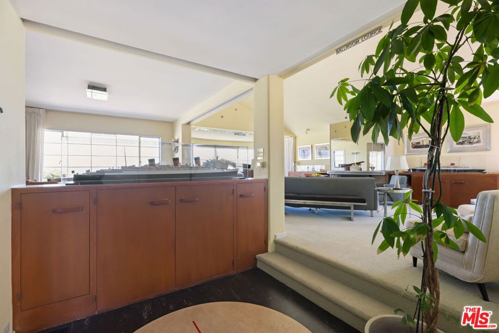 Set above the city with sweeping, panoramic views, this streamline moderne residence offers a rare blend of character, volume, timeless design, and classic Hollywood glamor. Spanning approximately 3,132 square feet, this 4-bedroom, 4-bathroom home is thoughtfully designed to embrace both comfortable daily living and exceptional entertaining. A dramatic living room welcomes you with soaring ceilings, expansive walls for art, and abundant natural light pouring through walls of glass that frame the stunning vistas beyond. A striking spiral staircase adds a sculptural focal point while leading to a private media/screening room complete with wet bar and powder room---an ideal retreat for entertainment and relaxation. The adjacent dining room is perfectly suited for both intimate gatherings and larger-scale entertaining, seamlessly connected to the home's open and airy layout. The kitchen retains its classic charm while offering generous workspace, an adjoining butler's pantry, and convenient access to the main living areas. A dedicated laundry area and additional service spaces enhance everyday functionality. The first floor also features a versatile den/office with bath, ideal for a home workspace, along with a separate guest or maid's bedroom and bath, offering flexibility for a variety of living arrangements. Upstairs, the primary suite serves as a private retreat, complete with its own luxurious bath and direct access to an expansive upper deck perfect for taking in morning light or evening sunsets. A second bedroom, currently configured as an office, also opens to the deck, creating a seamless indoor-outdoor connection. A third bedroom completes the upper level and shares a Jack-and-Jill bath. Outdoor living is equally compelling, featuring a covered patio overlooking a pool and spa, all set against breathtaking views. A step-down seating area with a fountain provides an additional intimate space for relaxation or entertaining, enhancing the home's tranquil and resort-like atmosphere. Throughout, unique streamline moderne architectural elements, curated interiors, and an undeniable sense of personality create a one-of-a-kind living experience. Only the second time on the market, this residence was featured in the L.A. Times Home Section in November 2006---offering a rare opportunity to own a home that combines architectural interest, functional design, and an exceptional setting.