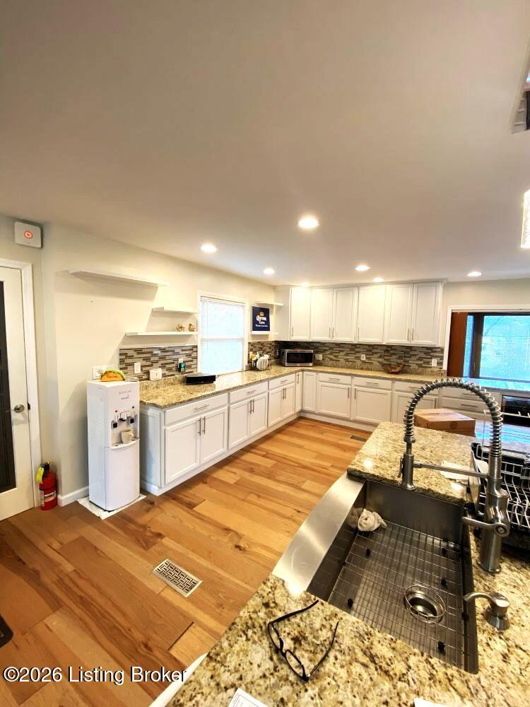 Walkout ranch with abundant open floorplan. Updated kitchen (2019) with granite countertops, pantry, skylight and undercounter refrigerator. Primary bedroom with walk-in closet, 2 additional bedrooms, 2 full updated bathrooms, finished basement with attached solarium and laundry room. Hardwood floors throughout the first floor. Hallway features built-in shelves and linen cabinet. 2 car oversized garage with workbench and lots of storage shelves. Seller is offering a 1 year ACHOSA Home Warranty. Half acre lots feature a deck with built-in firepit, a gazebo and a storage unit.