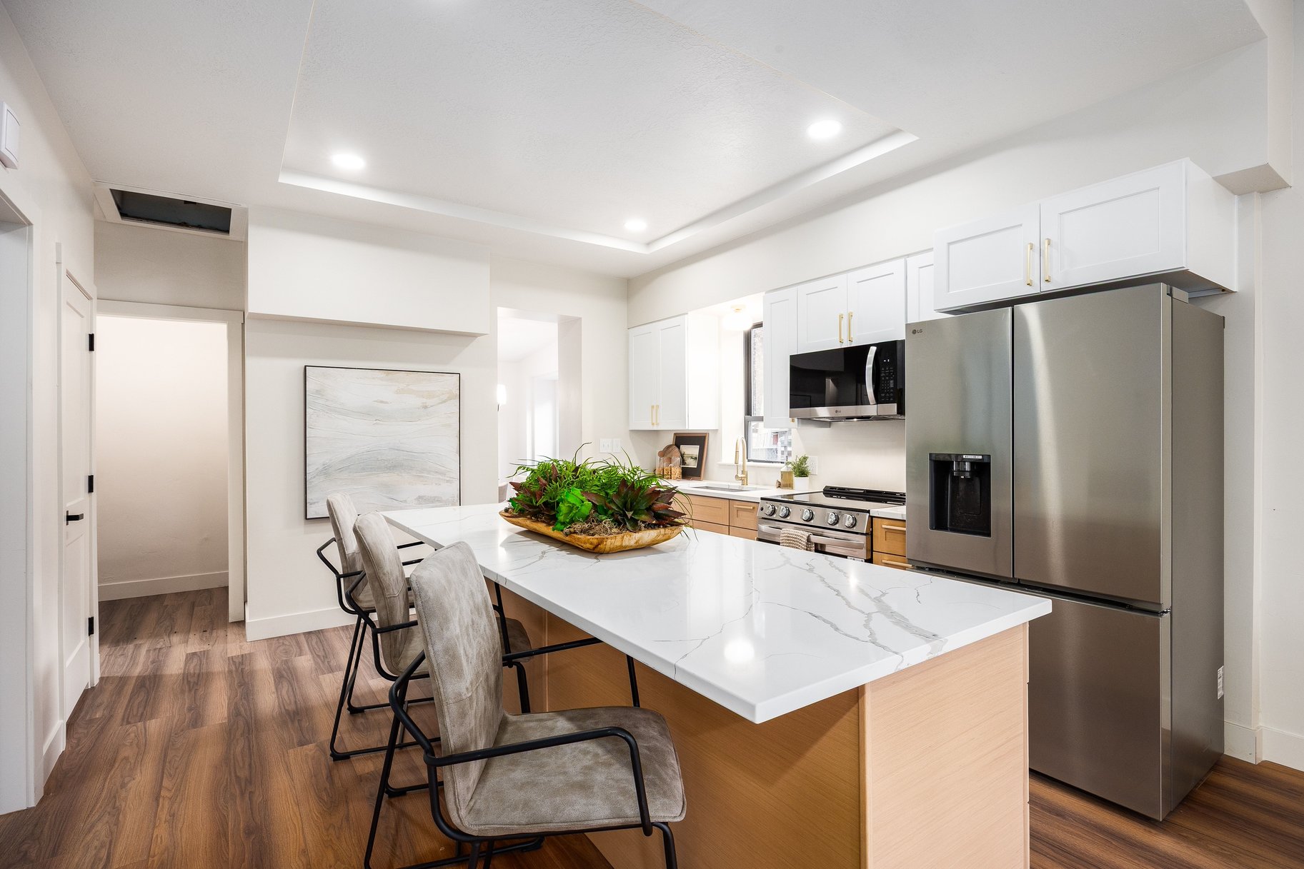 Welcome to the beautifully updated 1904 brick bungalow in the heart of downtown Salt Lake City! Located just steps from the Salt Lake City Public Library, local restaurants, shops, and UTA Trax, this home sits in a prime location that blends neighborhood charm with city living. Offering over 1,000 square feet of main floor living space and over 300 square feet of lower-level space, this completely renovated home, from top to bottom, allows plenty of room for living, entertaining and storage. As you walk through the front door you immediately feel the comfort of being "home" as you are greeted with a family room and large kitchen, the perfect gathering space for family and friends. The tastefully updated kitchen is equipped with soft close wood cabinetry, quartz countertops, and