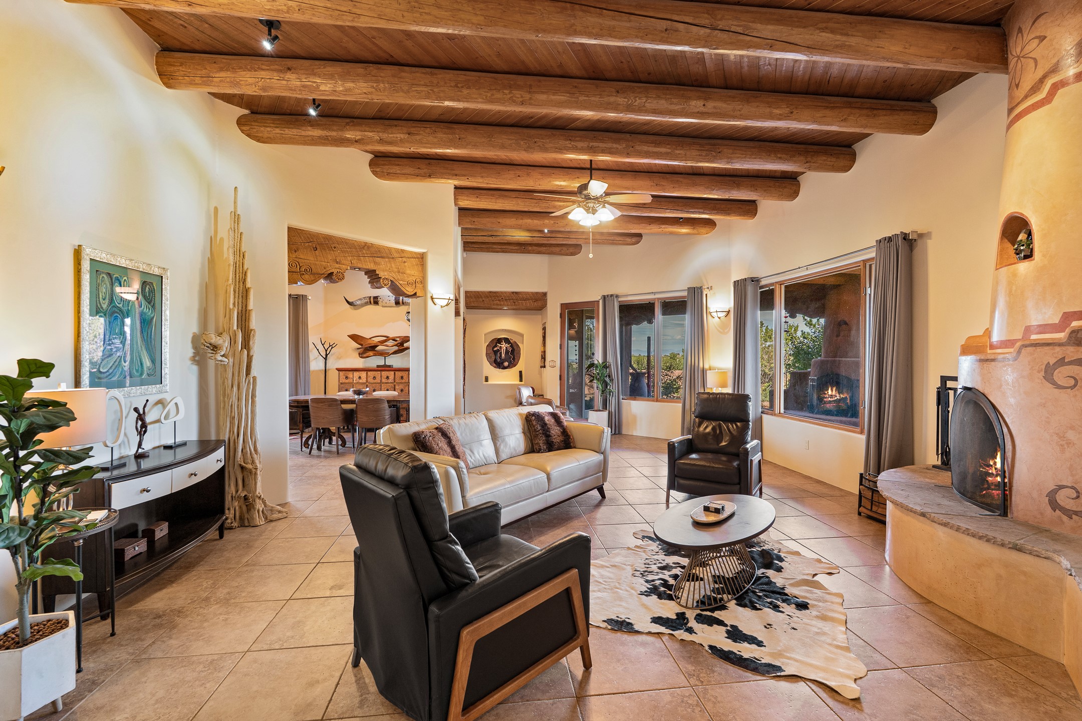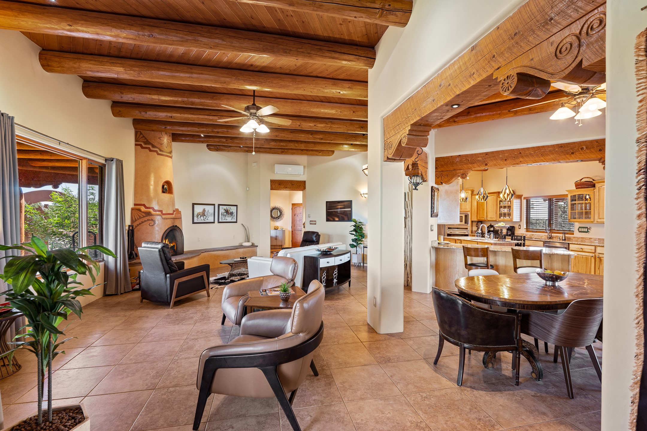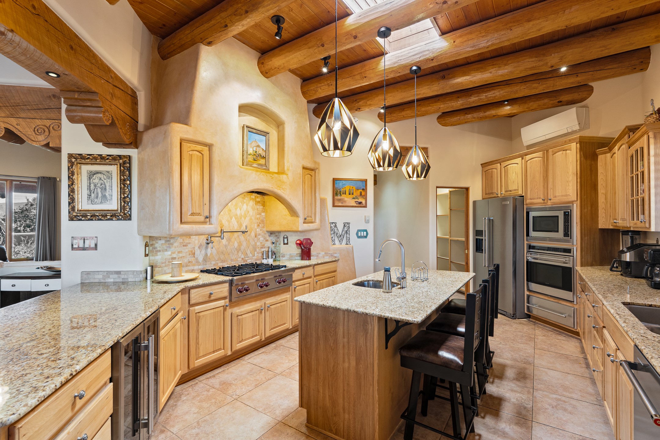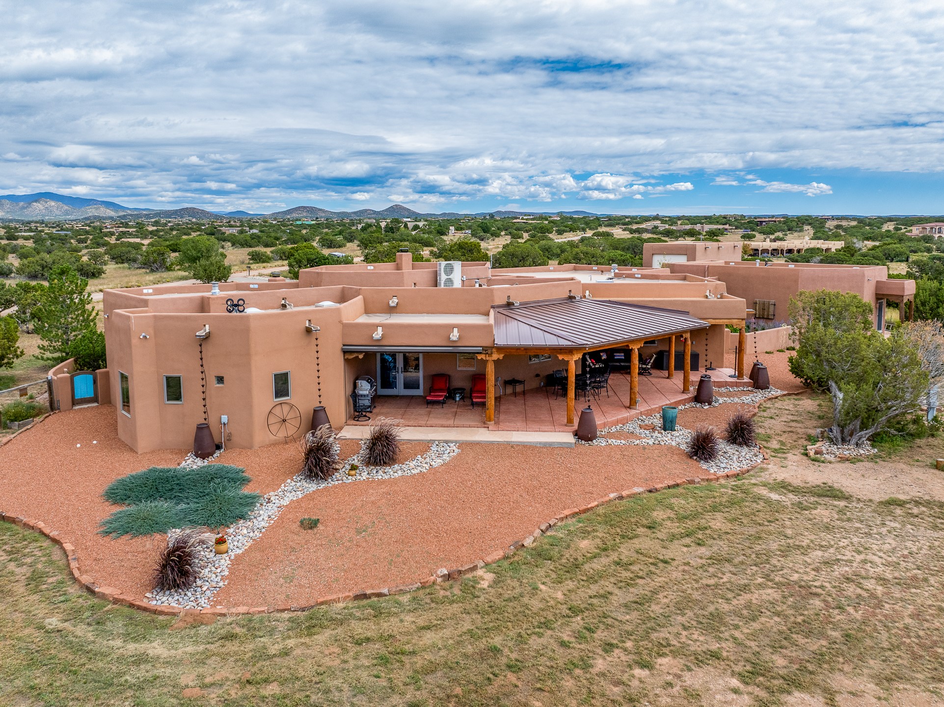 Wishing for a home with a Casita, expansive garage & storage space, & room to breathe on 5 acres? Your wish has been granted. Located in a prime spot with the Eldorado neighborhood grocery store, library, hardware store, & restaurants nearby, this beautifully sited single-level property offers sweeping mountain views, exceptional versatility, & classic regional charm. The 5-acre parcel (½ acre fenced) includes a 2548 sq ft 3-bedroom, 2.5-bath main residence & a separate 698 sq ft 1-bedroom, 1-bath Casita, ideal for guests or flexible extended living. Garages & Outdoor Living: Designed for space & functionality, the property features: An attached heated 3-car garage, additional attached 2-car garage connected to the Casita, a heated/cooled RV garage - perfect for a car enthusiast, hobbyist, or artist. The home is oriented to capture both sunrise & sunset views, with large portals that invite seamless indoor-outdoor living. From here, take in panoramic vistas of the Sangre de Cristo, Jemez, & Ortiz mountain ranges. Refined Interiors: The living room showcases a custom plastered & hand-painted Kiva fireplace, complemented by beautifully hand-carved corbels. The large kitchen & pantry offer both function & scale, featuring: Granite countertops, center island, secondary sink, 6-burner Wolf range with pot filler, microwave convection oven for versatile cooking, KitchenAid refrigerator & a dual-temp beverage refrigerator. Comfort & Community: The private primary suite includes a sitting area, portal access, two walk-in closets, & a spa-like bath with a jetted tub set beside a gas fireplace. Two guest bedrooms are thoughtfully separated & share a ¾ bath. Key Features: In-floor radiant heating, natural gas, 8 mini-splits, & Eldorado community water. Horses are allowed. A rare opportunity for peaceful country living with the convenience of local amenities around the corner, this property offers a unique combination of space, flexibility, & timeless New Mexico character.