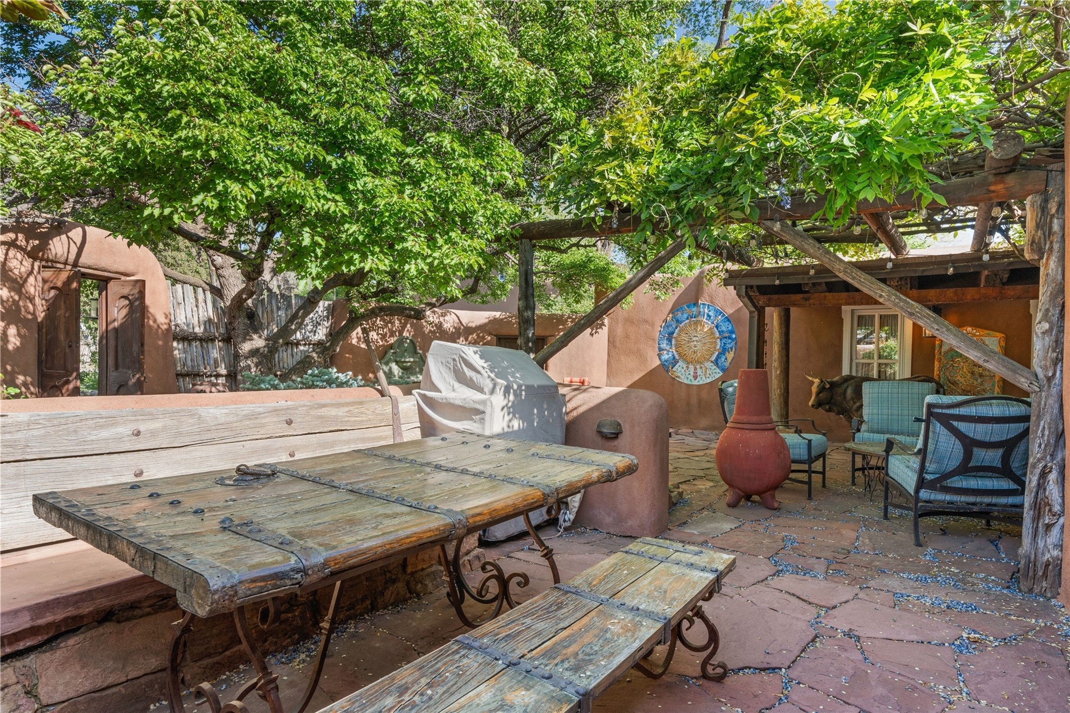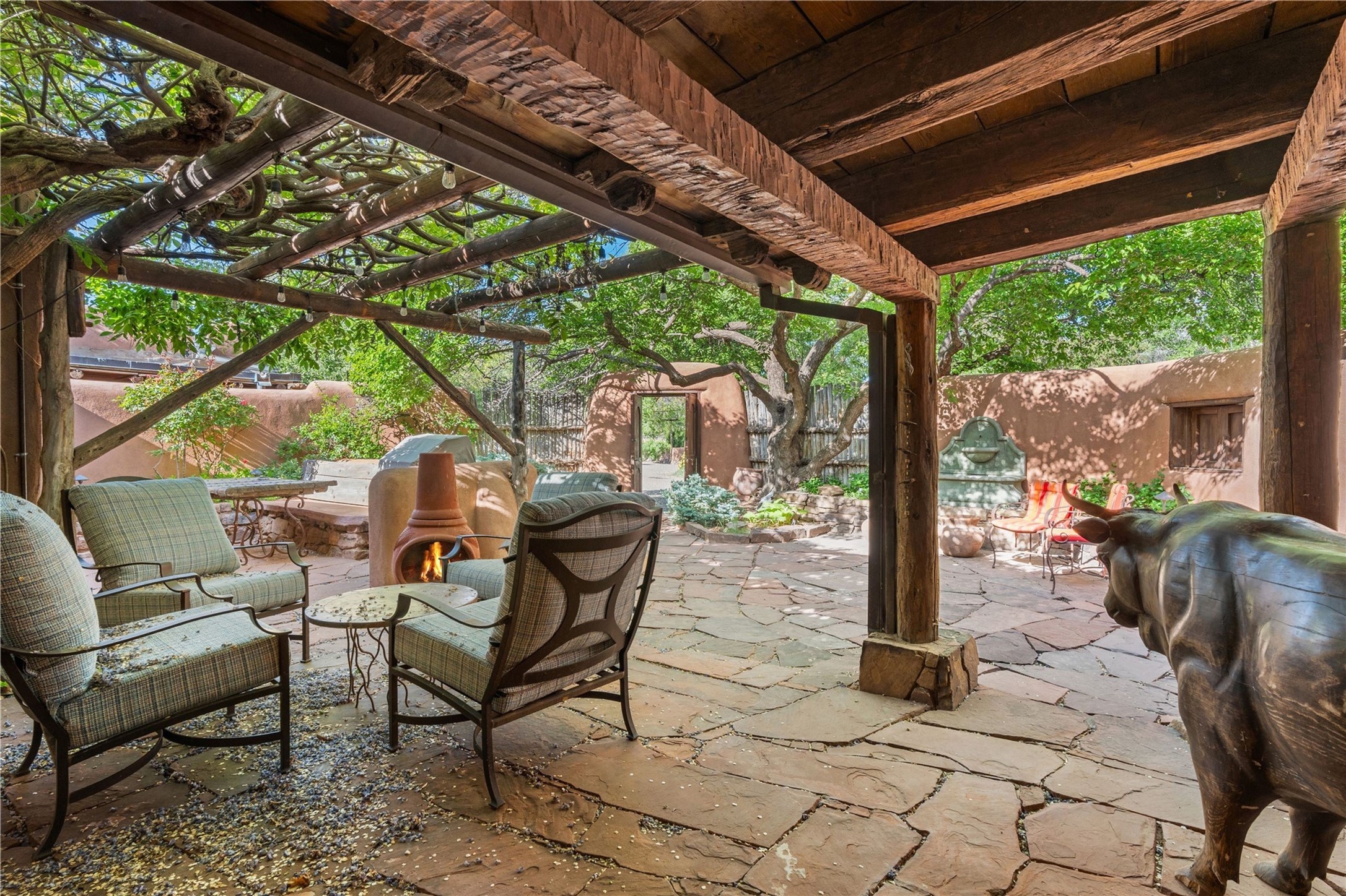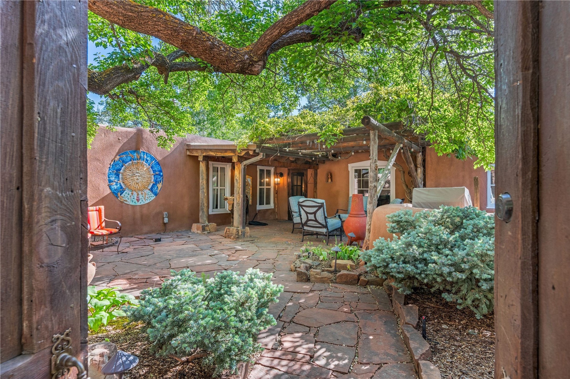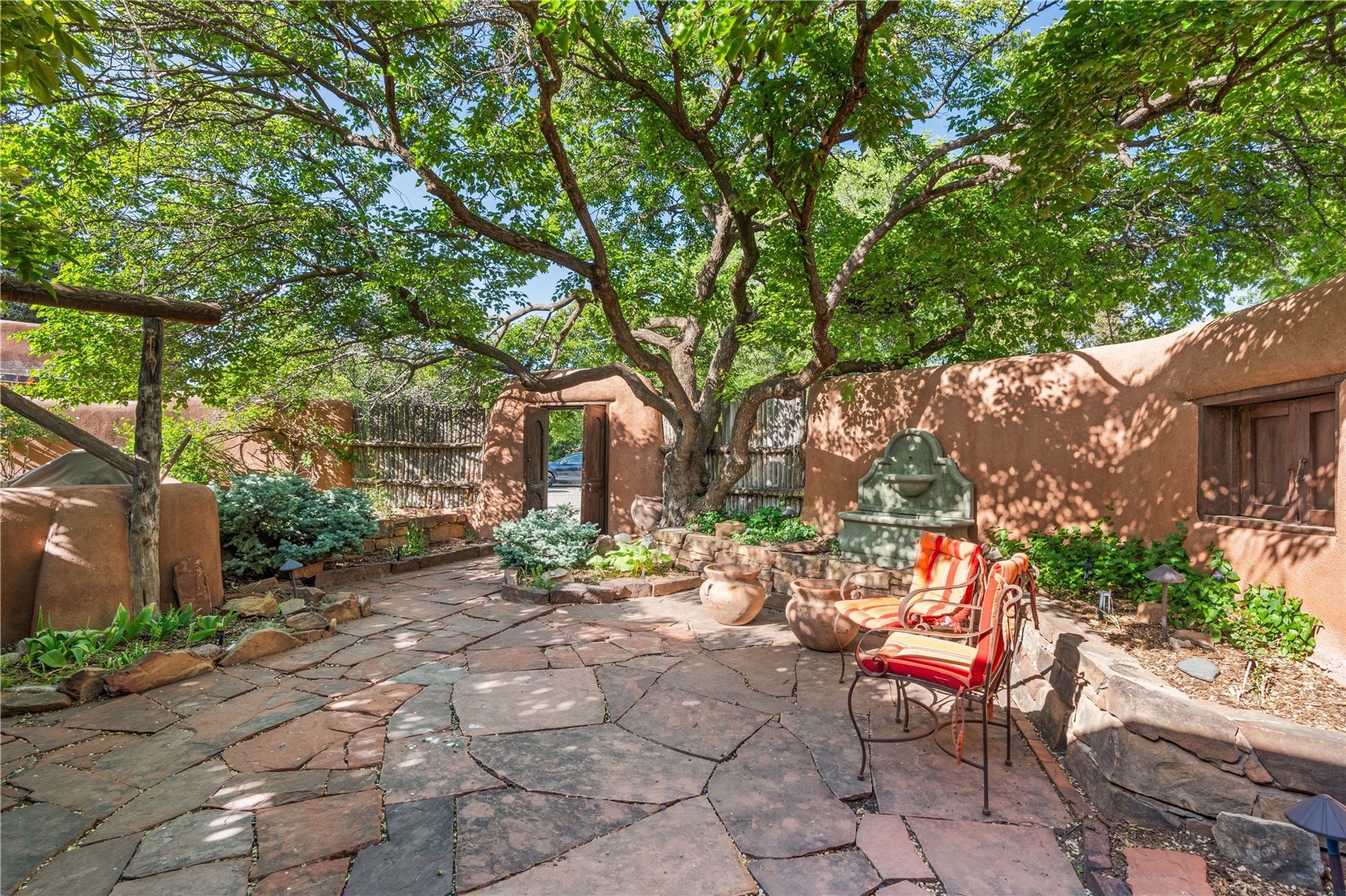 Incomparable home within the famed Gerald Cassidy Compound melds quintessential Santa Fe style with modern luxury. Tucked on a private ‘placita’ off of a prime stretch of Canyon Road between the Tea House and Patrick Smith Park, this 4-bed, 4-bath property boasts a 2-car garage, 4 walled courtyards, and private pedestrian access to Acequia Madre. Thick adobe walls, vigas, hand-carved beams and corbels, four kivas, and other Santa Fe-style details can be found throughout. The home features a gourmet kitchen with a Viking oven and wine cooler, custom exterior lighting and screen doors, and radiant floor heating. Every upgrade was carefully chosen to match the historic integrity of the home. Four walled courtyards with mature landscaping can be accessed off of different sides of the house by flagstone and brick pathways - a true gardener’s dream! The attached guest house with its own entrance allows for hosting while also maintaining privacy. In addition to 2 off-street parking spaces, a 2 car heated garage was added in 2014. A rare amenity on Canyon Road, the intricately designed garage contains vigas, windows, and two wooden doors with wrought-iron details. The structure could easily be used as a studio or additional living space. The historical significance of the Cassidy compound is unmatched. Gerald Cassidy was the first notable artist to move onto Canyon Road in the 1920s, and his art can be found in museums around the country, including the Smithsonian. His wife Ina Sizer Cassidy was a folklorist, preservationist, part of the Writer’s Project under FDR’s New Deal program, and a founding member of the Old Santa Fe Association. Private location, yet only minutes from the Plaza and at the doorstep of every gallery and restaurant on Canyon Road.
