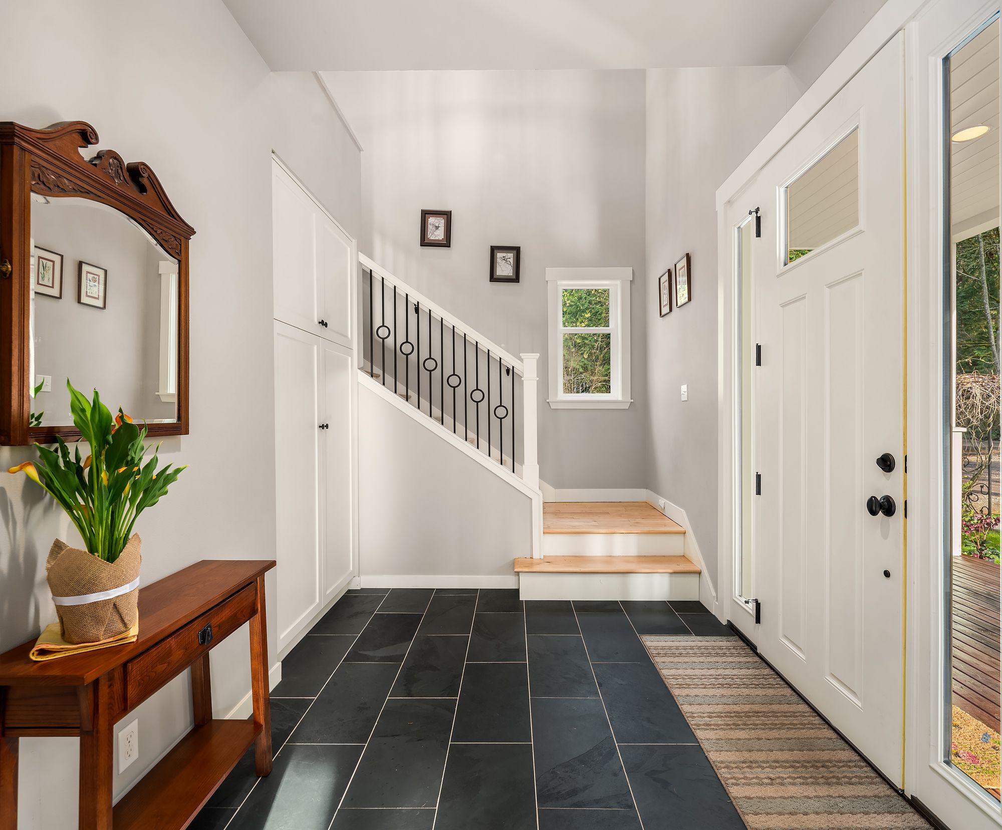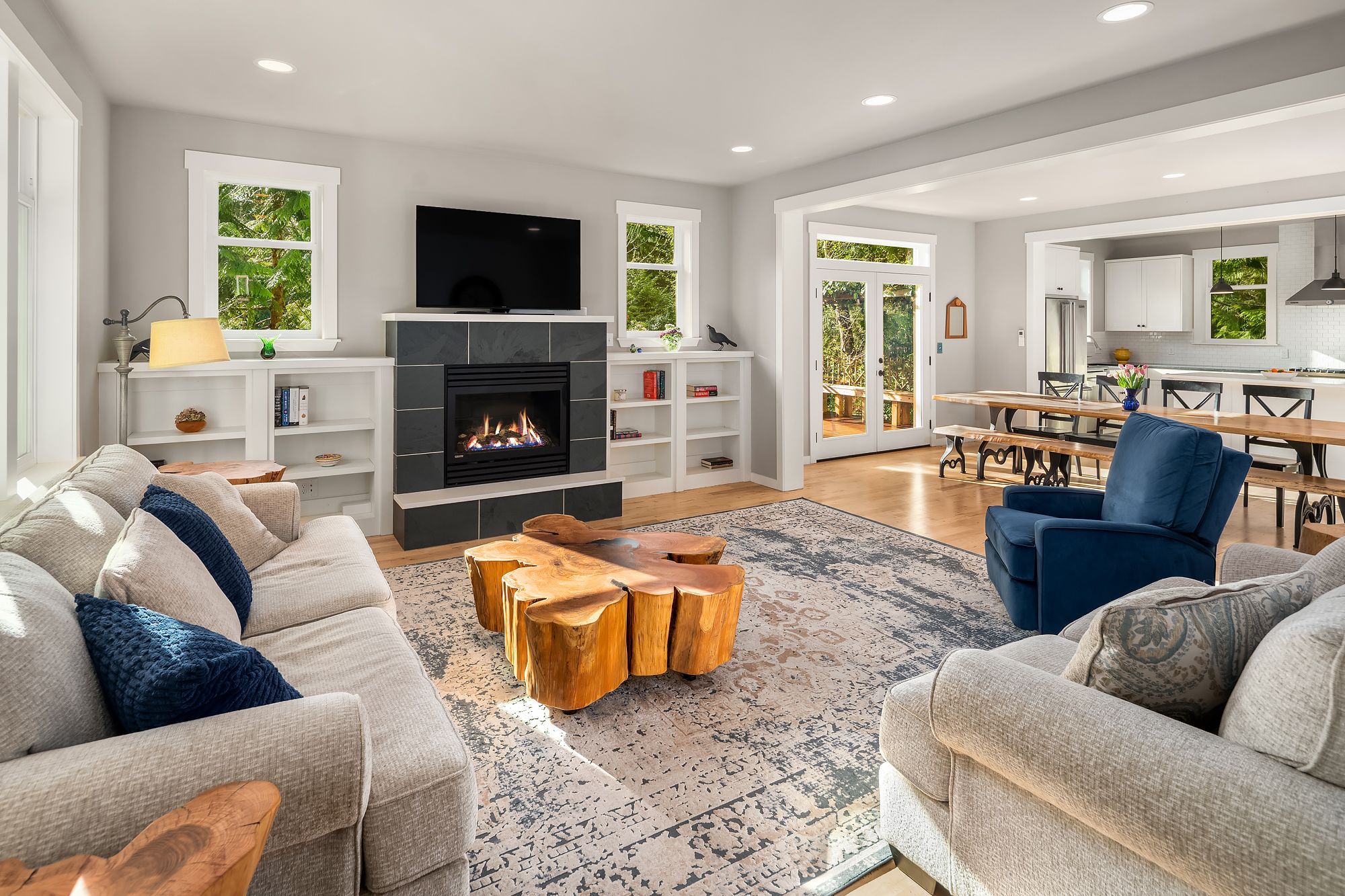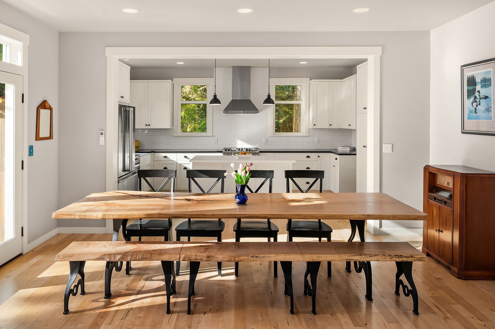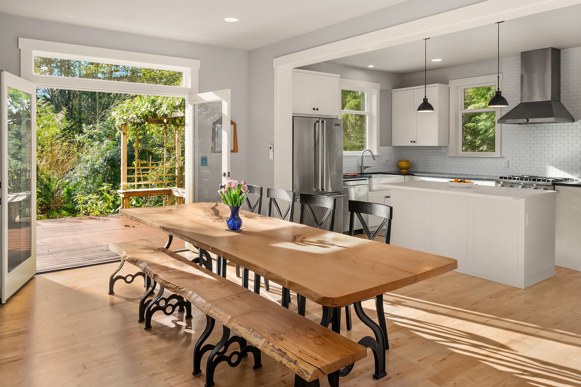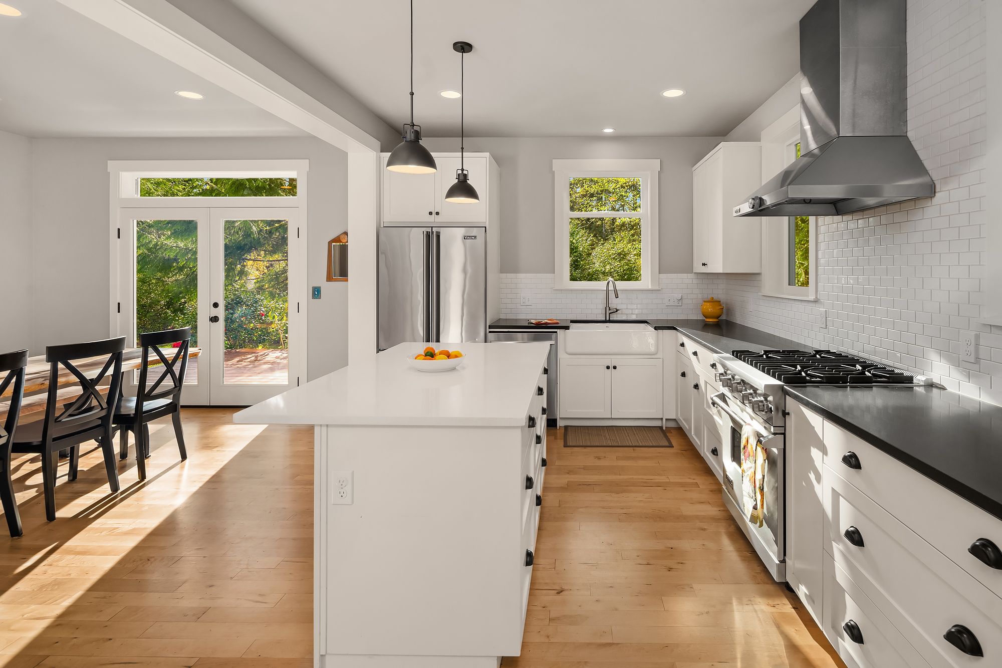 Beautiful, elegant, light filled modern Craftsman home on a sunny, level, landscaped .6 acre lot, close to Winslow. Outstanding, flowing floor plan, with hardwood floors throughout the main level. Chef's kitchen with quartz counters, stainless appliances, excellent work surfaces and storage. Charming living room with fireplace and large front windows, dining area with French doors to the patio. Main floor family room, & a large office with a separate entrance. Luxurious principal bedroom suite features marble counters, free-standing tub, and generous walk-in closet. 2 additional bedrooms with walk-in closets upstairs and another full bathroom. Radiant floor heating in bathrooms, efficient mini splits for heating and cooling. Outside there is a lovely mature garden, with plenty of space for vegetables, flowers, an orchard, or a play space. Dead end street, quiet and secluded. This is a wonderful home!