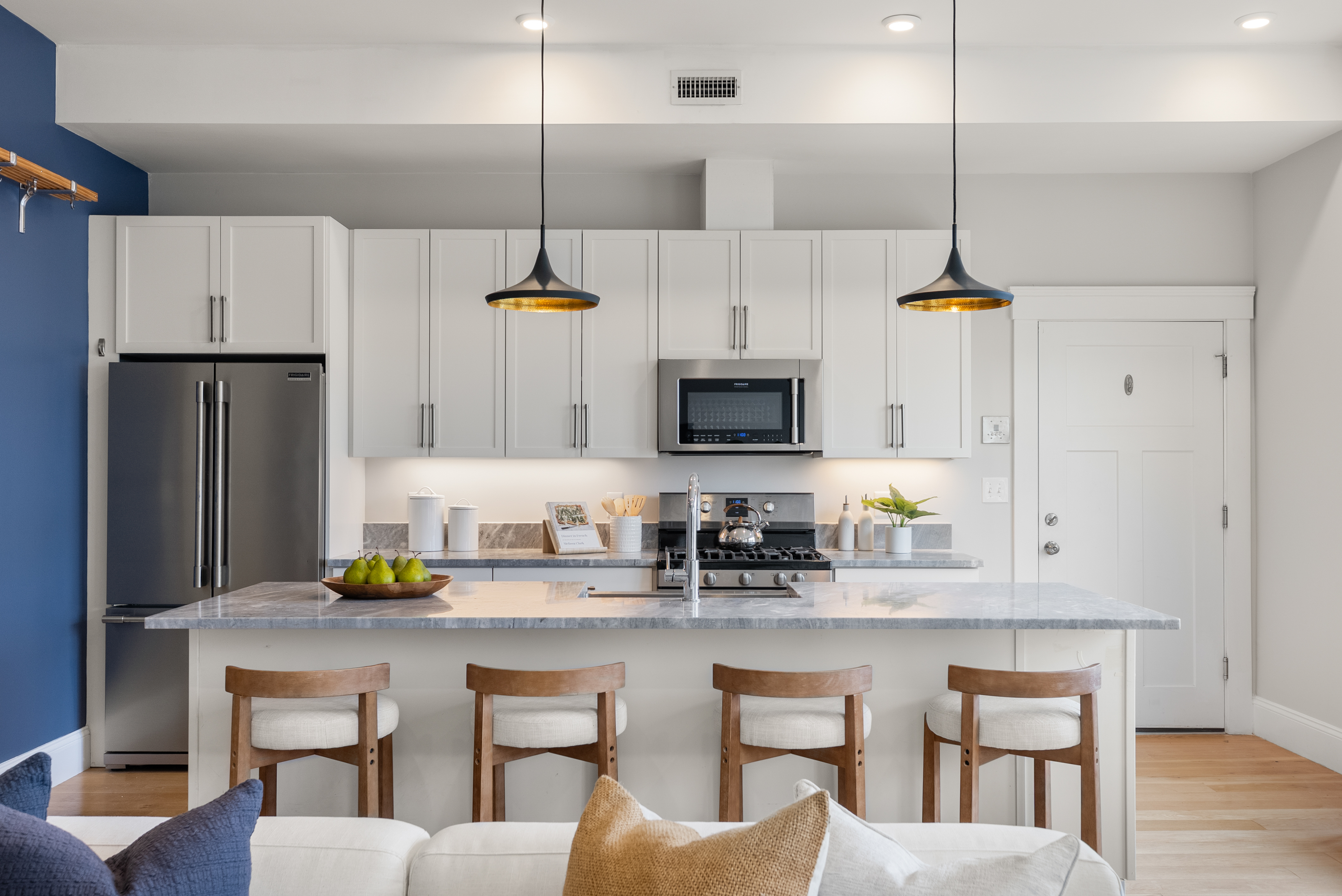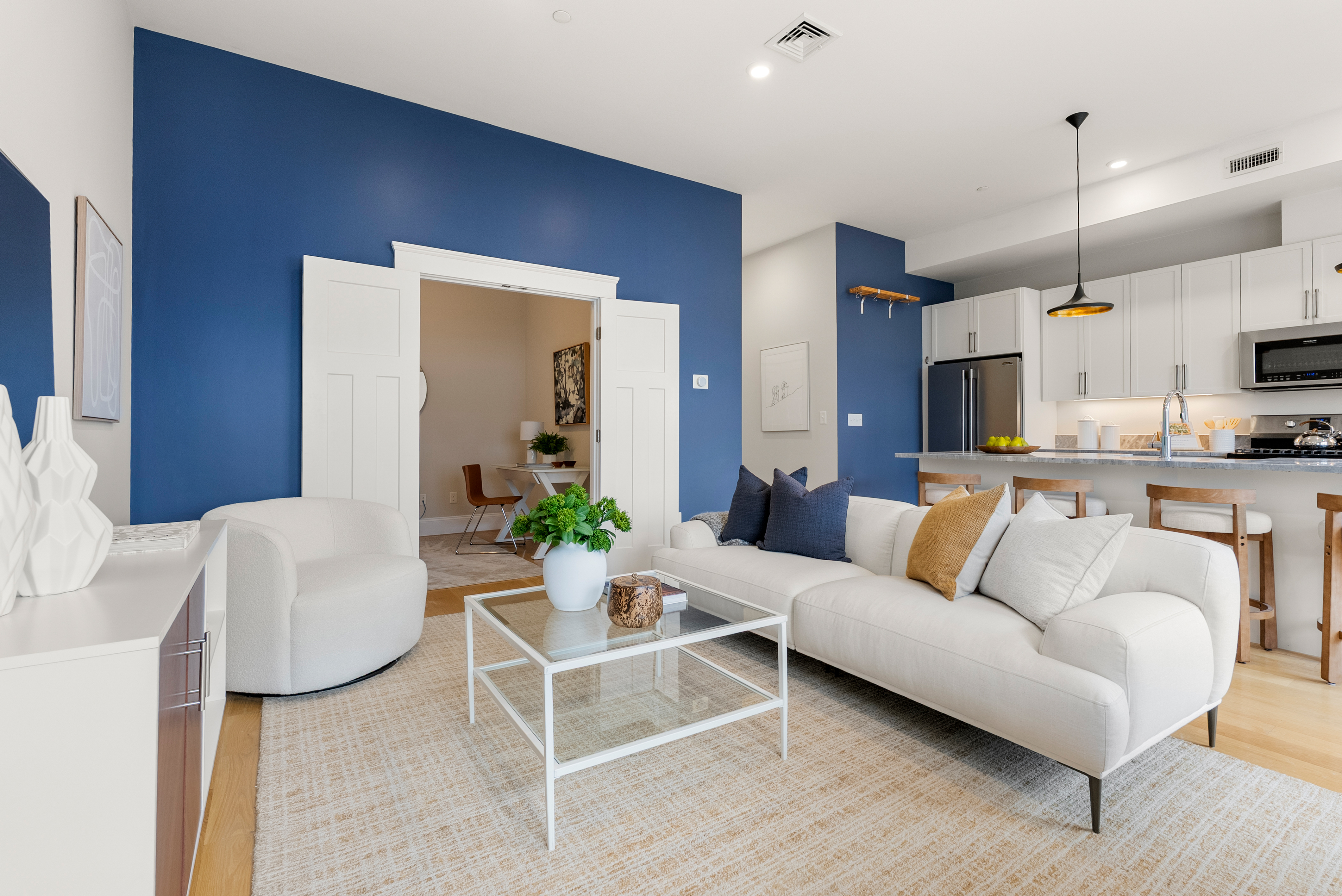 This stylish 2015 residence is part of a nine-unit association located within a mile to Porter and Union Squares. Perched high above Somerville Avenue, the unit offers a flexible layout in the main living area, plus an office/guestroom. Ten foot ceilings, bountiful light and gorgeous sunsets lend a dramatic flair to the living, dining and kitchen areas, while the large island and gas range make week night cooking and entertaining equally special and fun. The luxurious primary suite features French doors to a balcony, a walk-in closet with custom shelves, and a marble clad bathroom. The second bathroom has a tub. Ample closet space, hardwood floors, gas-fired HVAC, Navien tankless water heater, in-unit laundry set in the rear entrance hall, and one covered parking space with an EV charger all add to this unit’s convenience. Close to Harvard and Lesley Universities, top restaurants, music venues, shopping and quick access to the Red and Green Lines.