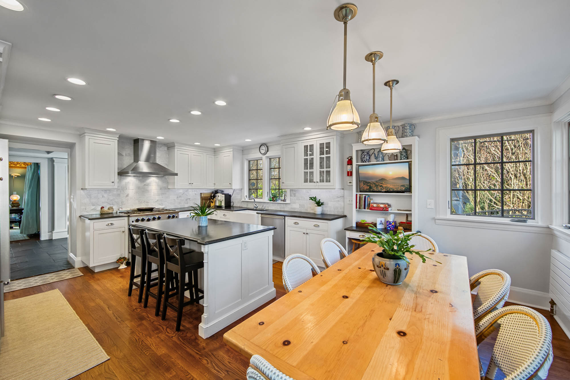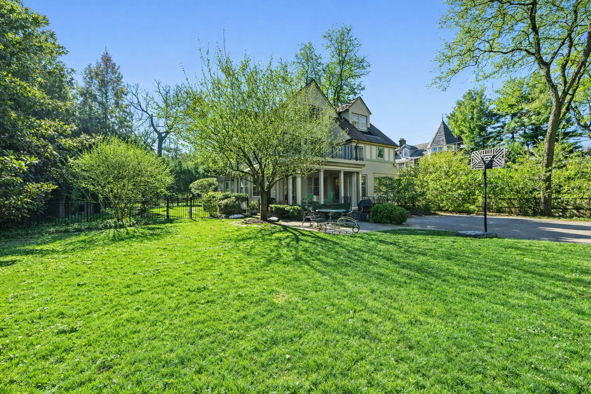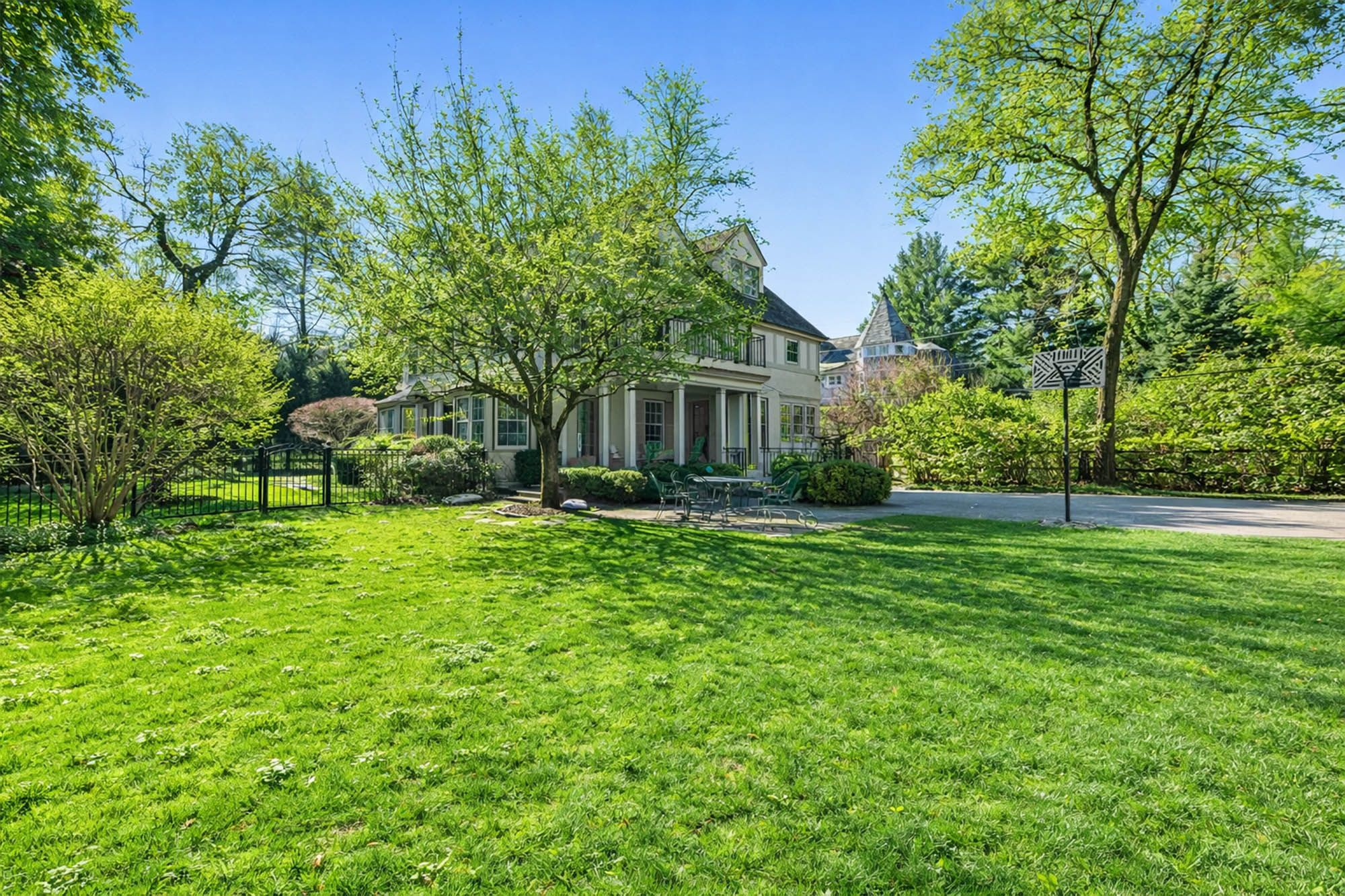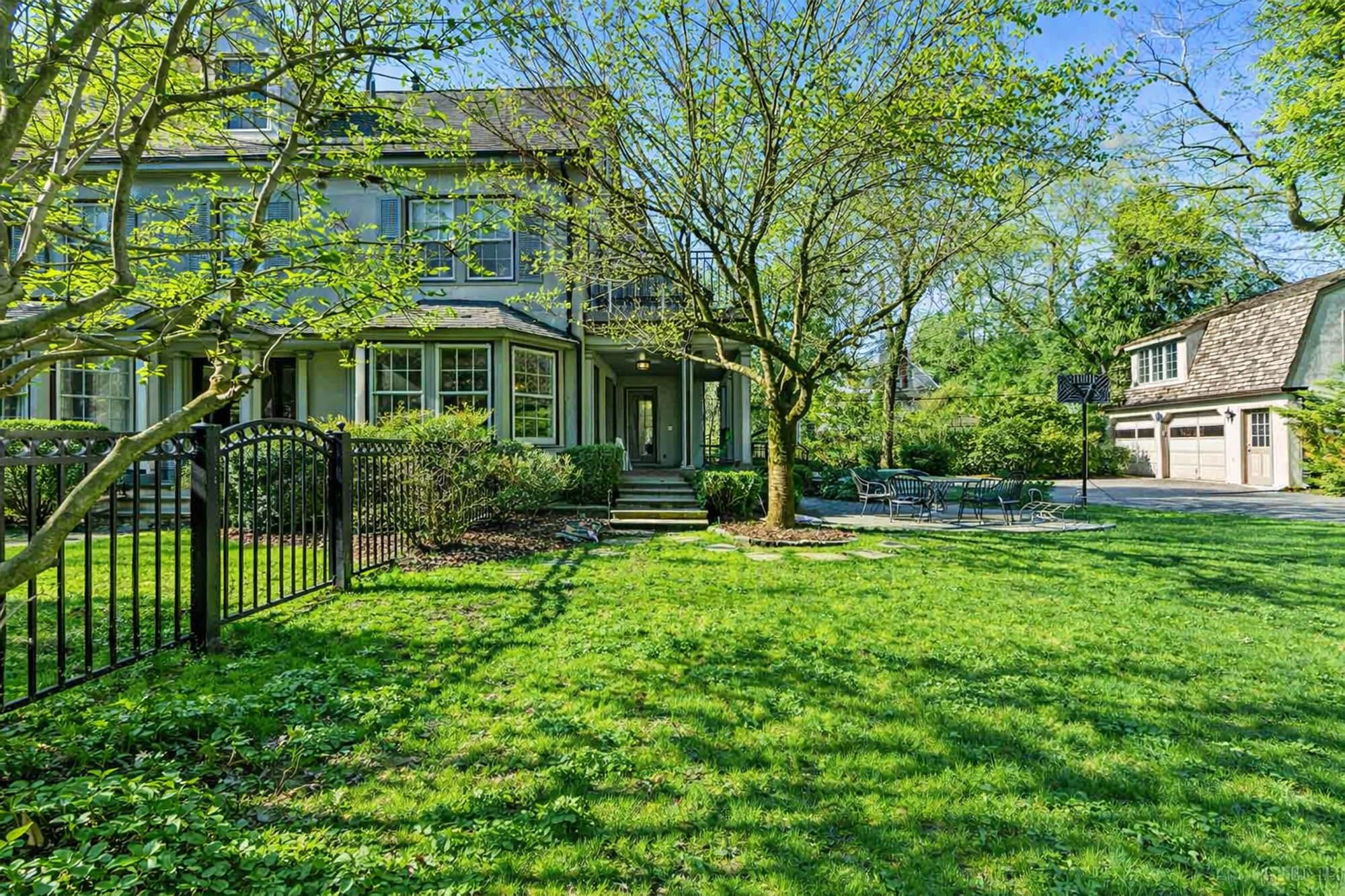 Charming Arts & Crafts–inspired Center Hall Colonial featuring 5 bedrooms and 3.5 baths on beautifully landscaped property with a large fenced backyard. The first floor offers a gracious foyer, formal dining room, living room with working fireplace, and a sunlit, fully renovated kitchen with top-of-the-line appliances—perfect for entertaining. The second floor includes a primary suite with a full bath and two large walk-in closets, an additional bedroom and a full bath, plus an office and laundry. The third floor features three bedrooms, a full bath, and ample storage. Built-ins on the first and third floors add character throughout. Enjoy lovely front and rear porches, a Belgian block driveway, and a detached two-car garage with an artist studio above. Conveniently located near shops, restaurants, transportation, and houses of worship in Englewood, New Jersey.