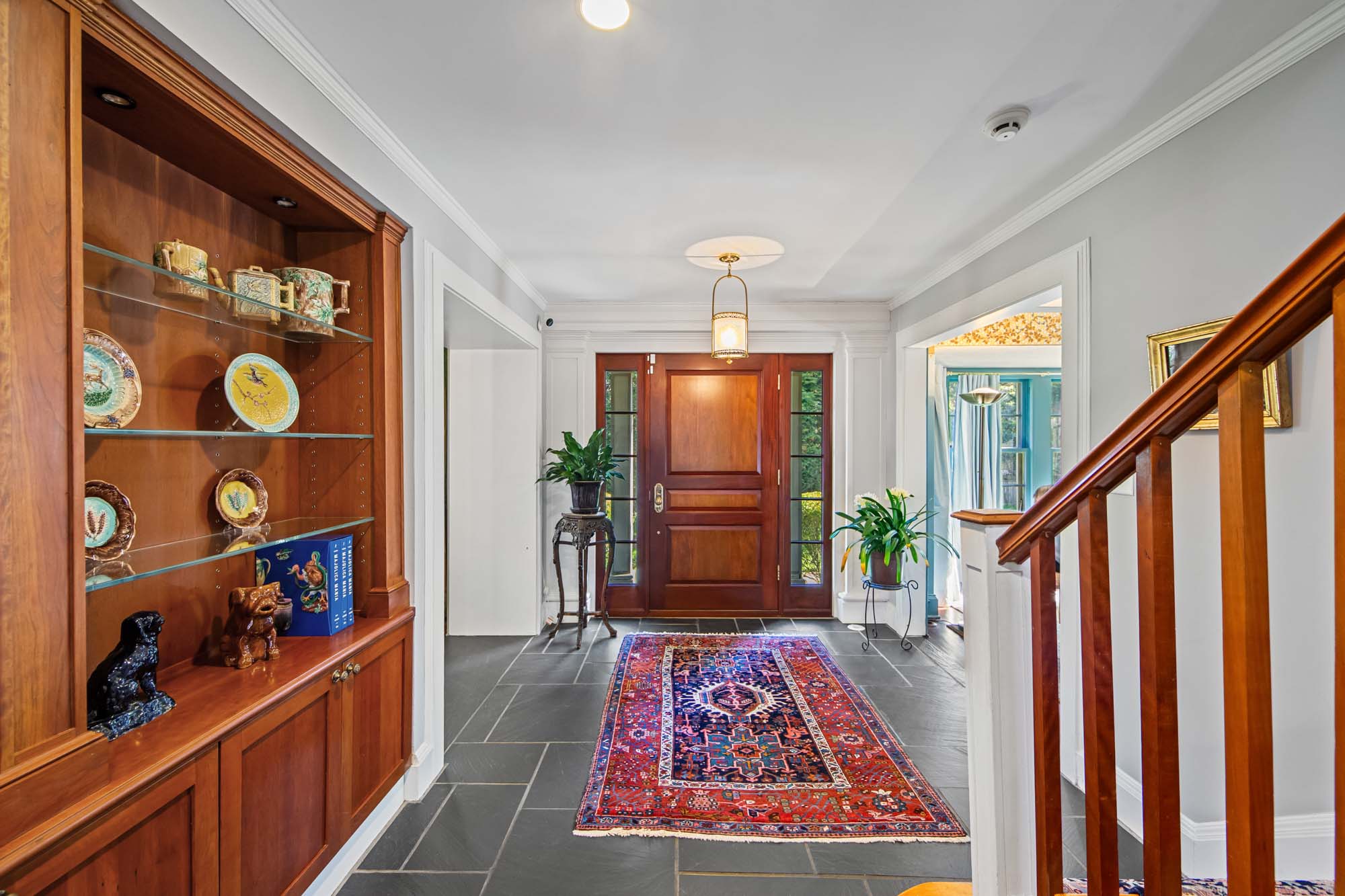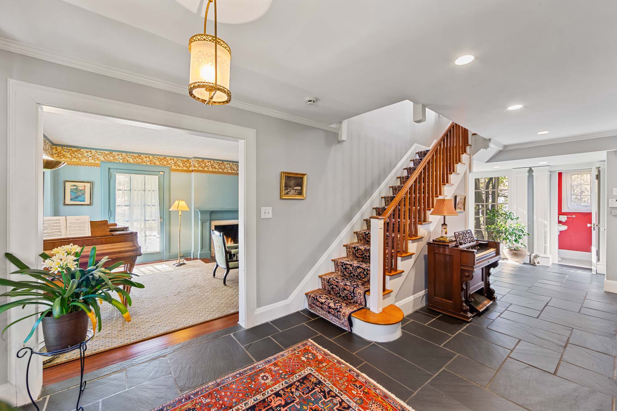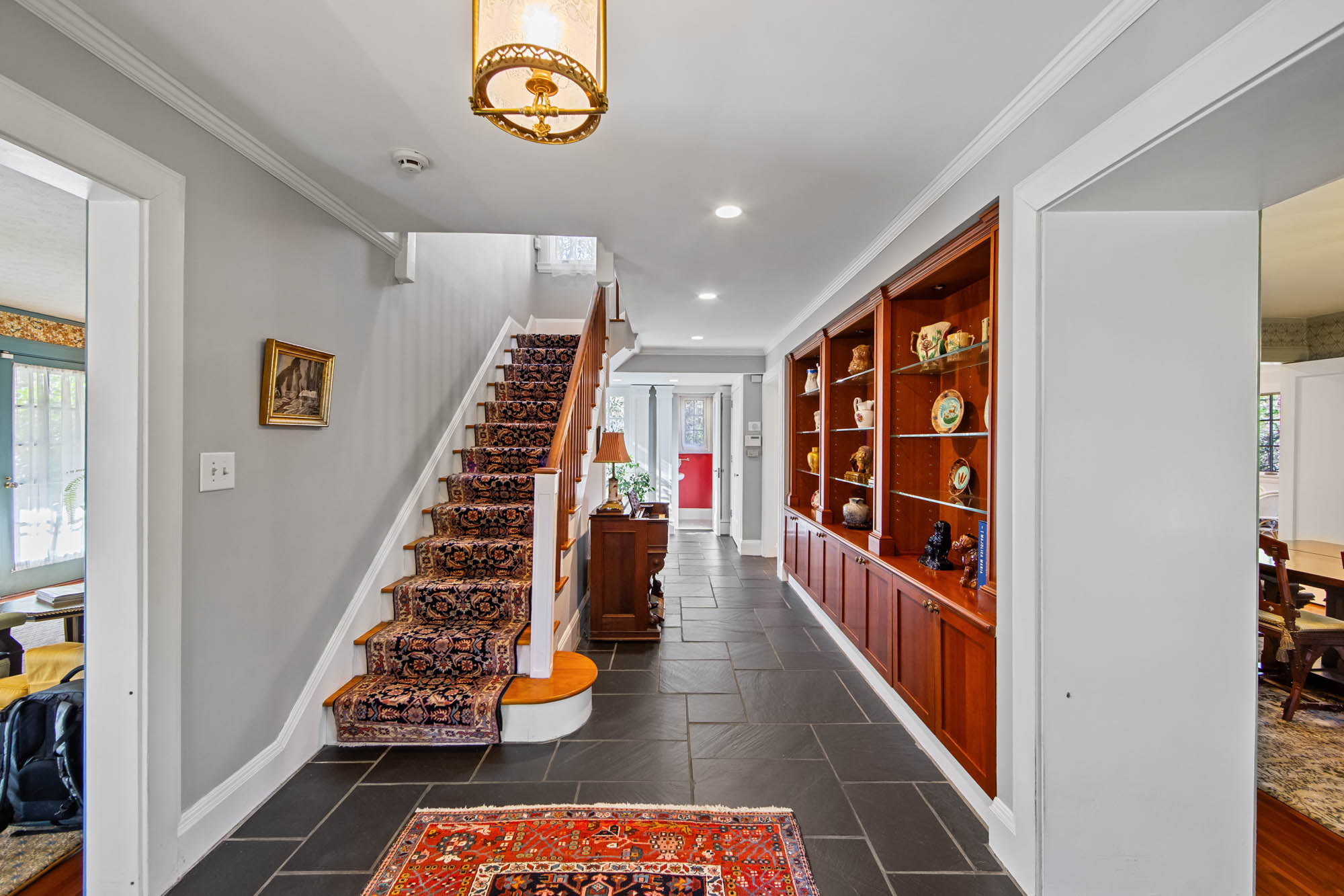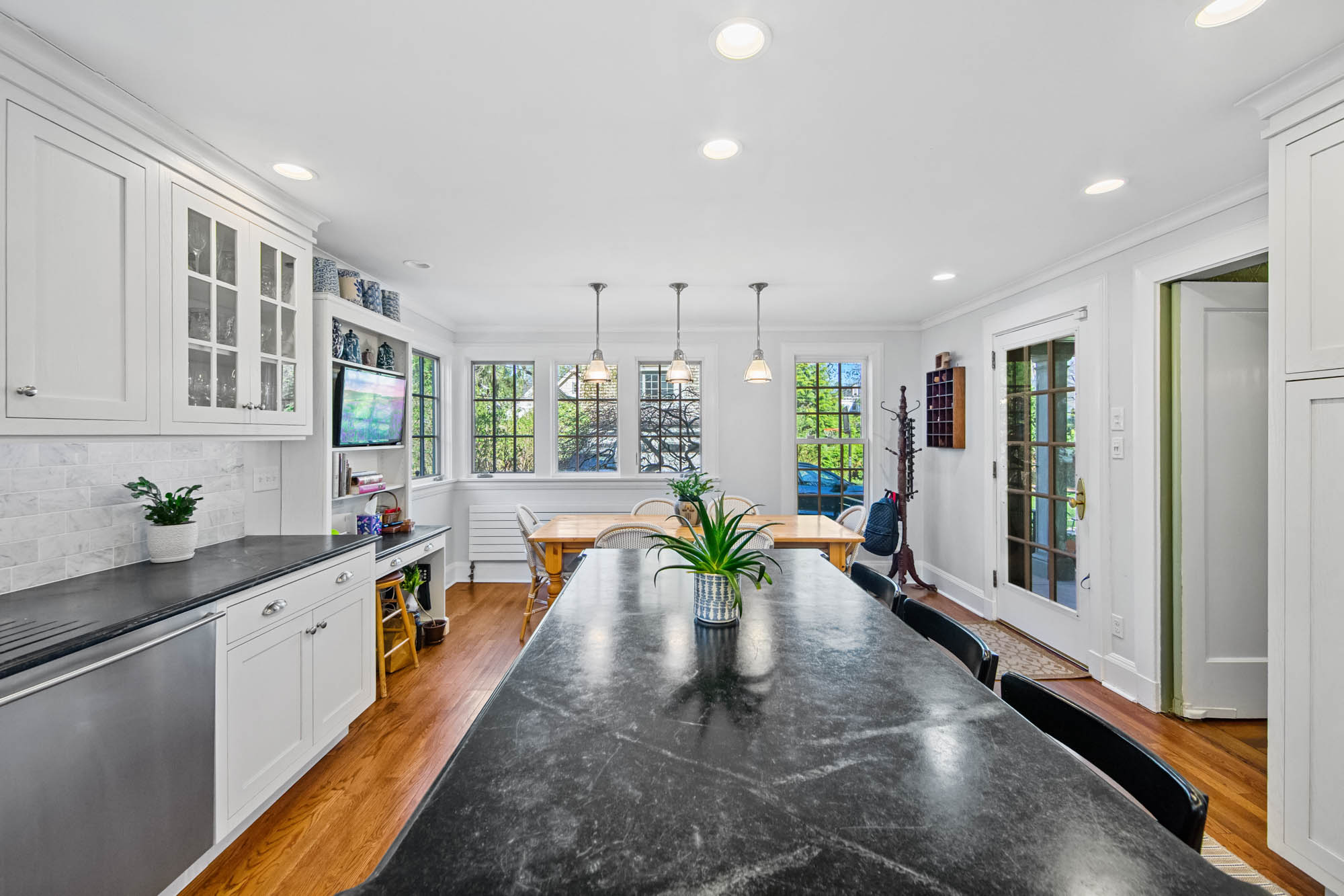 Charming Arts & Crafts–inspired Center Hall Colonial featuring 5 bedrooms and 3.5 baths on beautifully landscaped property with a large fenced backyard. The first floor offers a gracious foyer, formal dining room, living room with working fireplace, and a sunlit, fully renovated kitchen with top-of-the-line appliances—perfect for entertaining. The second floor includes a primary suite with a full bath and two large walk-in closets, an additional bedroom and a full bath, plus an office and laundry. The third floor features three bedrooms, a full bath, and ample storage. Built-ins on the first and third floors add character throughout. Enjoy lovely front and rear porches, a Belgian block driveway, and a detached two-car garage with an artist studio above. Conveniently located near shops, restaurants, transportation, and houses of worship in Englewood, New Jersey.