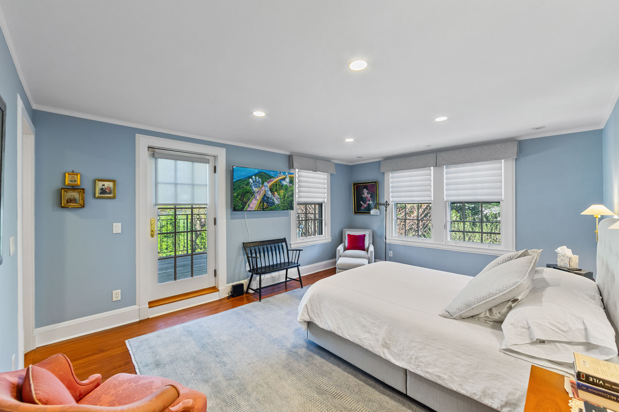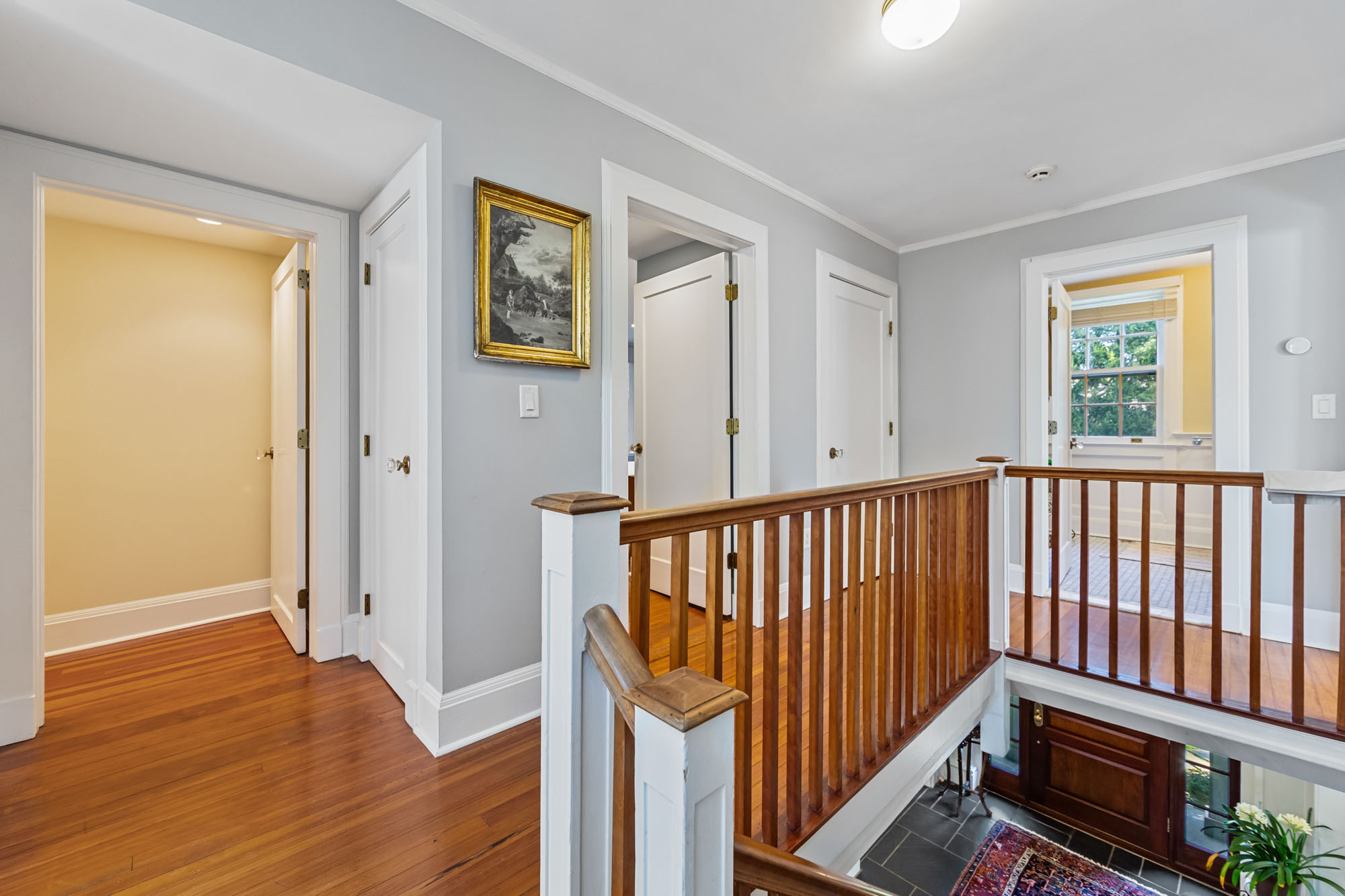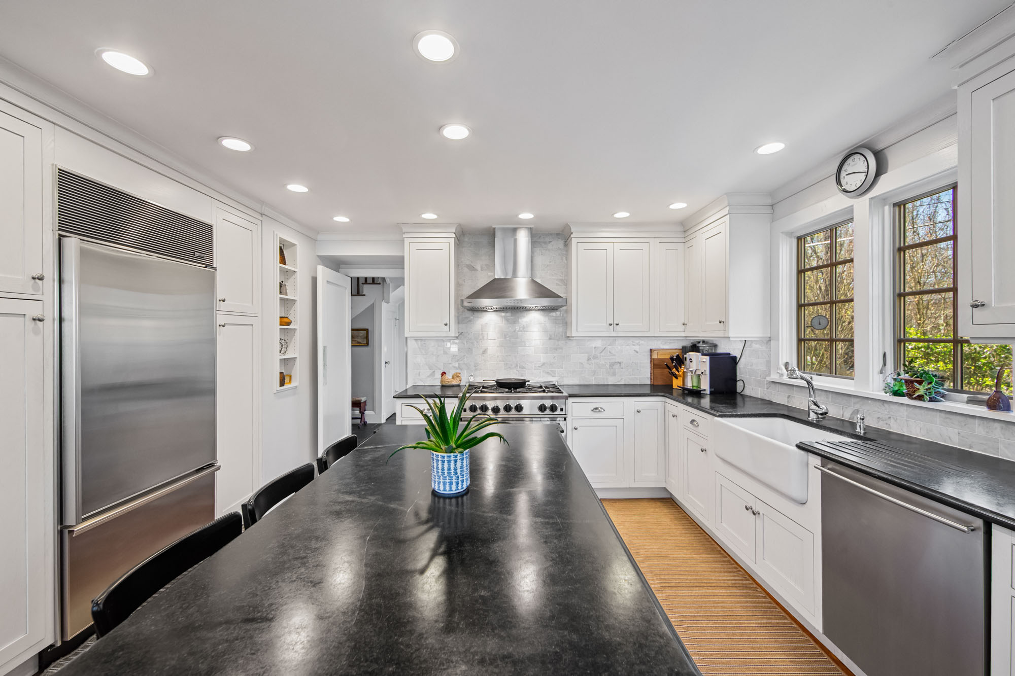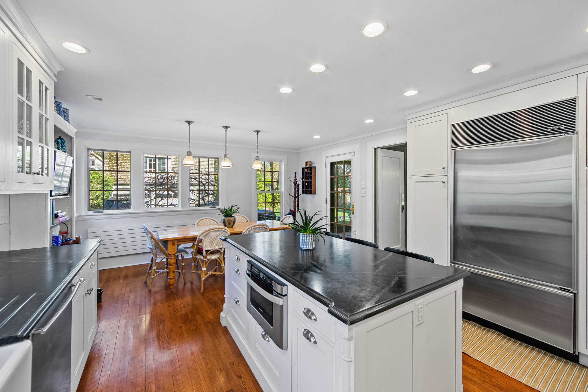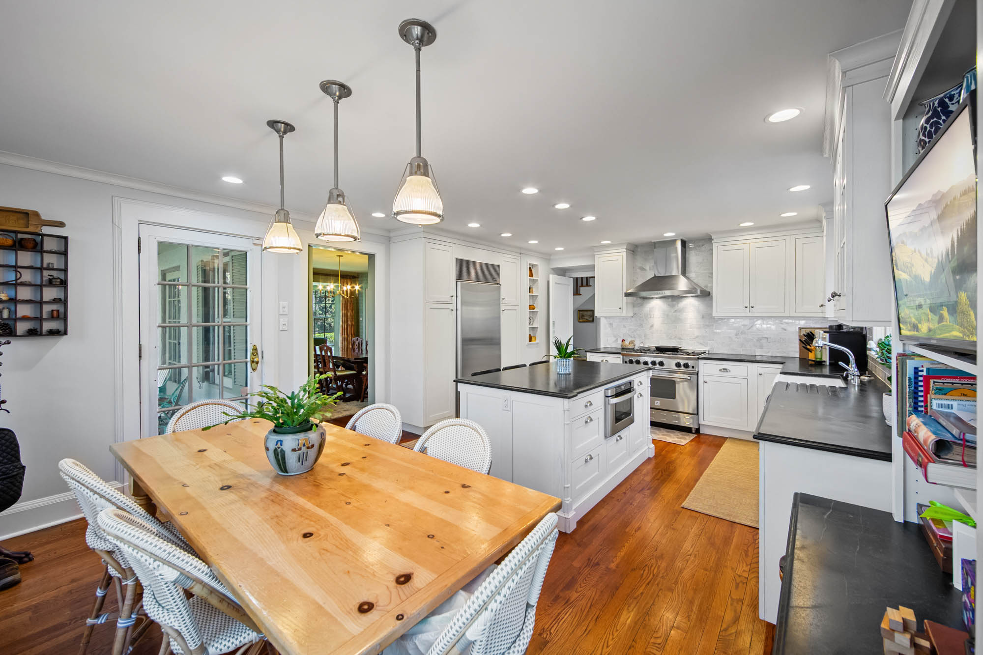 Charming Arts & Crafts–inspired Center Hall Colonial featuring 5 bedrooms and 3.5 baths on beautifully landscaped property with a large fenced backyard. The first floor offers a gracious foyer, formal dining room, living room with working fireplace, and a sunlit, fully renovated kitchen with top-of-the-line appliances—perfect for entertaining. The second floor includes a primary suite with a full bath and two large walk-in closets, an additional bedroom and a full bath, plus an office and laundry. The third floor features three bedrooms, a full bath, and ample storage. Built-ins on the first and third floors add character throughout. Enjoy lovely front and rear porches, a Belgian block driveway, and a detached two-car garage with an artist studio above. Conveniently located near shops, restaurants, transportation, and houses of worship in Englewood, New Jersey.