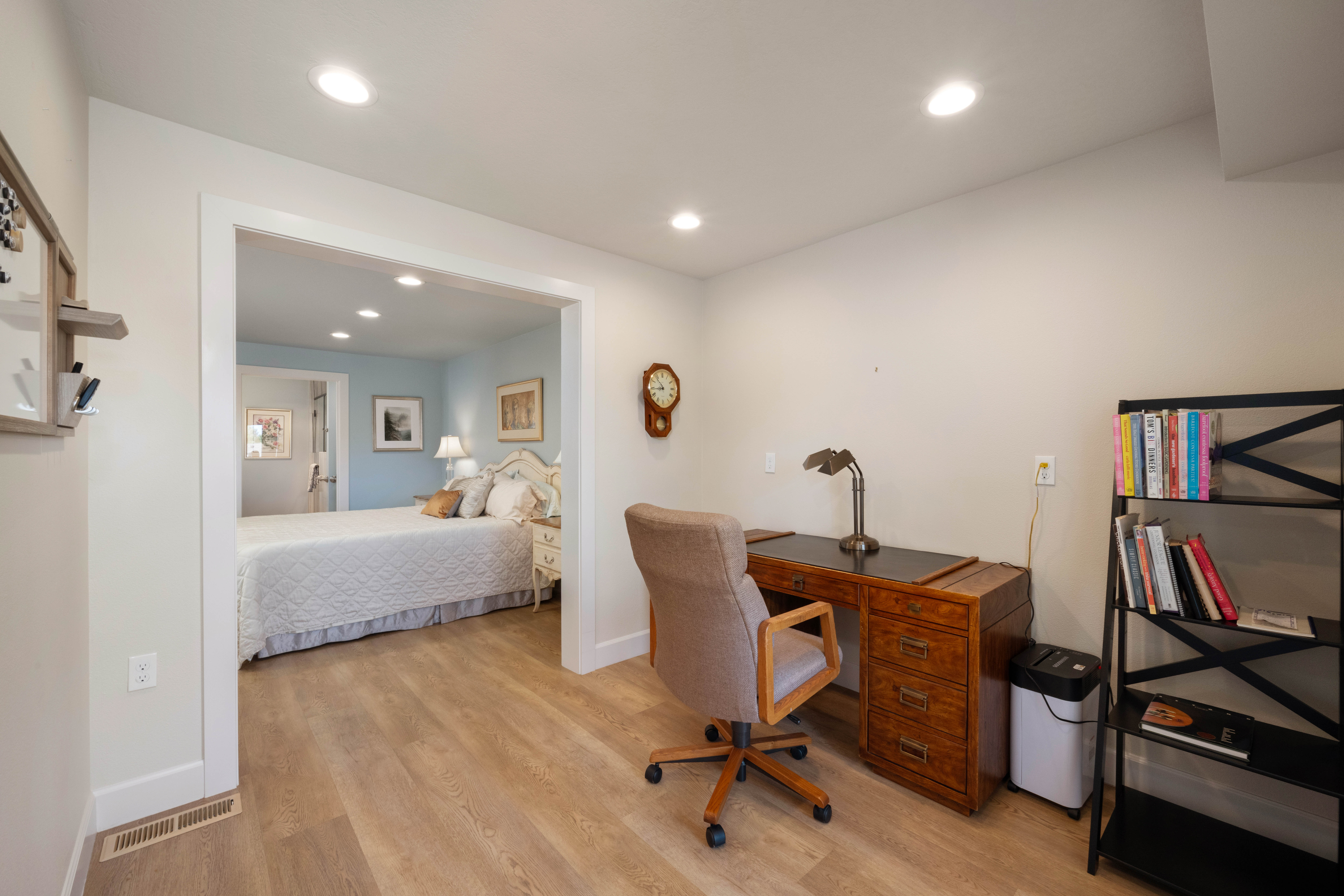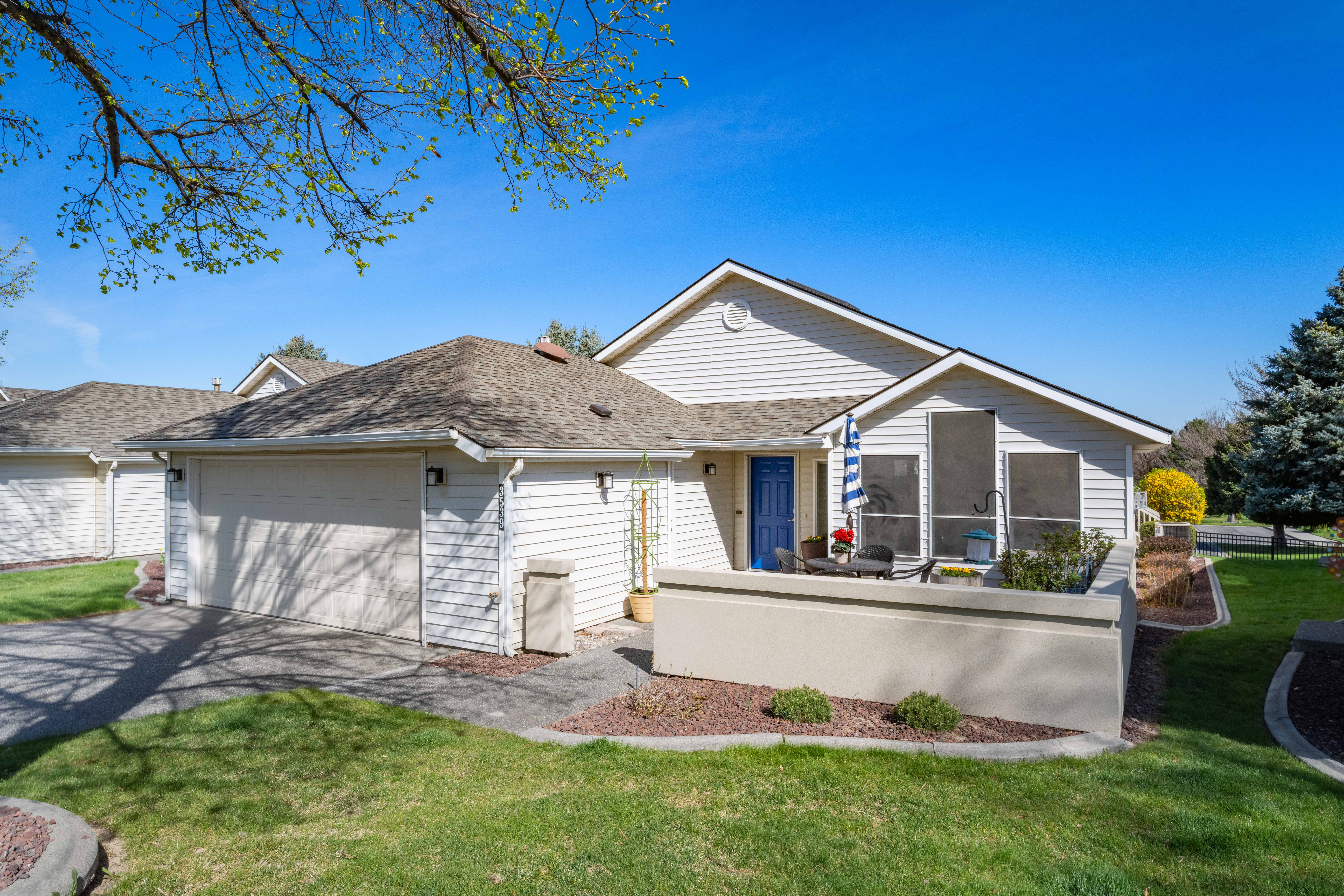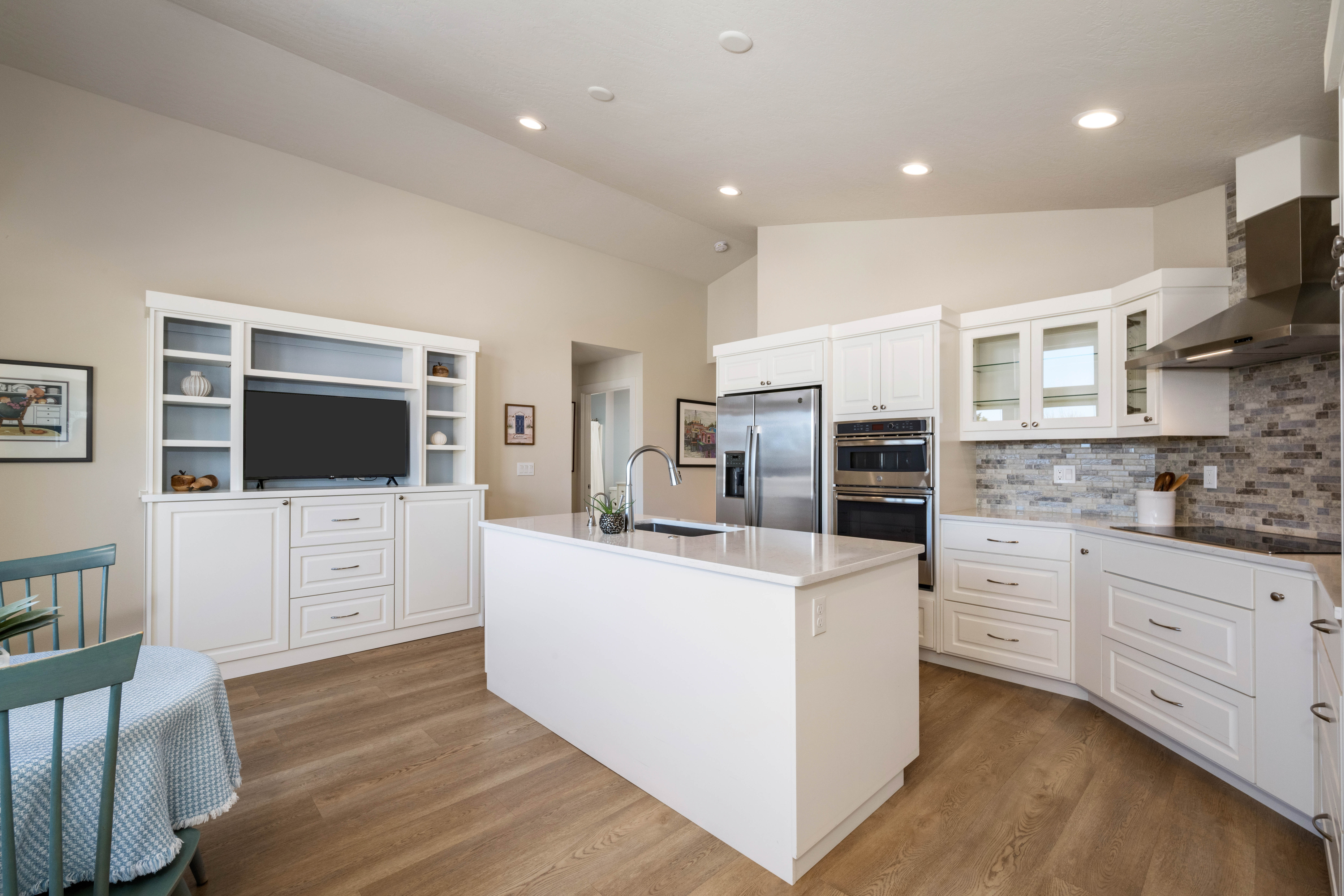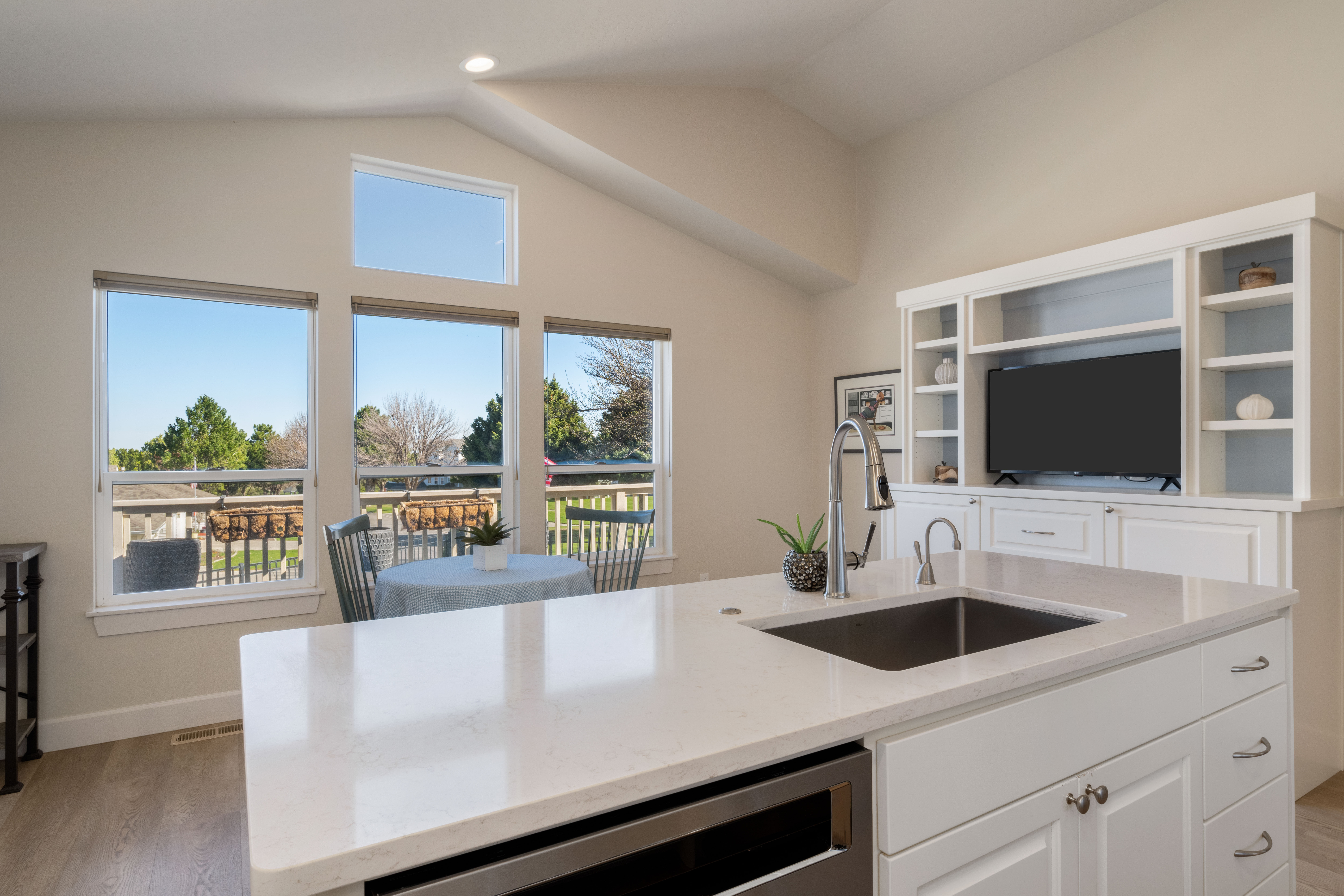 Welcome to easy, elevated living in this beautifully remodeled home located in a desirable 55+ community. Thoughtfully updated throughout by AR Feser, every detail has been carefully curated for both style and function. Step inside to find wood laminate flooring flowing seamlessly throughout, complemented by gorgeous quartz countertops and all-new cabinetry across the entire home. The kitchen shines with a classic tile backsplash and updated stainless steel appliances. The spacious kitchen is not only stylish but also functional, offering room for a small table and chairs or a comfortable sitting area. A built-in feature provides the perfect space for TV, books or display-making it an inviting hub of the home. Both bathrooms feature unique designer touches—including a creative blue tile backsplash in the guest bath and a striking blend of turquoise and gray in the primary suite. The spacious primary bathroom offers a walk-in tile shower, and a striking blend of turquoise and gray tile backsplash. The primary suite includes a custom-organized walk-in closet, creating a true retreat. You’ll also appreciate the added convenience of built-in cabinetry and a bench in the laundry room, along with all new woodwork, baseboards, and doors throughout the home. Enjoy your morning coffee in the charming front courtyard—perfect for flowers and relaxing—or entertain on the large open deck just off the kitchen. This 2-bedroom, 2-bath home with a dedicated office also includes a 2-car garage with built-in cabinets and a water softener for added comfort and convenience. .Beautifully updated, thoughtfully designed, and move-in ready.