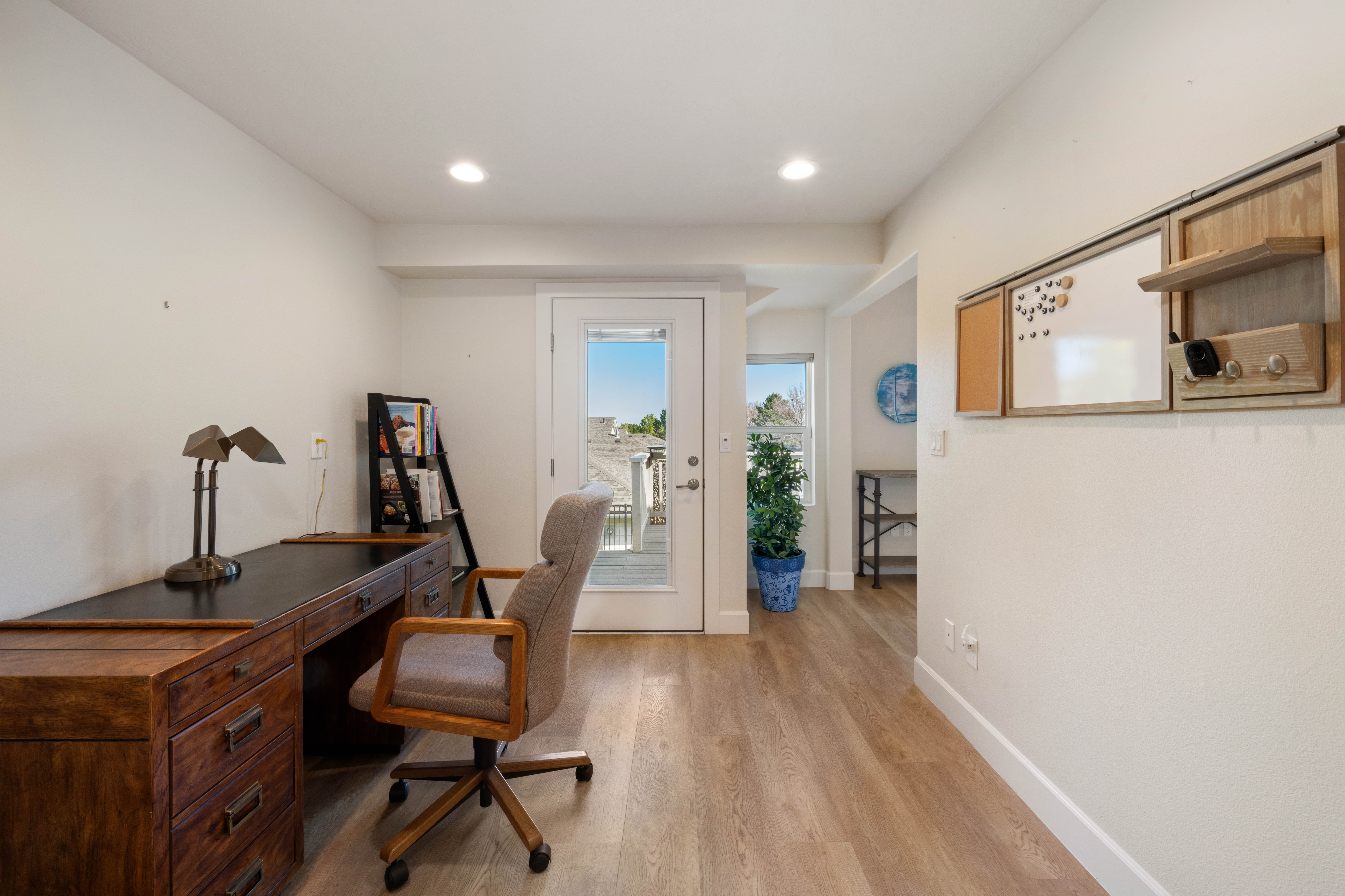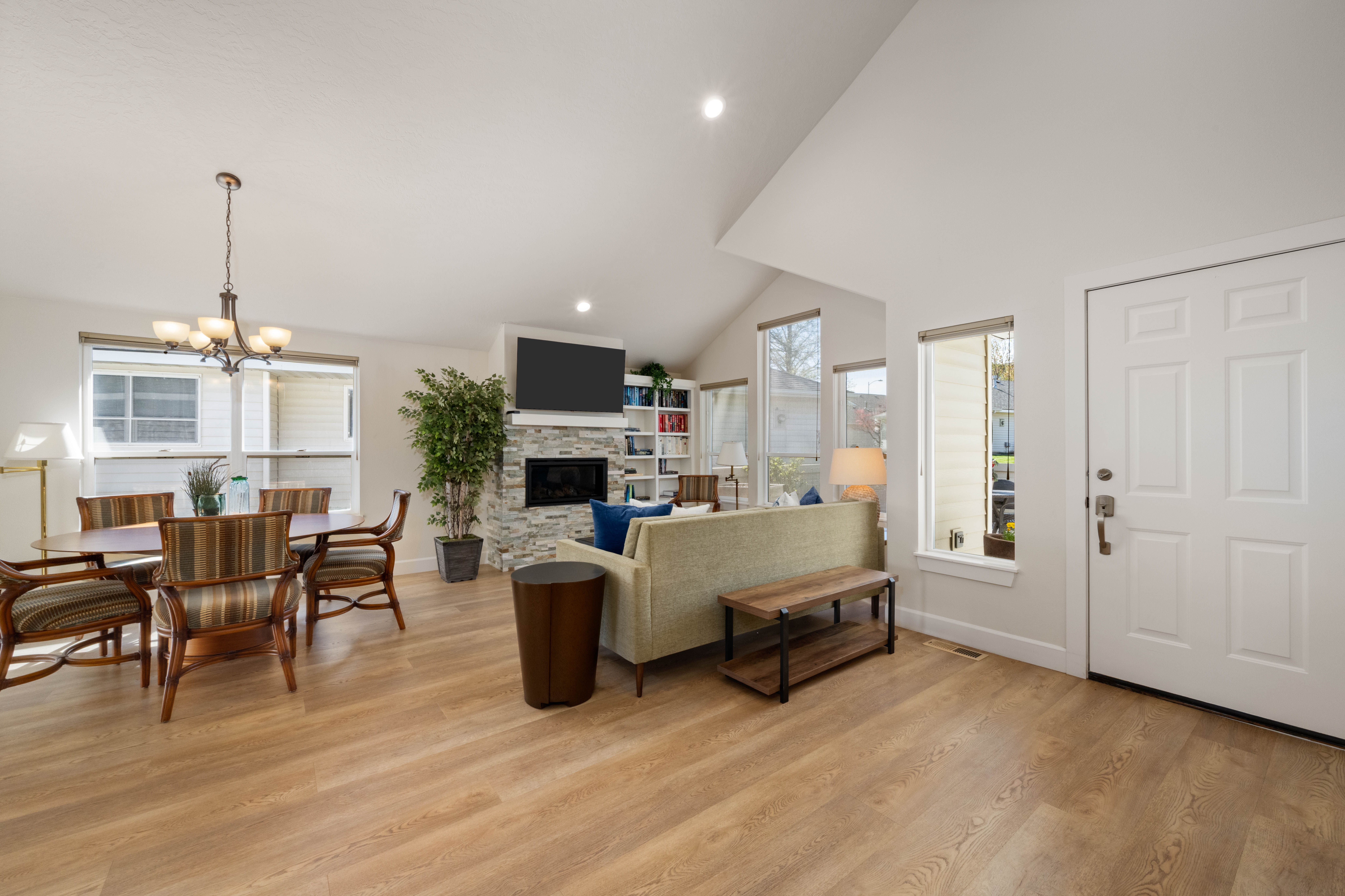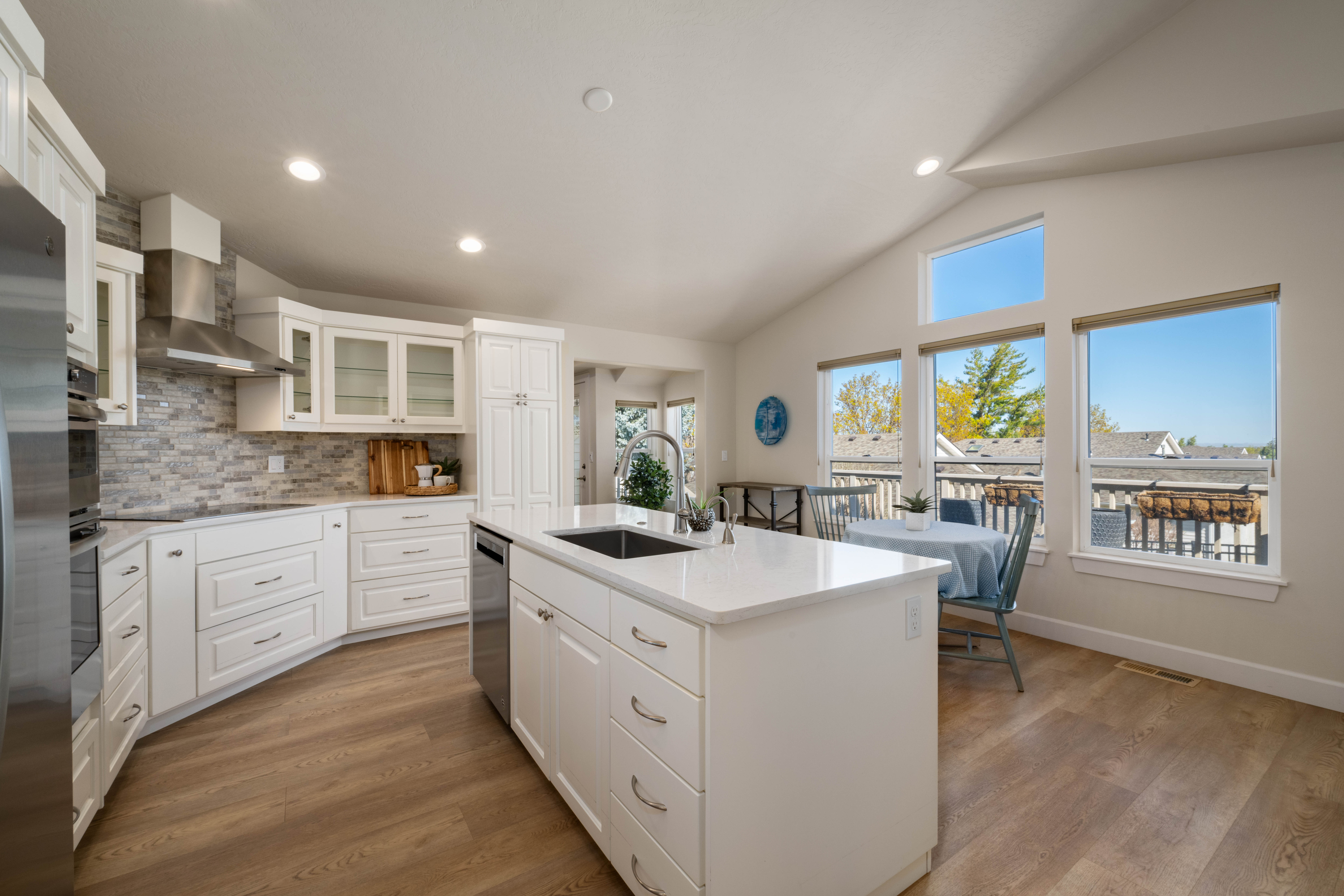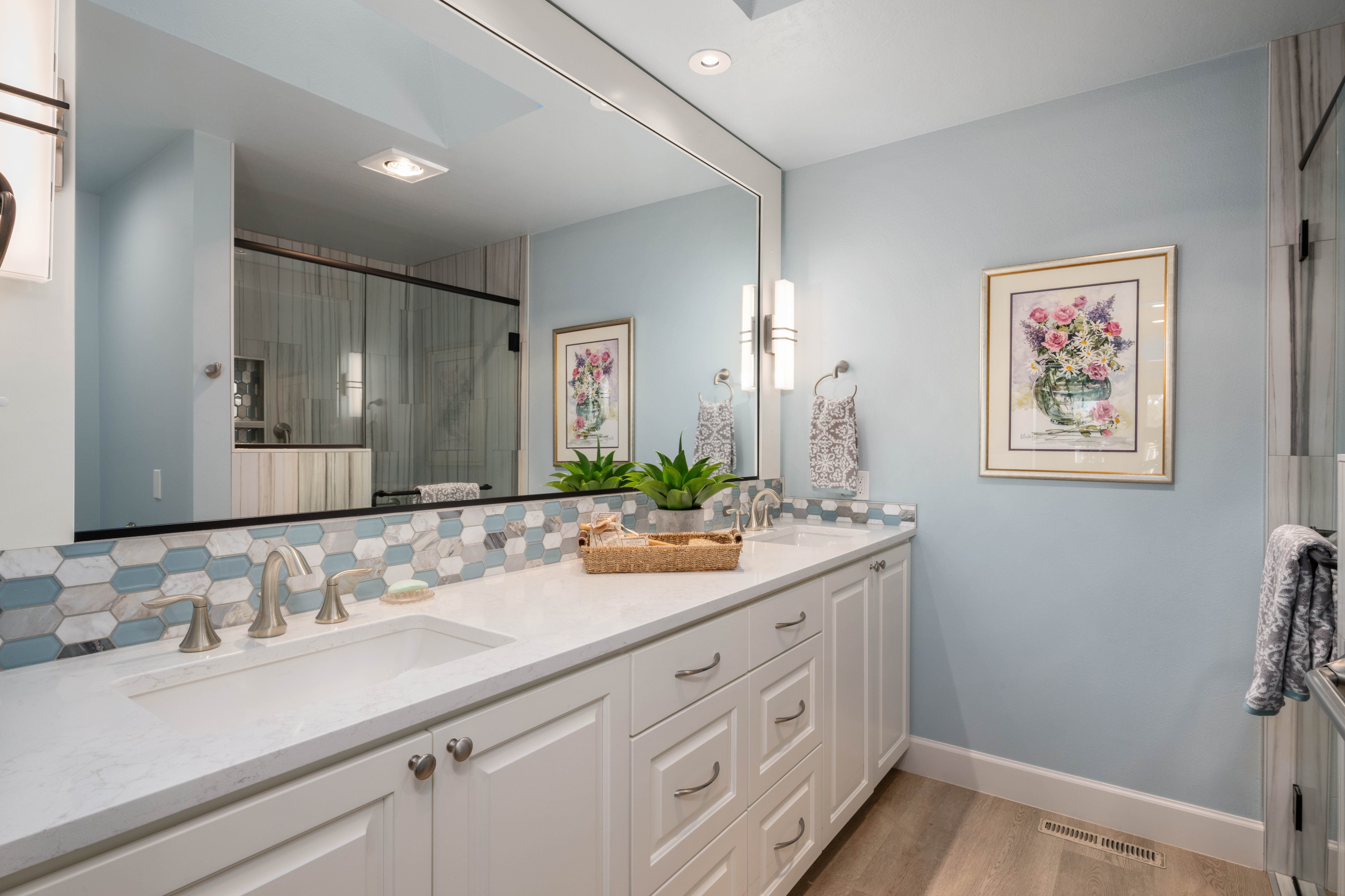 Welcome to easy, elevated living in this beautifully remodeled home located in a desirable 55+ community. Thoughtfully updated throughout by AR Feser, every detail has been carefully curated for both style and function. Step inside to find wood laminate flooring flowing seamlessly throughout, complemented by gorgeous quartz countertops and all-new cabinetry across the entire home. The kitchen shines with a classic tile backsplash and updated stainless steel appliances. The spacious kitchen is not only stylish but also functional, offering room for a small table and chairs or a comfortable sitting area. A built-in feature provides the perfect space for TV, books or display-making it an inviting hub of the home. Both bathrooms feature unique designer touches—including a creative blue tile backsplash in the guest bath and a striking blend of turquoise and gray in the primary suite. The spacious primary bathroom offers a walk-in tile shower, and a striking blend of turquoise and gray tile backsplash. The primary suite includes a custom-organized walk-in closet, creating a true retreat. You’ll also appreciate the added convenience of built-in cabinetry and a bench in the laundry room, along with all new woodwork, baseboards, and doors throughout the home. Enjoy your morning coffee in the charming front courtyard—perfect for flowers and relaxing—or entertain on the large open deck just off the kitchen. This 2-bedroom, 2-bath home with a dedicated office also includes a 2-car garage with built-in cabinets and a water softener for added comfort and convenience. .Beautifully updated, thoughtfully designed, and move-in ready.