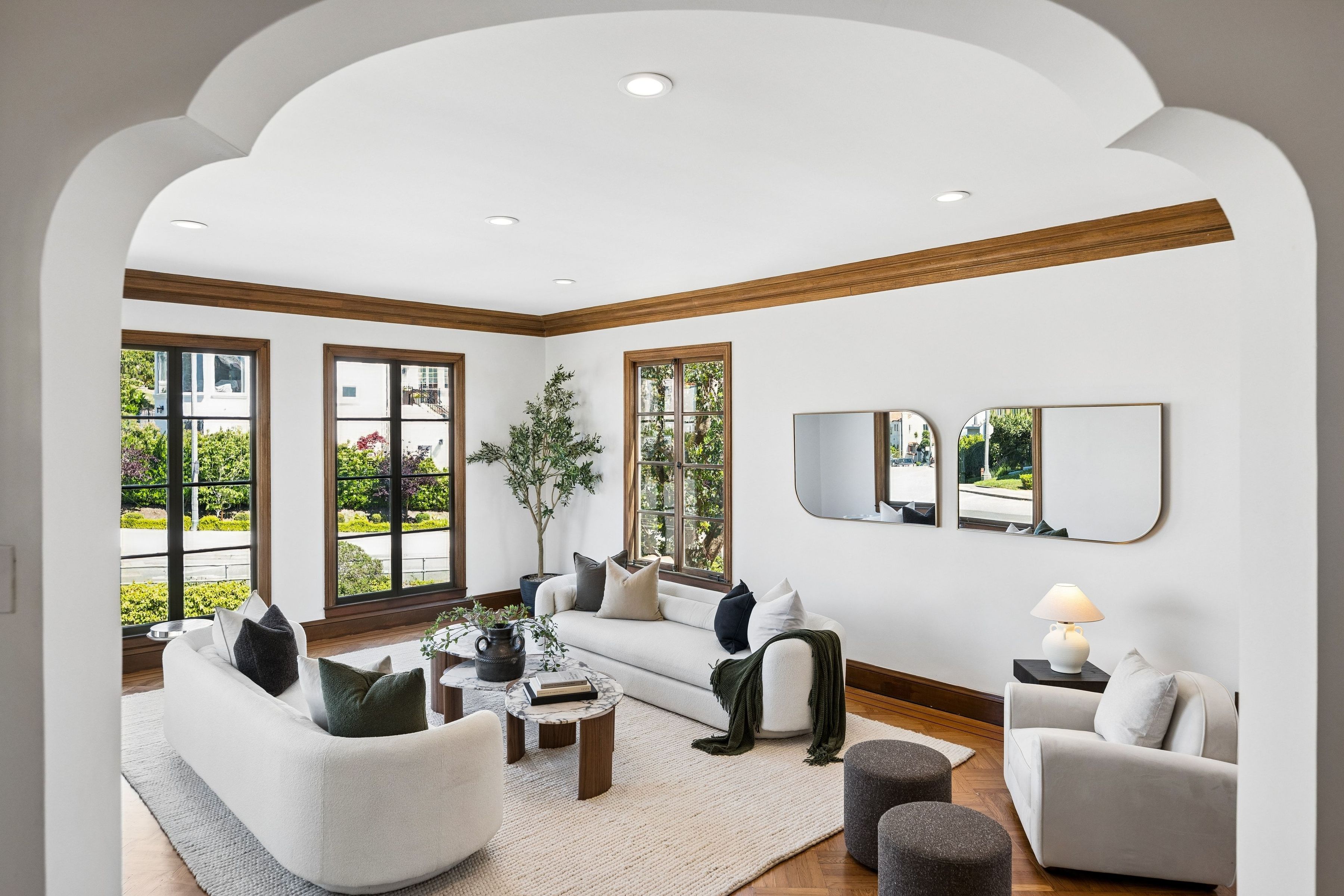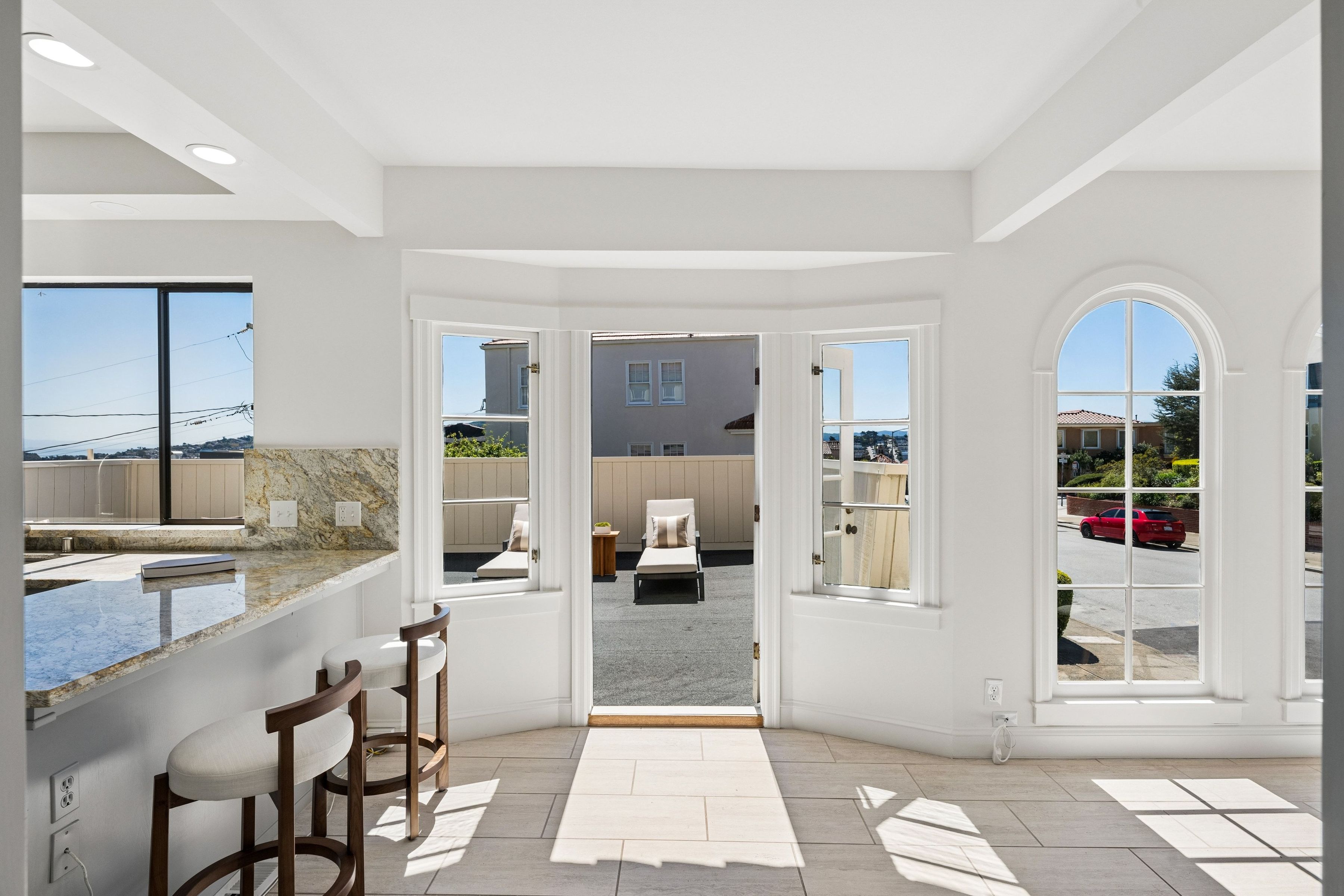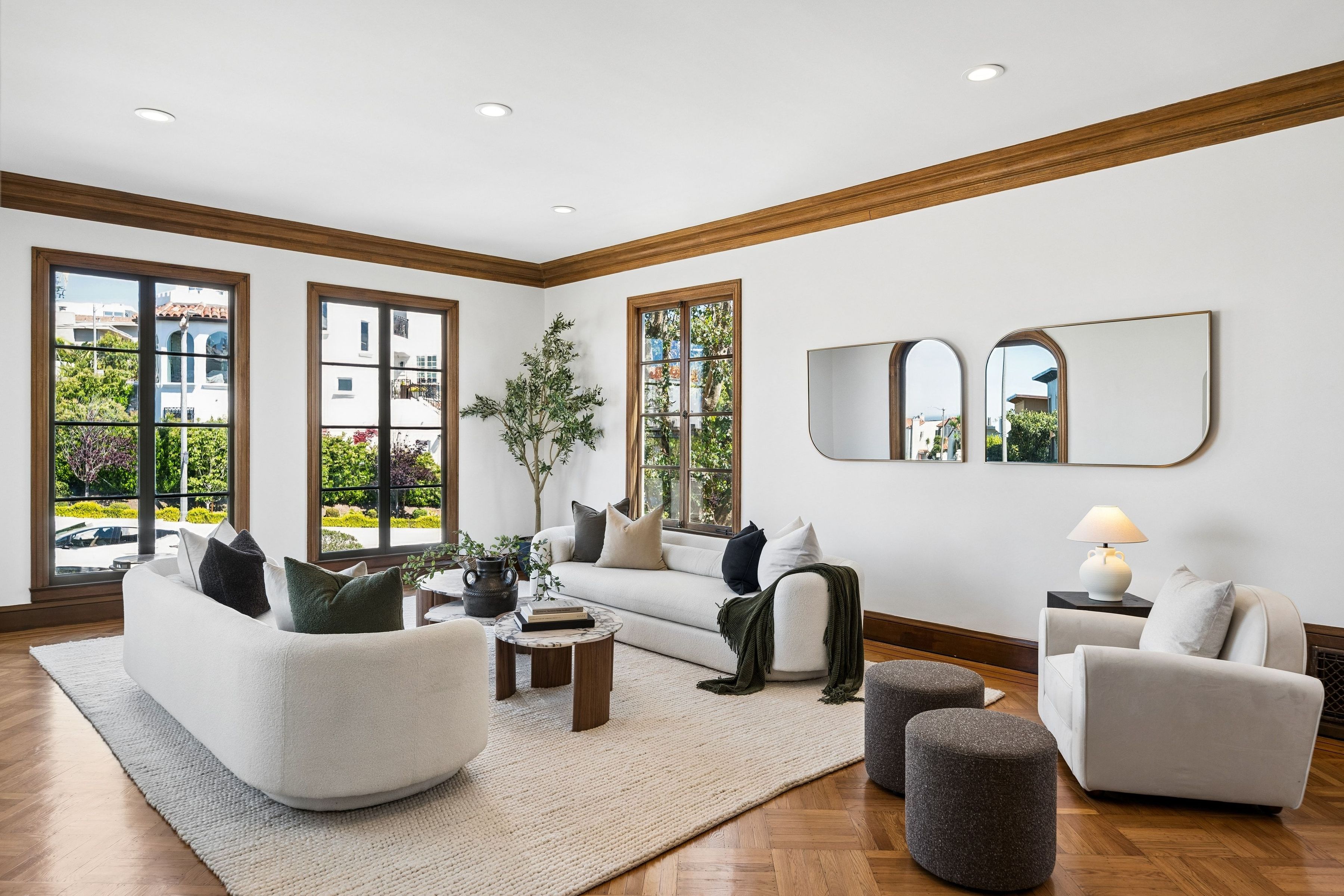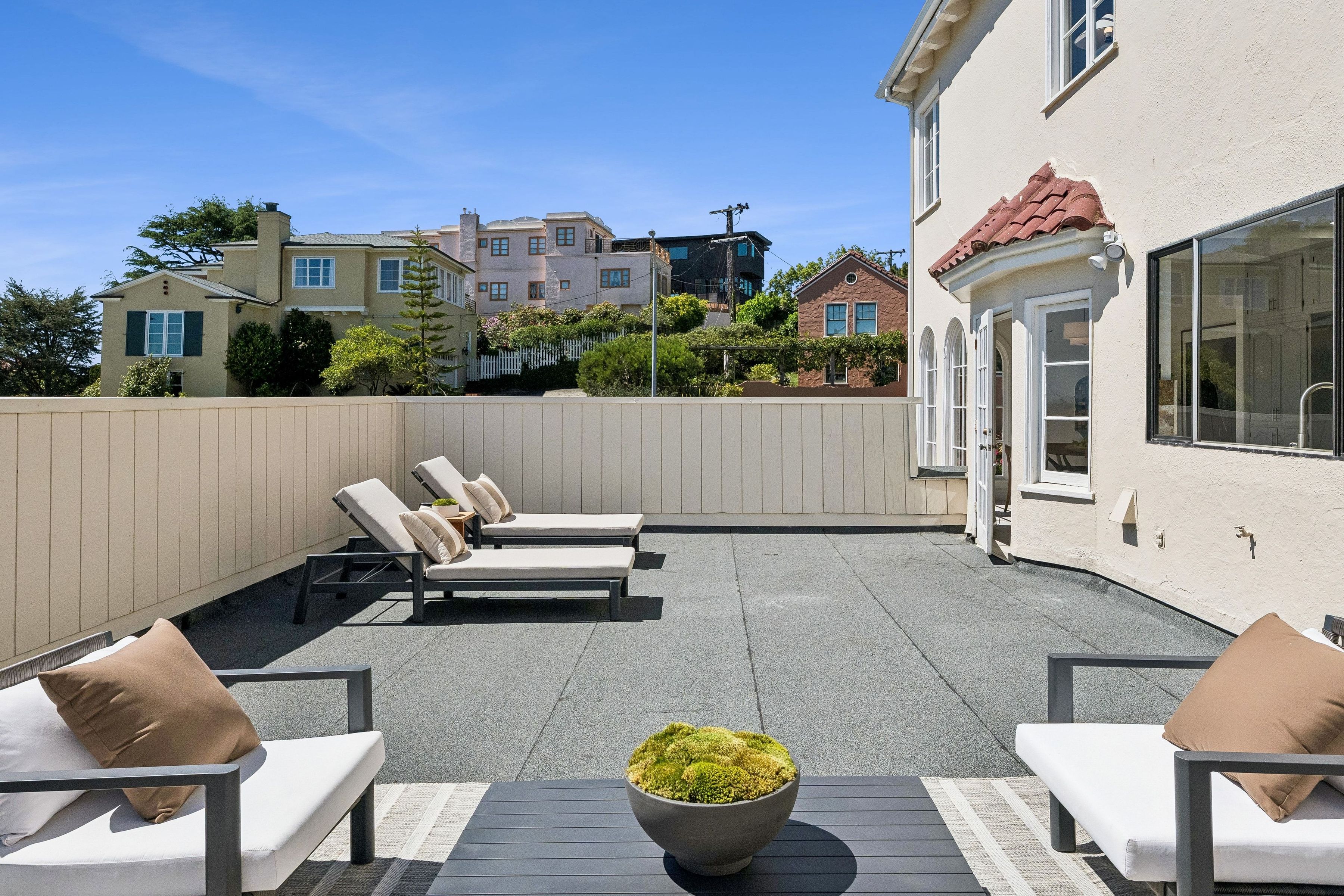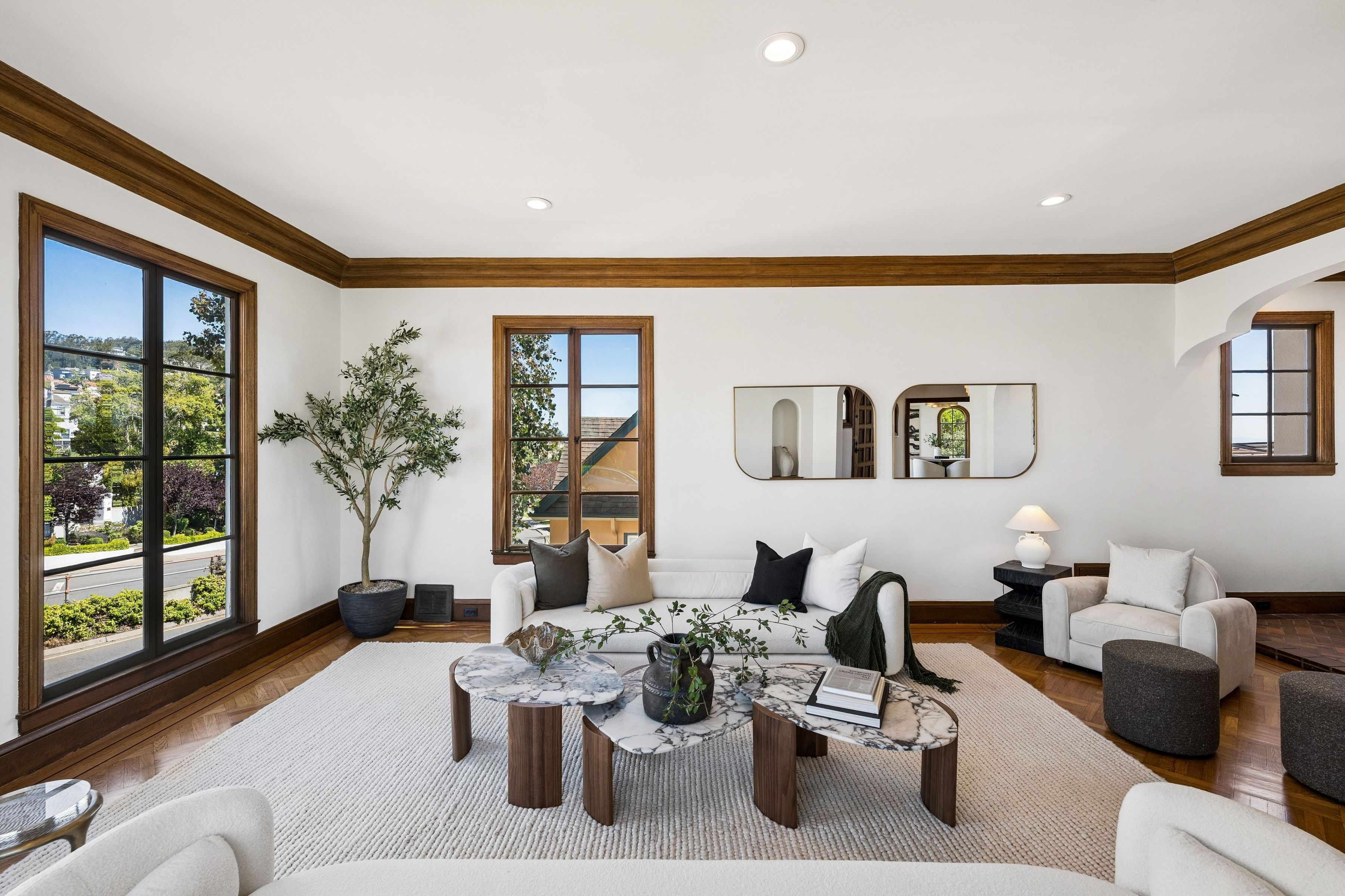 At the crest of Monterey Boulevard, where the city opens to sweeping southwestern horizons, 1185 Monterey Boulevard presents a poised balance of classic architecture and quiet modern refinement. Set behind an elegant façade, the home unfolds with an understated confidence; rooms of generous proportion, softened by natural light that moves easily from morning to late afternoon. Period details, subtle moldings, warm wood tones, and carefully preserved finishes anchor the interiors, while thoughtful updates lend a sense of present-day livability The main level is anchored by the sunken living room, stretching over 27 feet in length with large windows on three sides, a view to the ocean, and a large fireplace. The elegant dining room is perfect for entertaining, easily accommodating a table for ten. The eat-in kitchen features a dedicated breakfast area, extensive counters and cabinetry and a walkout to the sun-drenched patio. On this level is the fifth bedroom and a full bath. Up the curved staircase is a large landing and balcony with ocean views. Four of the bedrooms and two baths are on this floor, including a primary suite with dressing area and en-suite bath. Bedrooms are well-scaled with 360 degree outlooks that frame neighborhood greenery, ocean and bay views. The garden level features additional space that the owners used as a family room. Laundry room and additional bath with sauna are located on this level. The large four car garage can be accessed through two different staircases and offers plentiful room for cars and storage. Light-filled south facing backyard provides a quiet counterpoint to the city beyond, with space for gardening, dining, or play.. Close to stores and restaurants of West Portal and Stonestown, including Whole Foods, Sports Basement and Elena’s.