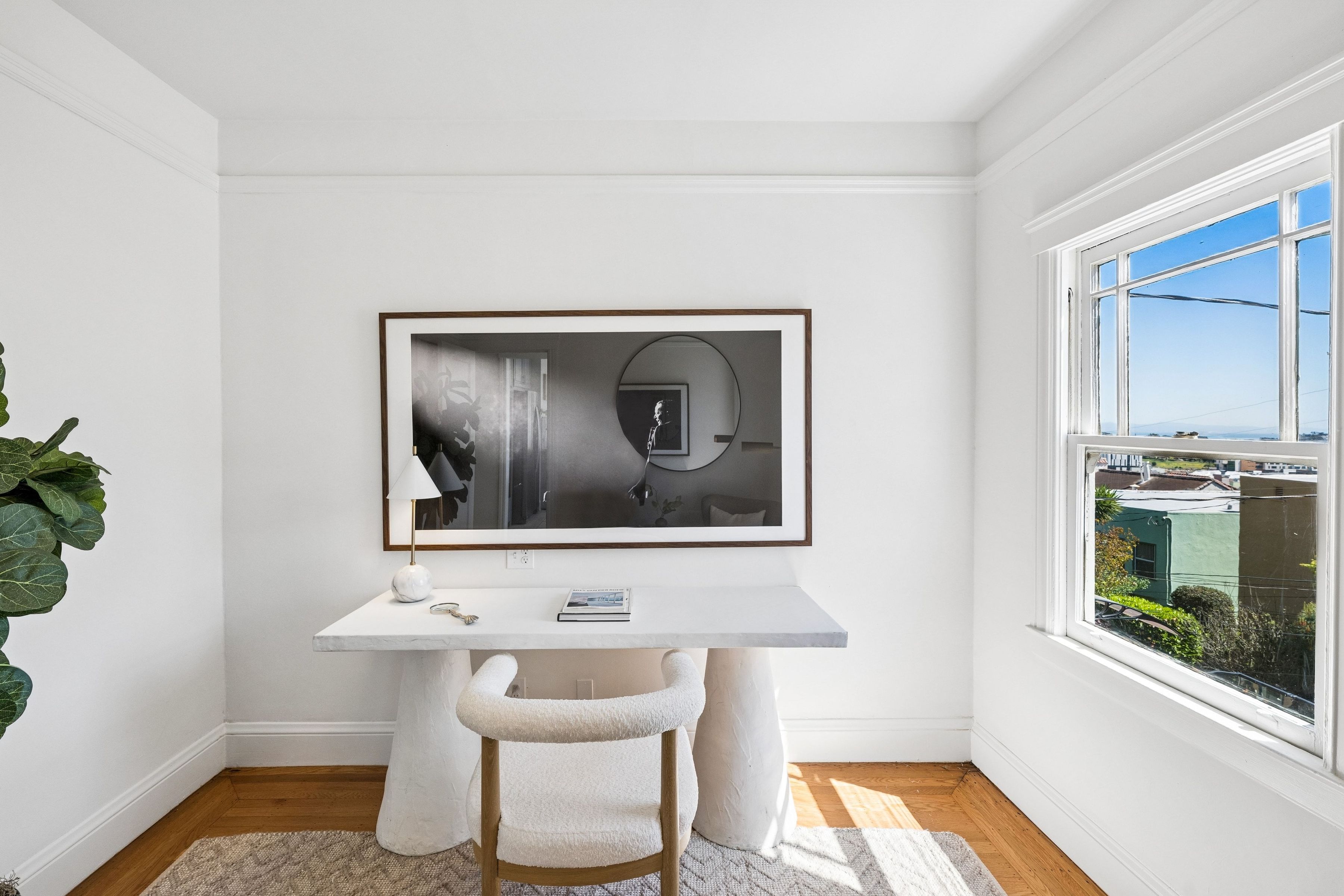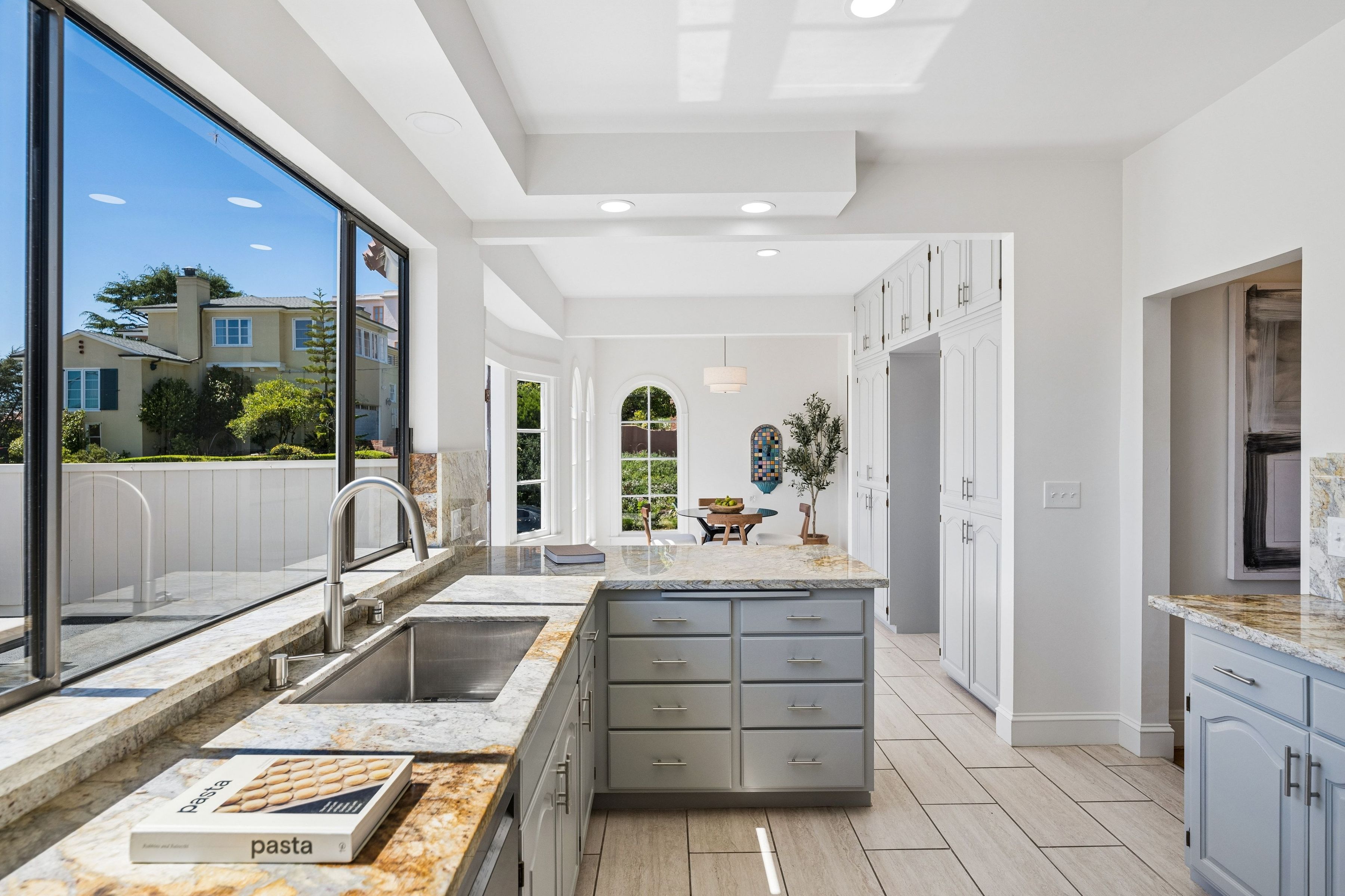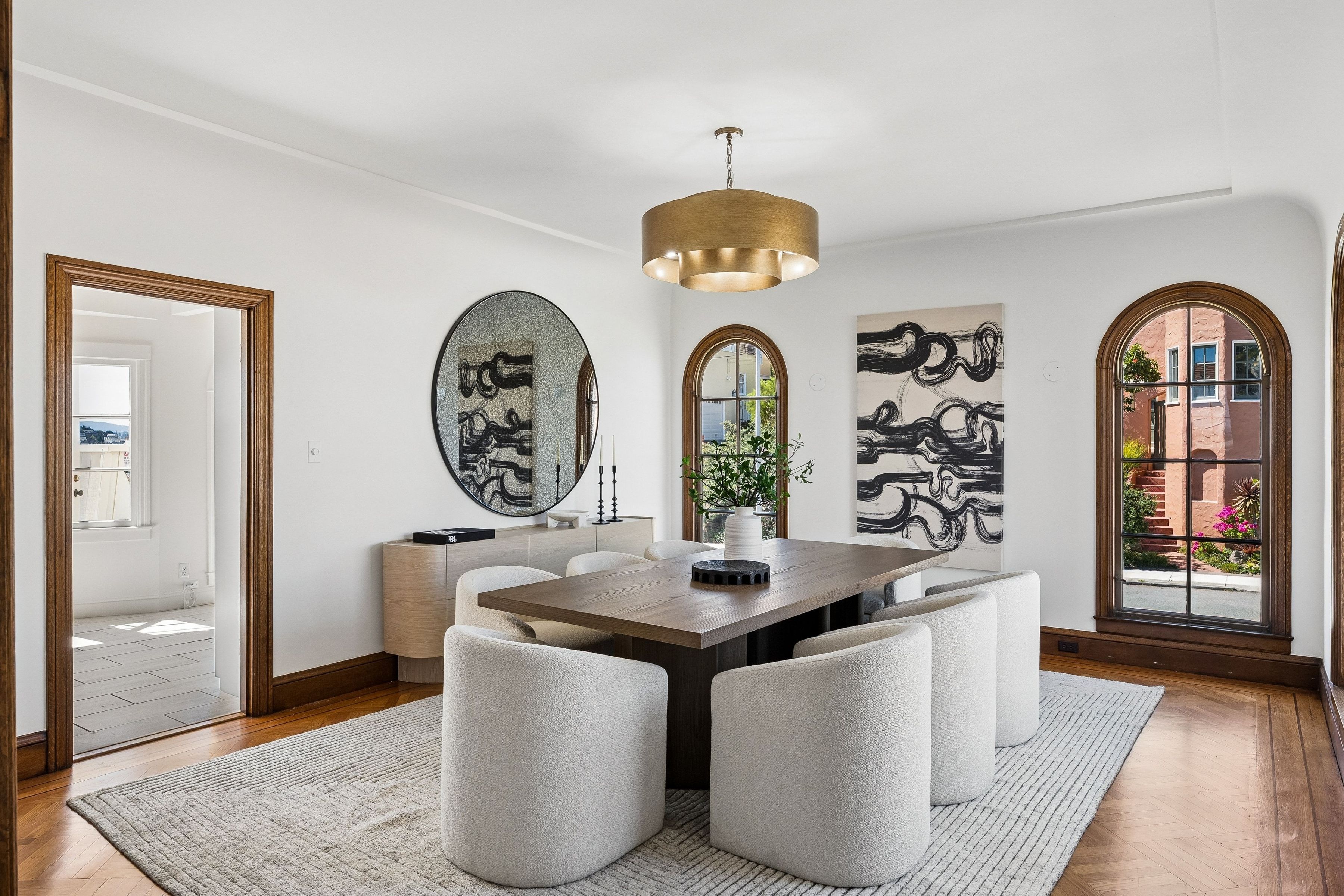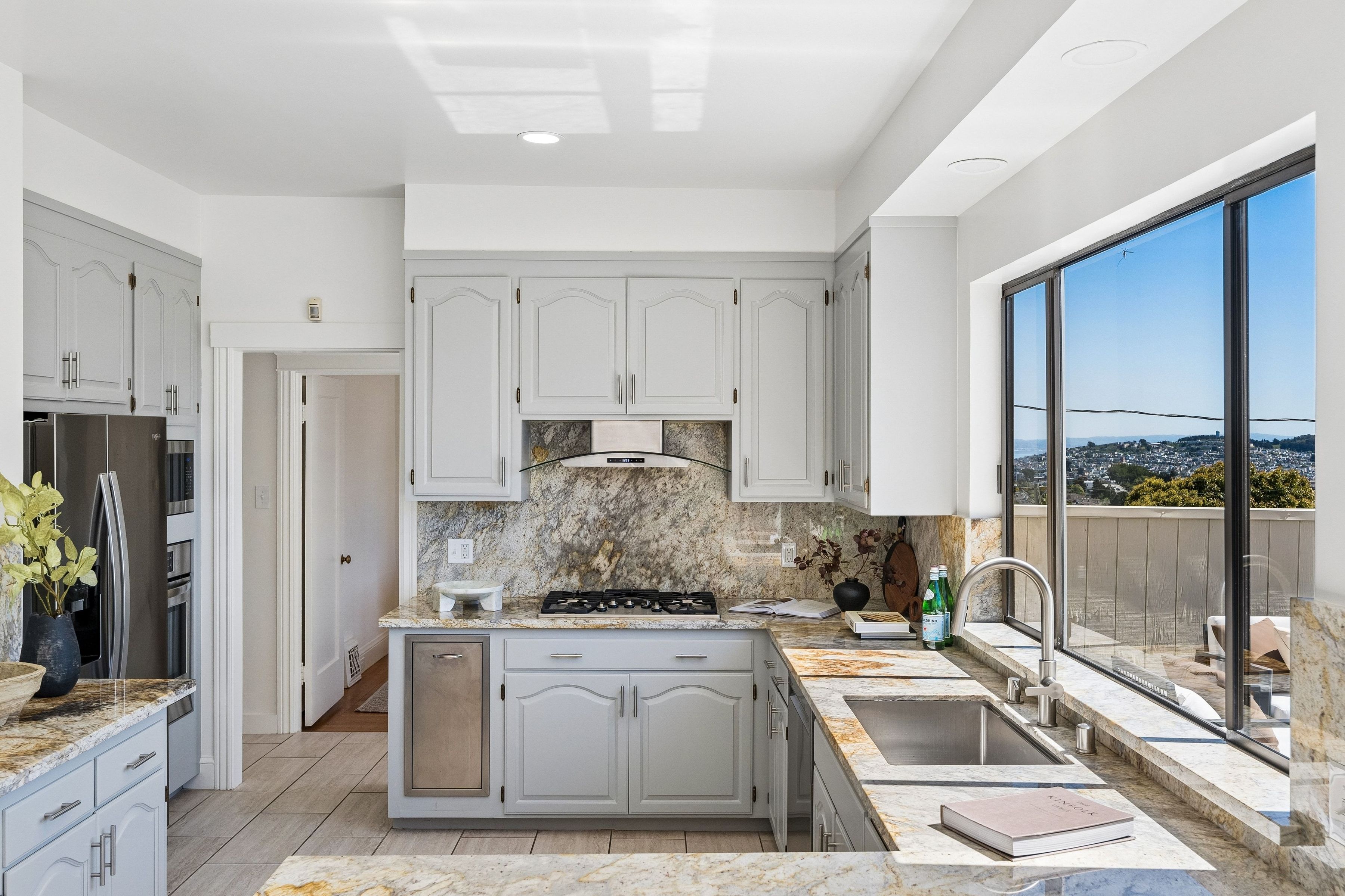 At the crest of Monterey Boulevard, where the city opens to sweeping southwestern horizons, 1185 Monterey Boulevard presents a poised balance of classic architecture and quiet modern refinement. Set behind an elegant façade, the home unfolds with an understated confidence; rooms of generous proportion, softened by natural light that moves easily from morning to late afternoon. Period details, subtle moldings, warm wood tones, and carefully preserved finishes anchor the interiors, while thoughtful updates lend a sense of present-day livability The main level is anchored by the sunken living room, stretching over 27 feet in length with large windows on three sides, a view to the ocean, and a large fireplace. The elegant dining room is perfect for entertaining, easily accommodating a table for ten. The eat-in kitchen features a dedicated breakfast area, extensive counters and cabinetry and a walkout to the sun-drenched patio. On this level is the fifth bedroom and a full bath. Up the curved staircase is a large landing and balcony with ocean views. Four of the bedrooms and two baths are on this floor, including a primary suite with dressing area and en-suite bath. Bedrooms are well-scaled with 360 degree outlooks that frame neighborhood greenery, ocean and bay views. The garden level features additional space that the owners used as a family room. Laundry room and additional bath with sauna are located on this level. The large four car garage can be accessed through two different staircases and offers plentiful room for cars and storage. Light-filled south facing backyard provides a quiet counterpoint to the city beyond, with space for gardening, dining, or play.. Close to stores and restaurants of West Portal and Stonestown, including Whole Foods, Sports Basement and Elena’s.