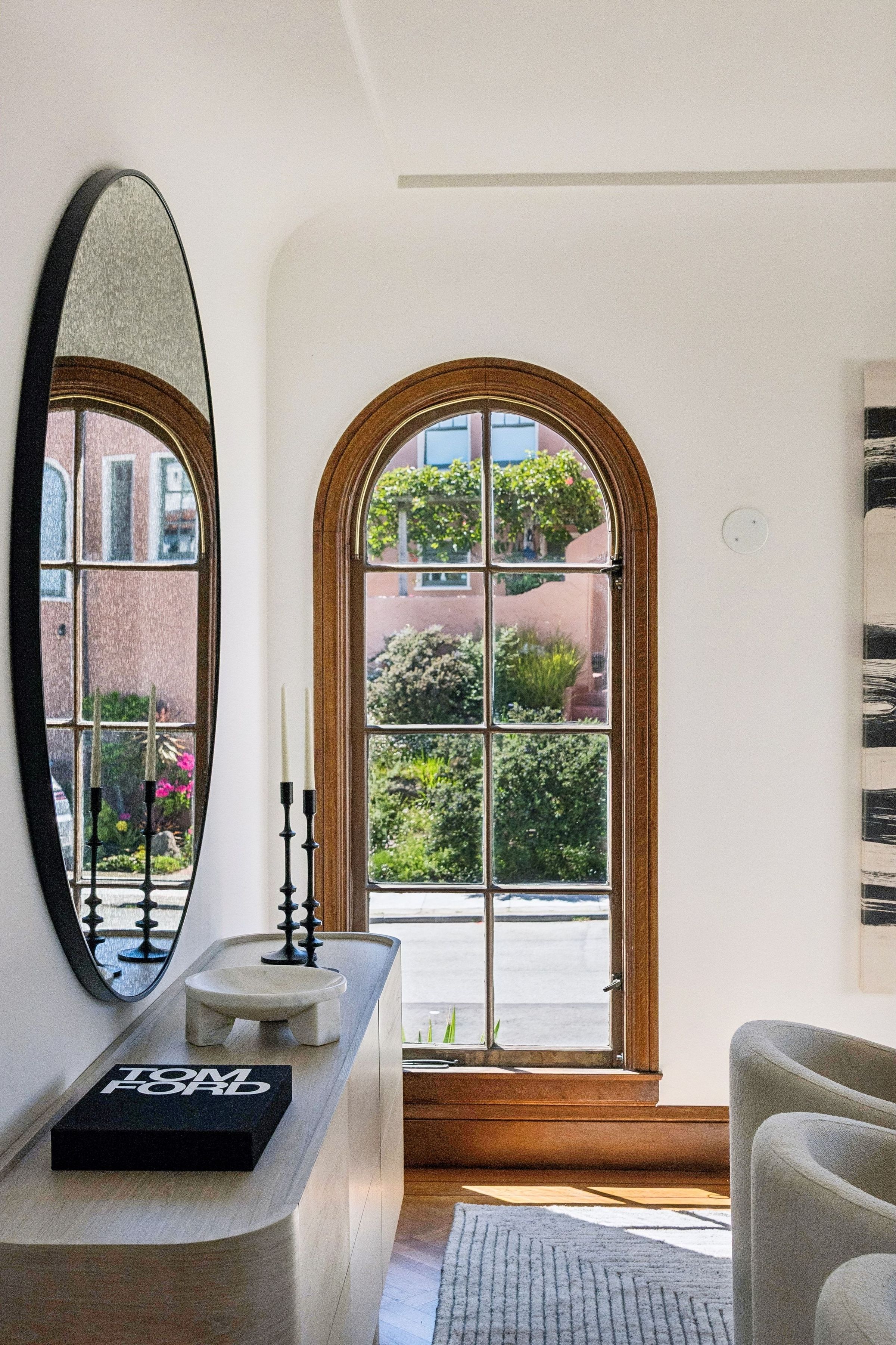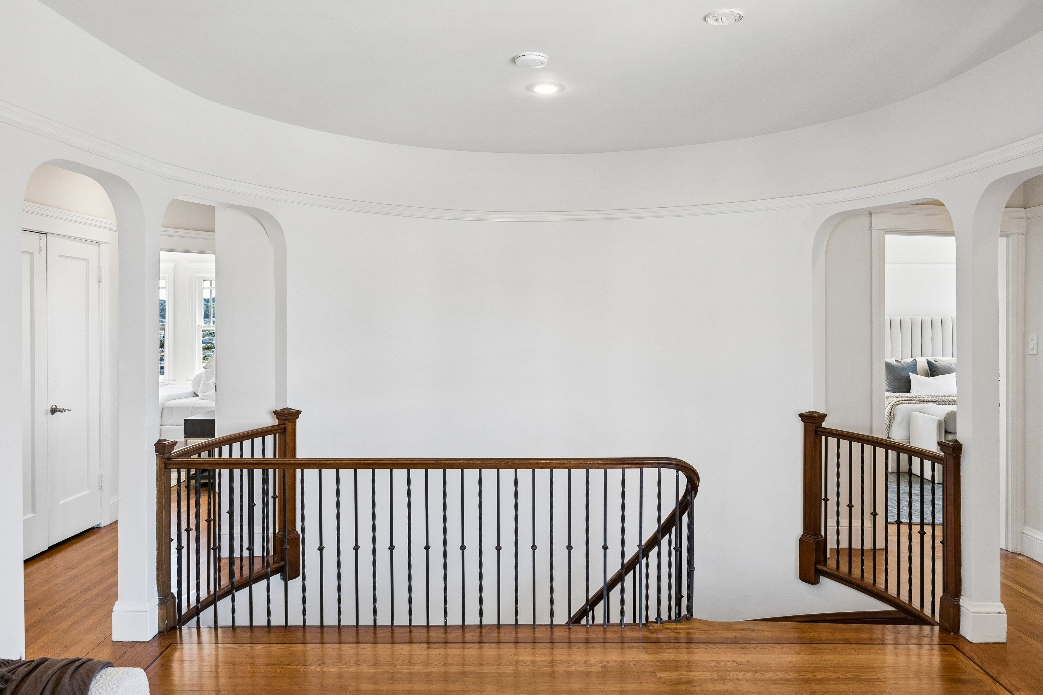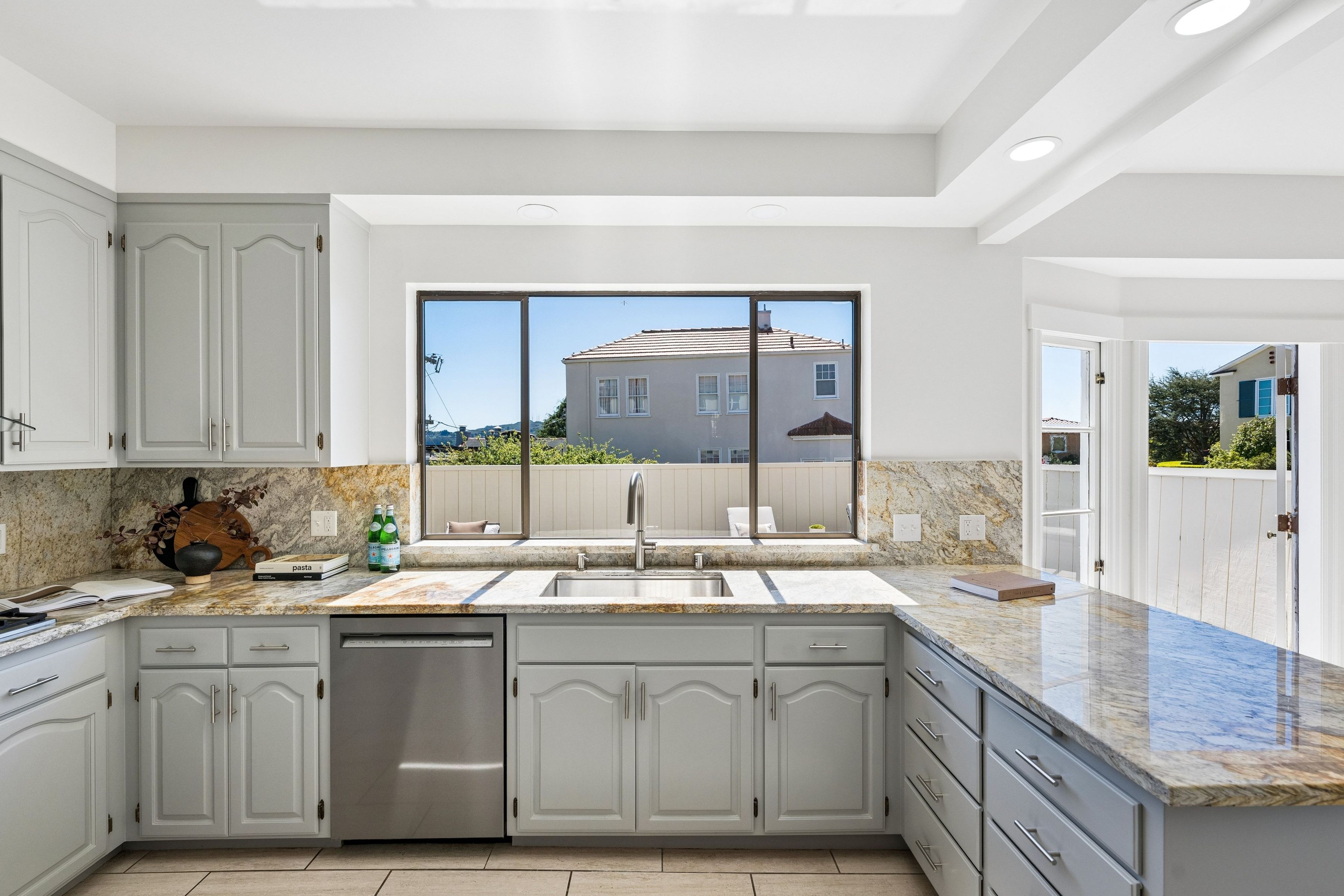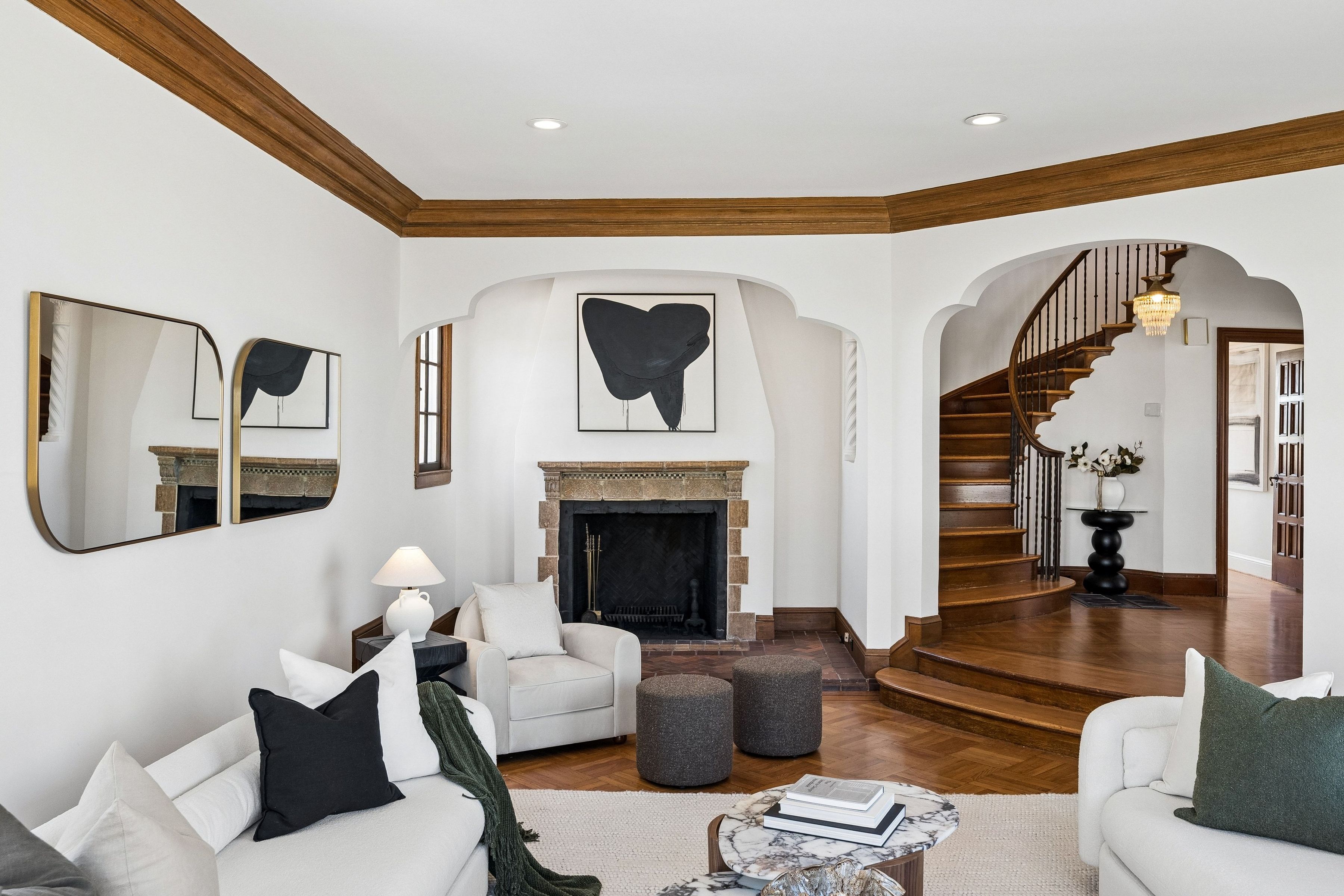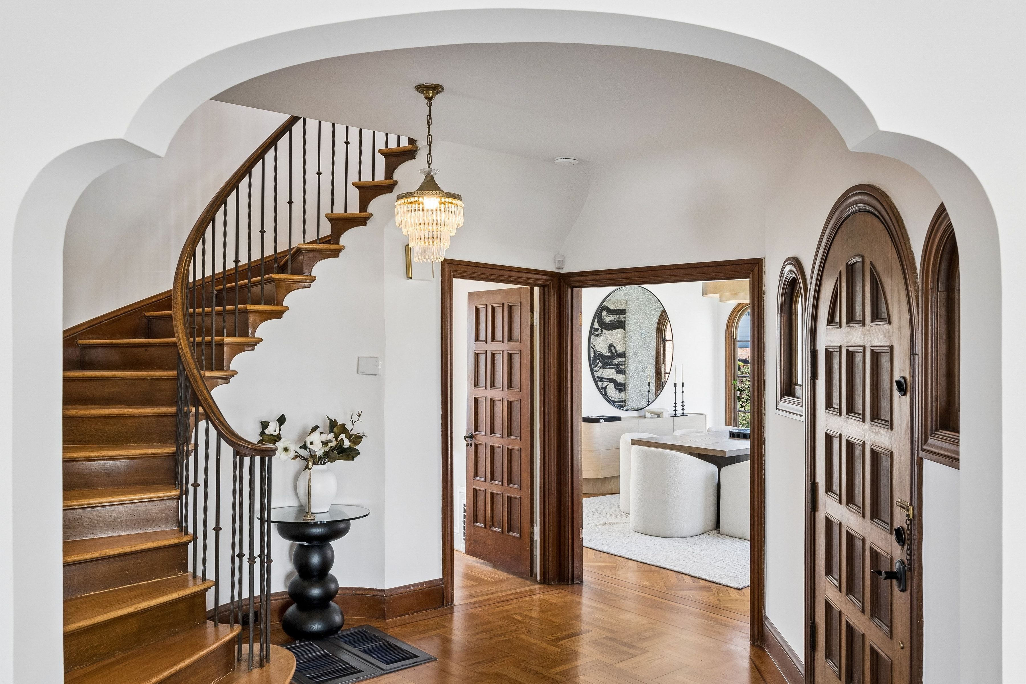 At the crest of Monterey Boulevard, where the city opens to sweeping southwestern horizons, 1185 Monterey Boulevard presents a poised balance of classic architecture and quiet modern refinement. Set behind an elegant façade, the home unfolds with an understated confidence; rooms of generous proportion, softened by natural light that moves easily from morning to late afternoon. Period details, subtle moldings, warm wood tones, and carefully preserved finishes anchor the interiors, while thoughtful updates lend a sense of present-day livability The main level is anchored by the sunken living room, stretching over 27 feet in length with large windows on three sides, a view to the ocean, and a large fireplace. The elegant dining room is perfect for entertaining, easily accommodating a table for ten. The eat-in kitchen features a dedicated breakfast area, extensive counters and cabinetry and a walkout to the sun-drenched patio. On this level is the fifth bedroom and a full bath. Up the curved staircase is a large landing and balcony with ocean views. Four of the bedrooms and two baths are on this floor, including a primary suite with dressing area and en-suite bath. Bedrooms are well-scaled with 360 degree outlooks that frame neighborhood greenery, ocean and bay views. The garden level features additional space that the owners used as a family room. Laundry room and additional bath with sauna are located on this level. The large four car garage can be accessed through two different staircases and offers plentiful room for cars and storage. Light-filled south facing backyard provides a quiet counterpoint to the city beyond, with space for gardening, dining, or play.. Close to stores and restaurants of West Portal and Stonestown, including Whole Foods, Sports Basement and Elena’s.