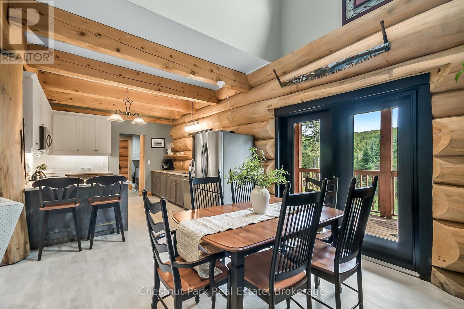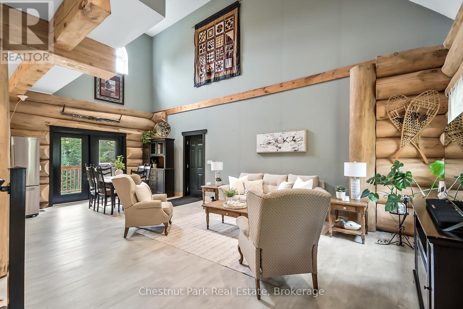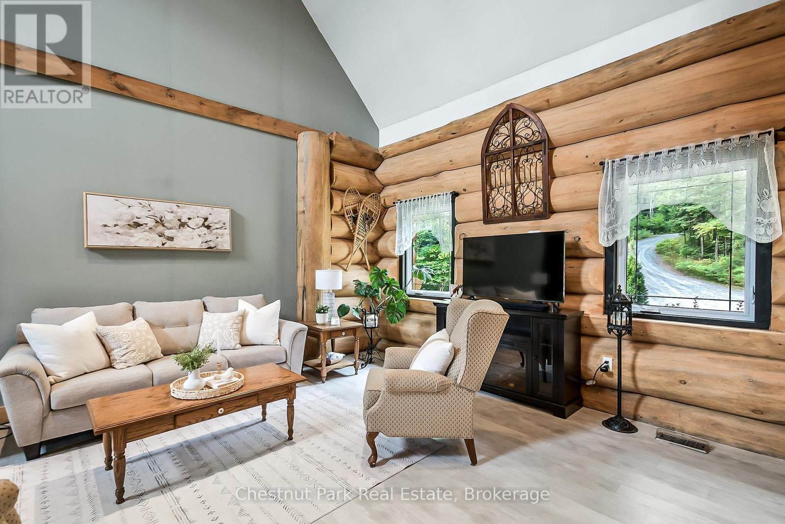Tucked away on a 2.5 acre escape, this custom-built Scandinavian hand scribe log home welcomes you with its soul-soothing blend of rustic elegance and modern comfort. Despite its incredible privacy, this home is in the vibrant community of Huntsville, Muskoka, surrounded by natural beauty, this one-of-a-kind retreat offers a life where every day feels like a getaway. Masterfully crafted by Little Log Homes in 2020 for the current owner, this remarkable property showcases massive hand-hewn logs, soaring ceilings, and an impressive log entry covered porch that immediately sets the tone for the craftsmanship within. Huntsville is the largest community in Muskoka offering charming shops, restaurants, golf courses, live theatre & access to Arrowhead Park. Only 5 years old & meticulously maintained, this home is a rare opportunity to own a truly one-of-a-kind log home retreat. 1 minute to the Big East River, for casting a fishing line, or enjoying a peaceful paddle, and just minutes for a stroll alongside the Big East River to the historic Dyer Memorial. This property invites a slower pace and a deeper connection to nature. A truly unique home that blends character, comfort & the spirit of the outdoors. Bungaloft oor plan with over 1800 sqft of living space on the main level second level. Main floor primary bedroom with 5pc ensuite bath & walk-in closet with 2 guest rooms, office & 3pc bath on second level. 2 pc powder room & laundry on main level. There are many extra features to this home to name a few; quartz counter tops, hot water on demand, central vac, central air, oversized detached garage with extra high garage door, Generlink generator system to run entire home, 10' main floor ceilings, 9' second level ceilings, ICF foundation, 46' covered deck overlooking natural treed surroundings. Full walk-out basement with additional living space (663.50 sqft approx) - in-law suite capability with kitchenette, 3 pc bath with large family room. Electric fireplace in living room, all appliances including two freezers in garage, Star Link internet equipment, Champion gas generator 11,250/9,000 watts, and all window coverings.