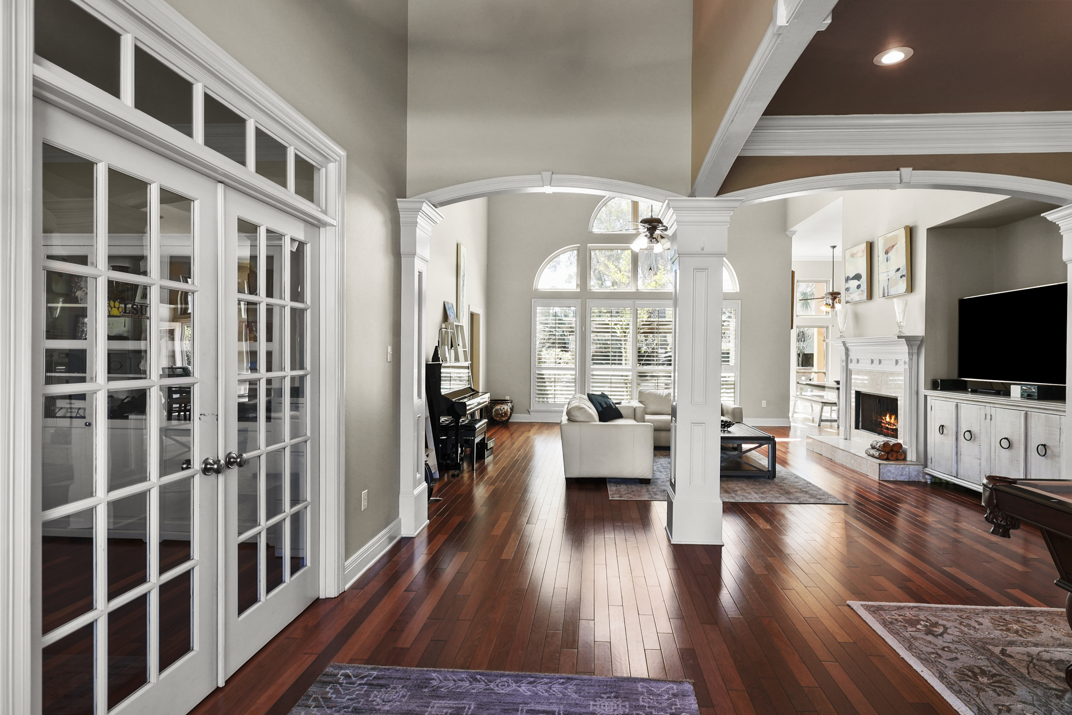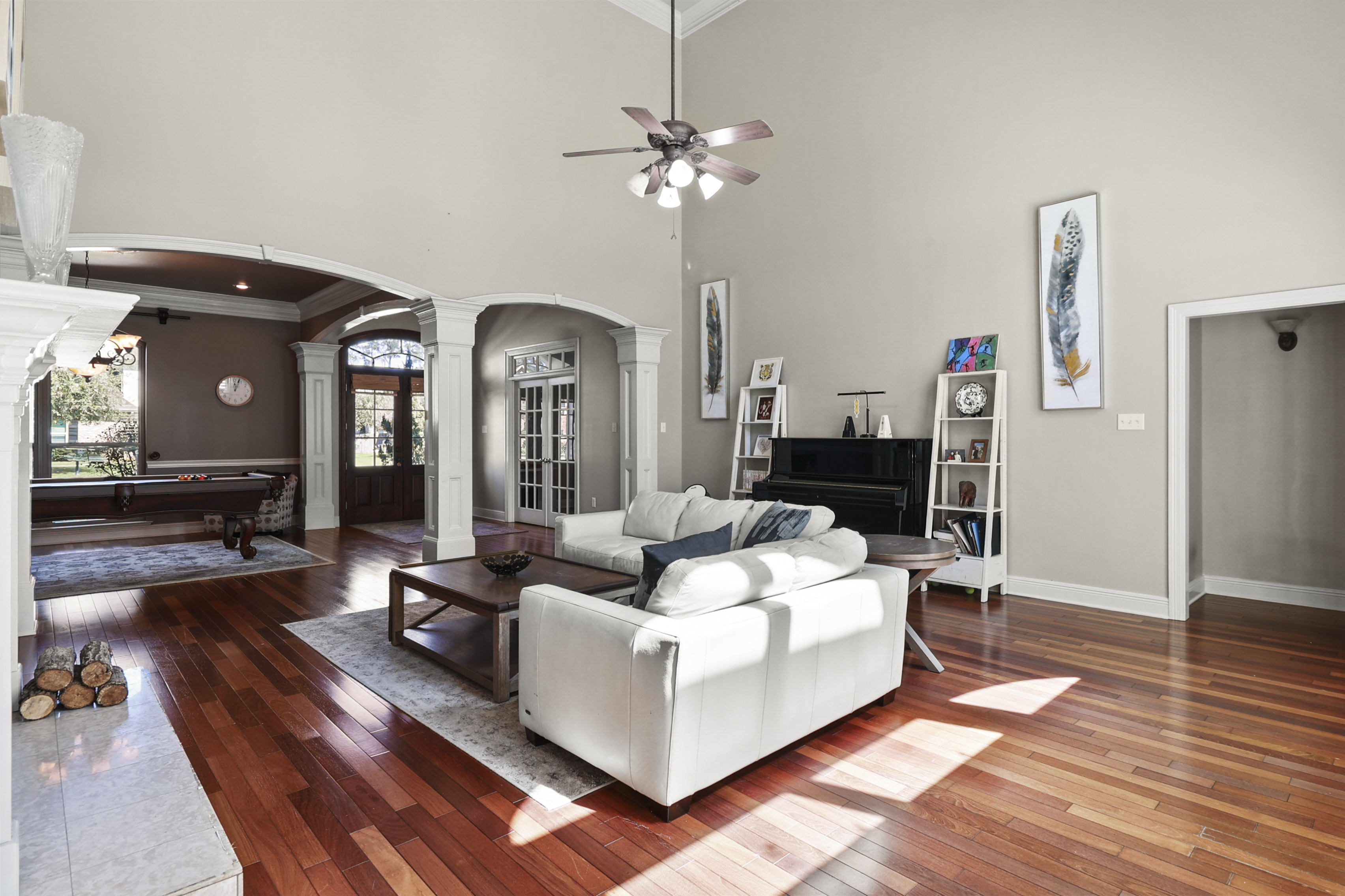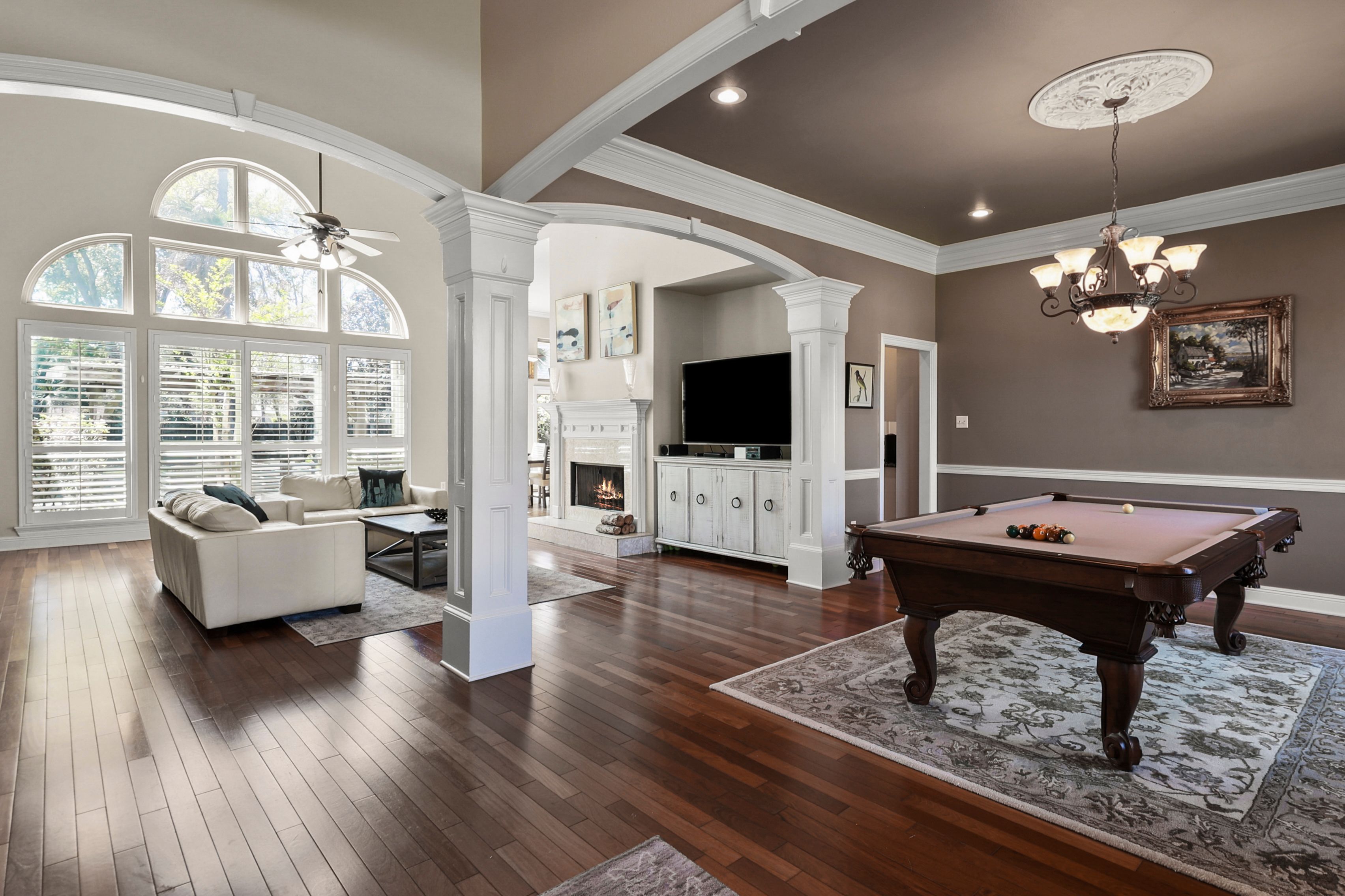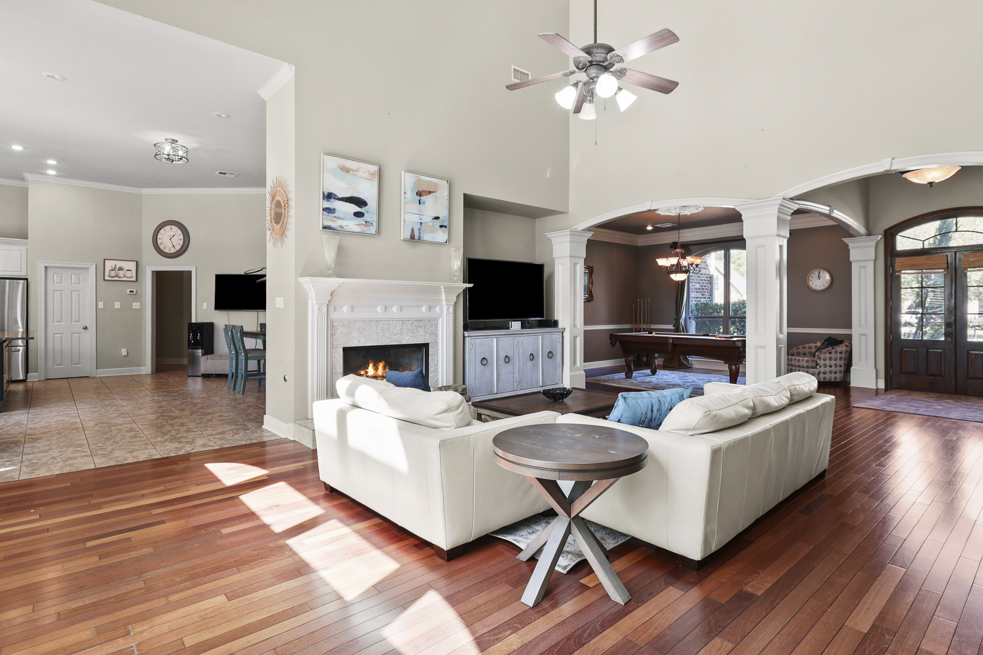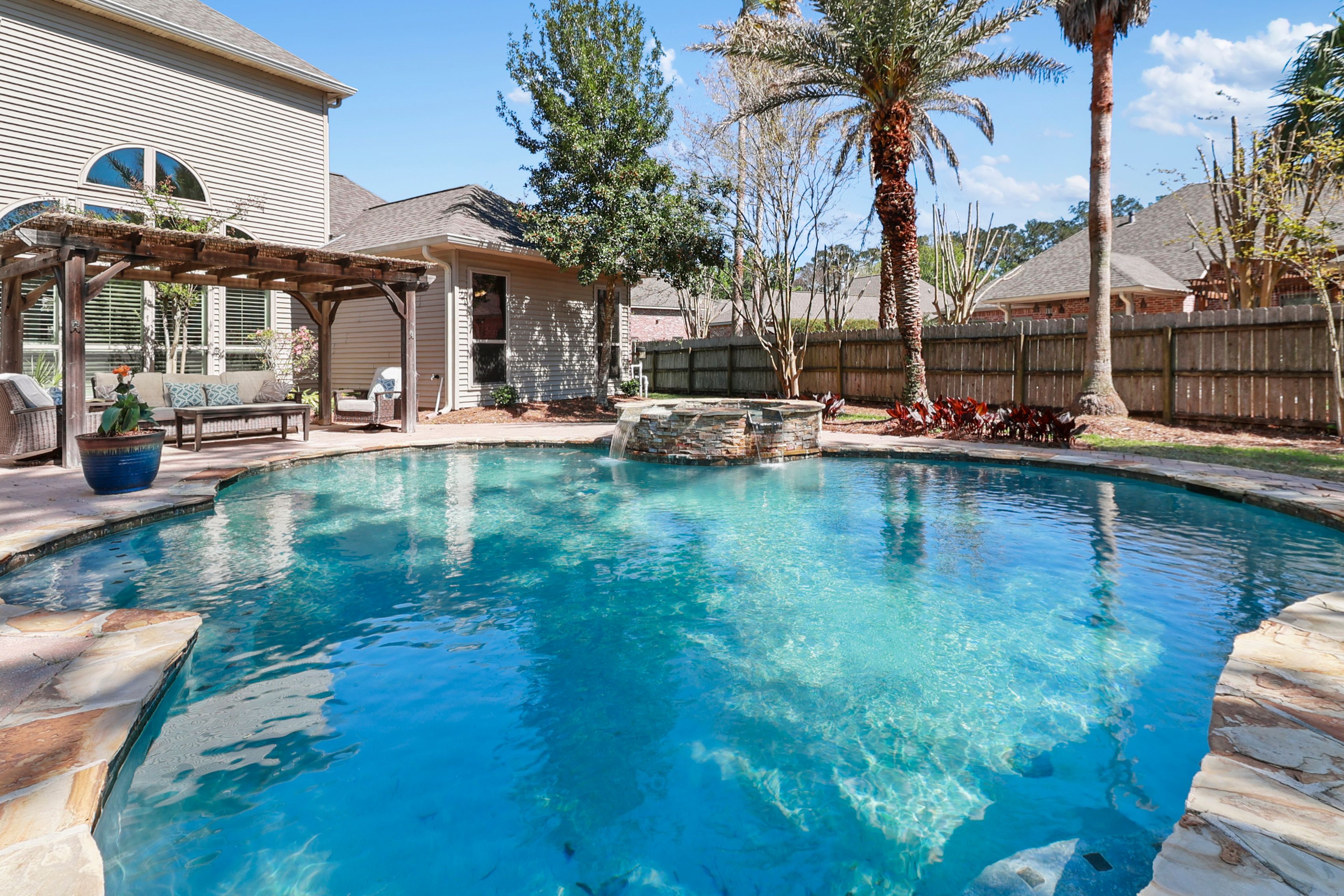 Located in the gated Reserve subdivision conveniently located in Mandeville, this spacious and thoughtfully designed 5-bedroom, 3½-bath home offers 3,812 square feet of comfortable living with room for everyone. Step inside to soaring 20-foot ceilings in the living room, highlighted by a beautiful fireplace and oversized windows that creates a dramatic yet inviting space for gathering. The expansive kitchen is truly the heart of the home, featuring abundant cabinetry and a large island along with a breakfast area and cozy keeping space, perfect for everyday living and entertaining. A dedicated home office provides an ideal work-from-home setup. The primary suite boasts impressive 14-foot ceilings and multiple closets. With three bedrooms conveniently located downstairs and two additional bedrooms plus a spacious game room upstairs, the flexible layout allows everyone to spread out comfortably. Step outside to your private backyard retreat featuring a saltwater pool and hot tub, creating a relaxing resort-style atmosphere. The covered patio, an outdoor fireplace and pergola makes the space perfect for entertaining or enjoying quiet evenings outdoors. Additional highlights include a two-car garage with a long driveway offering plenty of additional parking, a three-year-old roof, and generous living spaces throughout. This home combines comfort, functionality, and exceptional indoor-outdoor living in one of Mandeville’s highly desirable gated communities, conveniently located near shopping, dining, and everyday amenities.