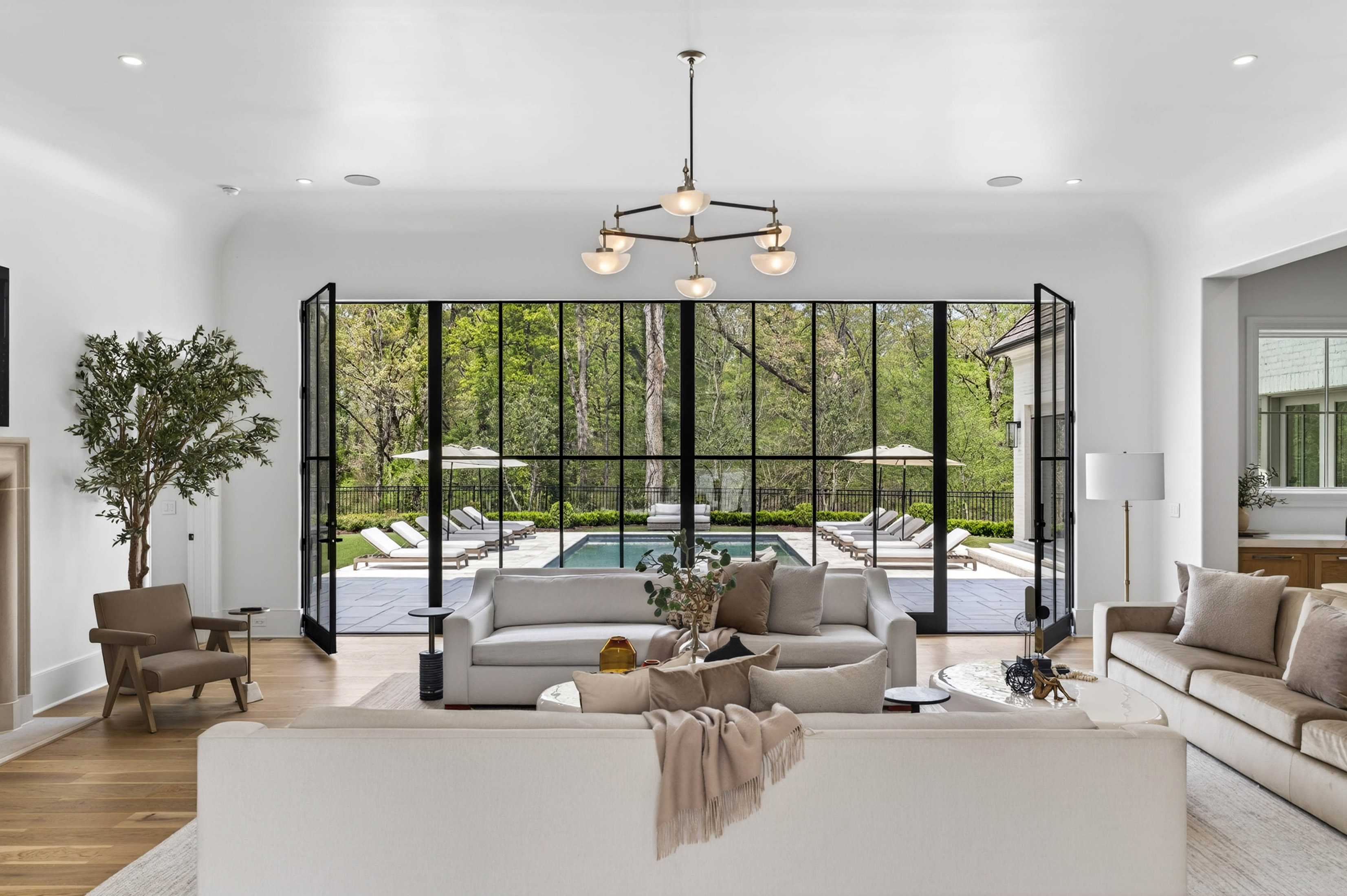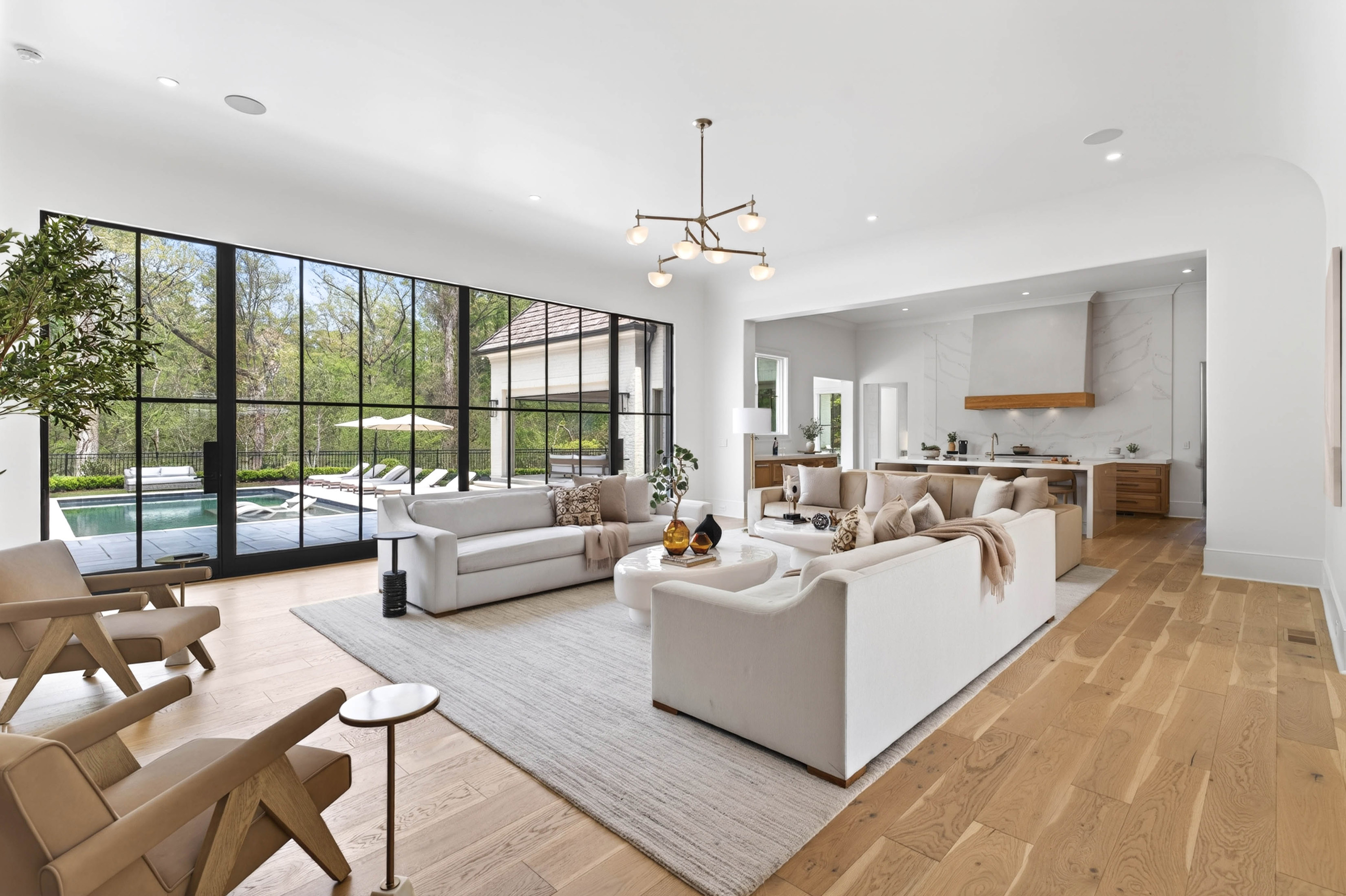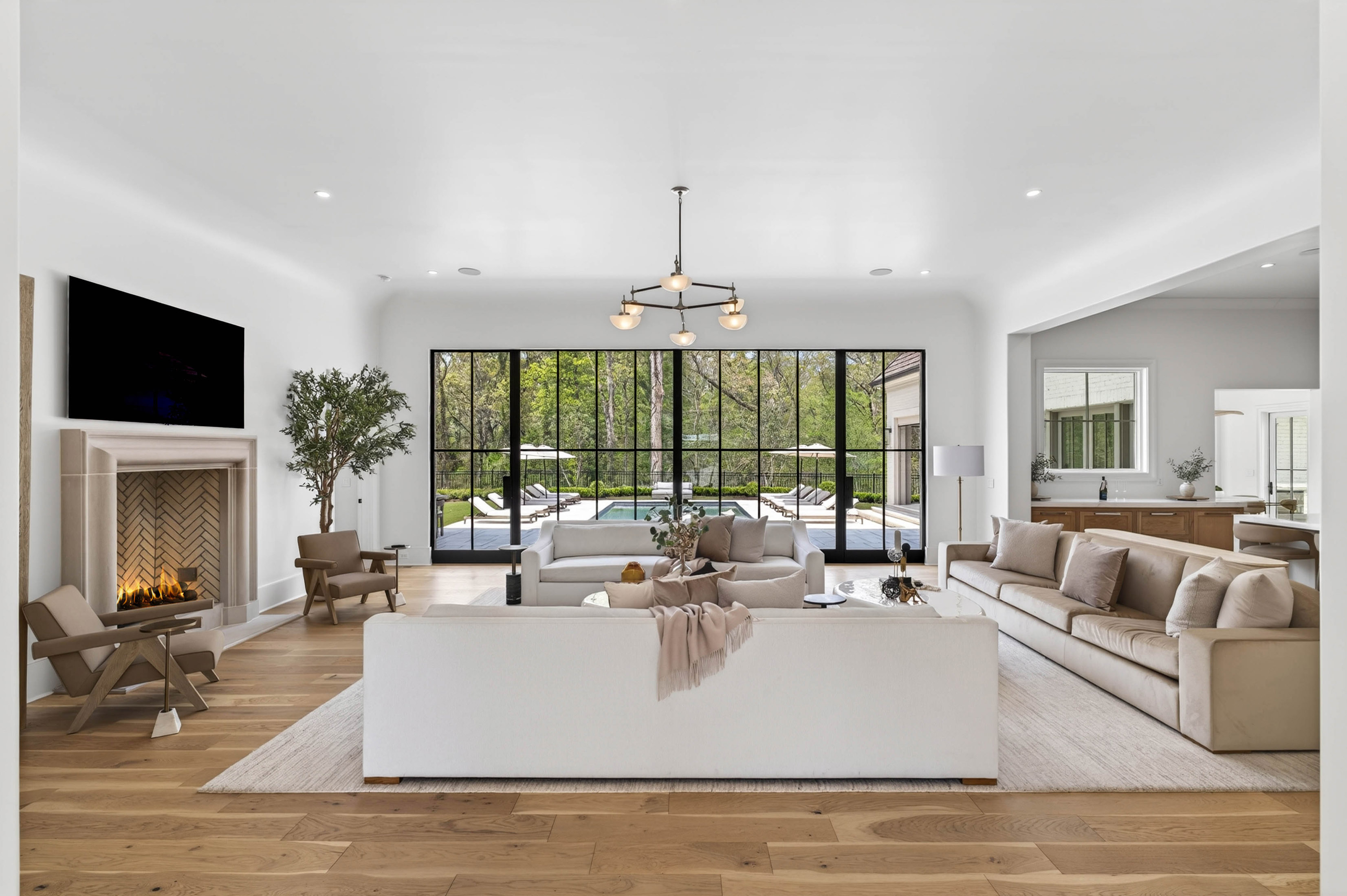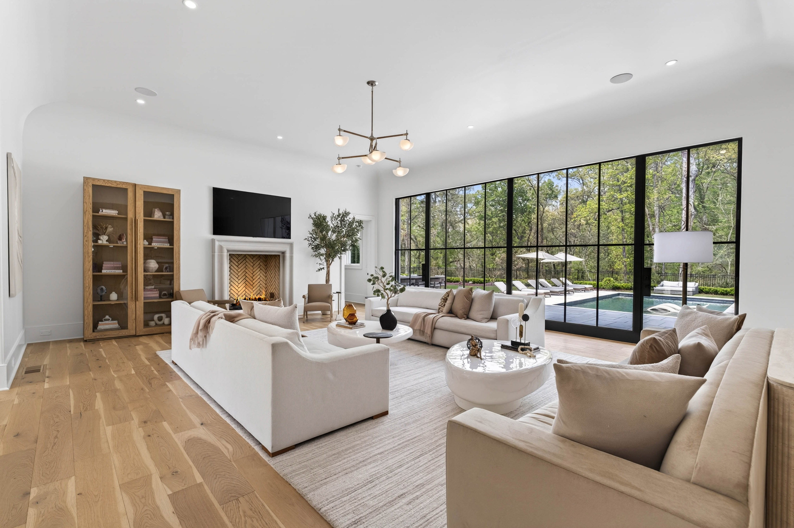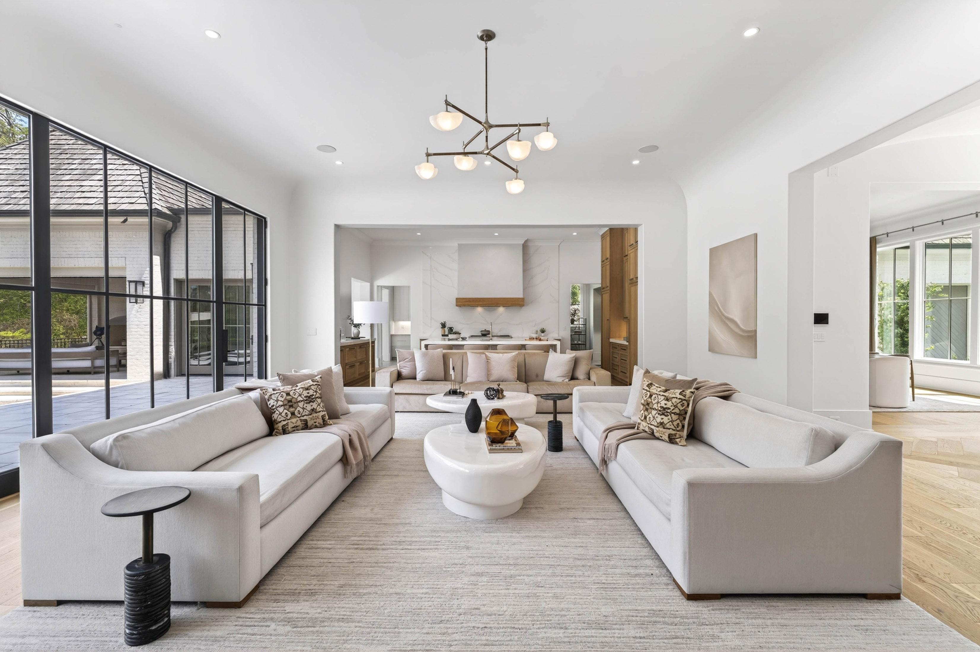 Set behind gates on 2.3 private, beautifully manicured acres in one of the city’s most coveted enclaves of luxury estates, the property delivers an amenity package rarely achieved in a single residence: a resort-quality pool and spa with tanning ledge, covered fireside pavilion with automated Phantom screens, outdoor kitchen, plumbed firepit, sport court with pickleball, enclosed sports field for soccer and batting practice, inground trampoline, and expansive professionally turfed grounds, all enhanced by lighting, security, and impeccable landscaping. Designed by Castro Design, the transitional architecture is both striking and timeless, pairing painted white brick, a cedar roof, an abundance of steel windows and doors, and a four-car garage with a warm, richly layered interior of exceptional scale and livability. Inside, a gracious floor plan unfolds with grand yet comfortable living spaces designed equally for elegant entertaining and effortless daily life. The expansive great room is complemented by a substantial formal dining room and a private fireside study on the main level. At the heart of the home, the designer kitchen is a true showpiece, appointed with waterfall quartz countertops, bespoke cabinetry, and a full suite of premium appliances, while an exceptional supporting cast includes a fully equipped scullery, butler’s pantry, breakfast room, oversized mudroom with custom built-in lockers, and main-level laundry. Privately situated down a long dedicated hallway, the main-level primary suite is a retreat unto itself, rivaling those found in the finest boutique hotels. The suite offers a breakfast bar with refrigeration, a boutique-caliber dressing room, and a private massage room that could easily serve as additional closet space or a wellness treatment room. The marble-clad bath is nothing short of spectacular, featuring oversized white oak fluted dual vanities with waterfall marble countertops, a dramatic dual-entry shower, freestanding soaking tub, and dual water closets. Upstairs, four generously proportioned ensuite bedrooms with soaring ceilings are accompanied by a second laundry room, an open-concept family lounge, and a dedicated homework or craft room, offering ideal flexibility for family living. The finished terrace level is an outright destination, curated for entertaining on a grand scale and for year-round recreation. This level features an expansive family room with dual seating areas, two fully equipped bars, a full kitchen, guest suite, private fitness studio with sauna and cold plunge, and an extraordinary indoor children’s gymnasium complete with foam pit and obstacle course. The walk-out backyard is among the finest private recreational environments in the Atlanta market, seamlessly extending the home’s living experience outdoors while delivering an unmatched level of versatility for entertaining, wellness, sports, and family life. With its extraordinary architectural presence, comprehensive amenity suite, and one of the most complete lifestyle offerings to come to market in Sandy Springs, this is far more than a newly built home. It is a true estate property and a standout offering within the upper tier of Atlanta luxury real estate.