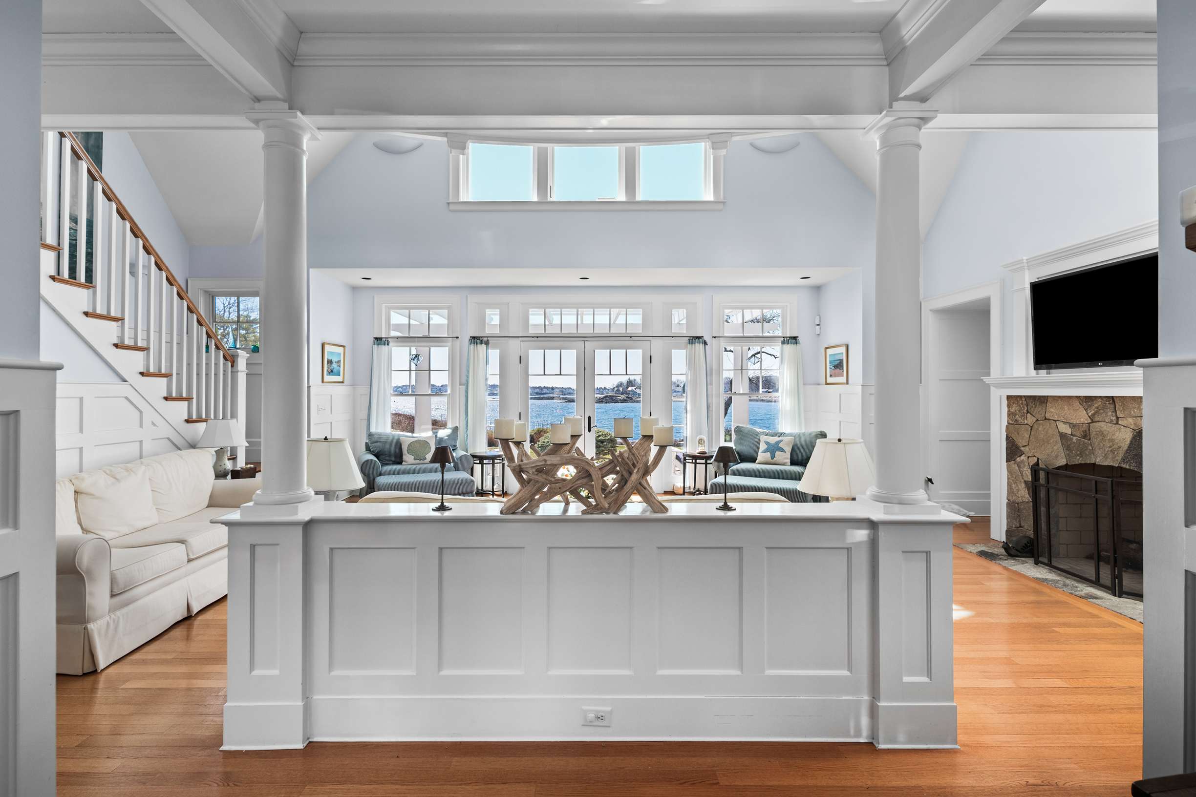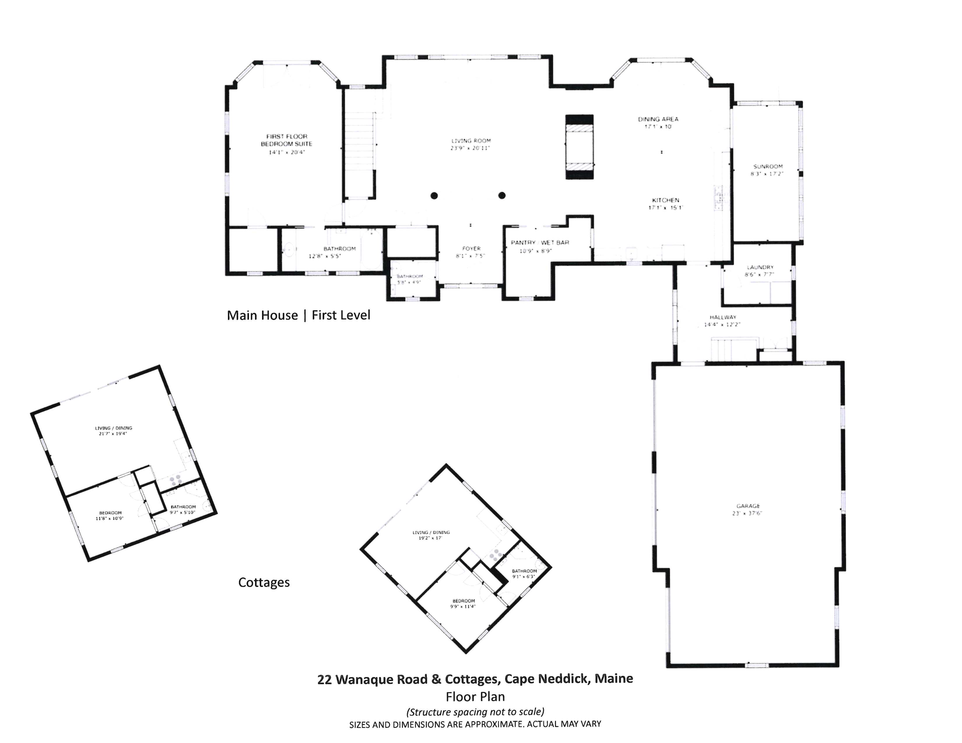 Welcome to your future oceanfront residence, a custom-built Shingle-style compound that has been lovingly maintained by its current owners for the past sixteen years. As you stand on the front stone terrace with your morning coffee, you'll be captivated by the expansive front yard and the breathtaking views of Nubble Lighthouse or Passaconaway Beach. Upon entering, you are welcomed by a sunlit living room, featuring extensive windows that capture stunning ocean views and southern sunlight. The open-concept kitchen and dining area serve as the heart of the home, where friends and family will gather for summer fun, holidays, and game nights. This space is highlighted by a double-sided fireplace, a coffered ceiling, and an inviting screened porch, providing a tranquil retreat overlooking the private pathway to Cape Neddick Beach. Host your summer parties in the serene, elevated yard, with ocean views as your backdrop. The property's rocky shoreline is perfect for crabbing or simply relaxing in your Adirondack chair by the water. This residence has been thoughtfully designed, featuring a first-floor bedroom suite and three additional bedrooms on the second level, including a private suite above the garage. The finished lower level includes a family room and an extra room that could serve as an in-home office or gym. Your guests will enjoy the two charming seasonal cottages, each with one bedroom and one bath. The home is accented with beautiful wood flooring and efficient HVAC systems. There is ample vehicle storage available in the heated, attached three-car garage or the detached two-car garage. The neighborhood consists of ''summer cottages'' that are similarly styled and scaled, which creates a private yet inviting atmosphere, and it is conveniently located within walking distance of an upscale dining establishment. This property is the perfect setting for creating a lifetime of memories on the Southern Maine coast.