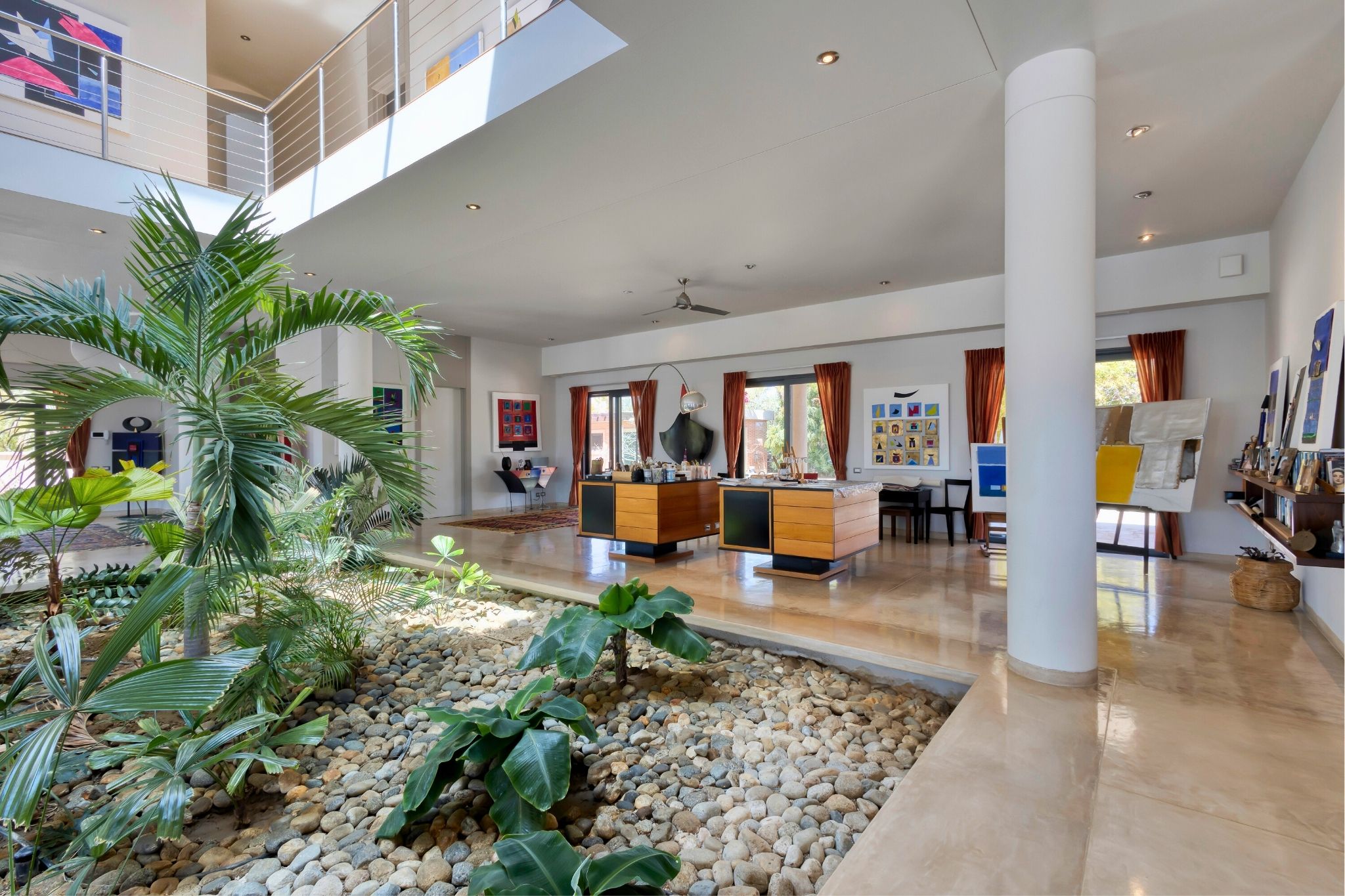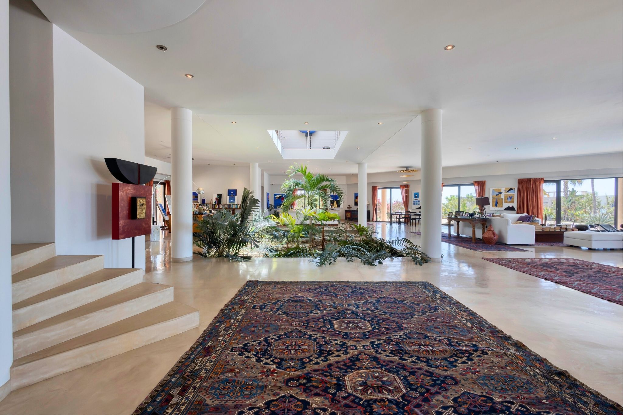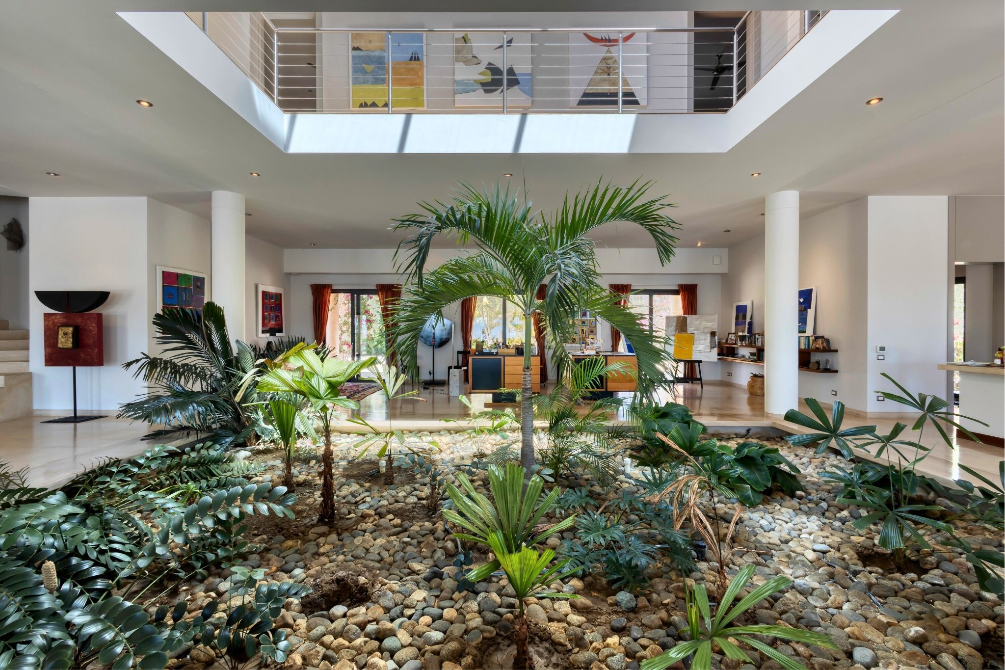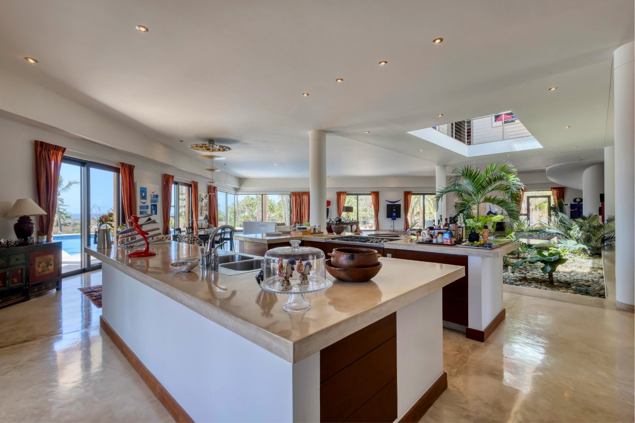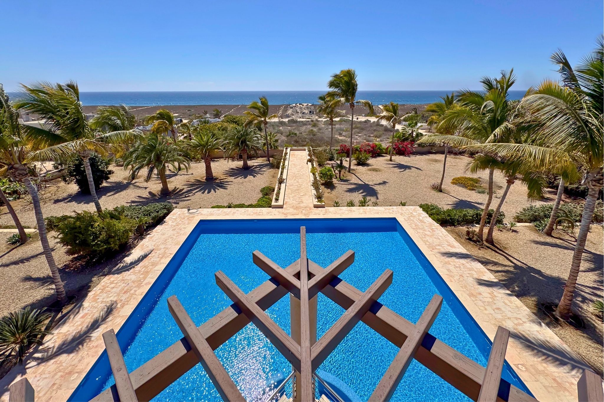 Just one row from the beach, this striking diamond-shaped residence offers panoramic ocean views and over 1,334 m² (14,359 ft²) of total living space, combining sleek design with coastal elegance. The main two-story home centers around a double-height indoor garden, with an open-concept living area, chef's kitchen, and five bedrooms, each with its own bathroom. A home office and two of the bedrooms enjoy stunning sea views. On the rooftop, a lounge area offers 360° views of the ocean and landscape—perfect for sunsets or quiet reflection. Outside, a 268 m² (2,884 ft²) pool connects beautifully to covered terraces and lounge areas.