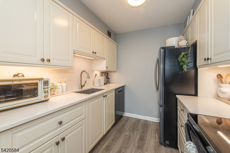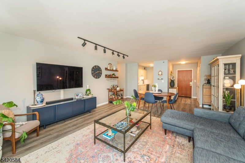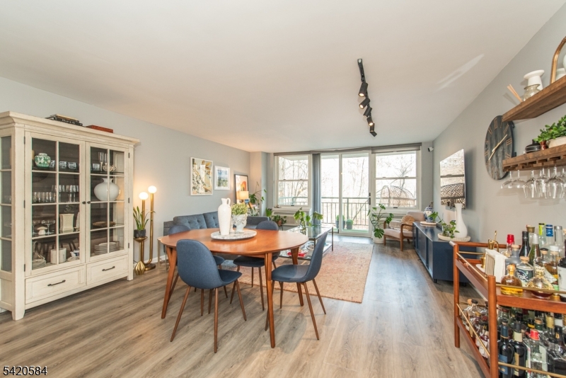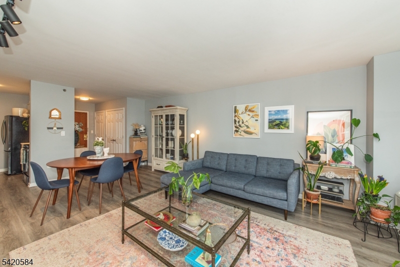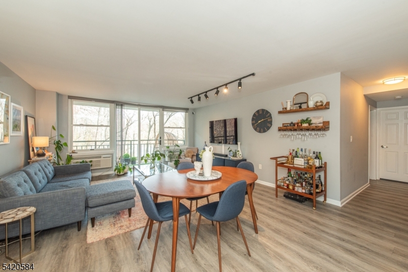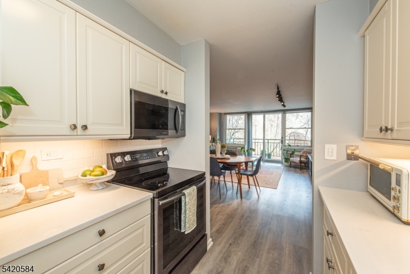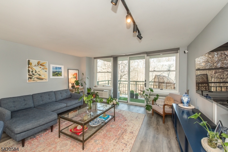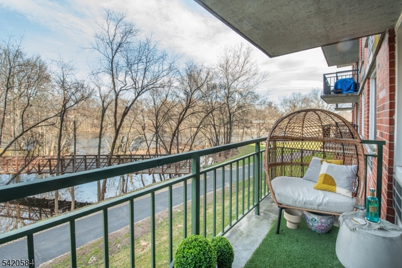 Direct sight lines to the foot bridge and flowing river define this updated residence at The Mill, with water views immediately visible from the main living area and private balcony. A bright, open layout is enhanced by all new windows and a new sliding glass door, bringing in natural light. A welcoming entry foyer creates a defined arrival point with space for storage before opening into the main living area. Wide-plank flooring runs throughout, while the living and dining areas offer flexibility for both everyday living and entertaining, all oriented toward the view. Sliding doors lead directly to the balcony overlooking the water, foot bridge, and surrounding greenery. The kitchen has been updated with white cabinetry, quartz countertops, a tiled backsplash, and under-cabinet lighting, connecting seamlessly to the dining space. The primary bedroom is generously sized, featuring a custom walk-in closet designed for organization and direct access to the primary bath. The second bedroom offers versatility as a guest room, home office, or additional living space. A stacked washer/dryer is tucked into the main bathroom with a tub shower. Additional updates include new PTAC units, providing efficient heating and cooling. Residents of The Mill enjoy a full suite of amenities including a fitness center, pool, tennis courts, walking paths, and a community room, all set within the riverside community with convenient access to NJ Transit, major highways, nearby dining & shopping.