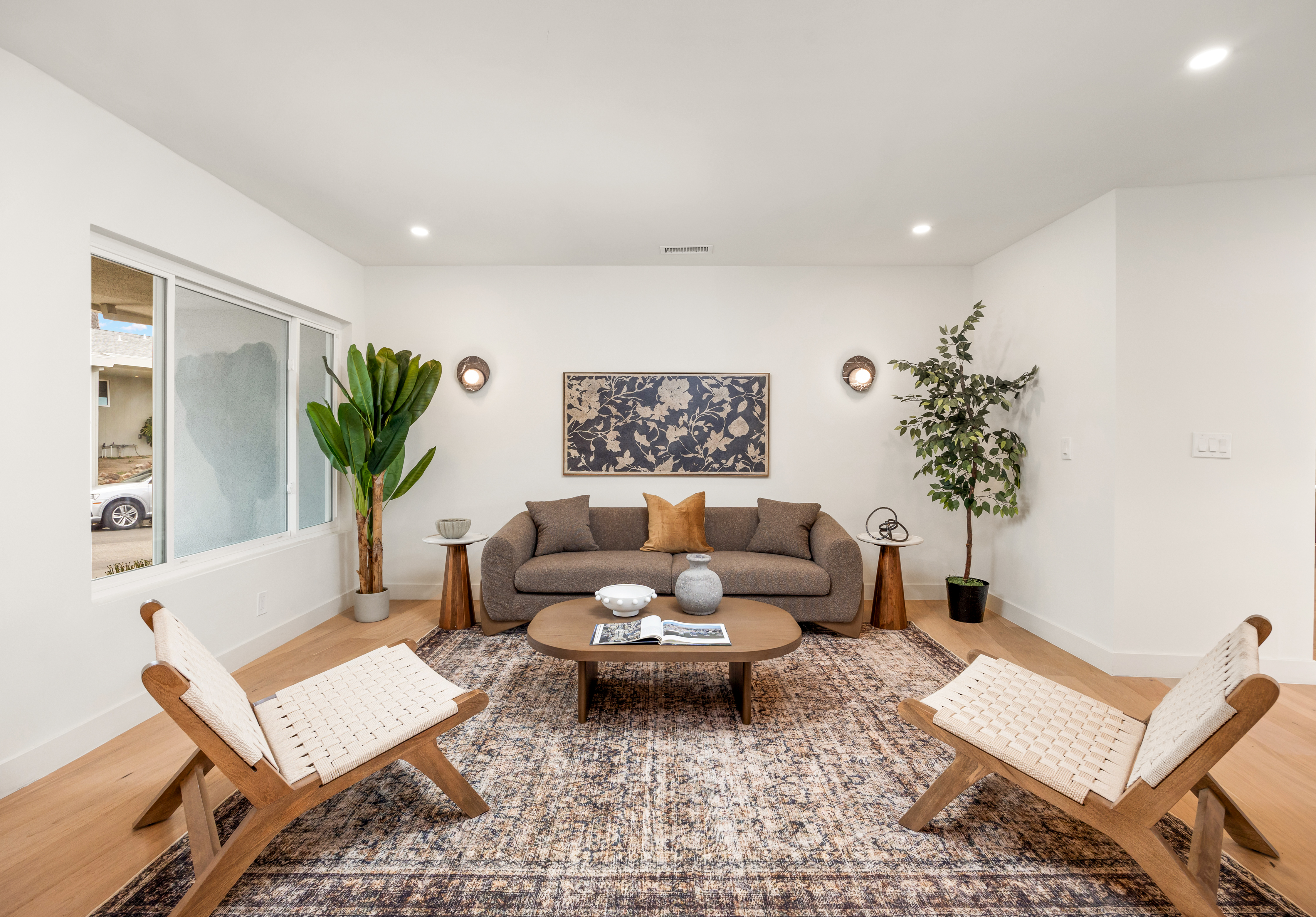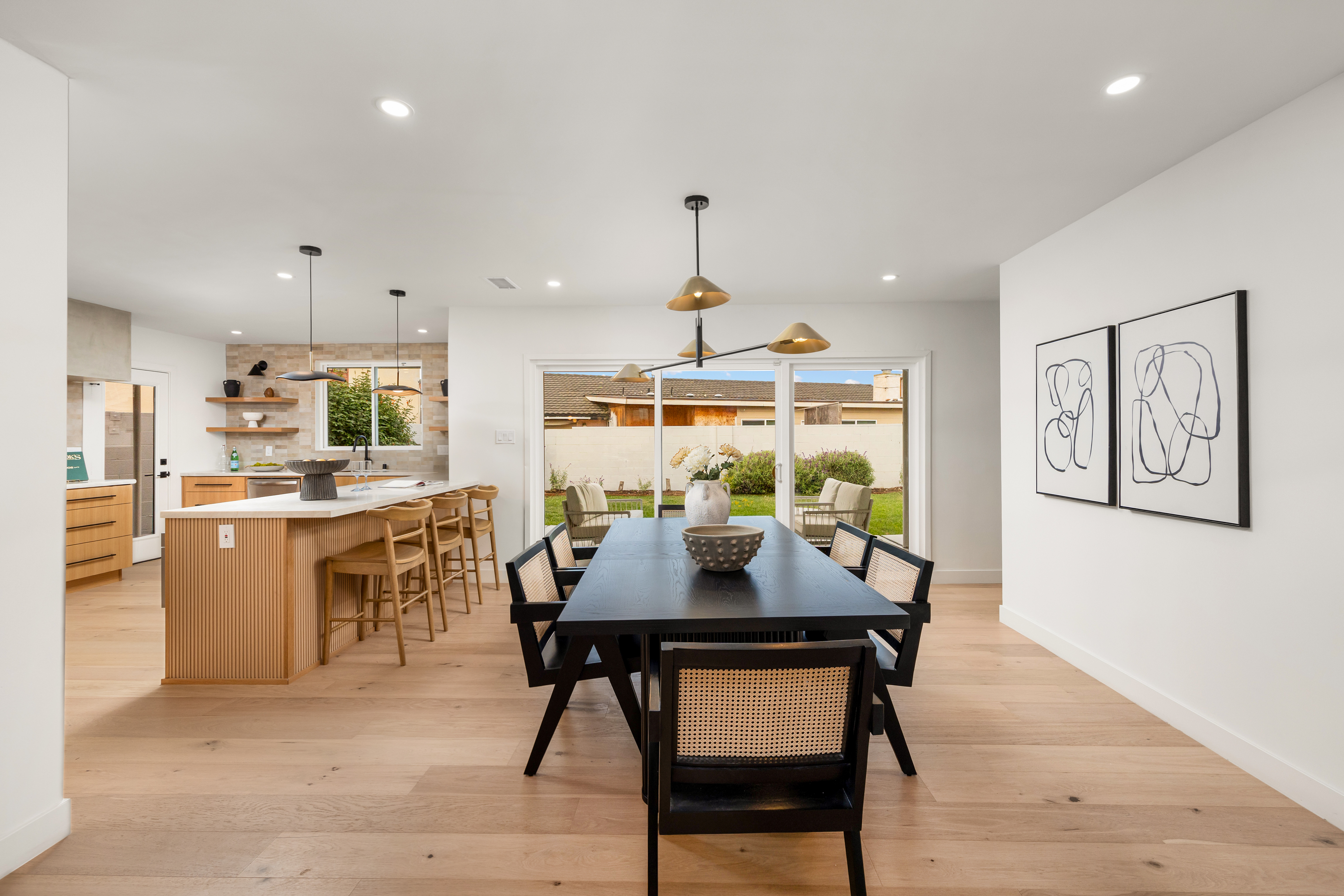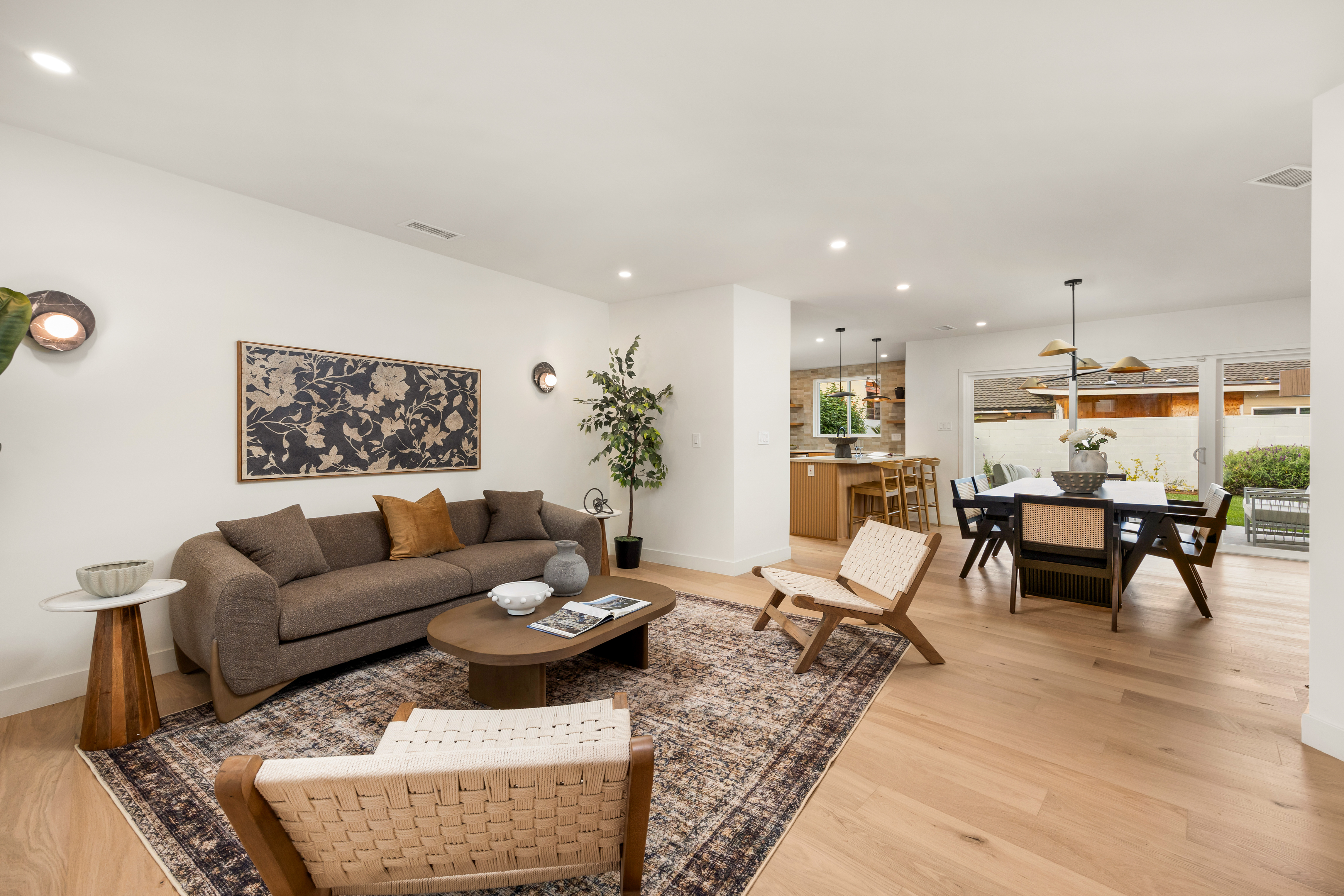 Thoughtfully reimagined from the inside out, this single-story Baldwin Hills residence pairs classic mid-century architecture with curated, contemporary finishes throughout. Wide-plank engineered hardwood flows through an open layout connecting two living spaces, dining room, and kitchen grounded by two fireplaces. A dedicated dry bar zellige tile backsplash and wine fridge carries its own design identity off the living room. The designer kitchen is the home's centerpiece two-tone cabinetry pairing white with oak cabinets, quartz countertops, tile backsplash, reeded-base island, pot filler, and stainless appliances. The primary suite offers a slatted wood accent wall, walk-in closet, and spa-inspired bath with a dual floating vanity, marble-look countertops, and a tile shower with rain head and frameless glass enclosure. Additional bedrooms are served by a secondary full bath with a warm wood floating vanity, while the powder room makes a statement with bold graphic-print wallpaper, a floating vanity, and vessel sink. Large sliding doors open to a private backyard with a covered patio, lush lawn, and mature landscaping. Owned solar adds year-round efficiency. Minutes from SoFi Stadium, the Forum, USC, and the energy of Downtown Los Angeles..
