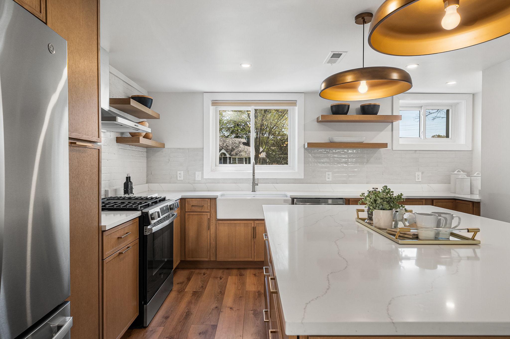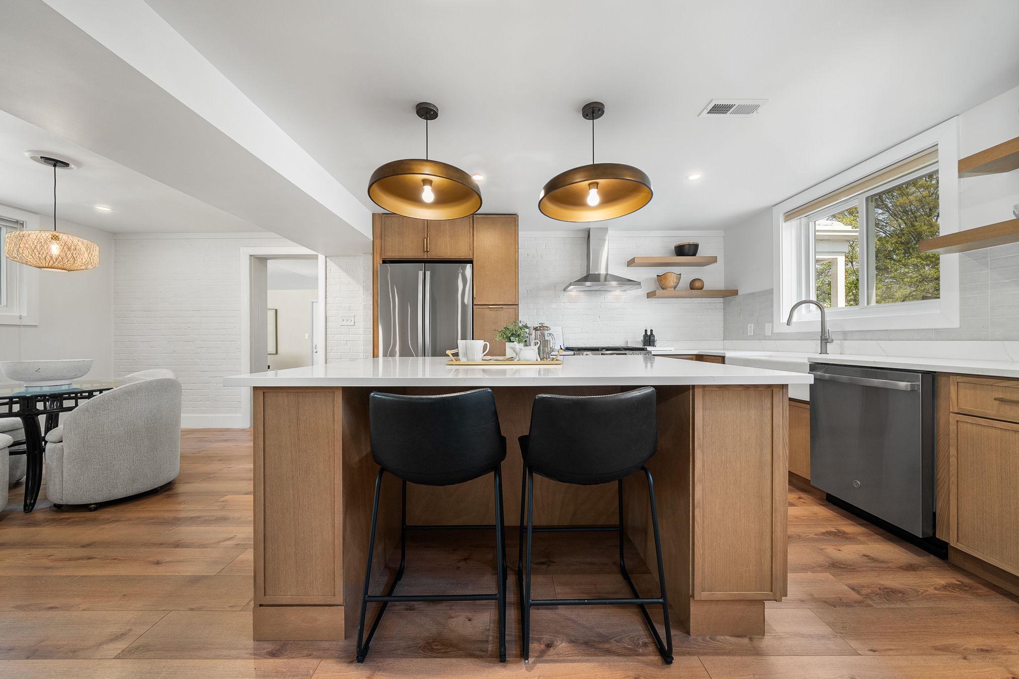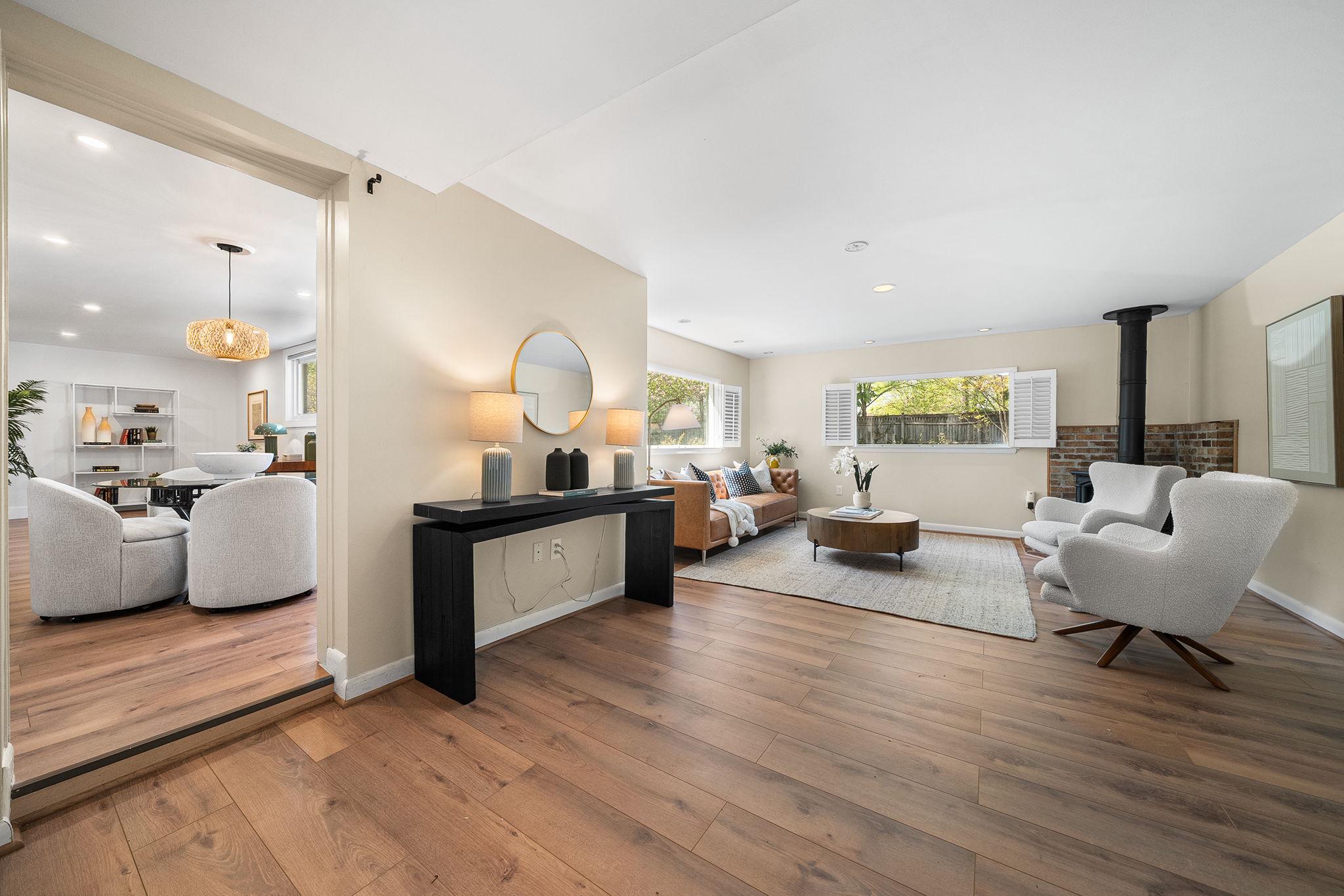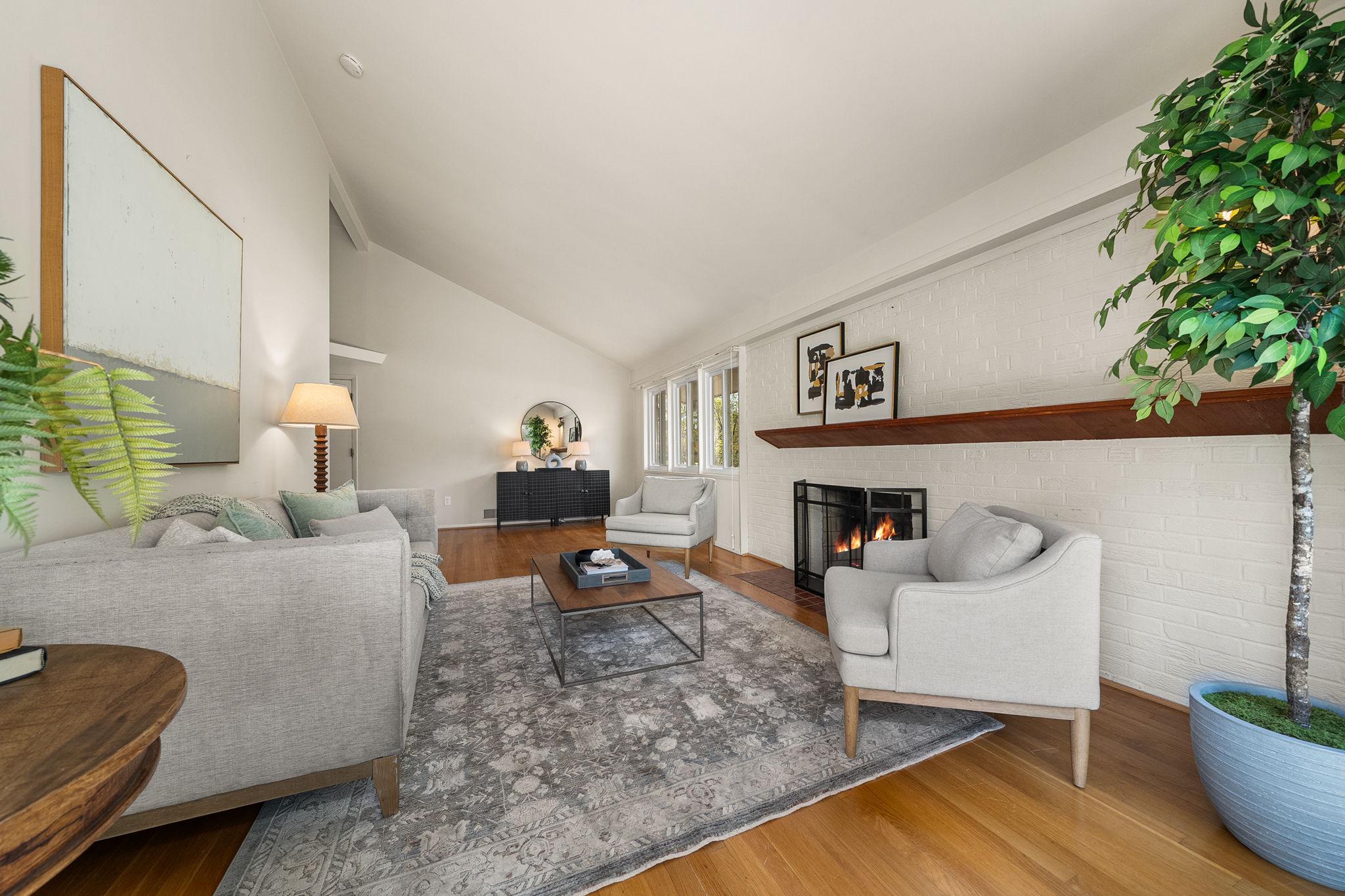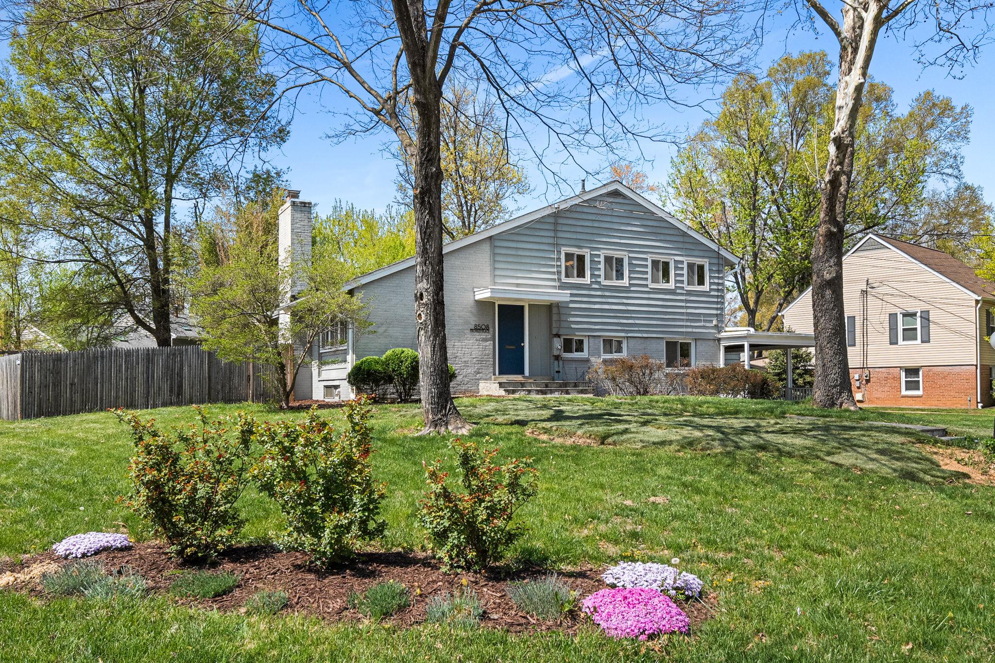 This exceptional expanded Dover model offers a bright open concept floorplan with 4 levels, 3 bedrooms, 2.5 bathrooms, and 2,544 square feet of thoughtfully designed living space on a prominent 0.33 acre corner lot, directly across from Waynewood Elementary School in one of Fort Hunt's most established communities! The newly renovated and expanded kitchen and dining area serve as the home's centerpiece. Custom light wood cabinetry with gold-toned hardware, white subway tile backsplash, floating shelves, a stainless steel hood and appliances, and a farmhouse sink framed by a large window create a refined yet welcoming aesthetic. A generous island with seating for two flows into a dining space with an adjoining play/flex area (great office space, den or playroom). Just off the kitchen and dining area is a the family room complete with access to the carport, a second fireplace and large picture windows overlooking the backyard. The sun drenched living room features a soaring vaulted ceiling, expansive windows, a wood-burning fireplace and sliding doors to the backyard. Two fully renovated bathrooms exude spa-like elegance. The gorgeous full bath upstairs is flooded with natural light and features a striking shower of deep green vertical stack-bond tile with gold fixtures, custom wood tone vanity, and built-in alcove storage featuring natural wood shelving and custom fluted wood cabinetry for storage. Three upper-level bedrooms are complemented by a convenient half bath. The largest bedroom includes 2 closets. The basement provides storage, a workbench, and laundry area. Additional highlights include a carport and a fully fenced backyard and raised garden beds perfect for entertaining, relaxing or gardening. Stroll across the street to Waynewood Elementary, or down the street to the neighborhood park and pool and the Mount Vernon Bike Trail. Conveniently located just minutes from Old Town Alexandria, a short drive to Reagan National Airport, and offering easy access to the George Washington Memorial Parkway, this home showcases beautifully updated interiors in the beloved Waynewood neighborhood! Kitchen and both full bathrooms (2025), Hot water heater (2024), Trane HVAC (2020), Roof (2017).