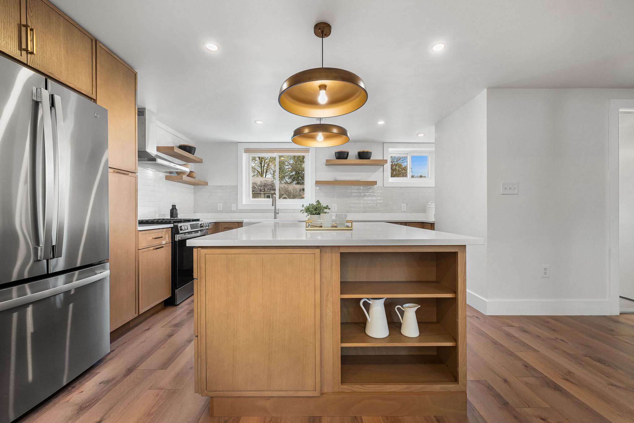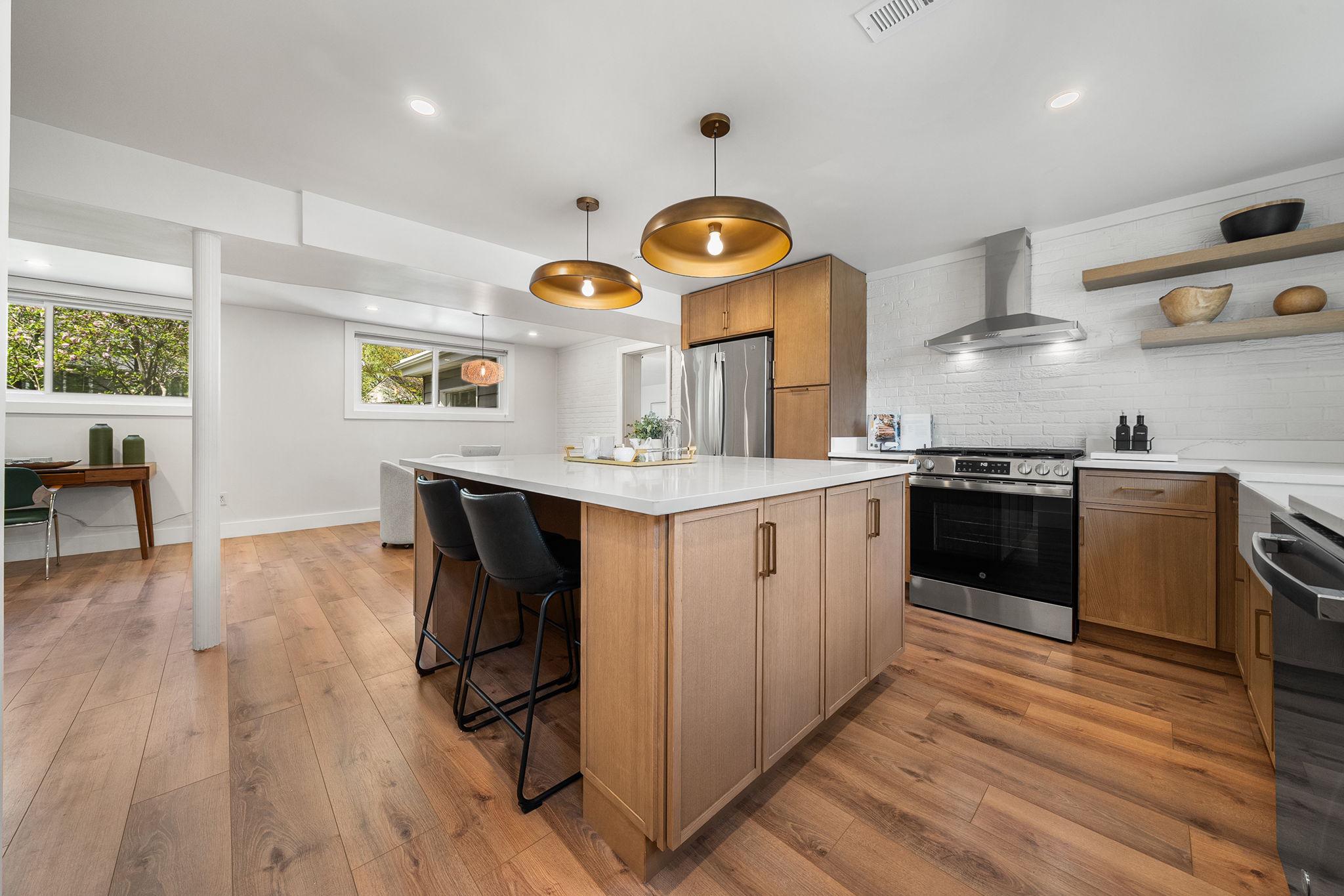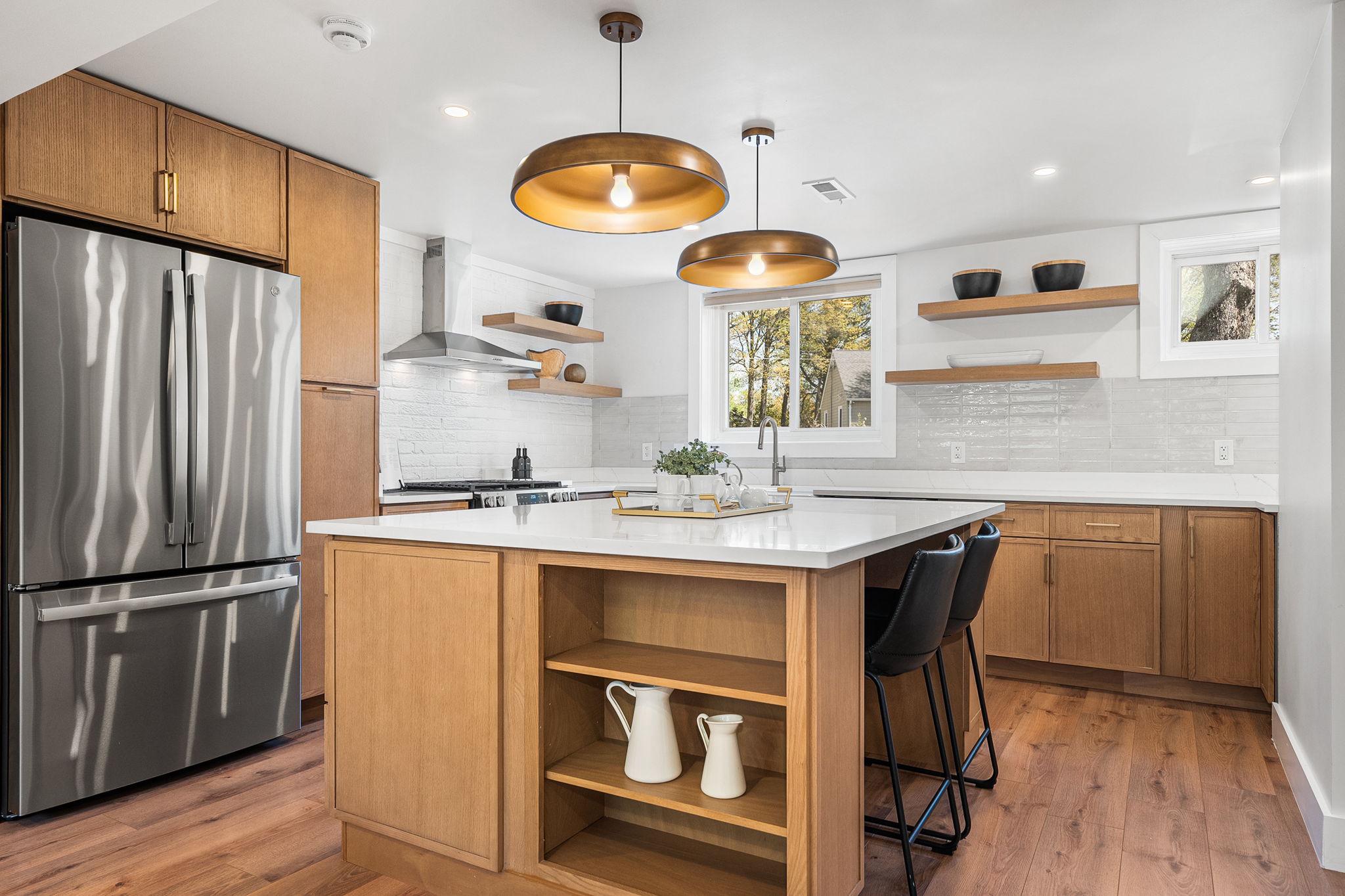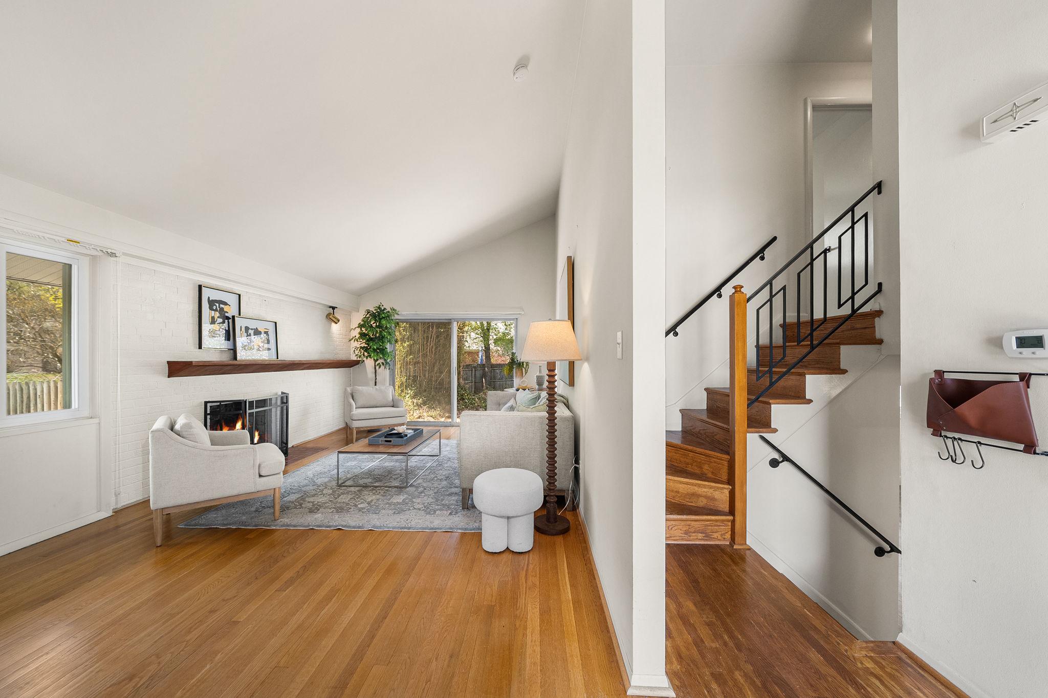 This exceptional expanded Dover model offers a bright open concept floorplan with 4 levels, 3 bedrooms, 2.5 bathrooms, and 2,544 square feet of thoughtfully designed living space on a prominent 0.33 acre corner lot, directly across from Waynewood Elementary School in one of Fort Hunt's most established communities! The newly renovated and expanded kitchen and dining area serve as the home's centerpiece. Custom light wood cabinetry with gold-toned hardware, white subway tile backsplash, floating shelves, a stainless steel hood and appliances, and a farmhouse sink framed by a large window create a refined yet welcoming aesthetic. A generous island with seating for two flows into a dining space with an adjoining play/flex area (great office space, den or playroom). Just off the kitchen and dining area is a the family room complete with access to the carport, a second fireplace and large picture windows overlooking the backyard. The sun drenched living room features a soaring vaulted ceiling, expansive windows, a wood-burning fireplace and sliding doors to the backyard. Two fully renovated bathrooms exude spa-like elegance. The gorgeous full bath upstairs is flooded with natural light and features a striking shower of deep green vertical stack-bond tile with gold fixtures, custom wood tone vanity, and built-in alcove storage featuring natural wood shelving and custom fluted wood cabinetry for storage. Three upper-level bedrooms are complemented by a convenient half bath. The largest bedroom includes 2 closets. The basement provides storage, a workbench, and laundry area. Additional highlights include a carport and a fully fenced backyard and raised garden beds perfect for entertaining, relaxing or gardening. Stroll across the street to Waynewood Elementary, or down the street to the neighborhood park and pool and the Mount Vernon Bike Trail. Conveniently located just minutes from Old Town Alexandria, a short drive to Reagan National Airport, and offering easy access to the George Washington Memorial Parkway, this home showcases beautifully updated interiors in the beloved Waynewood neighborhood! Kitchen and both full bathrooms (2025), Hot water heater (2024), Trane HVAC (2020), Roof (2017).