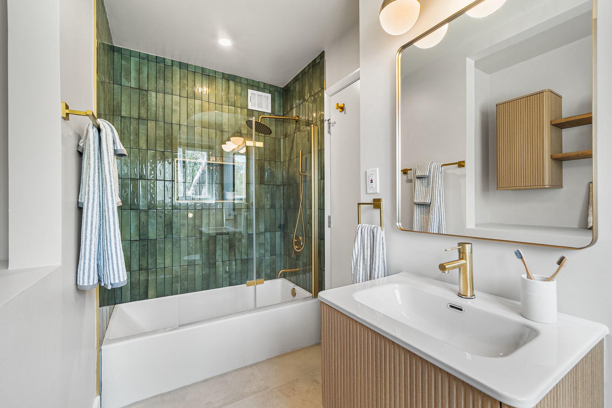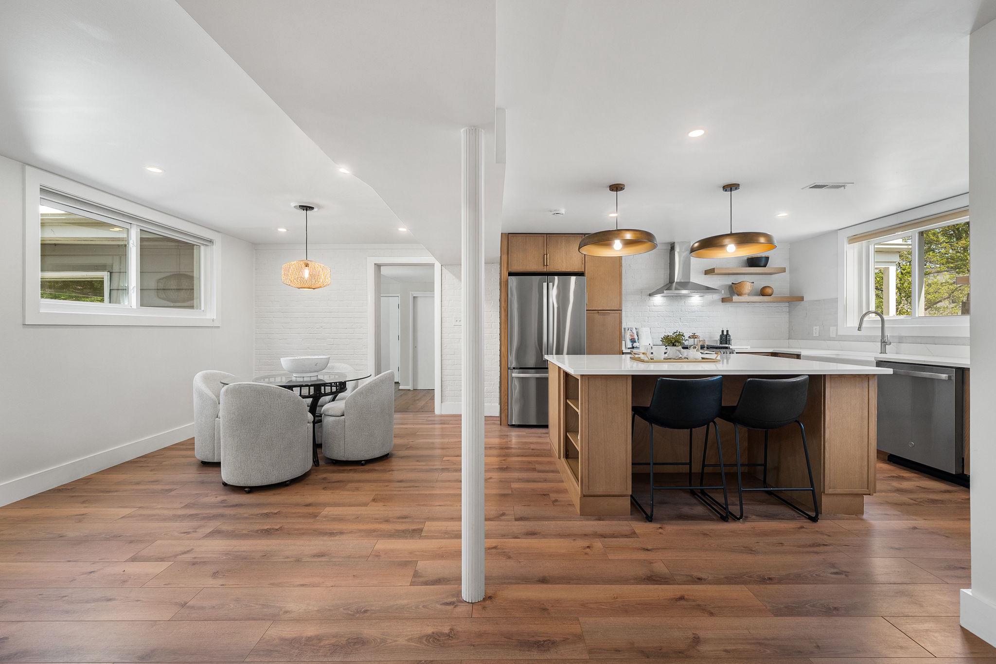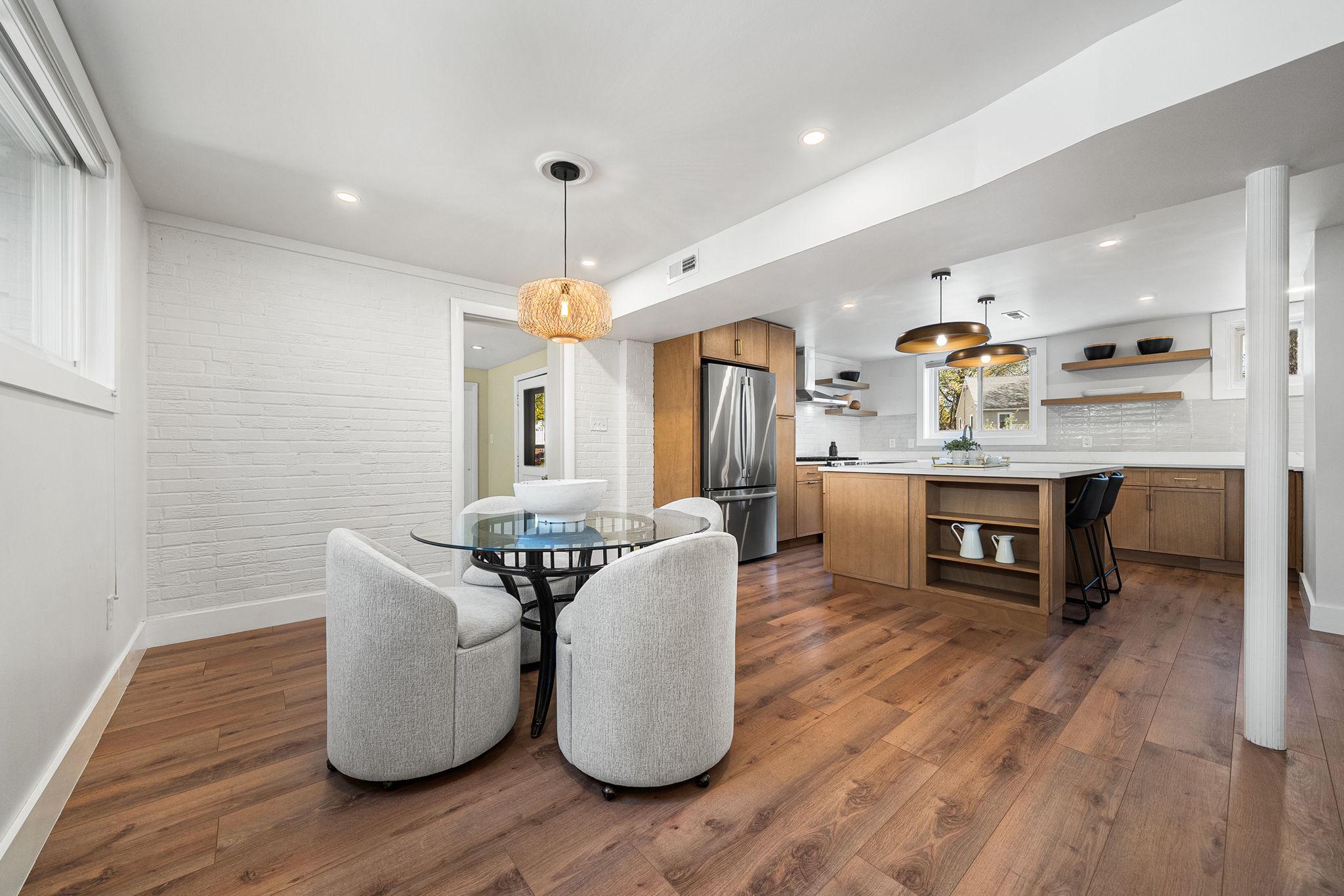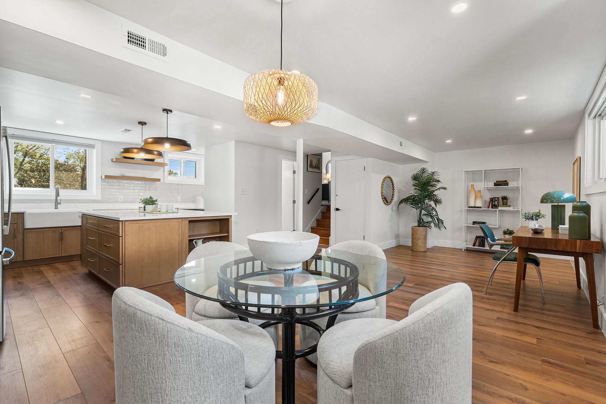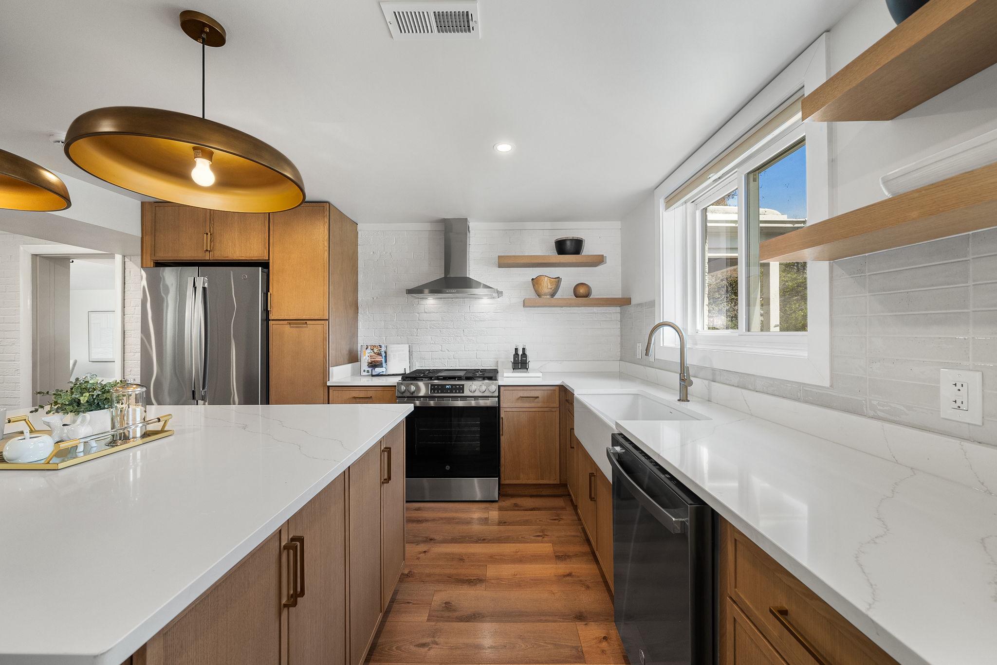 This exceptional expanded Dover model offers a bright open concept floorplan with 4 levels, 3 bedrooms, 2.5 bathrooms, and 2,544 square feet of thoughtfully designed living space on a prominent 0.33 acre corner lot, directly across from Waynewood Elementary School in one of Fort Hunt's most established communities! The newly renovated and expanded kitchen and dining area serve as the home's centerpiece. Custom light wood cabinetry with gold-toned hardware, white subway tile backsplash, floating shelves, a stainless steel hood and appliances, and a farmhouse sink framed by a large window create a refined yet welcoming aesthetic. A generous island with seating for two flows into a dining space with an adjoining play/flex area (great office space, den or playroom). Just off the kitchen and dining area is a the family room complete with access to the carport, a second fireplace and large picture windows overlooking the backyard. The sun drenched living room features a soaring vaulted ceiling, expansive windows, a wood-burning fireplace and sliding doors to the backyard. Two fully renovated bathrooms exude spa-like elegance. The gorgeous full bath upstairs is flooded with natural light and features a striking shower of deep green vertical stack-bond tile with gold fixtures, custom wood tone vanity, and built-in alcove storage featuring natural wood shelving and custom fluted wood cabinetry for storage. Three upper-level bedrooms are complemented by a convenient half bath. The largest bedroom includes 2 closets. The basement provides storage, a workbench, and laundry area. Additional highlights include a carport and a fully fenced backyard and raised garden beds perfect for entertaining, relaxing or gardening. Stroll across the street to Waynewood Elementary, or down the street to the neighborhood park and pool and the Mount Vernon Bike Trail. Conveniently located just minutes from Old Town Alexandria, a short drive to Reagan National Airport, and offering easy access to the George Washington Memorial Parkway, this home showcases beautifully updated interiors in the beloved Waynewood neighborhood! Kitchen and both full bathrooms (2025), Hot water heater (2024), Trane HVAC (2020), Roof (2017).