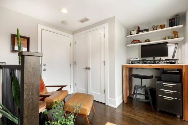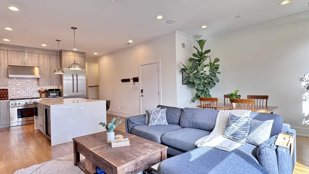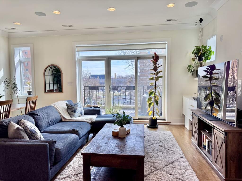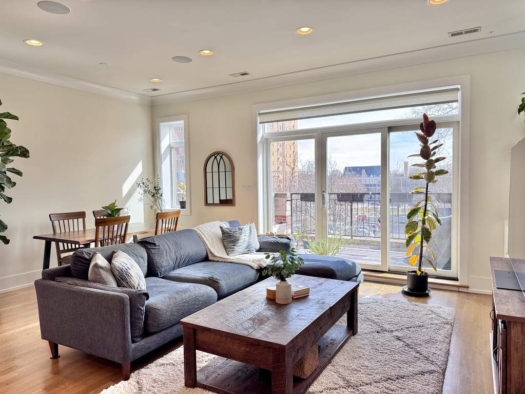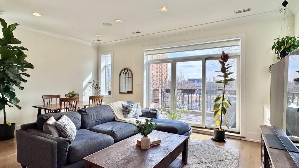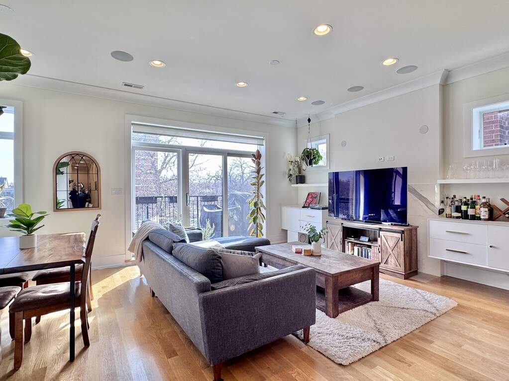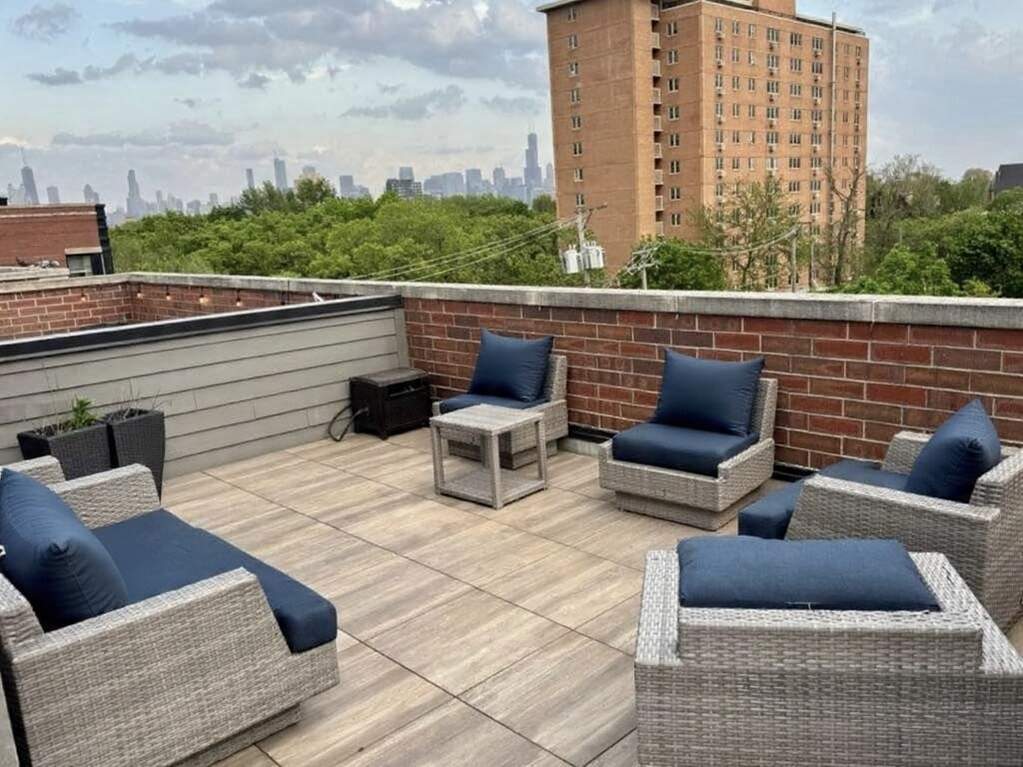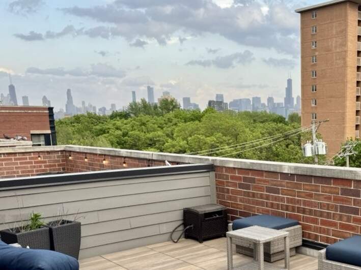 Offer Deadline Mon 3/23, 12pm. Enjoy luxury penthouse living with huge rooftop deck and main floor front balcony on a quiet tree-lined street, right off the park in Wicker Park! Like-new, this spacious 2017 new construction home on a 165' deep lot has luxury finishes throughout and is move-in ready. The owner replaced all wood decking on front balcony and enormous roof deck with maintenance-free Trex decking and will include all roof deck furniture and a new gas grill connected to a gas line, so you can enjoy entertaining and relaxing on your incredible outdoor space the minute you move in. The beautiful chef's kitchen has high-end Thermador stainless steel appliances, vented hood, beverage refrigerator and microwave built-in to the island with waterfall quartz countertops at both ends and space for four bar stools. Facing South, the living and dining rooms are filled with natural light throughout the day with tree-top and top of the skyline views. Built-in white cabinets on each side of the gas log fireplace with large porcelain slab surround and hearth. Enjoy the home audio system with receiver in living room and speakers in living room, balcony, rooftop deck, all 3 bedrooms and primary bathroom. Three large bedrooms with organized closets, two luxury bathrooms, on one level. The primary bedroom easily fits a king-size bed and nightstands, has a large walk-in closet, and spa-like bathroom with spacious glass shower with rainfall & traditional shower heads, steam and bench, separate white vessel soaking tub, water closet, beautiful double vanity with quartz counter, and heated floors. Hardwood floors, organized closets, high ceilings, 8' solid wood doors throughout, open concept layout, nest thermostat, wifi touchpad locks, light-weight concrete between floors for sound insulation, all brick construction, internal stairs to bonus room that can be home office or store all your outdoor cushions & supplies. Your private rooftop deck has porcelain tile in the front section with full skyline view from the Hancock Building to the Sears Tower and owner added maintenance free Trex decking to the rest of the enormous roof deck with pergola, gas line, speakers, and all roof deck furniture and umbrella are included! Garage parking and extra storage included. Low HOAs $322.23; Strong Reserves $14,000; All brick 2017 new construction building. Ideal Wicker Park location, just off the park with new renovated dog park, farmers markets on Sundays, movies & yoga in the park, fountain, basketball court, ball field, kids playlot, Halloween fests & more. Short walk to the Damen blue line train, Big Star, and every type of restaurant & boutique shop on Damen, Milwaukee, North Ave and Division streets.