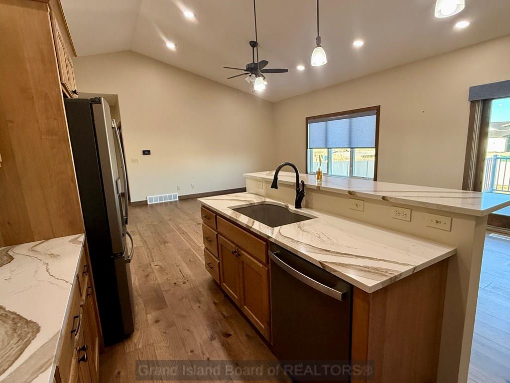 Open-concept ranch in desirable NW neighborhood! Spacious and thoughtfully designed home offers 5 bedrooms, 3 baths, full finished basement with large family room, 2 bedrooms and bath, vaulted living room, well-designed kitchen with pull-up bar seating, plus ample dining table space. Spacious master with private 3/4 bath and large walk-in closet that adjoins the laundry/mudroom for everyday convenience. 12x13 composite deck, UGS, fenced backyard, all window coverings stay, including the remote patio door shade. Floors in the kitchen, dining, and living room are vinyl plank. Fence new in 2025. HOA covers pond lift station.