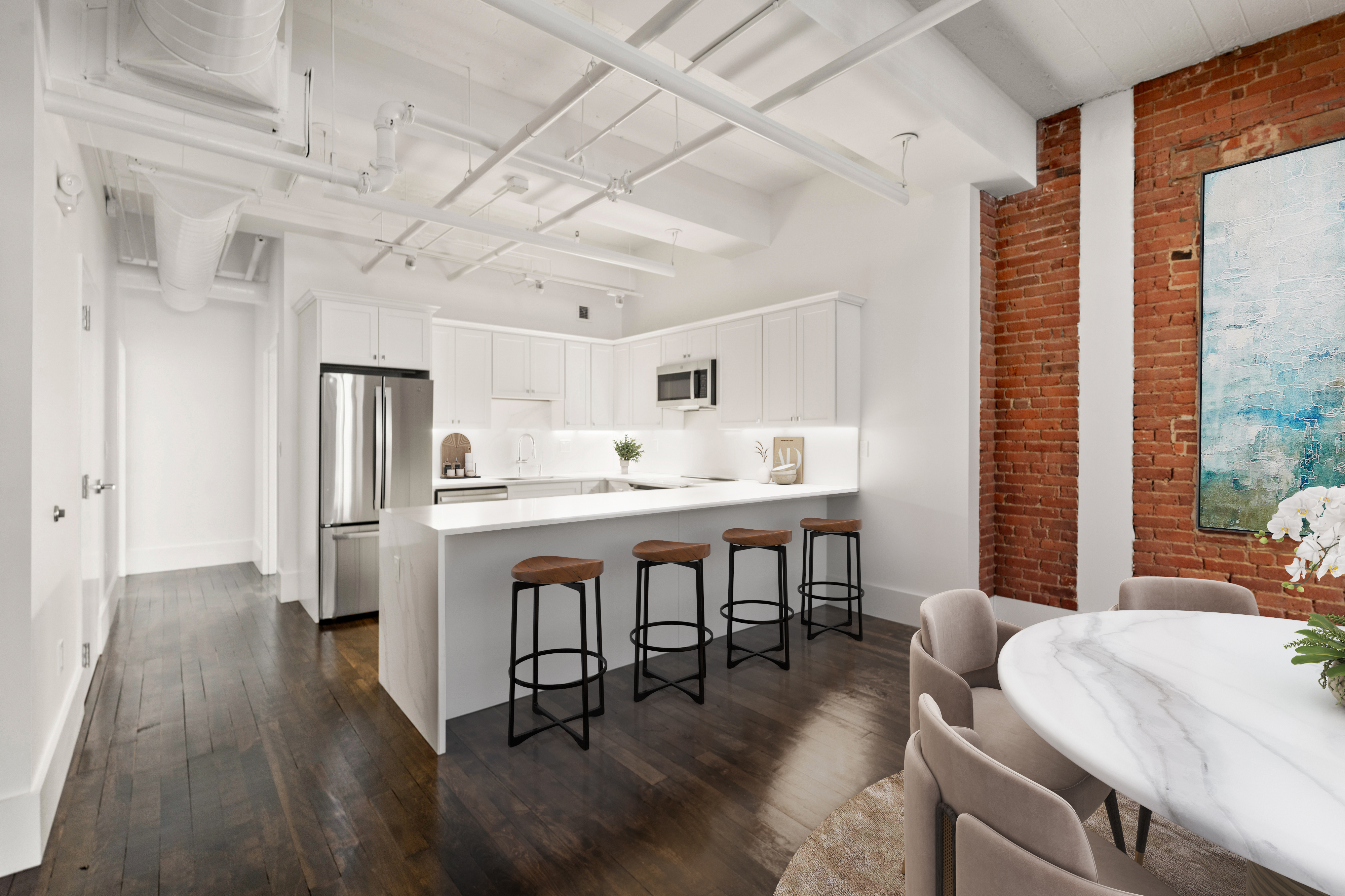Completely renovated three bed and two bath Downtown loft steps to Financial District, Waterfront and Greenway. Direct elevator access leads to 5th floor condo with 10' concrete ceilings, exposed brick and original hardwood floors. Open floorplan with large living / dining area with views of Finanical District and peeks towards Rowes Wharf and Boston Harbor. Beautifully renovated kitchen with white cabinets, quartz waterfall counters and GE Profile appliances. Primary suite features en-suite tile bathroom. second bedroom has exposed brick walls with adjacent bathroom with large glass door shower. Third bedroom overlooks High Street and downtown Boston. Laundry room with storage and additional refrigerator. Located in the heart of Boston with easy access to dining, shopping and major transportation. This new condo conversion provides a unique opportunity for owners and landlords: no short term rental restrictions.