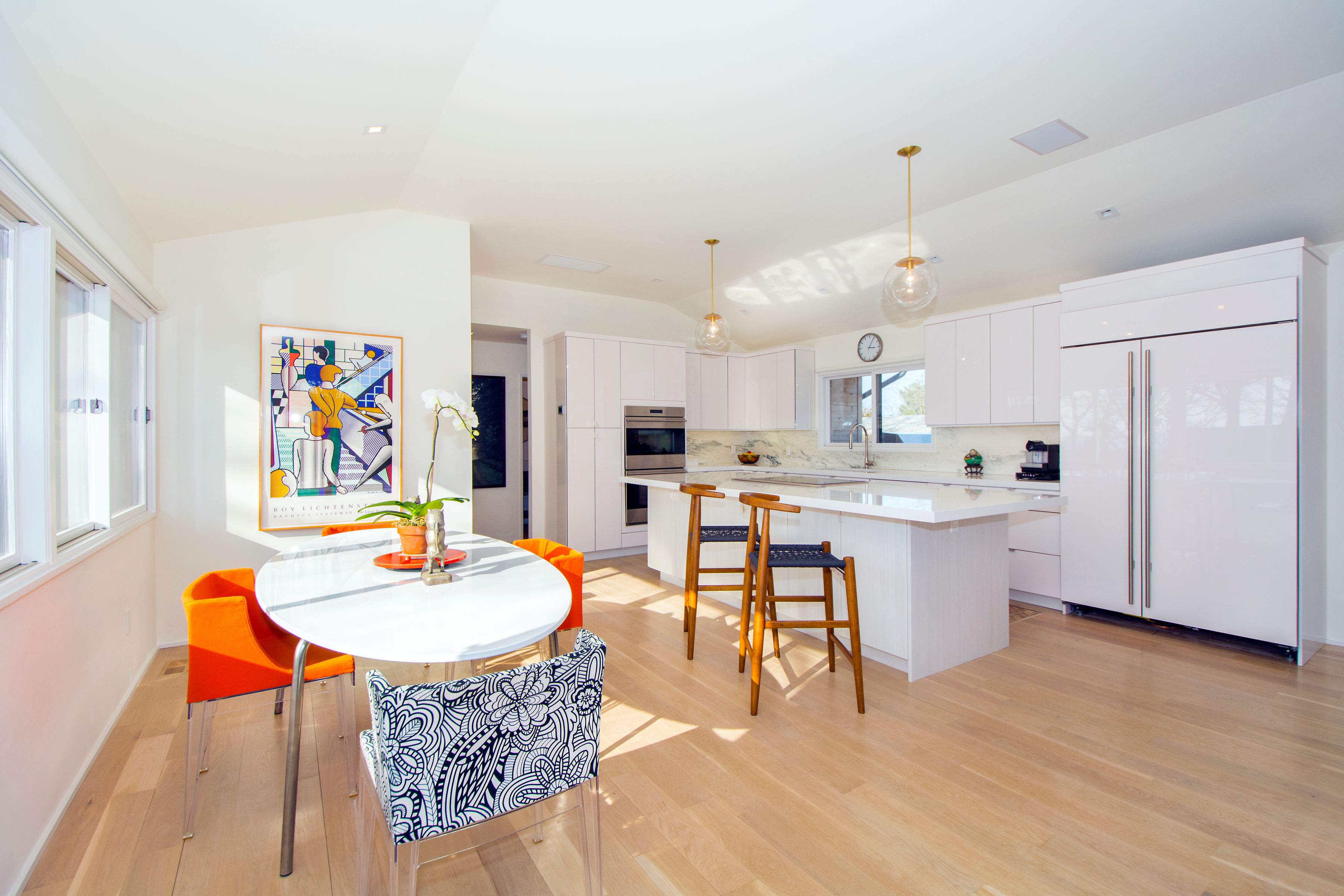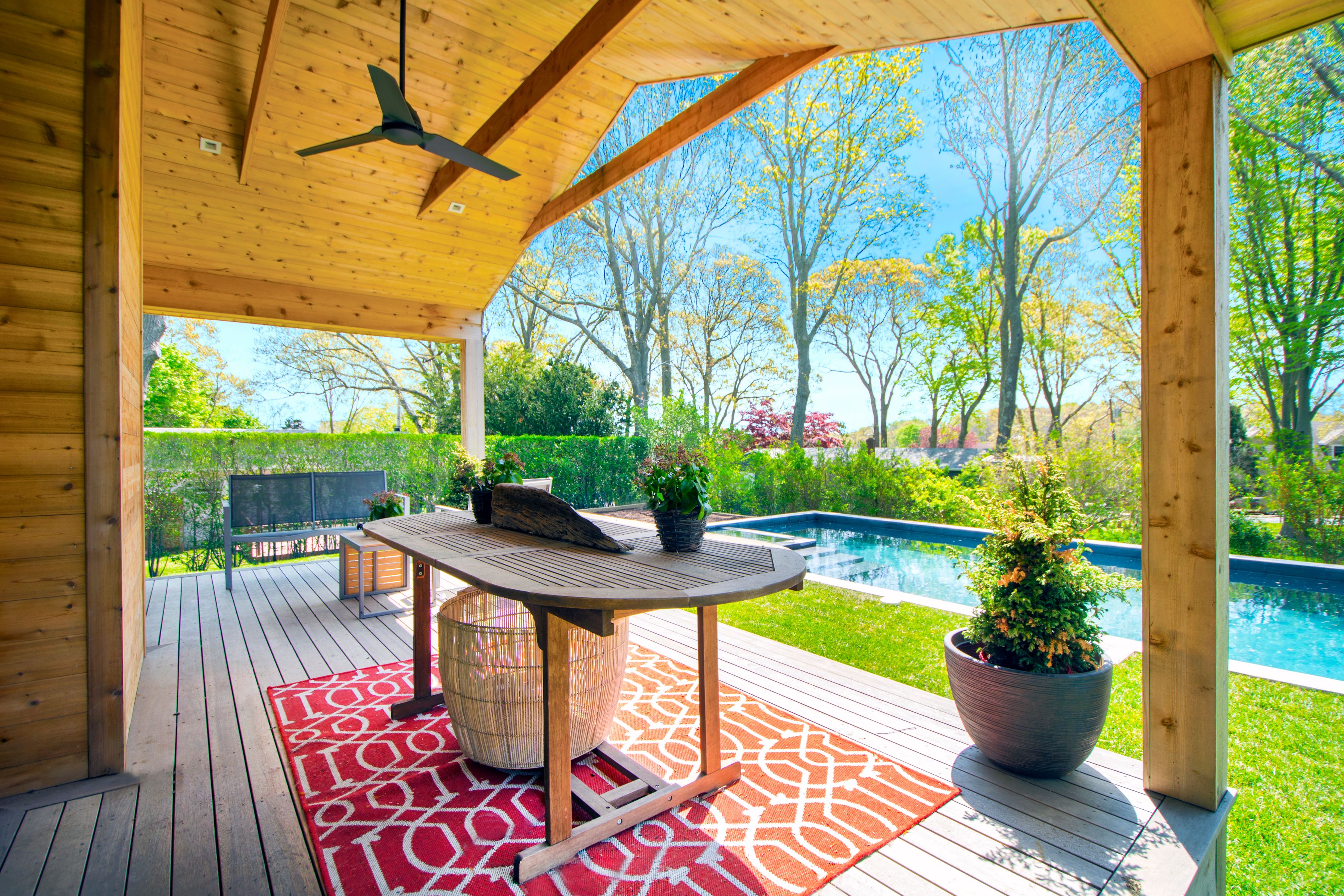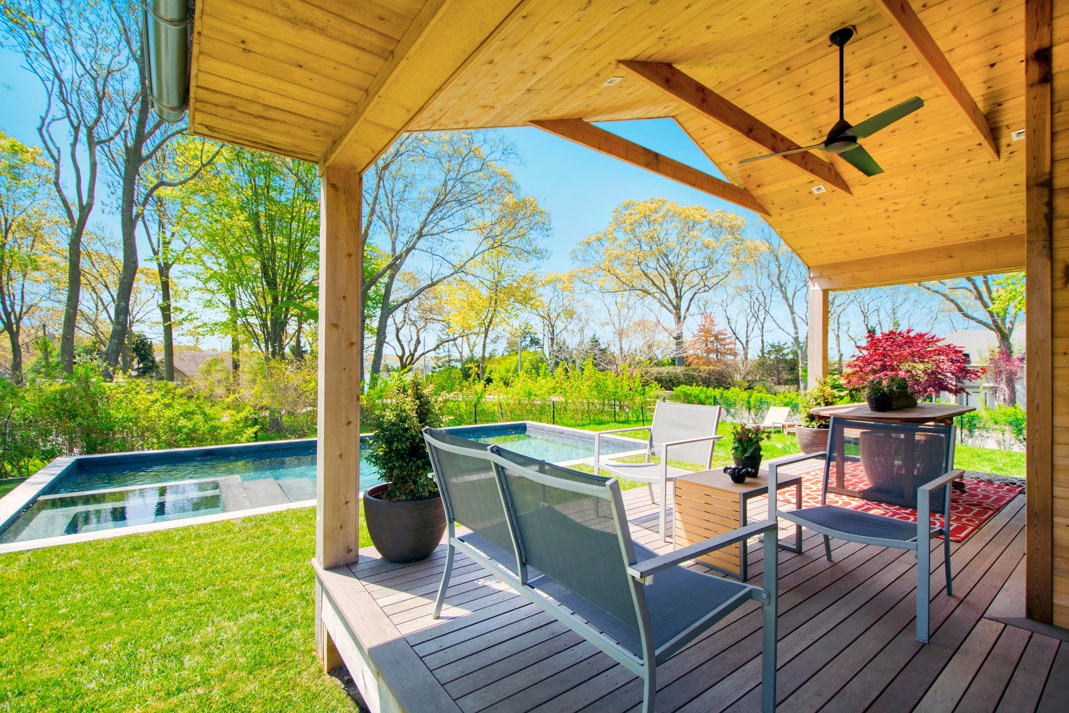 Super-stylish, recently renovated, mid-century modern beach house in Bay Point, offers water views from almost every window, plus outdoor decking, and Gunite pool with Jacuzzi. The sleek open floor plan features fully-automated systems everywhere, from the main living spaces to the master suite and guest suite. The super-modern dine-in kitchen with large center island includes all top appliances, open dining, and doors out to a back deck with Viking BBQ. The living area with fireplace opens to the covered side deck overlooking the pool. The lower level includes the third bedroom, laundry room with laundry chute and access to the attached one-car garage. Flat screen televisions and remote control audio-visual systems included, automated black-out shades in the master suite. Excellent rental offering, hot Long Beach location, waterfront community, easy bicycle ride to Sag Harbor Village. [[Rental Registration # RP241954]] EH RR #: RP241954