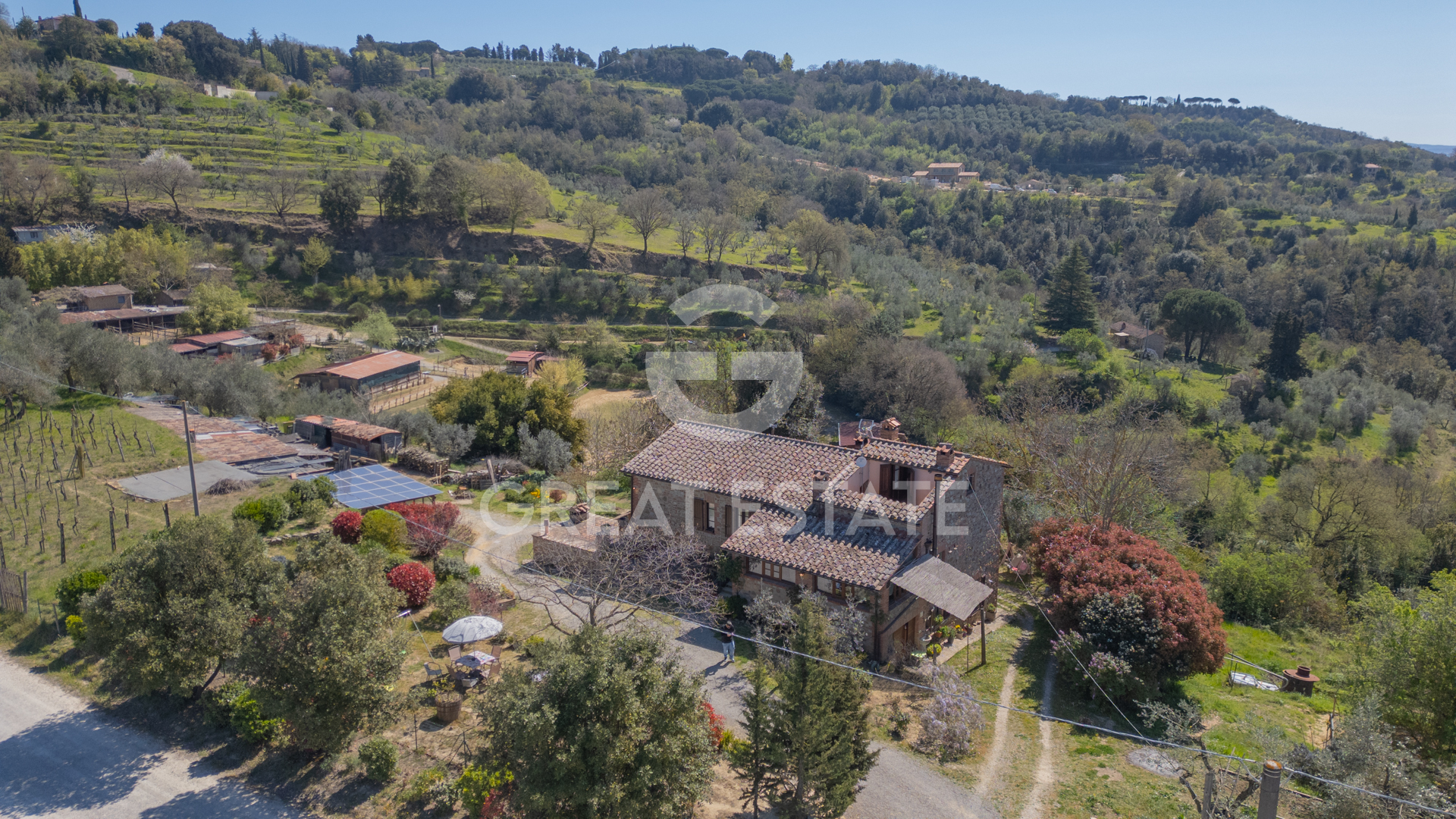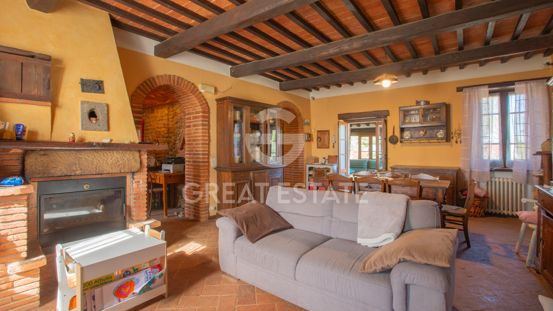 A fabulous atmosphere of peace and privacy welcomes you into a setting that expresses authenticity and architectural coherence. The farmhouse features quality finishes, the result of a careful restoration that enhanced the original materials while integrating functional and durable solutions.The load-bearing stone walls, dating back to the time of construction, display a compact and well-preserved texture; during the renovation they were reinforced and re-pointed with compatible mortars, preserving the historic structure. The foundations are stable and show no signs of settlement, while the pitched roof with traditional wooden framework and terracotta tiles ensures protection and aesthetic balance. The roof has been overhauled with replacement of worn elements and inspection of the eaves line.Inside, you walk on hand-crafted, polished terracotta floors, laid with regular joints that enhance the material character of the surfaces. The ceilings feature exposed chestnut and oak beams, wooden planking and terracotta tiles, treated and protected; the overall effect conveys a classic, warm character consistent with the rural identity. The walls alternate exposed stone and smooth plaster, finished with lime-based paints in natural tones. The plaster appears solid, free from visible cracking; the paintwork is in good condition, with soft hues that amplify the light.The window frames are in solid wood with double glazing, complete with wooden shutters; hardware and locking systems are efficient. The internal doors, in crafted wood, follow a traditional style and harmonize with the built-in furnishings. Stone window sills and thresholds contribute to material continuity.The kitchens, two separate rooms, feature masonry worktops clad in ceramic tiles and easy-to-maintain surfaces; the cabinetry integrates with the style of the house and offers functionality for daily use or hospitality. The bathrooms, four in total, are finished with good-quality ceramic coverings, well-maintained sanitary ware and fittings in adequate condition; the atmosphere recalls simplicity and stylistic coherence.The internal layout reflects the original design and offers intimate, interconnected rooms, with brick arches defining the passageways. The overall state of conservation is good, supported by consistent routine maintenance and a restoration that respected the historic structure.Externally, the exposed stone facade has been cleaned and re-pointed; the joints appear compact and regular. The courtyard and paved areas in gravel and stone ensure effective drainage. The garden, fully fenced, features well-kept paths, stone walls and a masonry well that enriches the character of the setting. There is no swimming pool, a choice that leaves room for a potential customized project in harmony with the context.Overall, you perceive a property of historic character, with classic, good-quality finishes and a solid state of preservation, ready to welcome your life project with authenticity and balance.