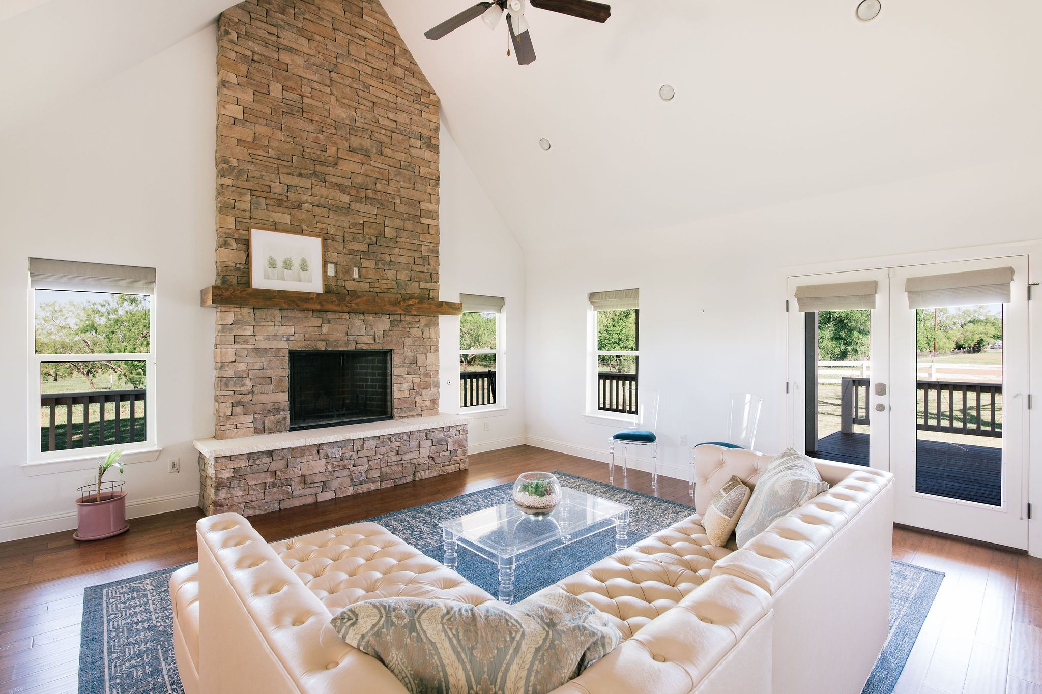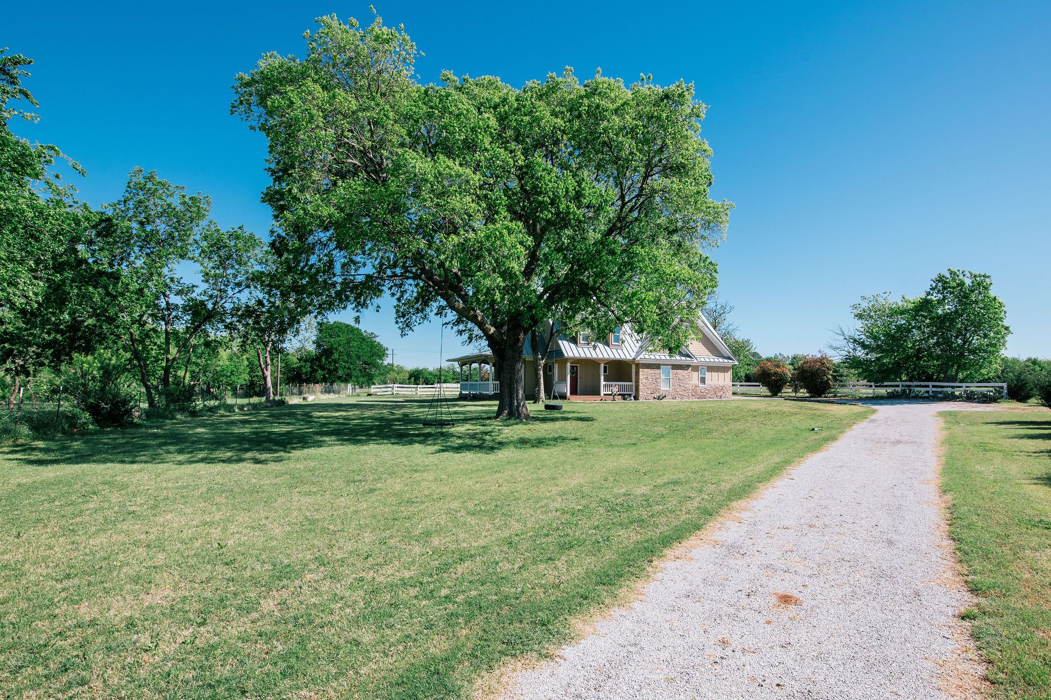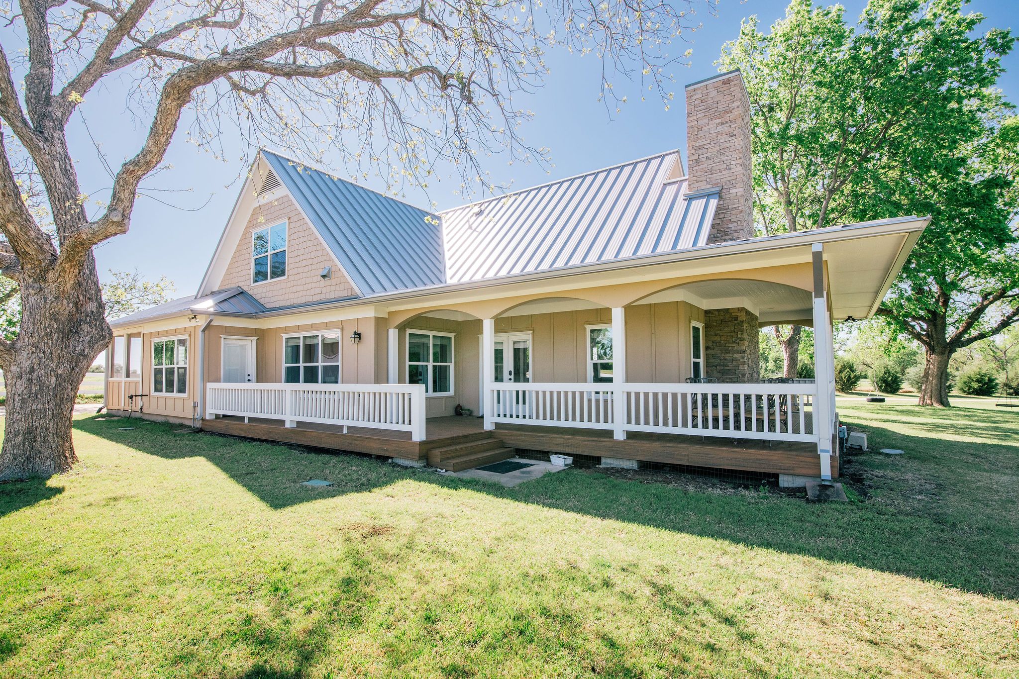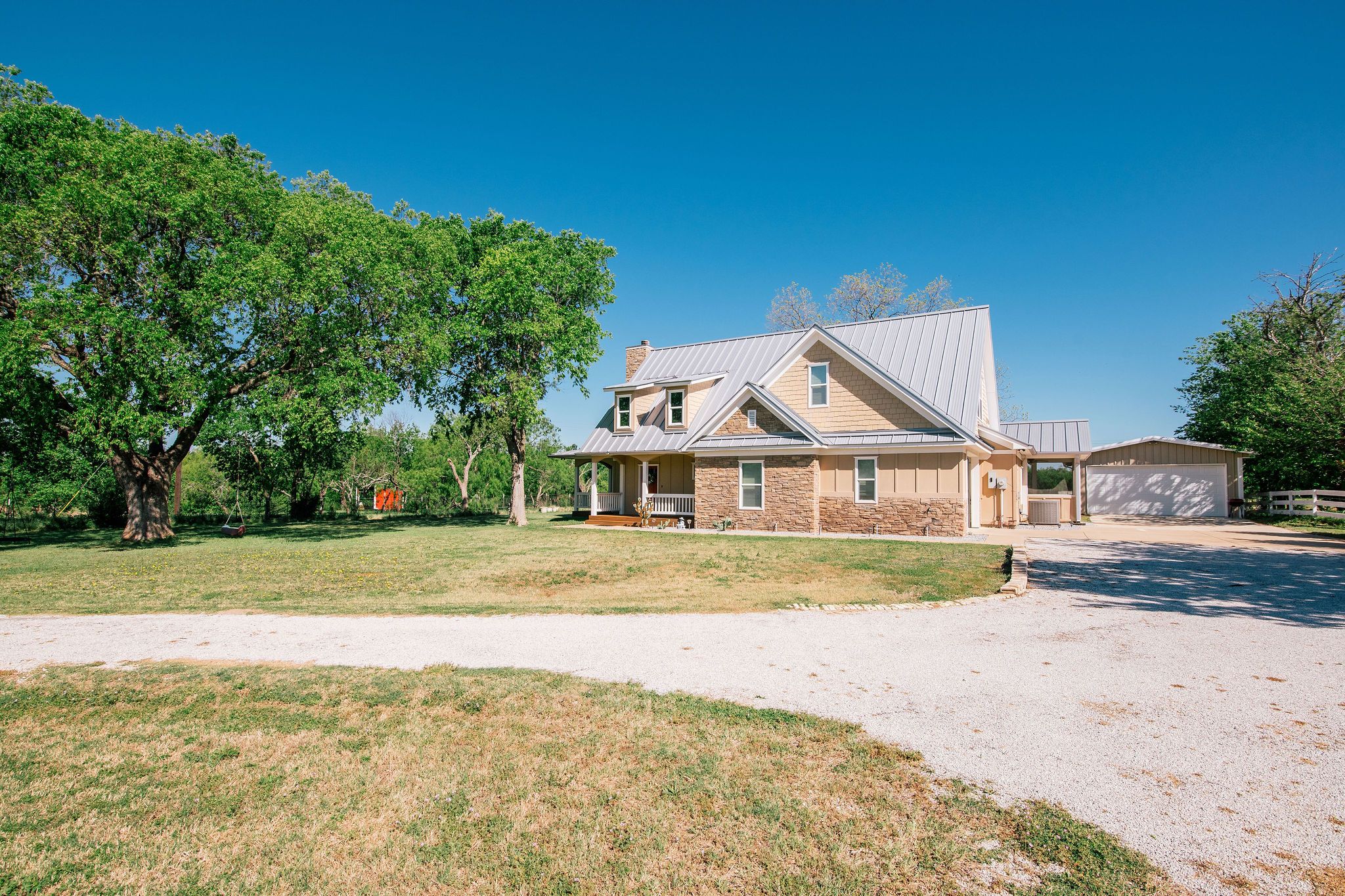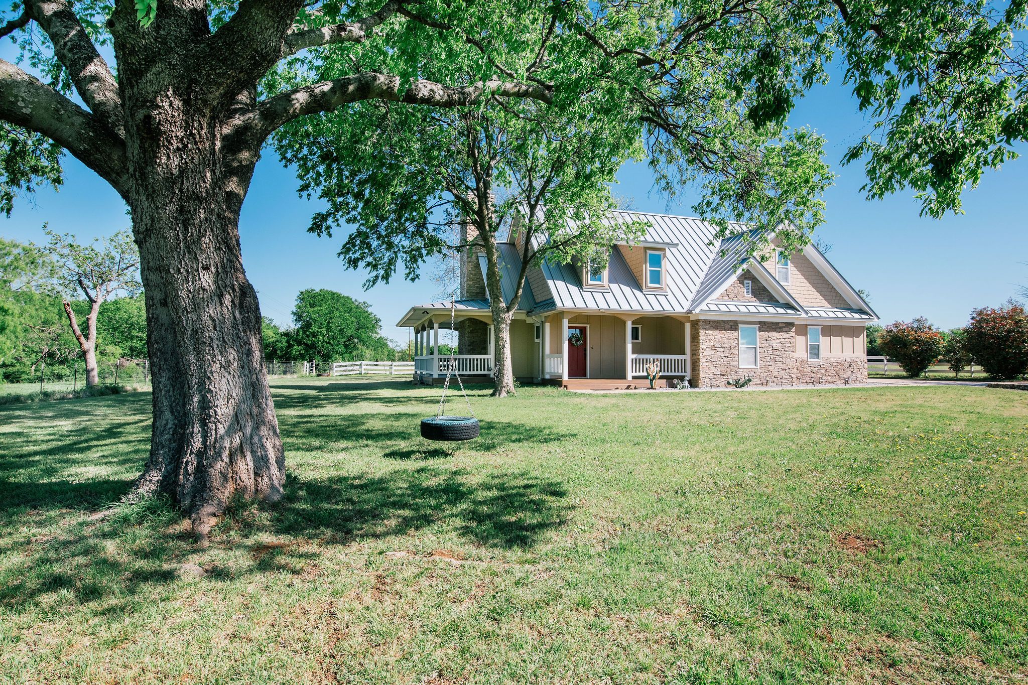 Nestled beneath mature trees and framed by sweeping views, this charming 2015 home at 9373 FM 428 offers 1,976 sq ft of warmth and character on 6.65 acres. A welcoming wrap-around porch and a private screened porch off the primary suite invite you to slow down and take it all in. Inside, a floor-to-ceiling stone fireplace anchors the living room, while rich hardwood floors and a spacious kitchen with white cabinetry, subway tile, granite counters, double ovens, gas cooktop, and farm sink make this home as beautiful as it is inviting. The main level primary suite features an ensuite bath, with two additional bedrooms upstairs. A one-car attached garage, detached two-car garage with extra storage, and well-fed sprinkler system round out this truly special property. This property could be used as a primary residence, but is being sold as a guest house to the neighboring property. Sold in conjunction with 9325 FM 428, MLS #21235502. Come experience this exceptional property.