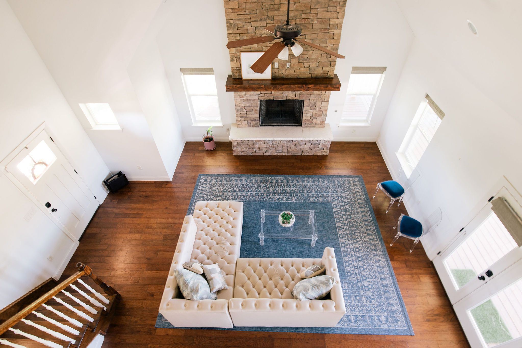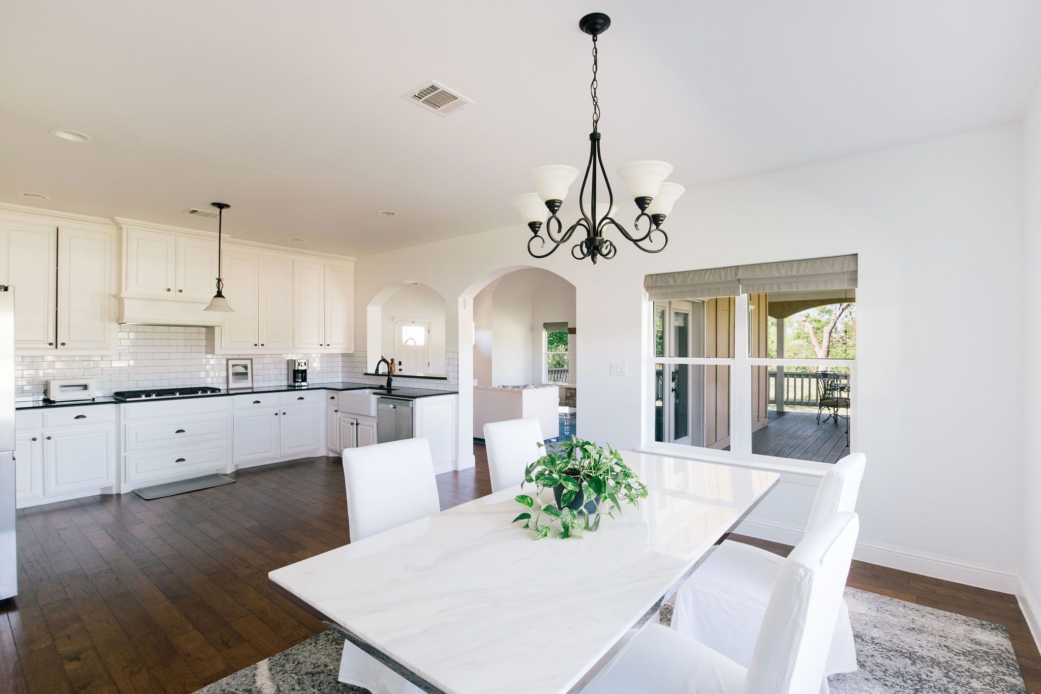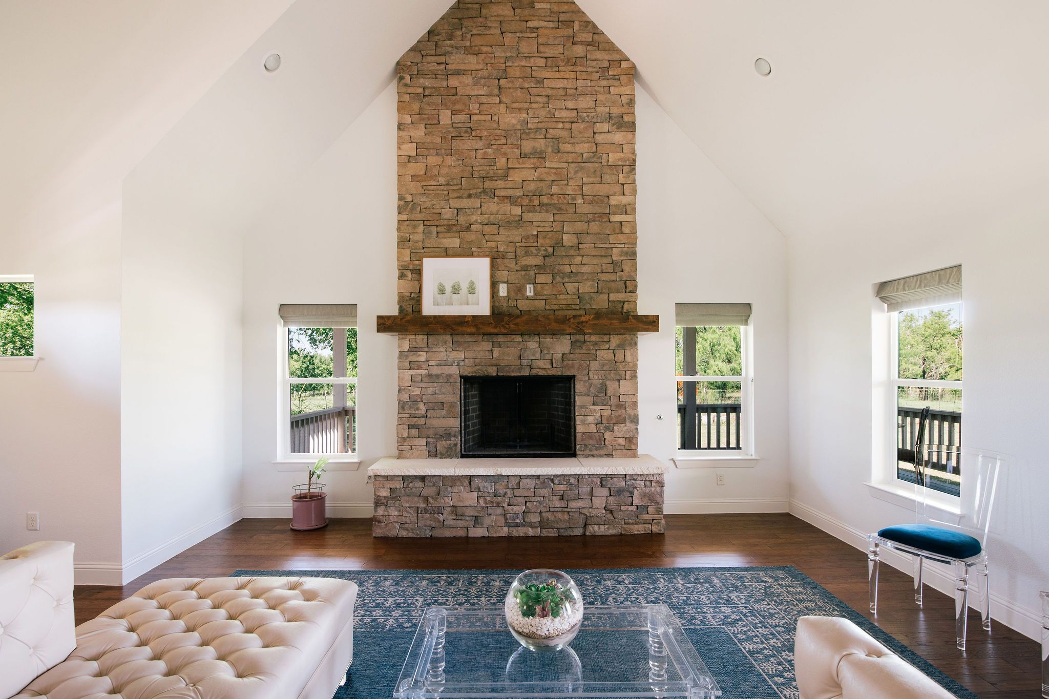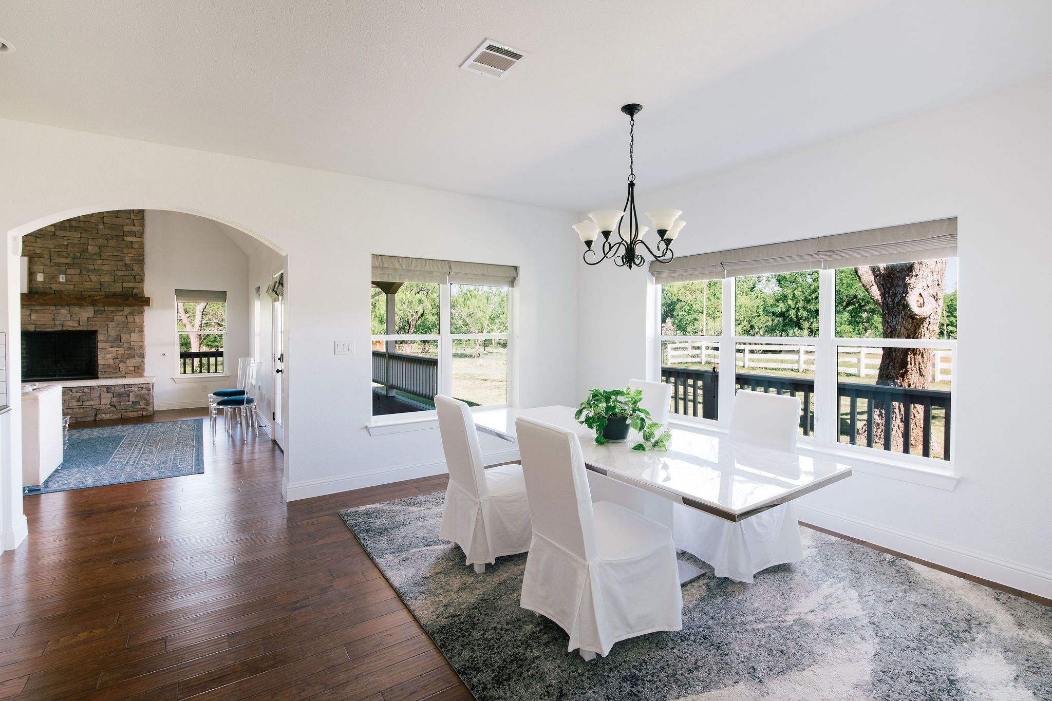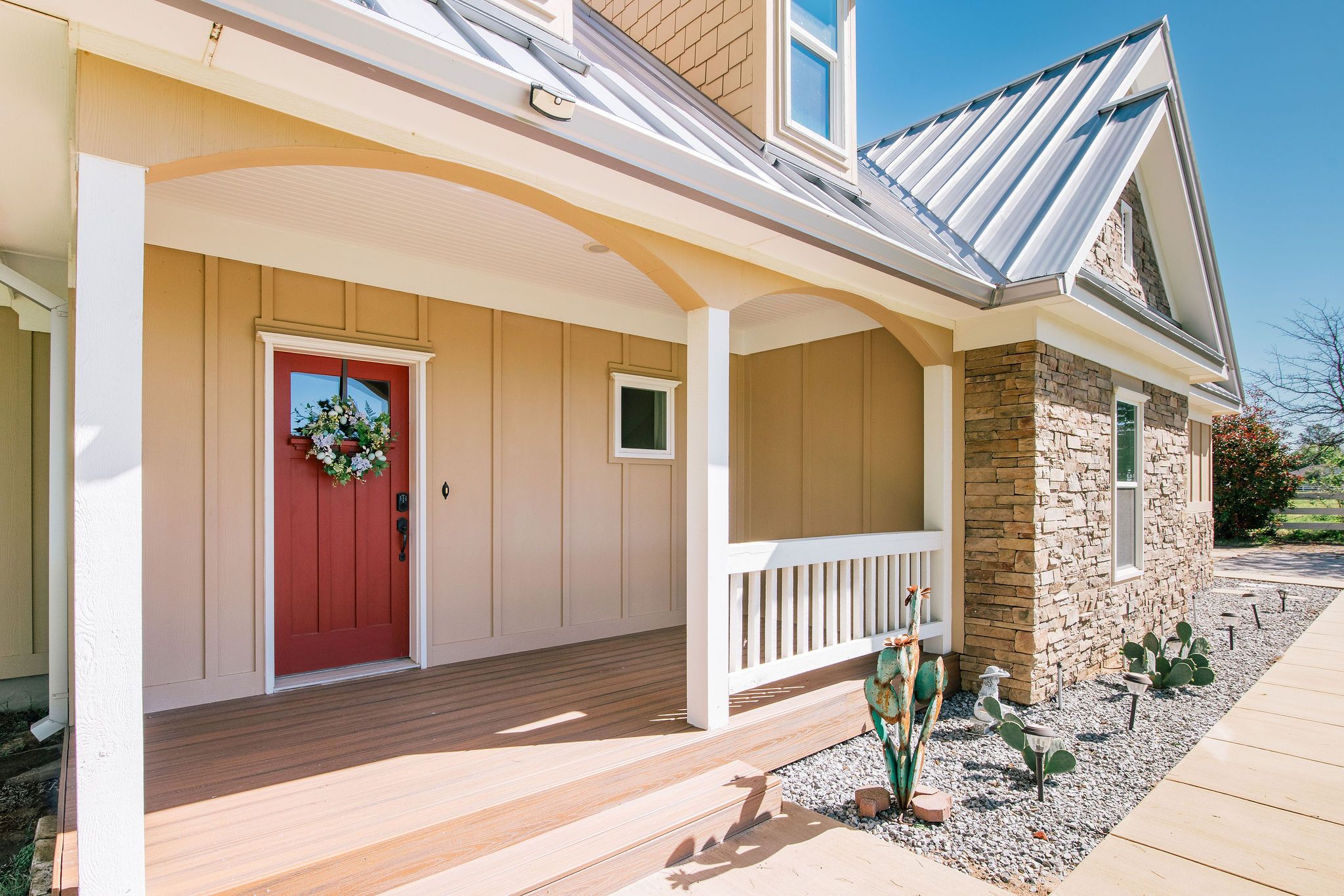 Nestled beneath mature trees and framed by sweeping views, this charming 2015 home at 9373 FM 428 offers 1,976 sq ft of warmth and character on 6.65 acres. A welcoming wrap-around porch and a private screened porch off the primary suite invite you to slow down and take it all in. Inside, a floor-to-ceiling stone fireplace anchors the living room, while rich hardwood floors and a spacious kitchen with white cabinetry, subway tile, granite counters, double ovens, gas cooktop, and farm sink make this home as beautiful as it is inviting. The main level primary suite features an ensuite bath, with two additional bedrooms upstairs. A one-car attached garage, detached two-car garage with extra storage, and well-fed sprinkler system round out this truly special property. This property could be used as a primary residence, but is being sold as a guest house to the neighboring property. Sold in conjunction with 9325 FM 428, MLS #21235502. Come experience this exceptional property.