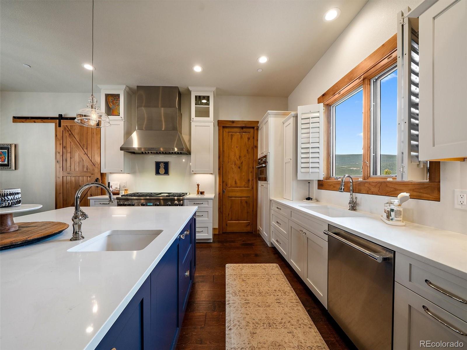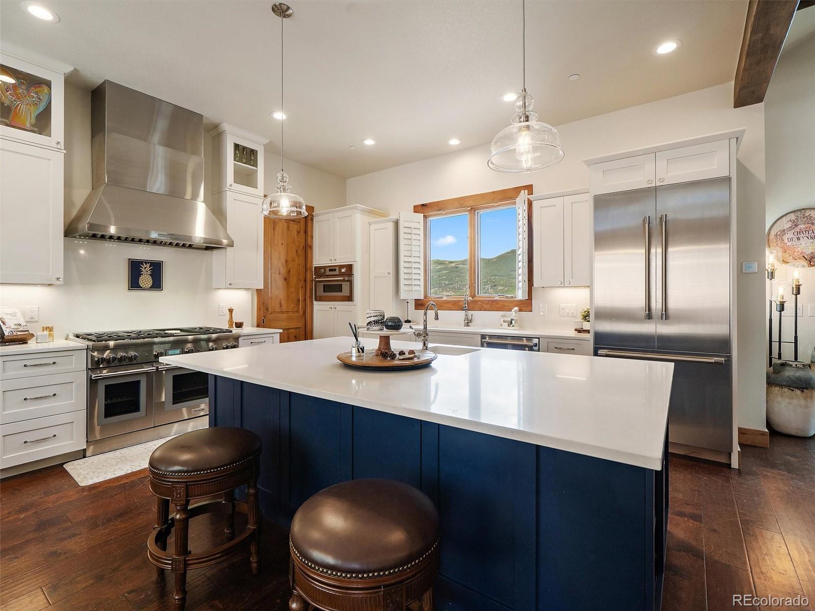 Completed in 2025, 32643 Lodgepole Circle in Evergreen offers a refined mountain contemporary design on 1.65 acres with expansive mountain, valley, and meadow views. Set in a small enclave of new construction homes, this newly built residence pairs clean lines, natural materials, and a thoughtful layout designed to capture the setting from both levels. The main level centers around an open great room, dining area, and chef's kitchen with Thermador appliances, a large island, walk-in pantry, and direct access to a covered deck positioned for the views. Timber accents, vaulted ceilings, quartz counters, and generous windows add warmth and scale throughout the main living spaces. The main-level primary suite includes a large walk-in closet and spacious 5-piece bath with a soaking tub, and opens to the deck with a hot tub and outdoor fireplace. The finished walkout lower level adds three additional bedrooms, including one non-conforming bedroom currently used as an office with a Murphy bed, plus a large rec room with wet bar and access to lower-level outdoor living. The lower level opens to an additional deck and the fenced dog run, creating flexible indoor-outdoor space for year-round use. In total, the home includes 3 interior fireplaces, along with outdoor fireplaces on both deck levels. Radiant floor heat, a tankless water heater, smart thermostat, radon mitigation system, and double-pane windows add comfort and efficiency. The oversized heated 3-car garage includes 220V service, workspace, and a dog wash. The grounds feature rock outcroppings, aspen and pine, fire mitigation, and a private yard that blends into the natural landscape. Set in Evergreen with access to Maxwell Falls and Cub Creek trails, this newly completed view property brings together modern mountain design, flexible living space, and exceptional indoor-outdoor flow.