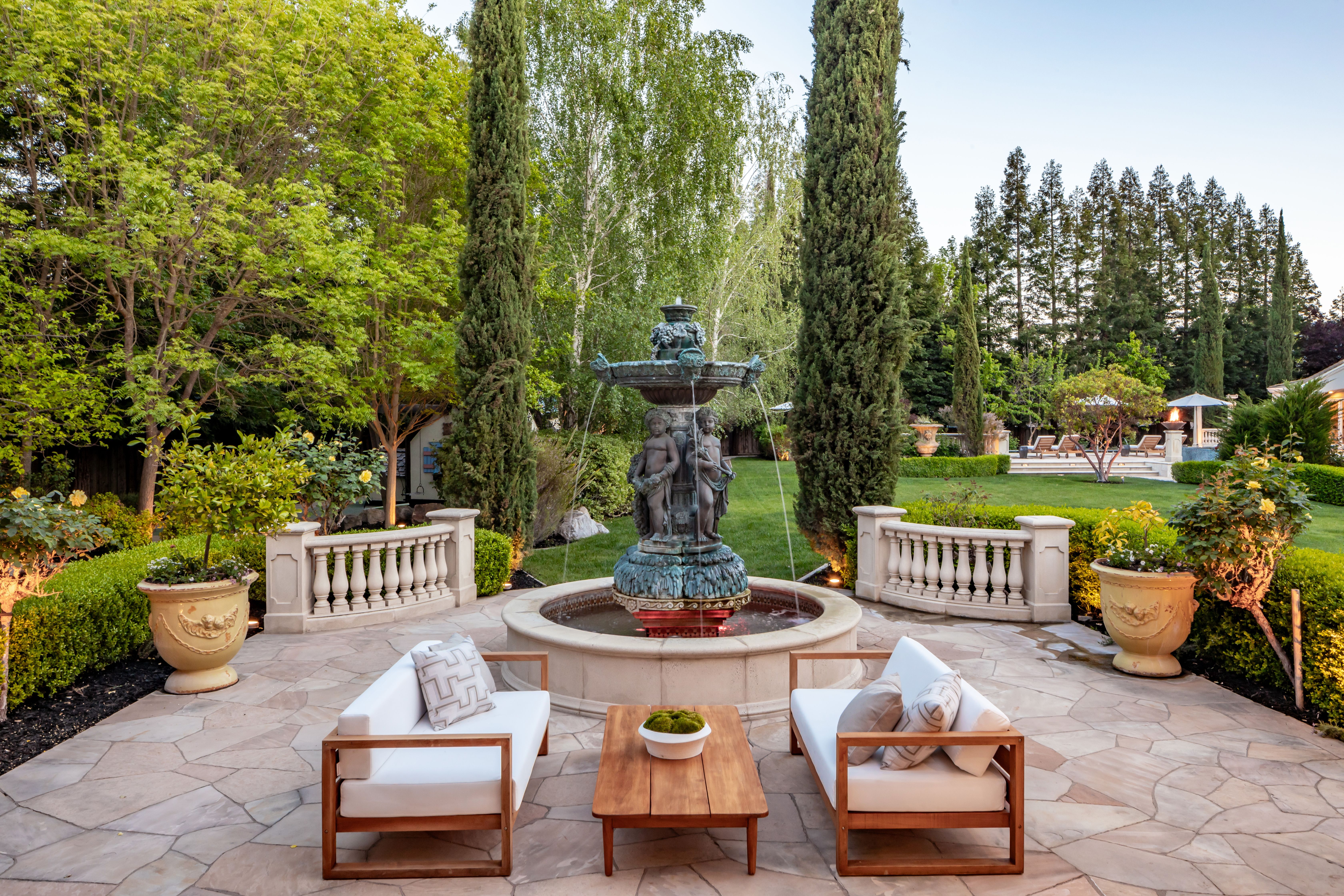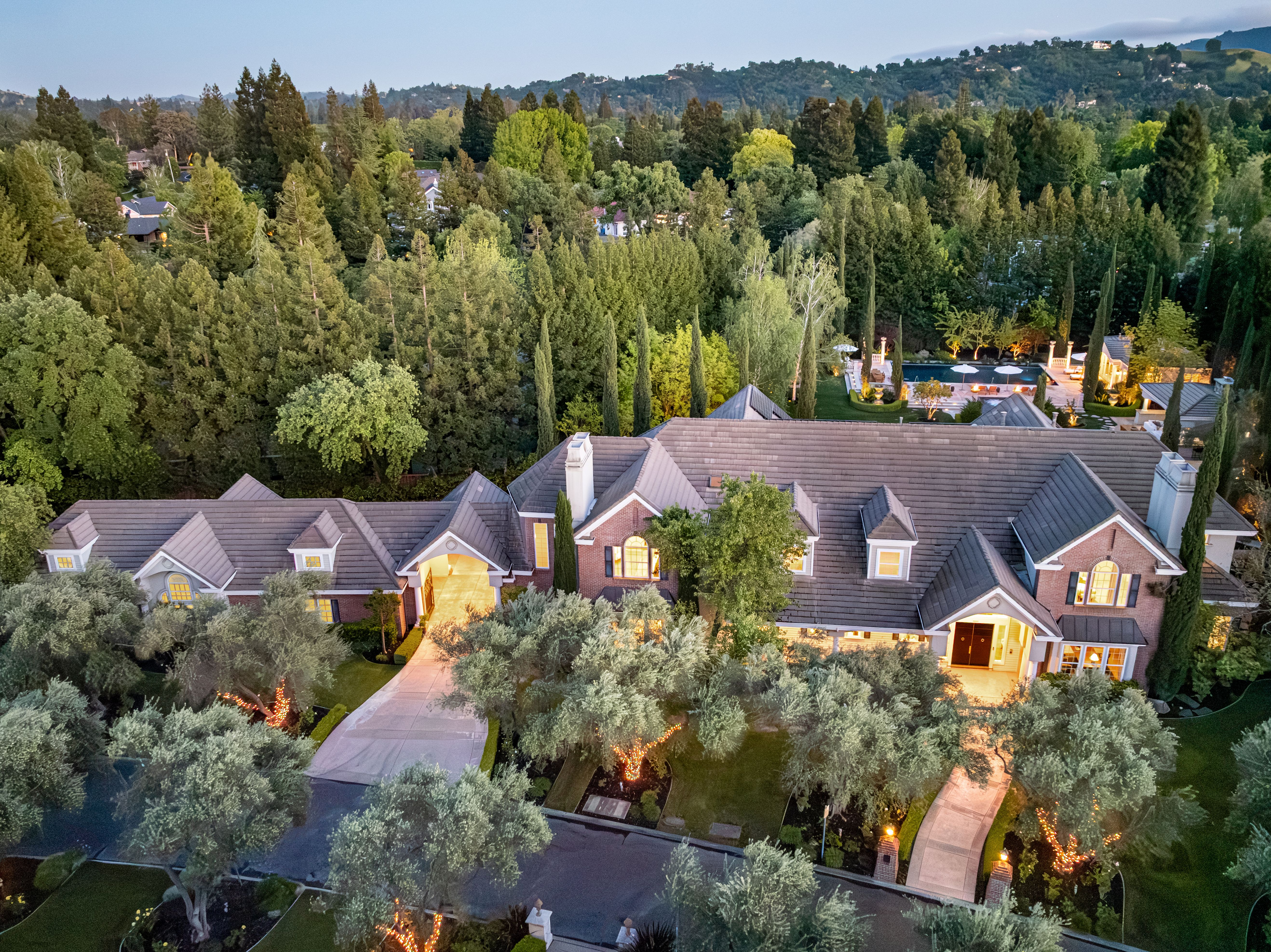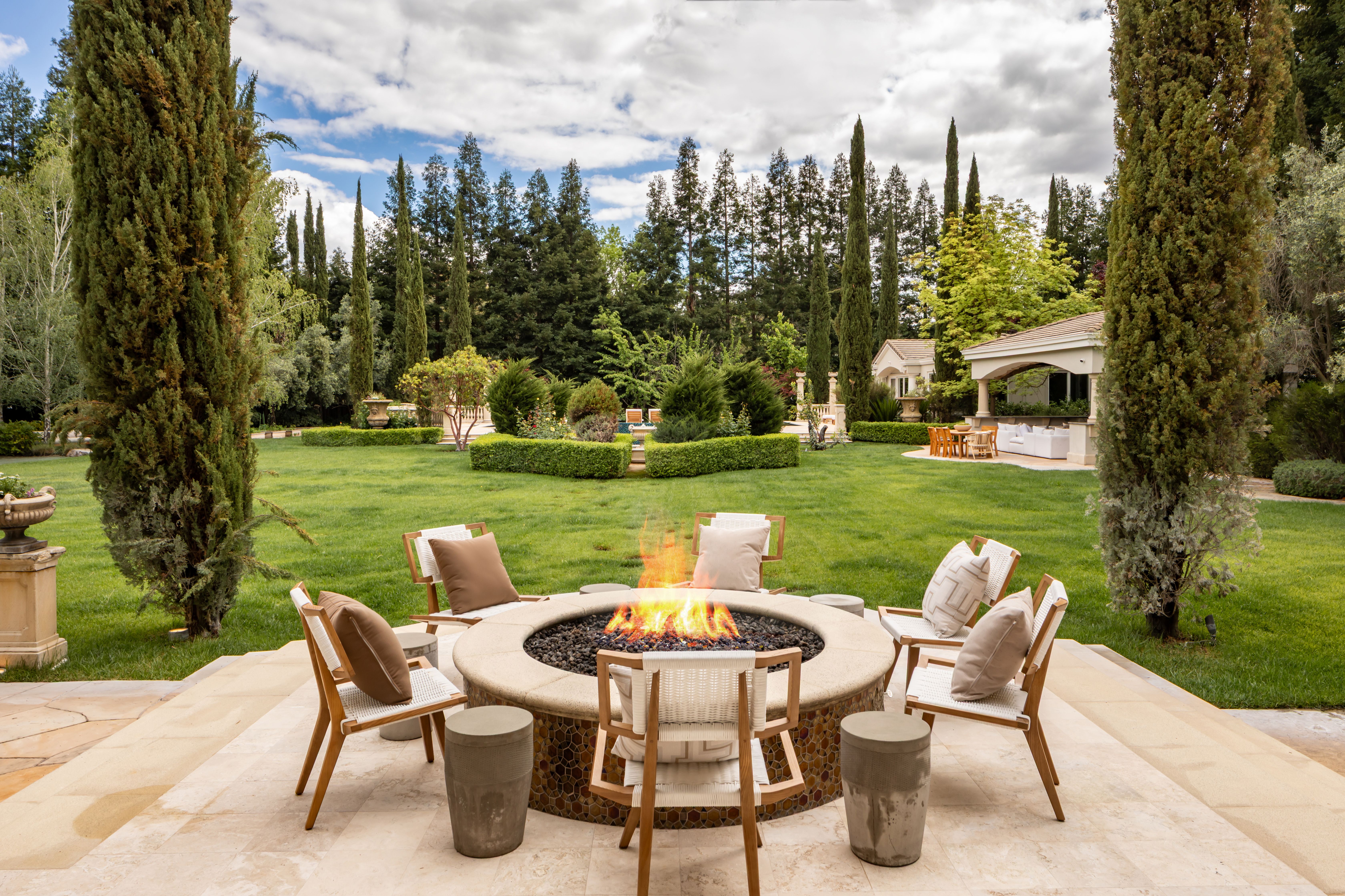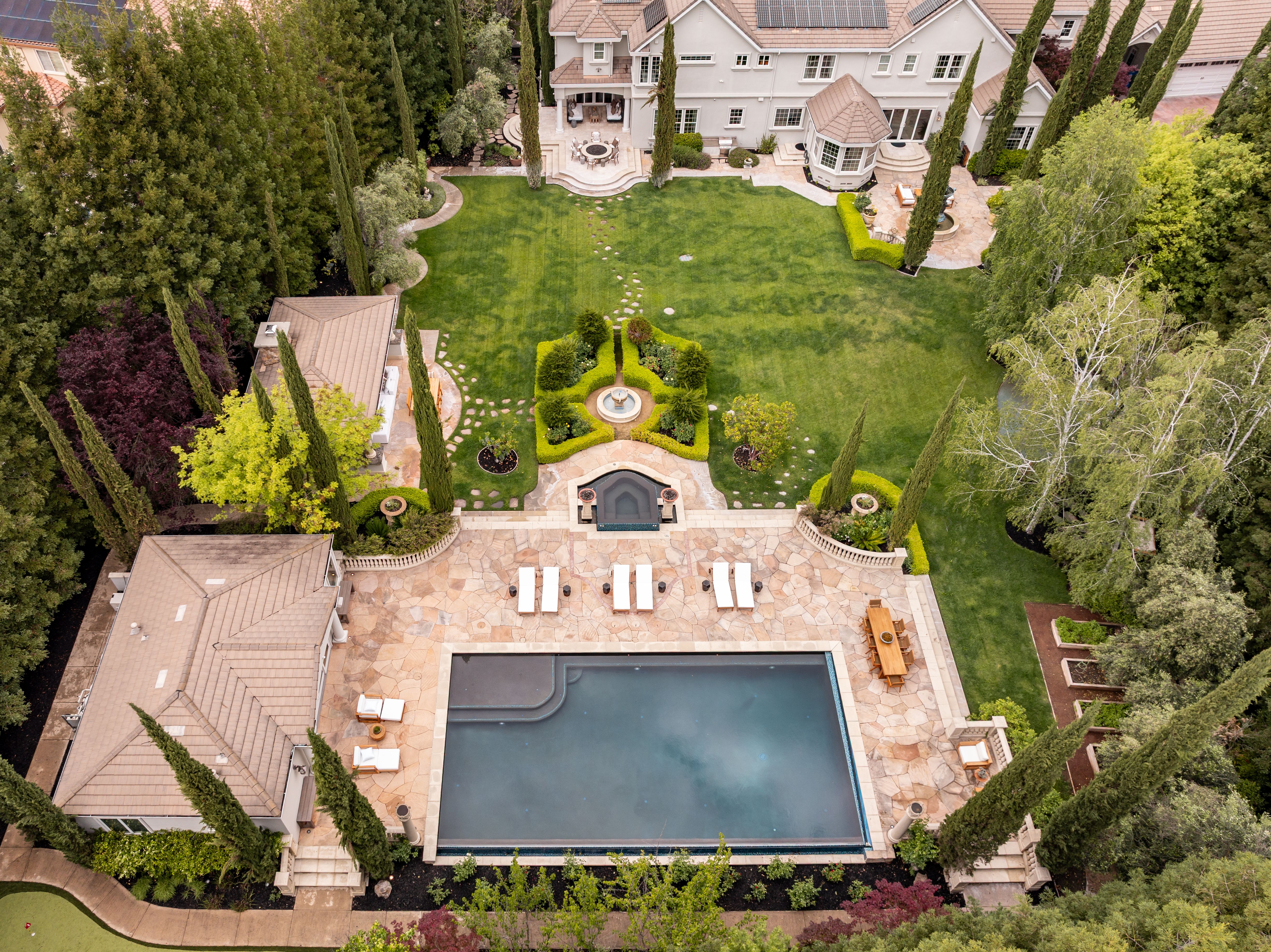 Enter the 10,510-square-foot home through a dramatic foyer beneath soaring ceilings and a distinctive modern chandelier. A sweeping staircase rises gracefully from the entry, setting an elegant tone for the home’s exceptional design and scale. To the right of the foyer sits a refined home office (with a fireplace), offering serene views of the front garden; it is an ideal setting for work, study, or quiet reflection. The main living spaces unfold beyond, thoughtfully designed for both elegant entertaining and casual everyday living. At the heart of the home lies the expansive open-concept kitchen and family room. The chef’s kitchen is beautifully appointed with quartzite countertops and a generous island with seating for four. A breakfast nook under a coffered ceiling, with garden views on three sides, accommodates six more. Elite appliances include a Miele range, Sub-Zero refrigerator, two Miele ovens and a microwave, and two Bosch dishwashers. Custom cabinetry, dual sinks, an enormous walk-in pantry, and the adjacent butler’s pantry accommodate both elegant gatherings and casual family meals. The spacious family room nearby features an oversized fireplace to ward off any winter chill, and a large adjoining game room supplies an ideal venue for recreation and fun. To the other side of the kitchen, the living and dining rooms are linked by a striking two-sided fireplace. The living room offers windows on three sides overlooking the gardens, while the dining room is an elegant venue for formal meals and celebrations. Distinctive hardwoods are found throughout.Practical amenities are equally impressive. The well-appointed laundry room includes LG appliances, an additional refrigerator, and generous granite counter space. A thoughtfully designed mud room provides convenient access from the home’s side entrance and garage.In total, the main residence offers five bedrooms, five full en-suite bathrooms, and three half-bathrooms. Four spacious bedrooms lie upstairs, each with generous closets, centered around a large media/play room (with an oversized television) ideal for movies or gatherings with families or friends. The principal suite is particularly remarkable. It is a private retreat with fireplace, wet bar, sitting room, and three immense walk-in closets with custom cabinetry. The spa-inspired bathroom features dual sinks and an oversized shower with dual shower heads, a bench, and a stand-alone soaking tub — all within the shower’s glass walls. The fifth bedroom, ideal for guests, lies downstairs, assuring privacy.The back yard, roughly a flat acre, is every bit as remarkable as the home itself. The grounds provide exceptional outdoor living. More than 50 redwoods and 30 Italian cypress trees surround the grounds, along with olive trees (imported from Italy), cherry trees (with gorgeous blossoms), and apple trees, and rose bushes of every color. The yard features fountains, a firepit seating 8-10 guests, shaded lounge areas, a putting green, a kids’ playhouse, a vegetable garden (with planters), and a stunning entertainment pavilion with fireplace, heaters, fans, and a built-in grill. Alongside, a beautifully appointed 925-square-foot pool house offers another bedroom, two full bathrooms, a kitchen, a laundry and a sauna seating eight. The six-car garage and motor court provide abundant parking. This remarkable estate blends scale, elegance, and resort-style amenities, offering an extraordinary setting for both everyday living and grand entertaining.