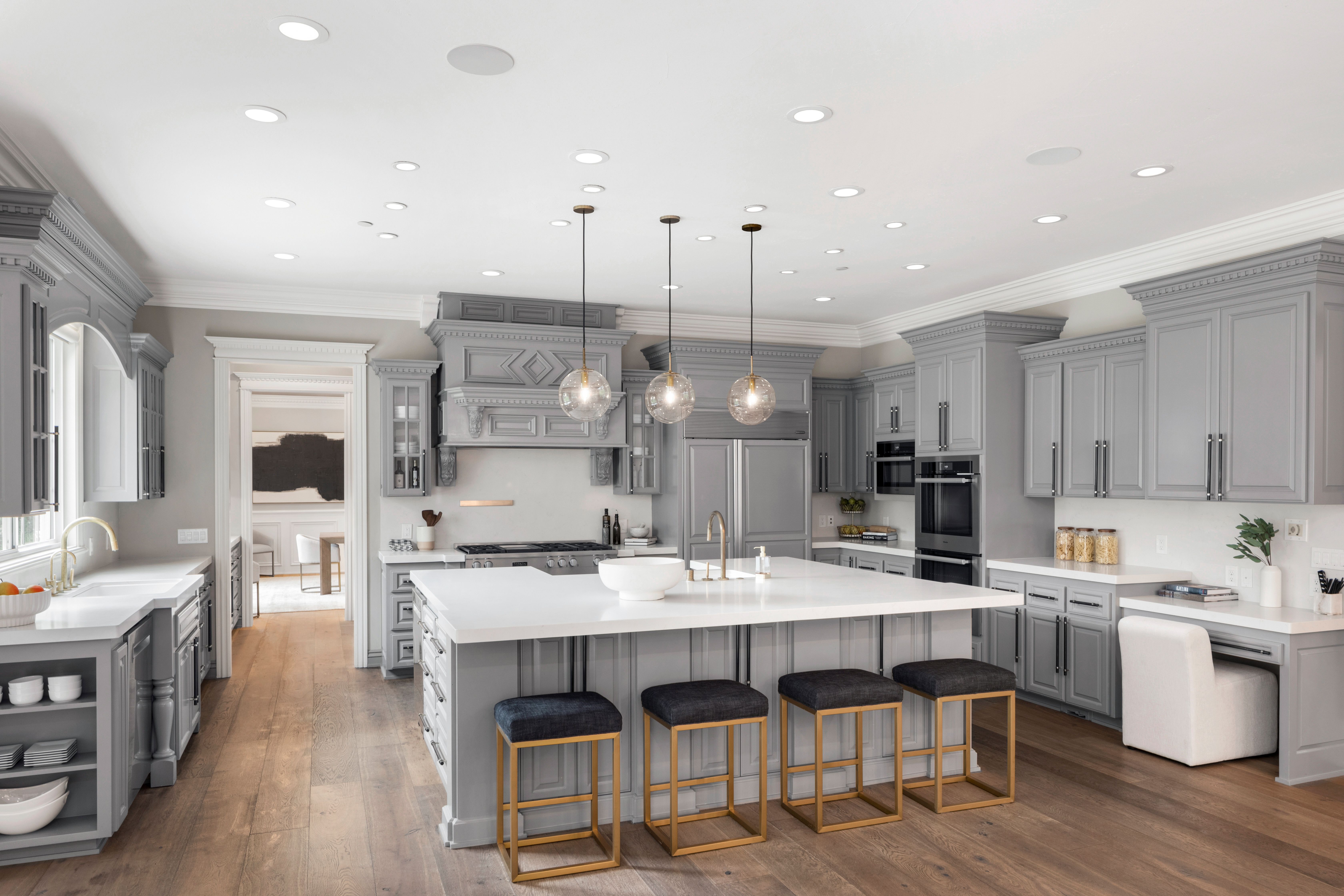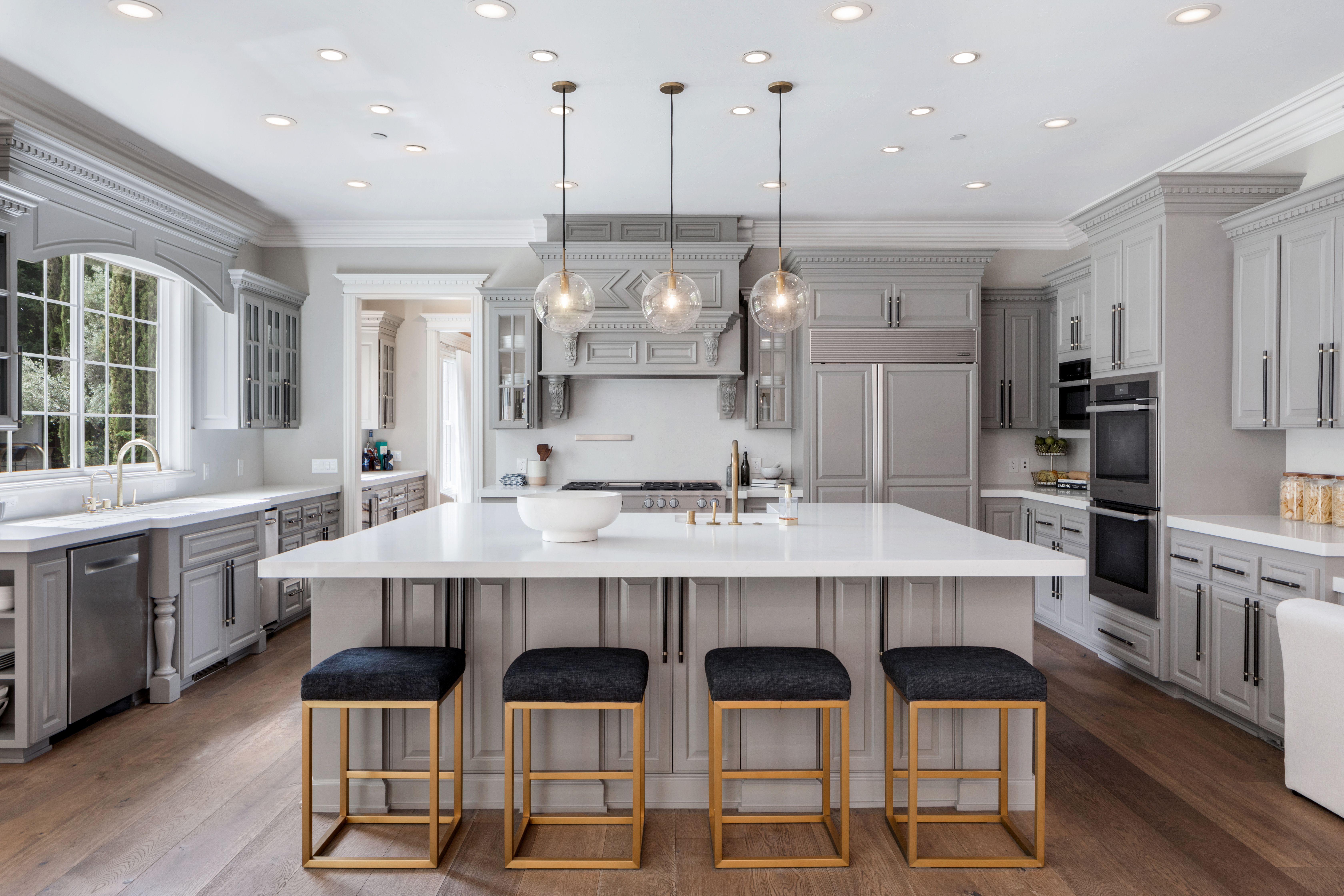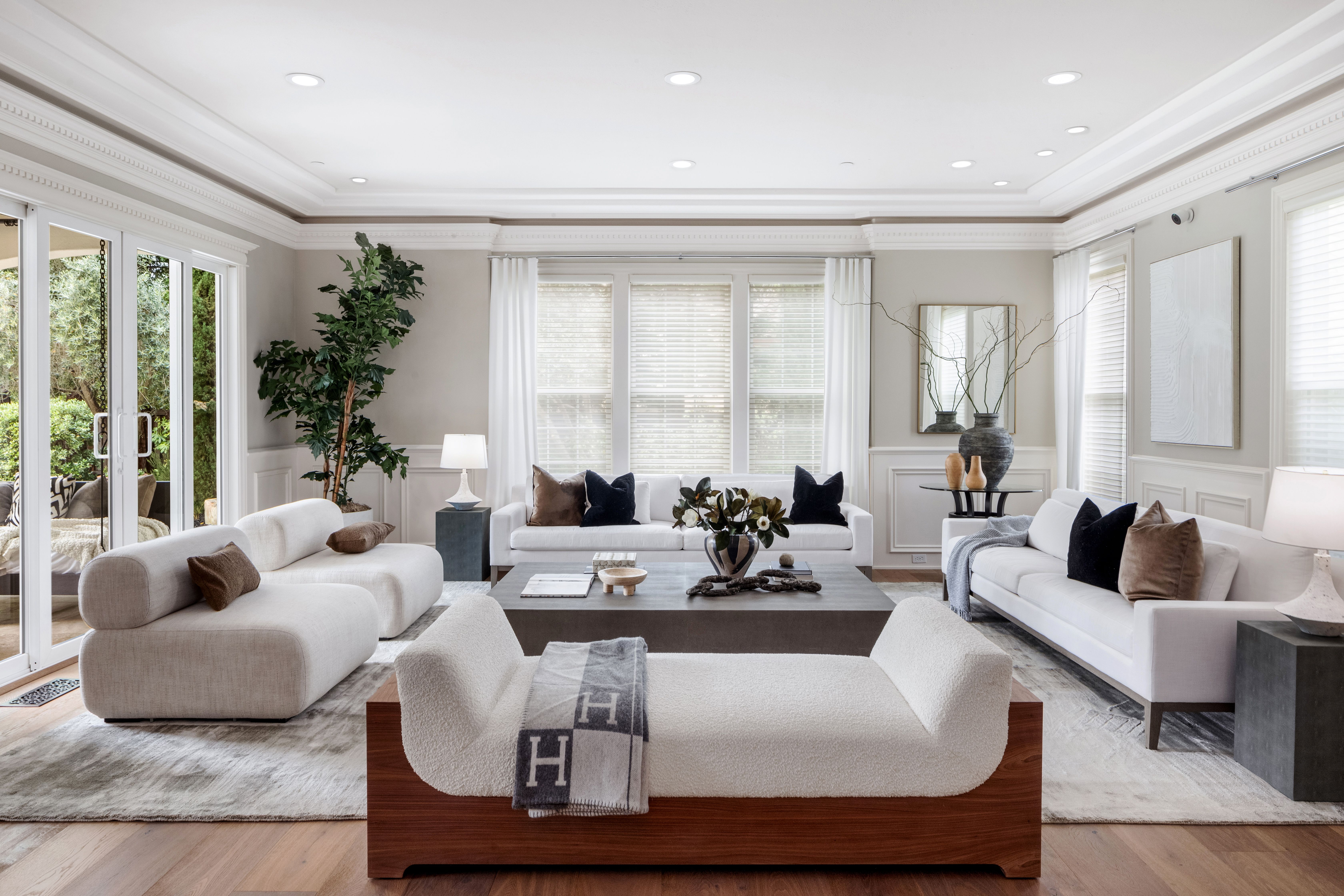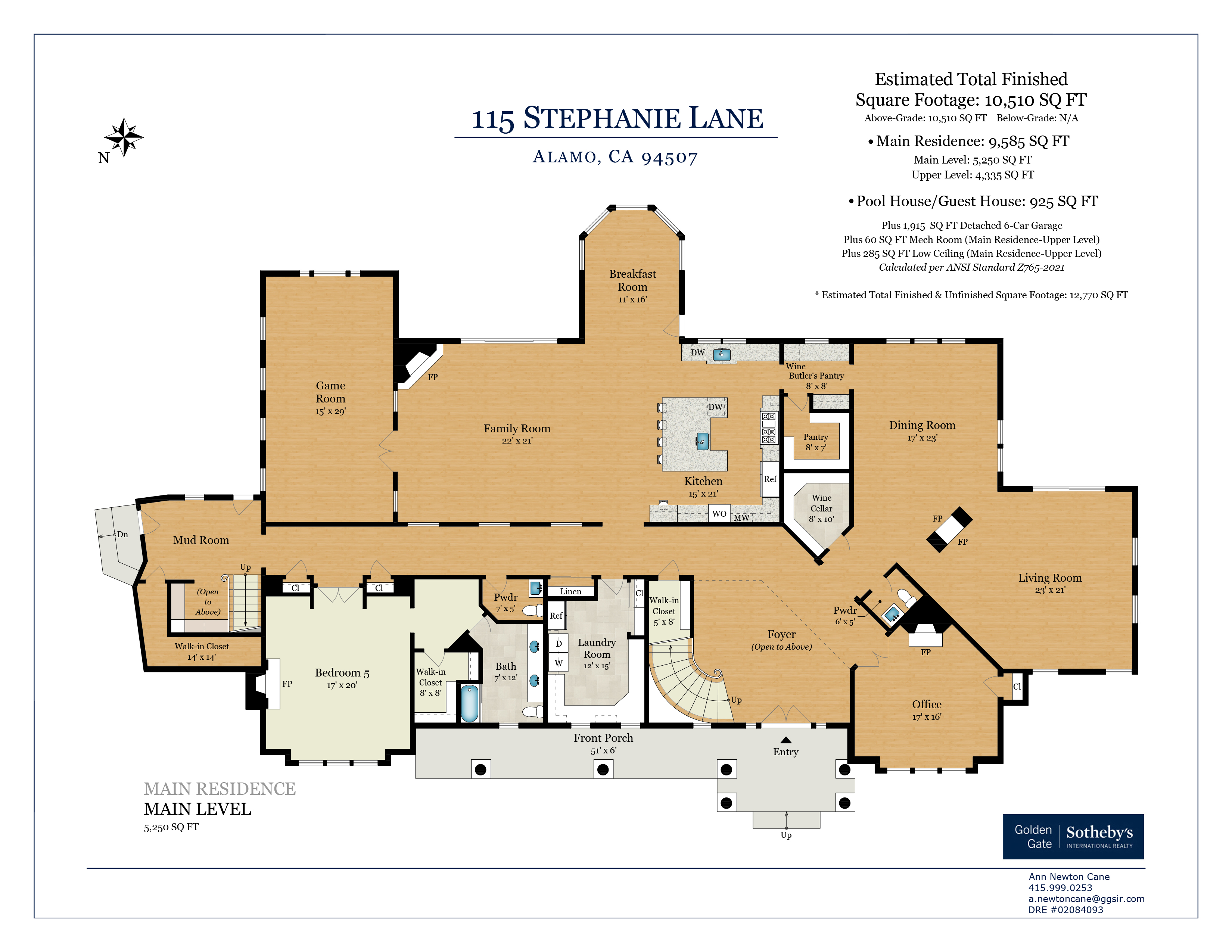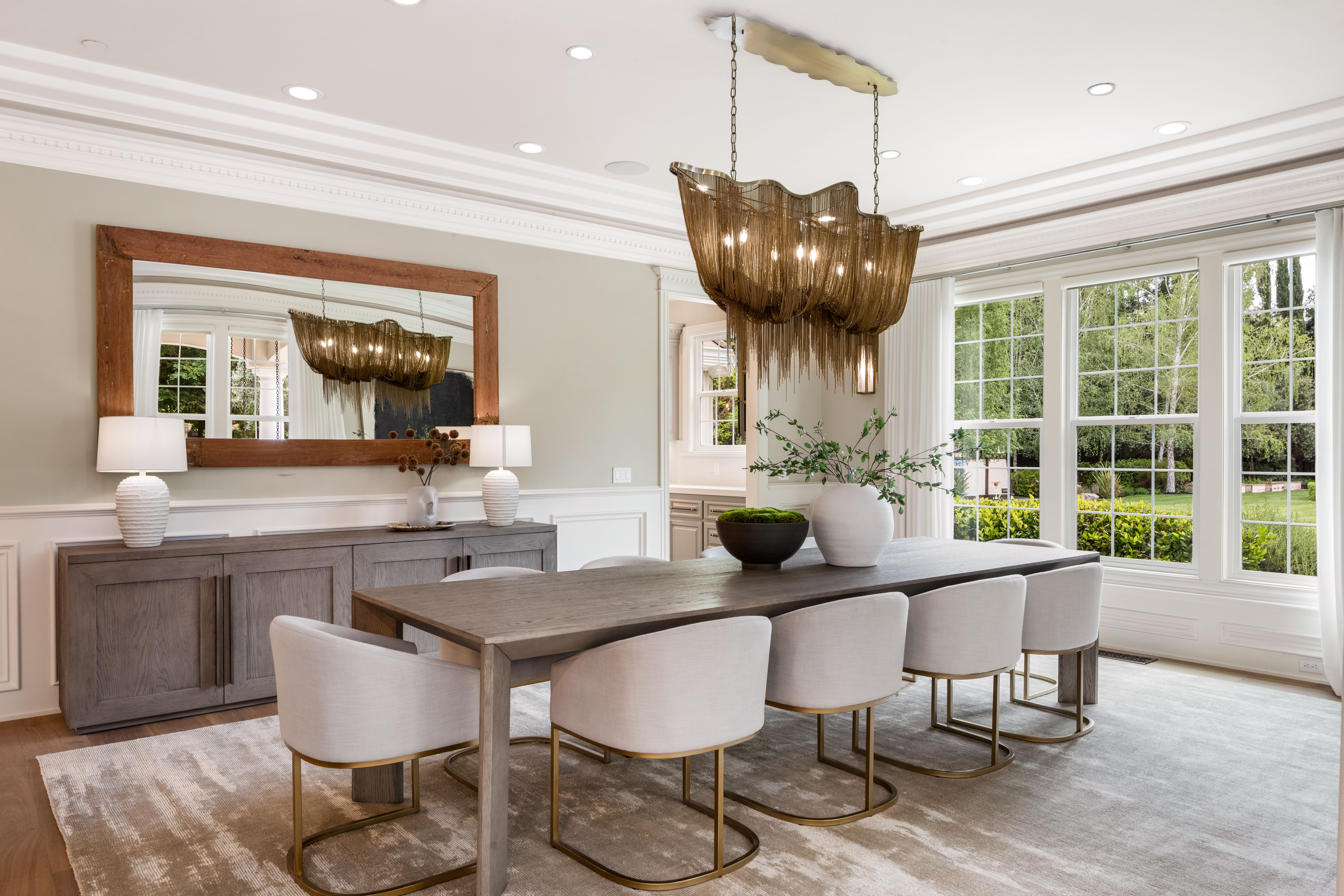 Enter the 10,510-square-foot home through a dramatic foyer beneath soaring ceilings and a distinctive modern chandelier. A sweeping staircase rises gracefully from the entry, setting an elegant tone for the home’s exceptional design and scale. To the right of the foyer sits a refined home office (with a fireplace), offering serene views of the front garden; it is an ideal setting for work, study, or quiet reflection. The main living spaces unfold beyond, thoughtfully designed for both elegant entertaining and casual everyday living. At the heart of the home lies the expansive open-concept kitchen and family room. The chef’s kitchen is beautifully appointed with quartzite countertops and a generous island with seating for four. A breakfast nook under a coffered ceiling, with garden views on three sides, accommodates six more. Elite appliances include a Miele range, Sub-Zero refrigerator, two Miele ovens and a microwave, and two Bosch dishwashers. Custom cabinetry, dual sinks, an enormous walk-in pantry, and the adjacent butler’s pantry accommodate both elegant gatherings and casual family meals. The spacious family room nearby features an oversized fireplace to ward off any winter chill, and a large adjoining game room supplies an ideal venue for recreation and fun. To the other side of the kitchen, the living and dining rooms are linked by a striking two-sided fireplace. The living room offers windows on three sides overlooking the gardens, while the dining room is an elegant venue for formal meals and celebrations. Distinctive hardwoods are found throughout.Practical amenities are equally impressive. The well-appointed laundry room includes LG appliances, an additional refrigerator, and generous granite counter space. A thoughtfully designed mud room provides convenient access from the home’s side entrance and garage.In total, the main residence offers five bedrooms, five full en-suite bathrooms, and three half-bathrooms. Four spacious bedrooms lie upstairs, each with generous closets, centered around a large media/play room (with an oversized television) ideal for movies or gatherings with families or friends. The principal suite is particularly remarkable. It is a private retreat with fireplace, wet bar, sitting room, and three immense walk-in closets with custom cabinetry. The spa-inspired bathroom features dual sinks and an oversized shower with dual shower heads, a bench, and a stand-alone soaking tub — all within the shower’s glass walls. The fifth bedroom, ideal for guests, lies downstairs, assuring privacy.The back yard, roughly a flat acre, is every bit as remarkable as the home itself. The grounds provide exceptional outdoor living. More than 50 redwoods and 30 Italian cypress trees surround the grounds, along with olive trees (imported from Italy), cherry trees (with gorgeous blossoms), and apple trees, and rose bushes of every color. The yard features fountains, a firepit seating 8-10 guests, shaded lounge areas, a putting green, a kids’ playhouse, a vegetable garden (with planters), and a stunning entertainment pavilion with fireplace, heaters, fans, and a built-in grill. Alongside, a beautifully appointed 925-square-foot pool house offers another bedroom, two full bathrooms, a kitchen, a laundry and a sauna seating eight. The six-car garage and motor court provide abundant parking. This remarkable estate blends scale, elegance, and resort-style amenities, offering an extraordinary setting for both everyday living and grand entertaining.