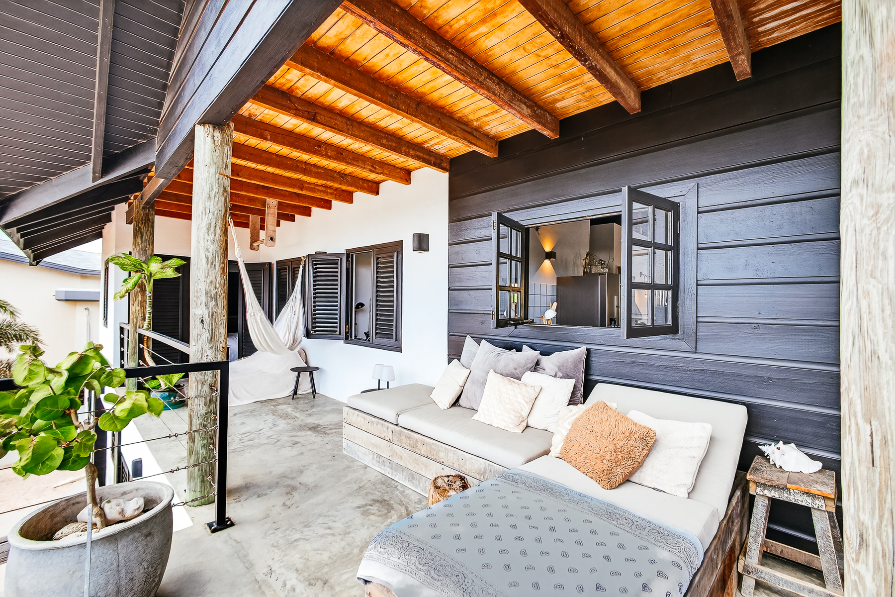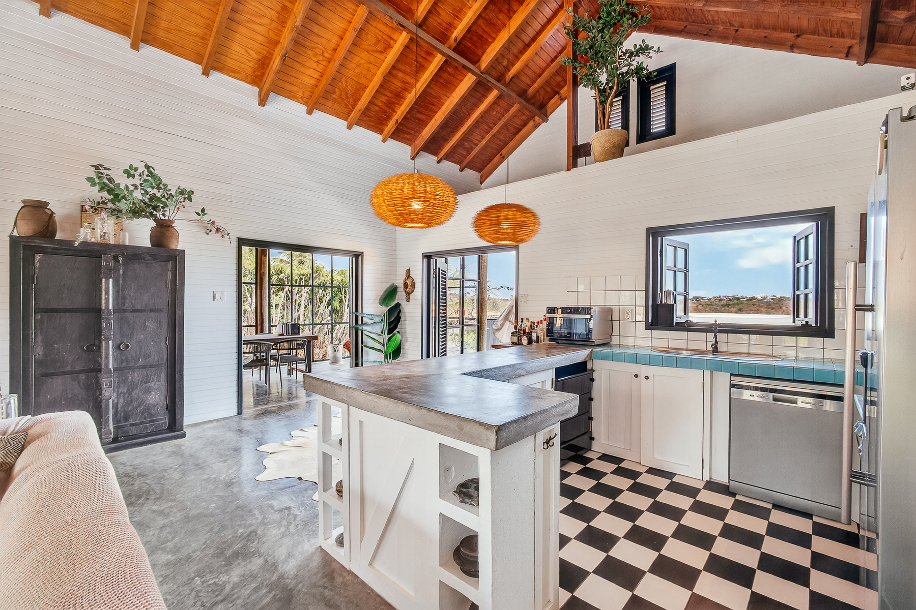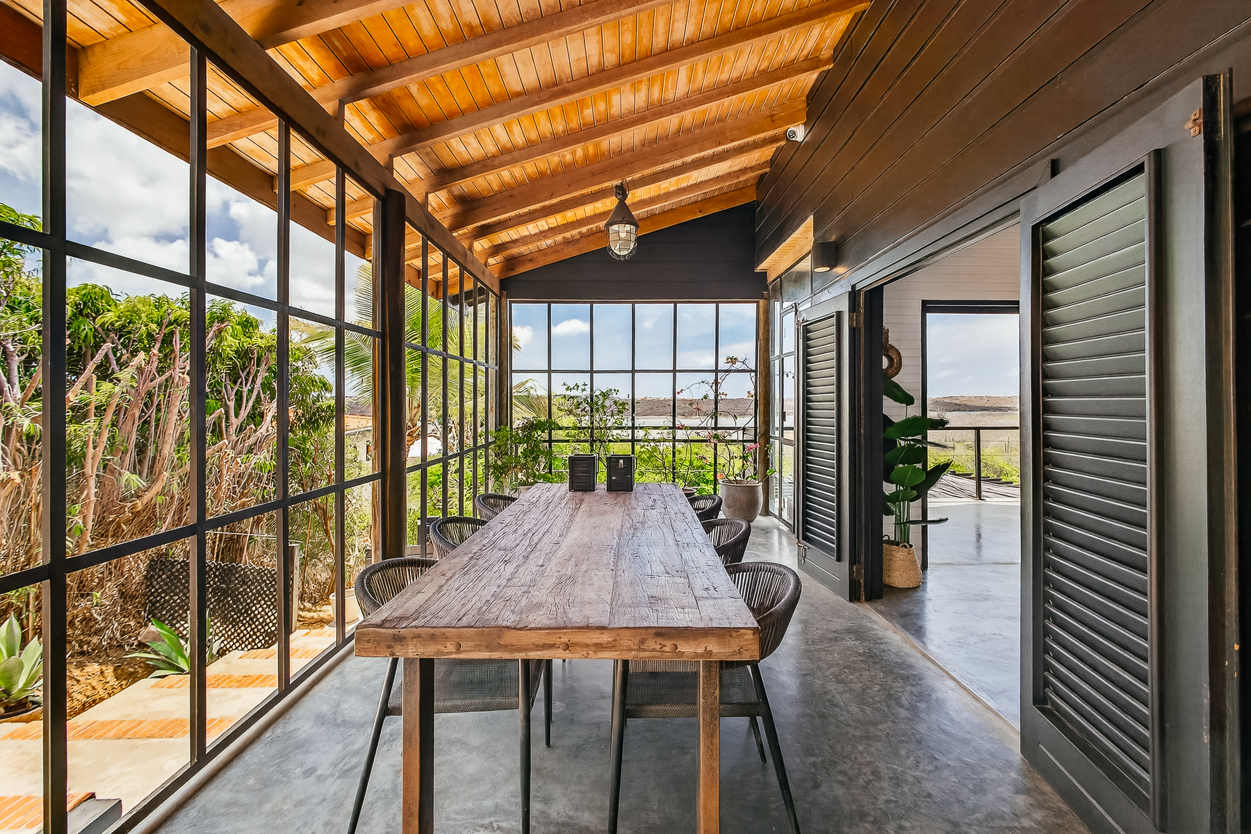 The upper level serves as the primary living space, where the kitchen, dining, and sitting areas are arranged in a continuous layout that extends toward a generous covered veranda. This outdoor living space acts as an extension of the interior, offering areas for dining, lounging, and quiet retreat. From here, the view stretches uninterrupted across the salt flats, with the gentle movement of the trade winds enhancing the sense of openness and connection to nature.
