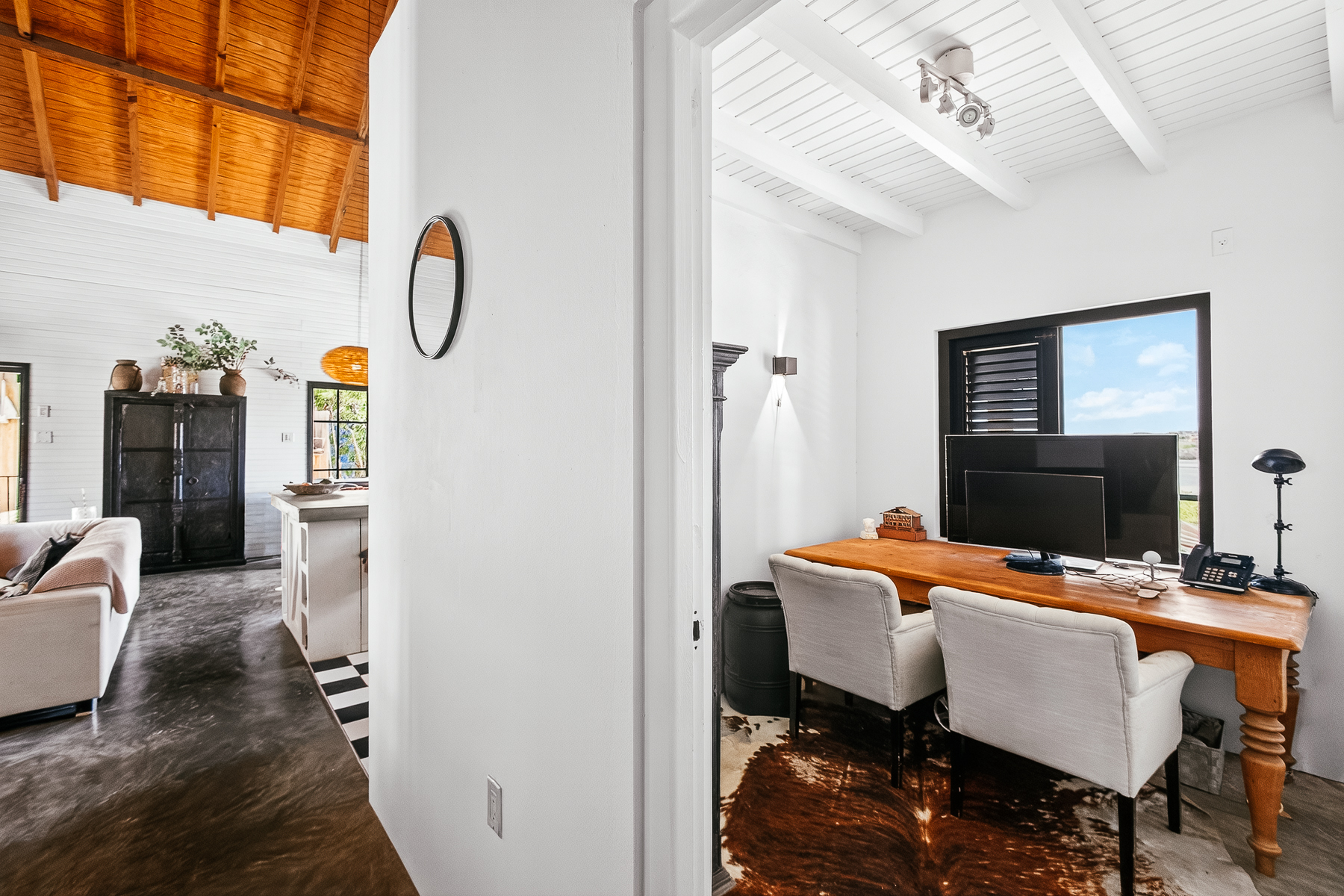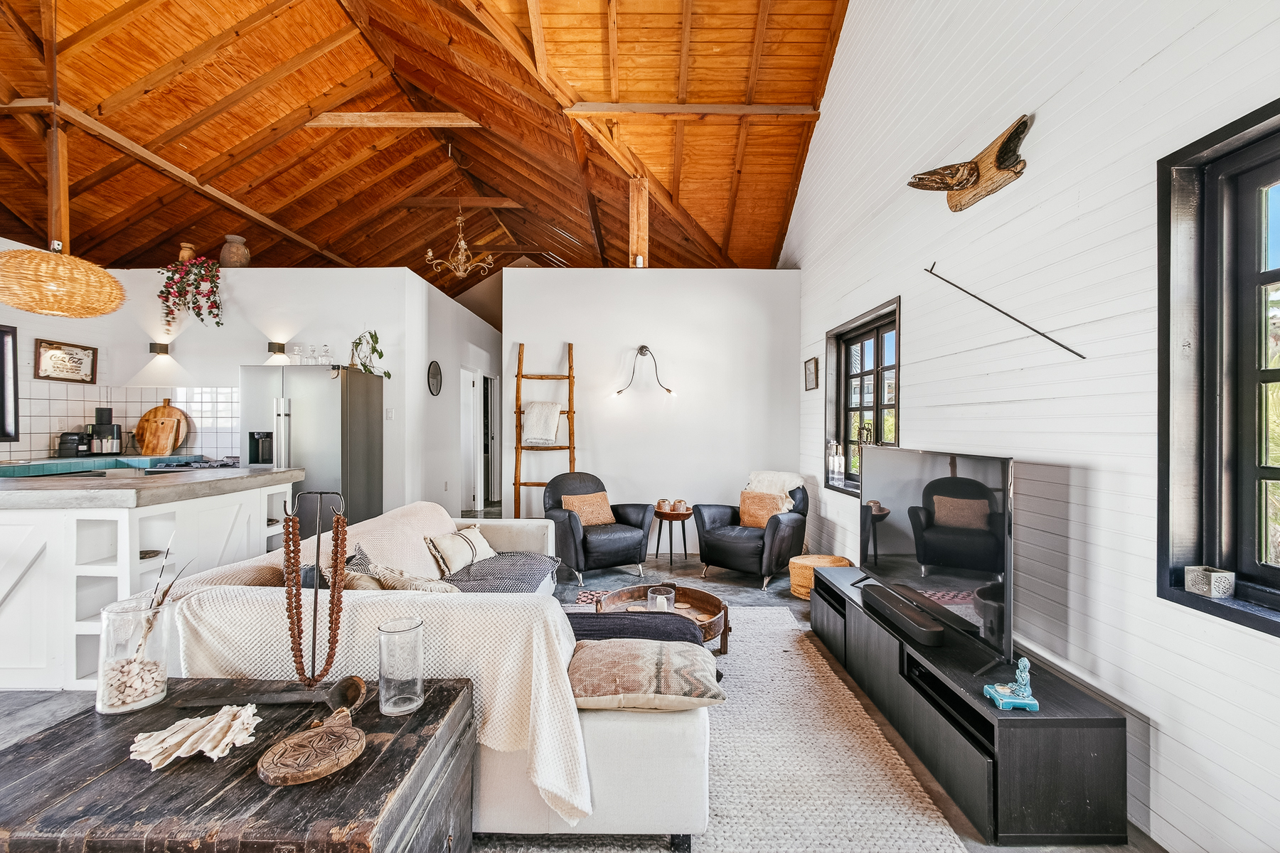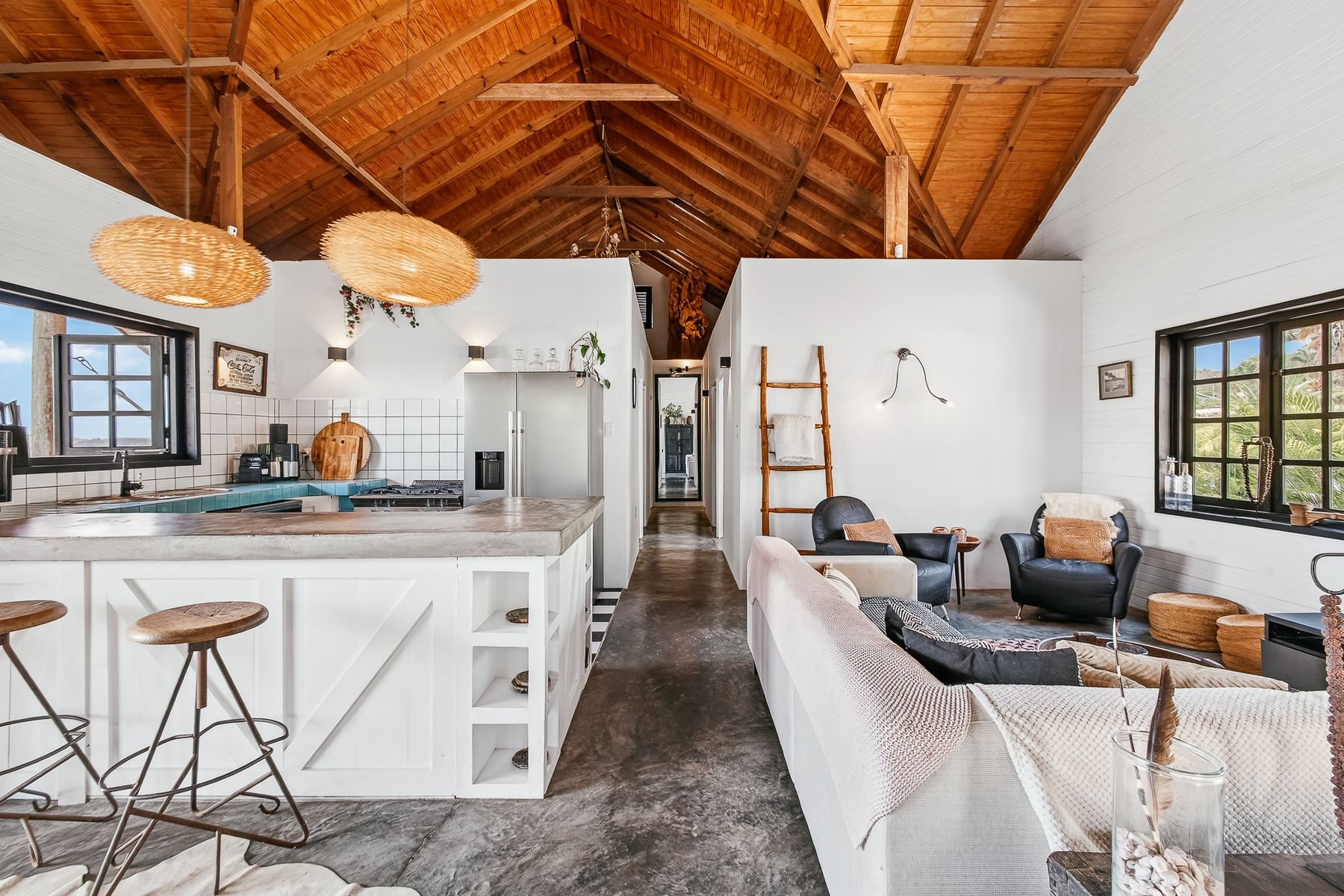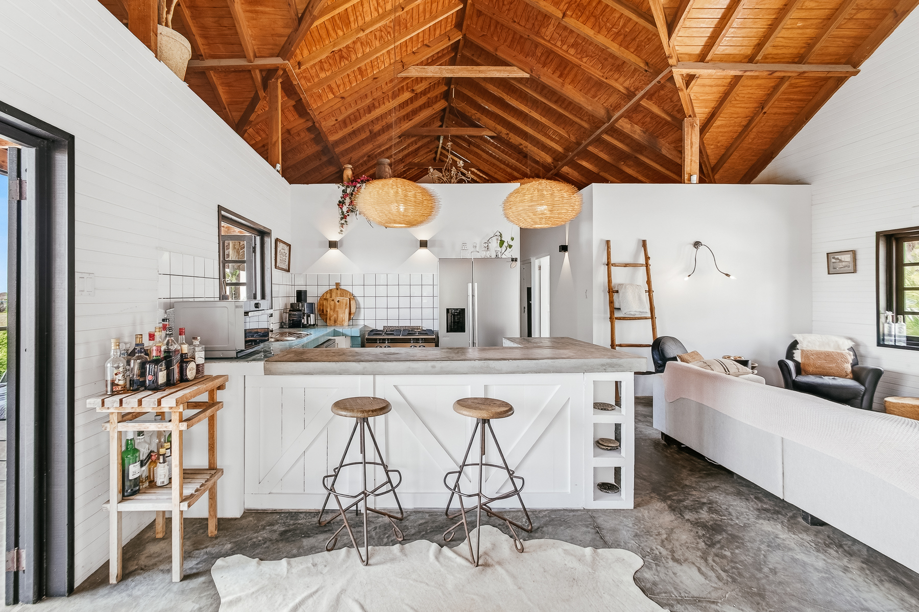 The upper level serves as the primary living space, where the kitchen, dining, and sitting areas are arranged in a continuous layout that extends toward a generous covered veranda. This outdoor living space acts as an extension of the interior, offering areas for dining, lounging, and quiet retreat. From here, the view stretches uninterrupted across the salt flats, with the gentle movement of the trade winds enhancing the sense of openness and connection to nature.