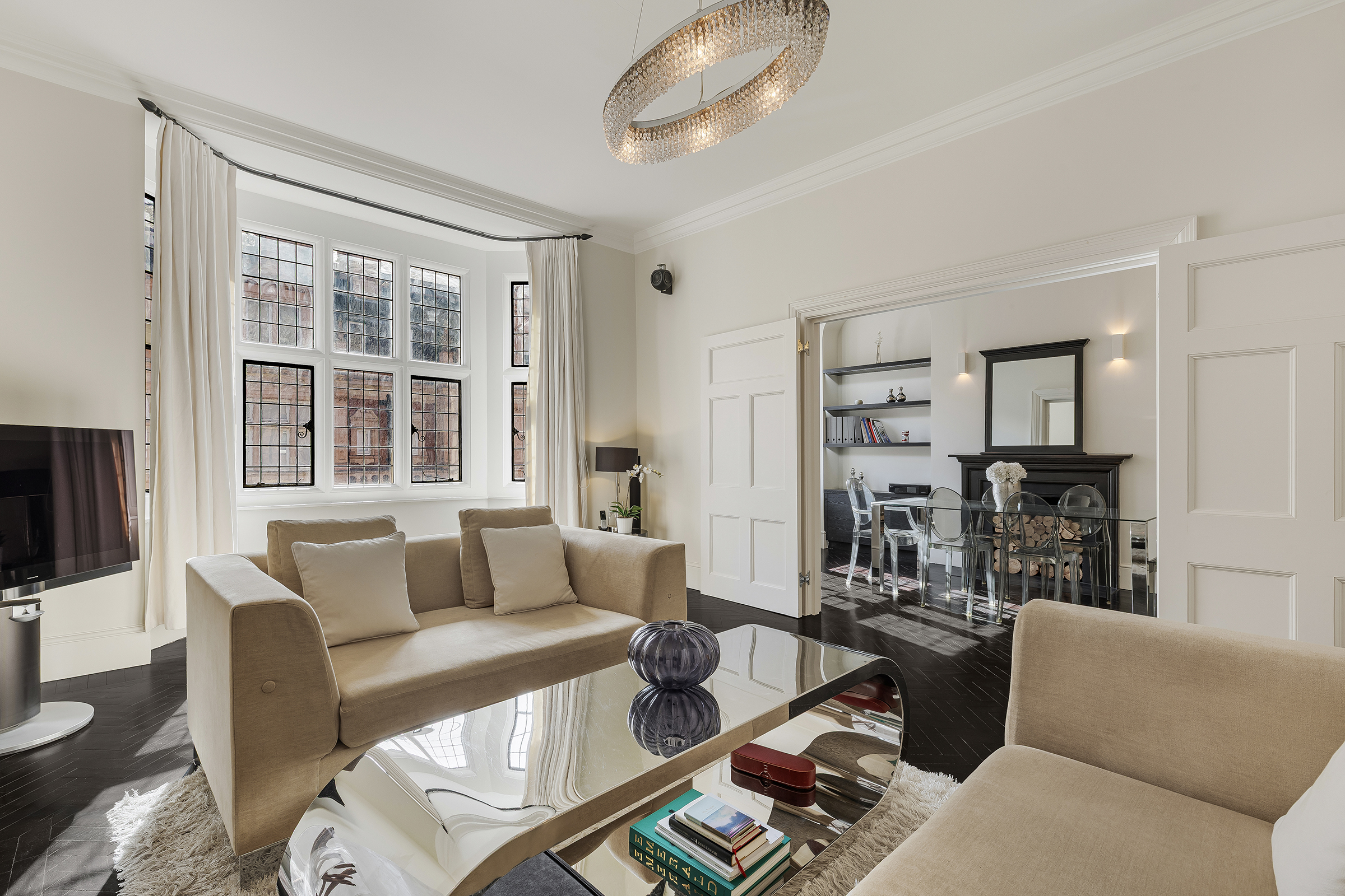 Next door, the kitchen and dining room is sleek and modern in mood, with clean-lined cabinetry, mirrored splashbacks and fully integrated Gaggenau appliances. The proportions here are particularly generous, leaving ample room for dining as well as cooking, and giving the apartment a layout that feels both practical and sociable.
