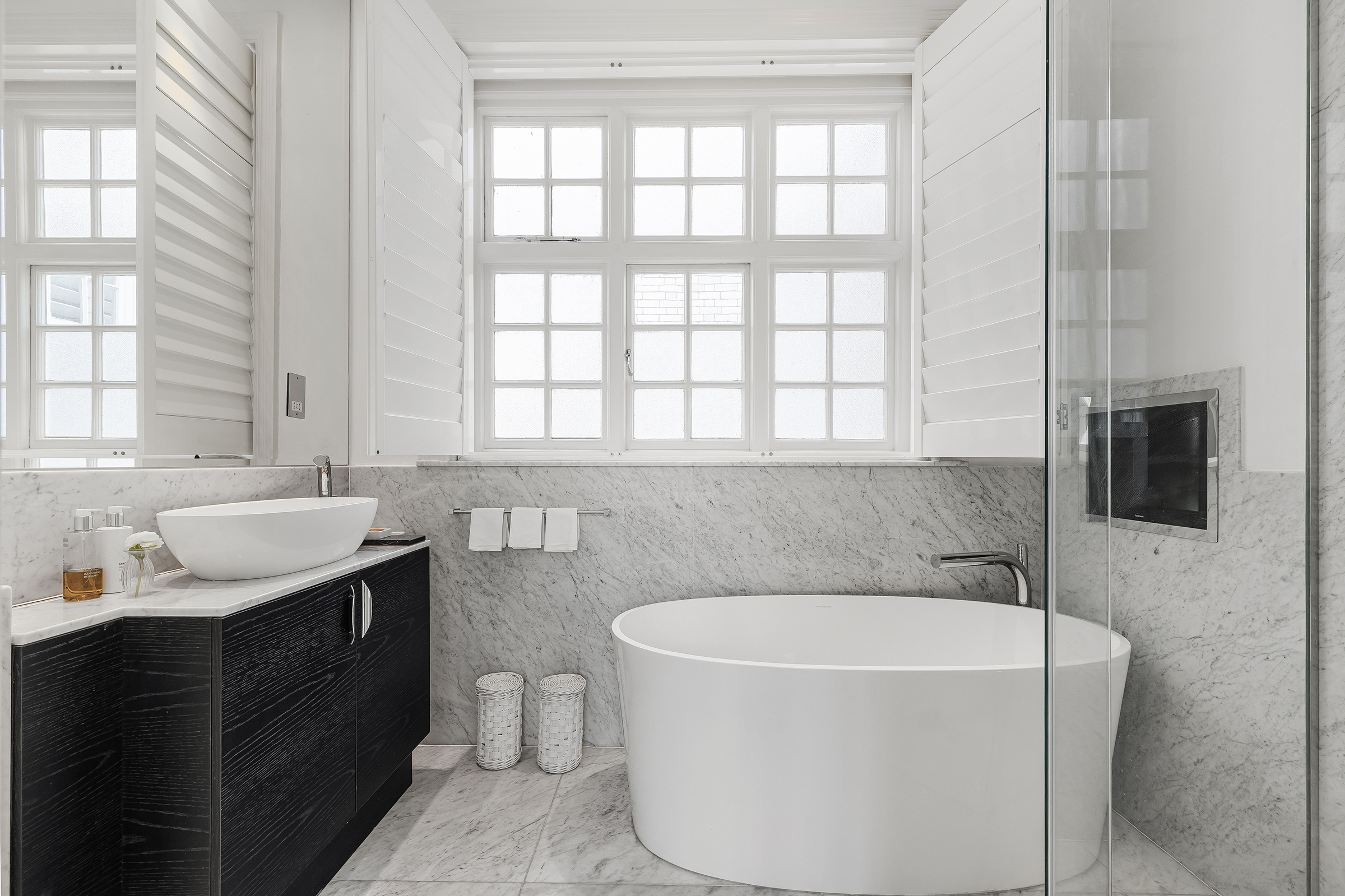 The bedroom suite sits quietly on the opposite side of the plan, creating a strong sense of privacy from the living spaces. It is a substantial room with excellent natural light and enough volume to feel restful rather than simply functional. Alongside it, a separate dressing room adds a rare sense of luxury and flexibility, while the bathroom is finished in marble with a freestanding bathtub and separate shower. A guest cloakroom and additional storage complete the plan.
